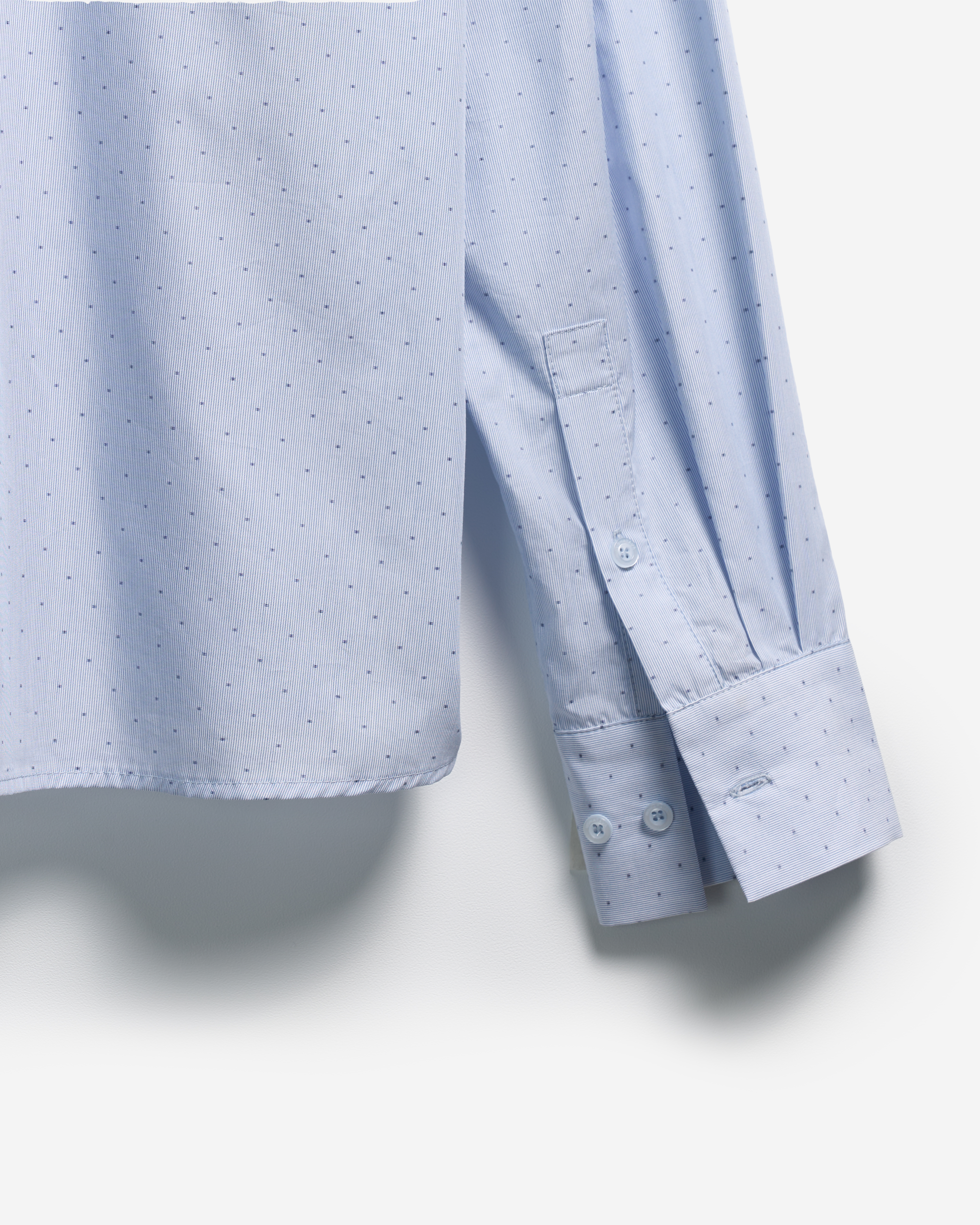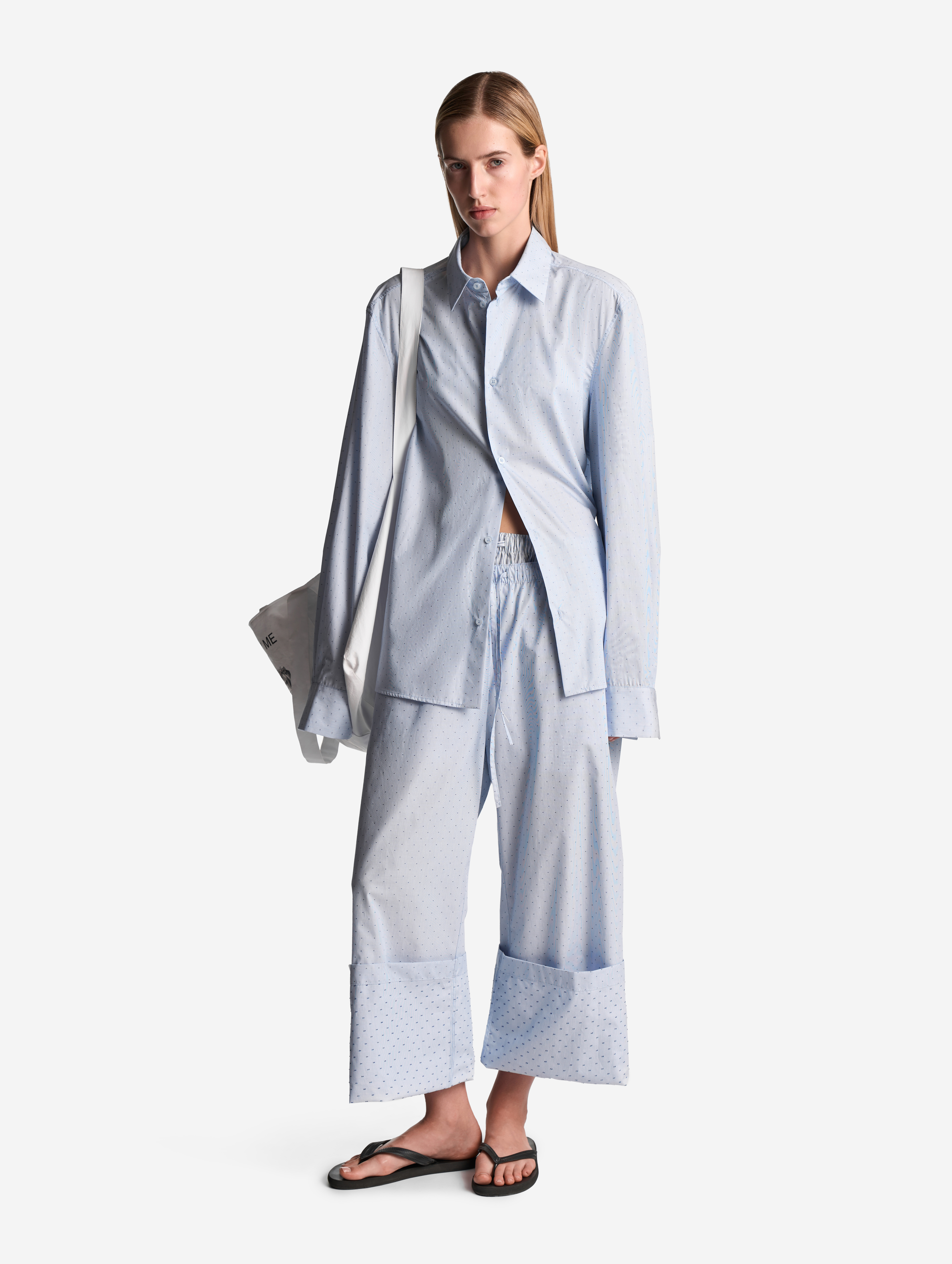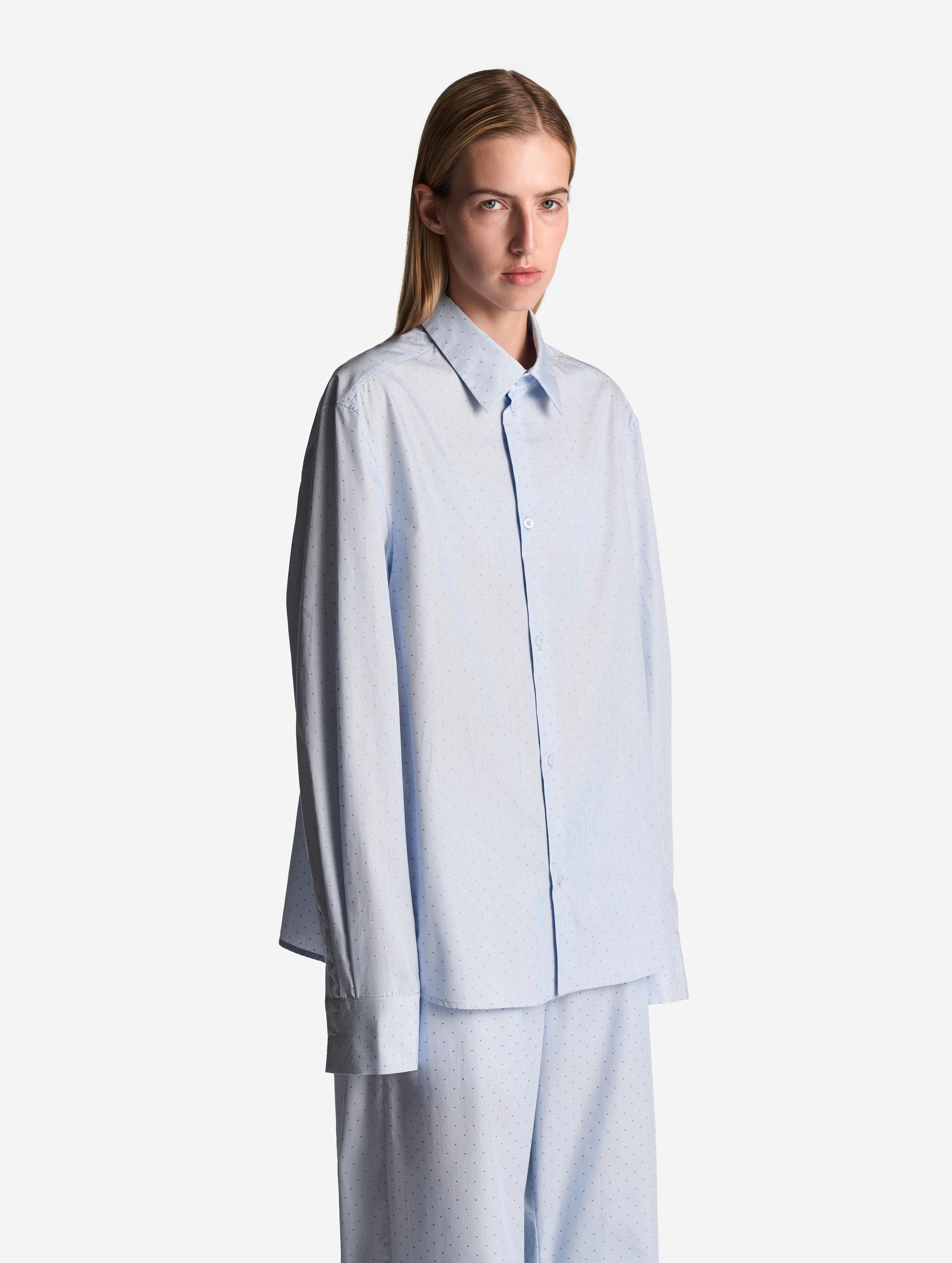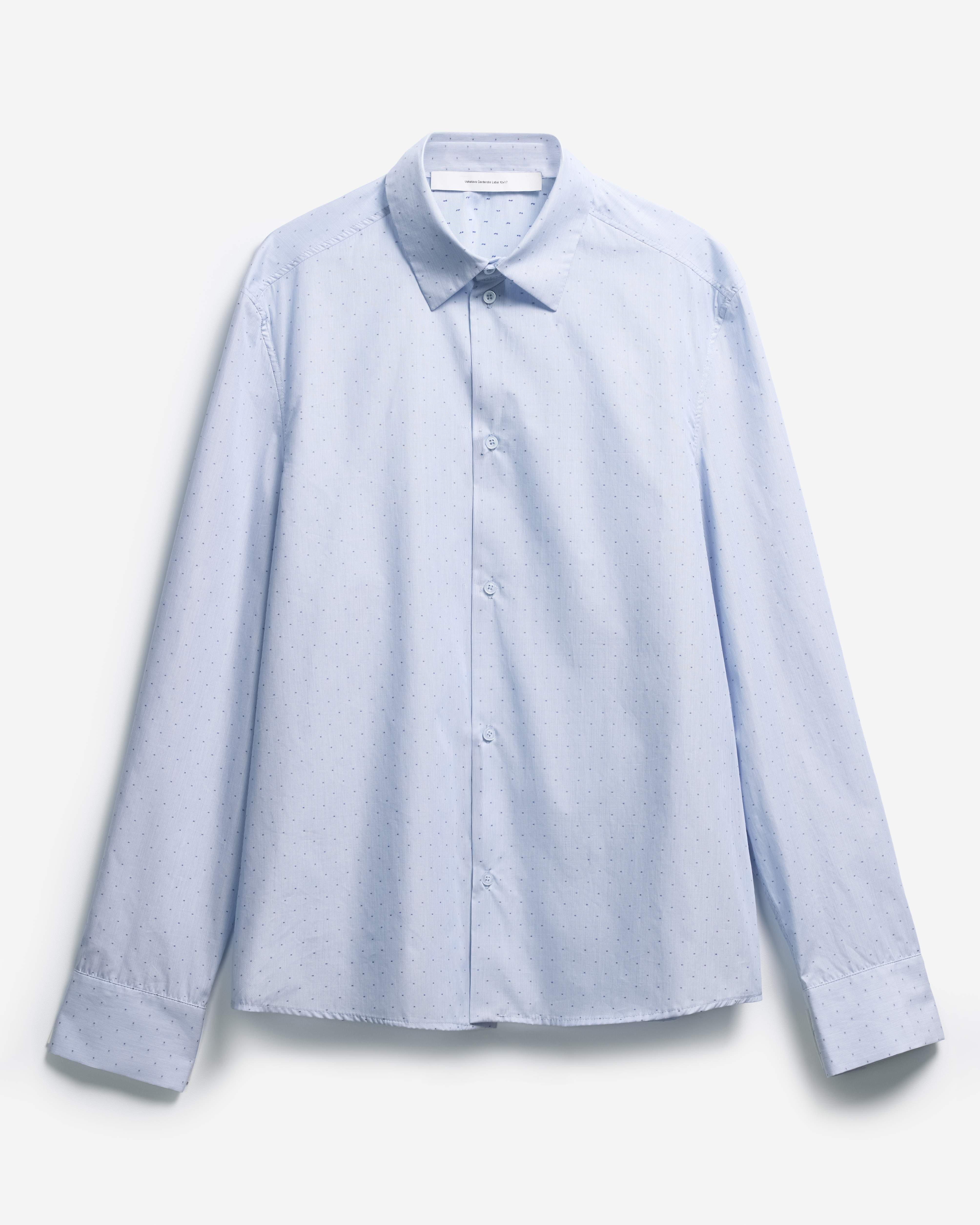 У этой рубашки прямой удлиненный силуэт и широкий рукав со спущенной линией плеча. Умеренная посадка позволяет носить изделие не только женщинам, но и мужчинам. Отдельного внимания заслуживают широкие манжеты. В расстегнутом состоянии они задают расслабленный тон, в застегнутом — дают ощущение сдержанности. Изделие и манжеты застегиваются на перламутровые брендированные пуговицы.