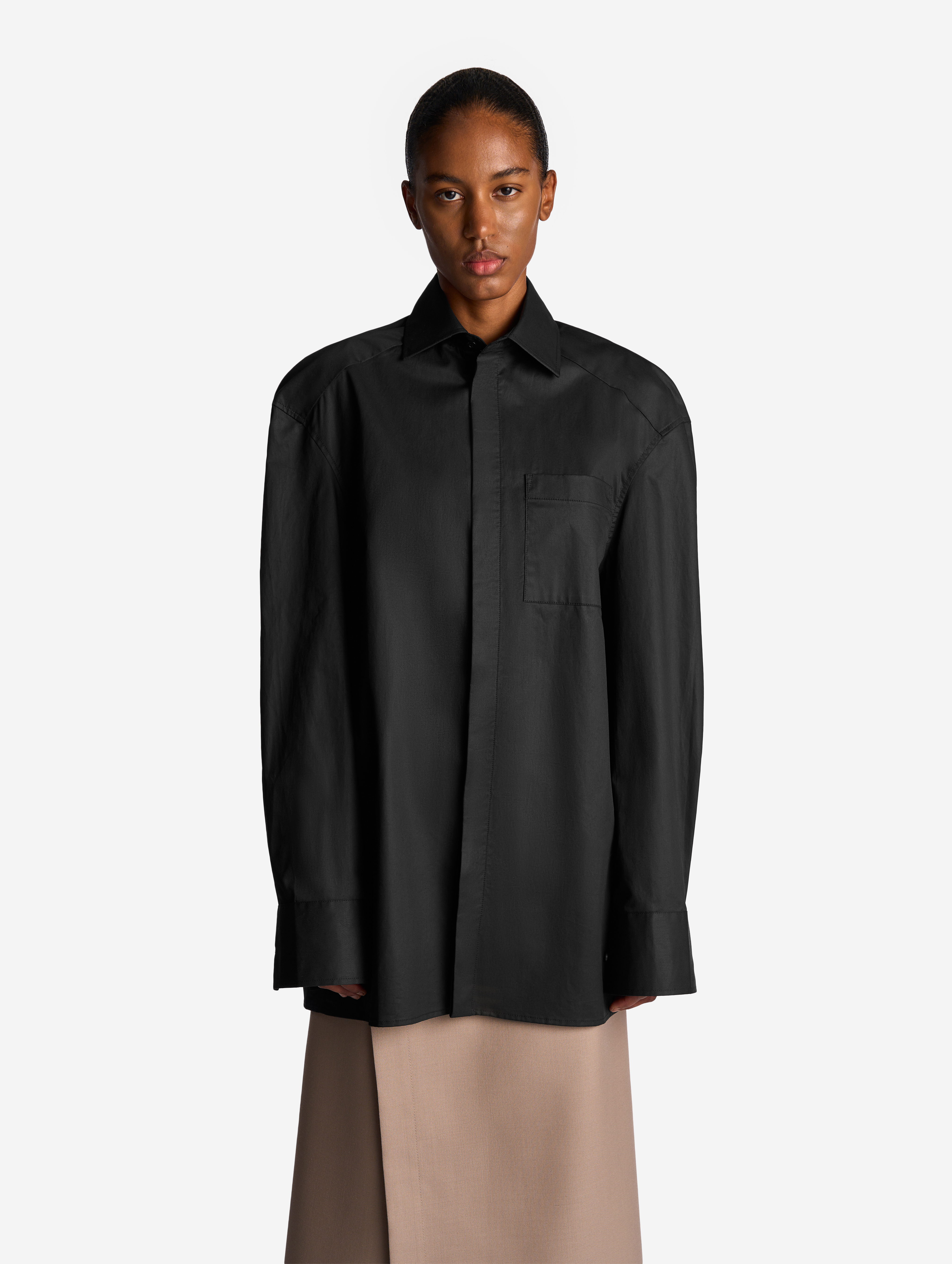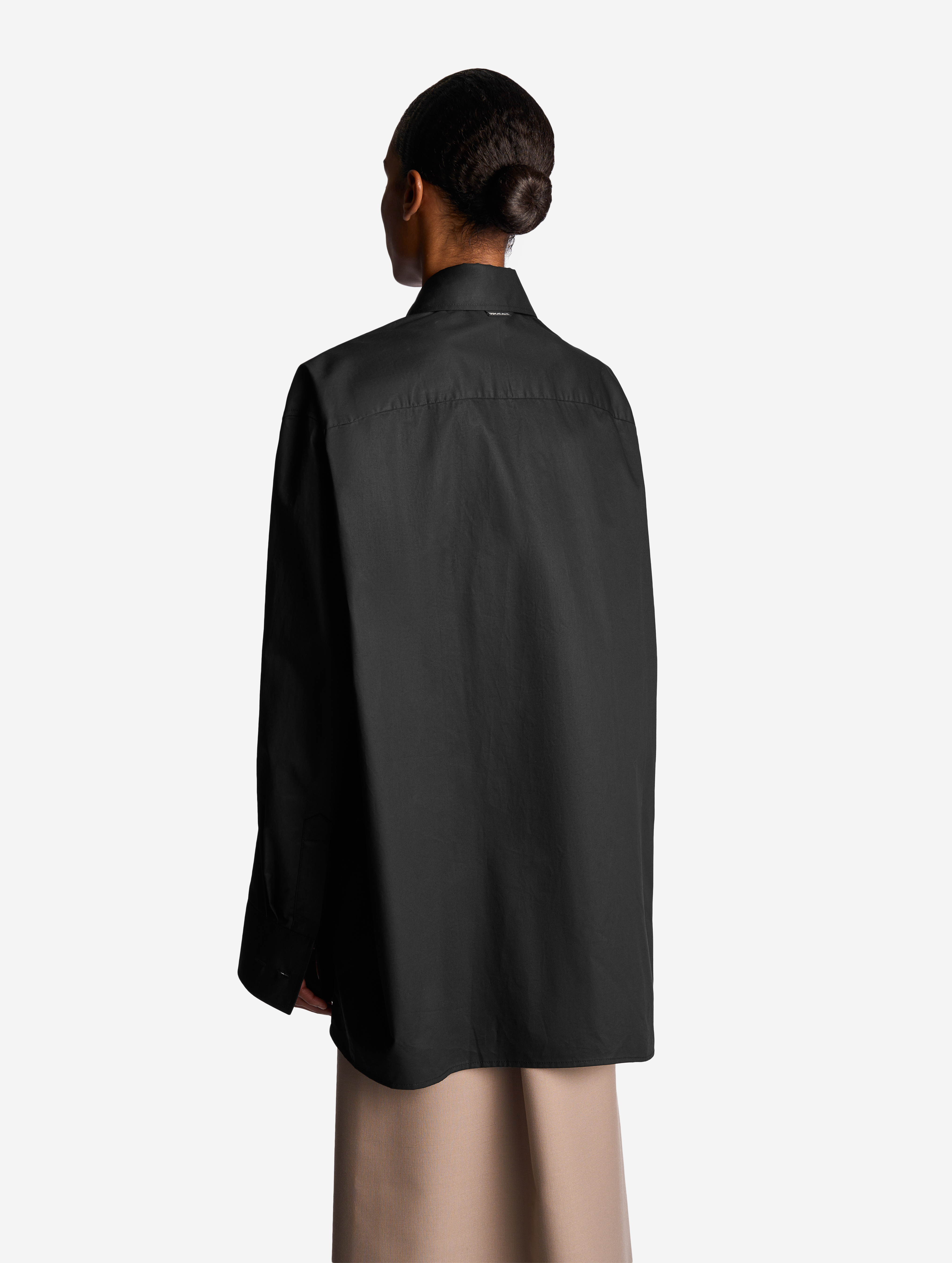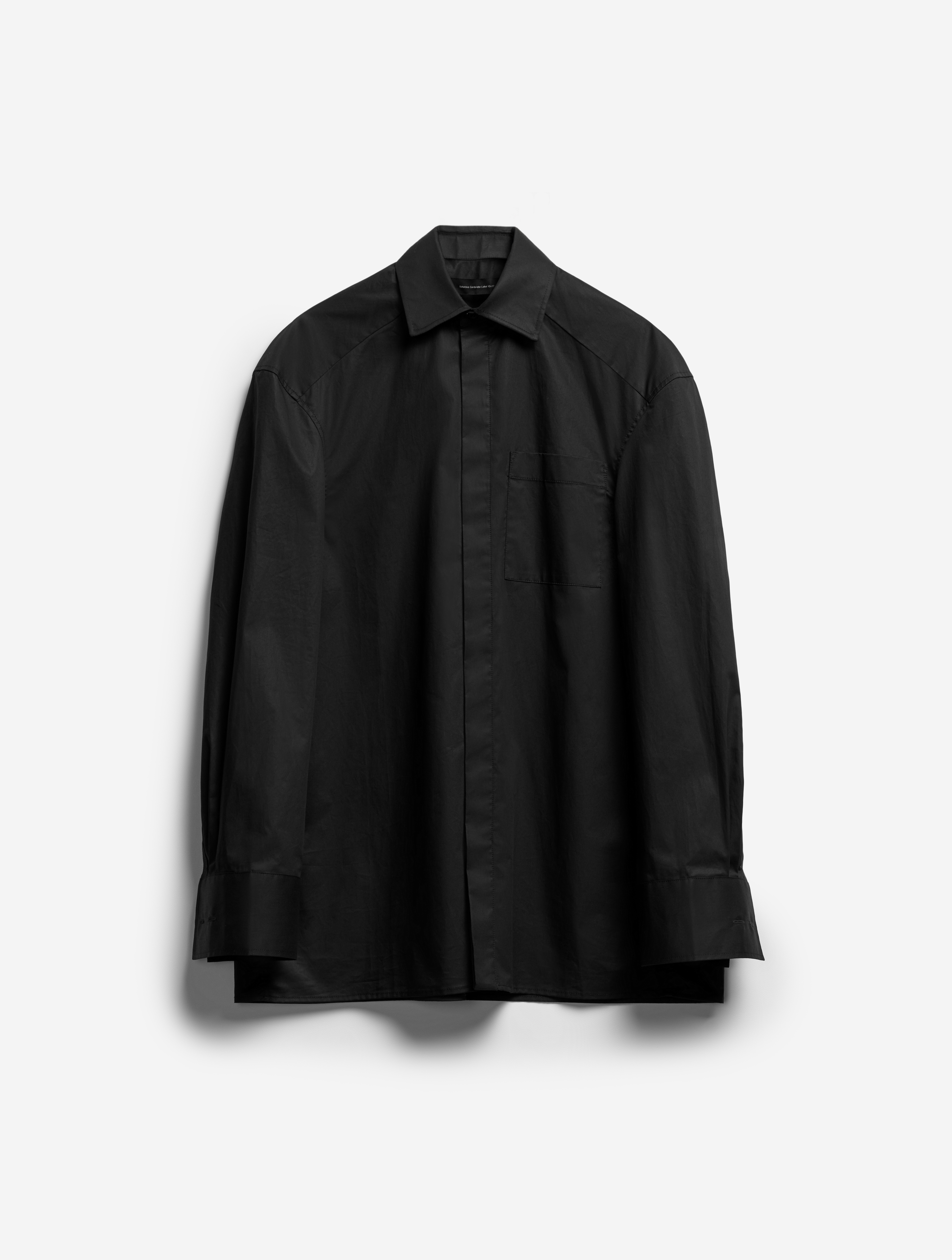 К описанию любой детали этой рубашки можно добавить приставку экстра-. У нее вытянутый силуэт, гипертрофированно длинные и объемные рукава, широкие манжеты с пуговицами, крупный воротник. Плечевая кокетка визуально преображает пропорции тела — плечи будто раздаются вширь. В глубокие разрезы в рукавах, оснащенные потайными молниями, можно продеть руки, и тогда рубашка превратится в кейп. К груди пришит глубокий карман. Рубашка застегивается на ряд пуговиц, спрятанных за планкой.