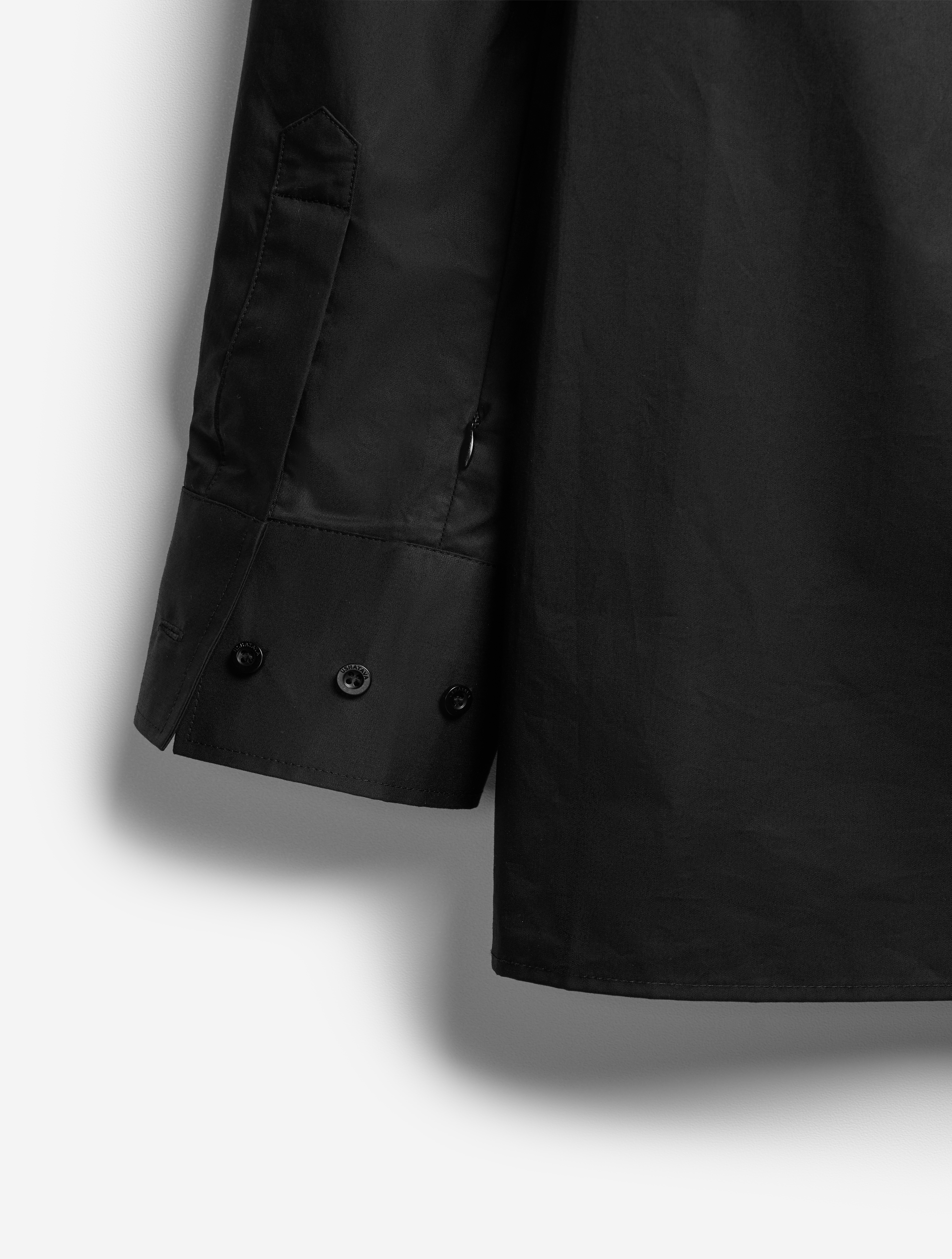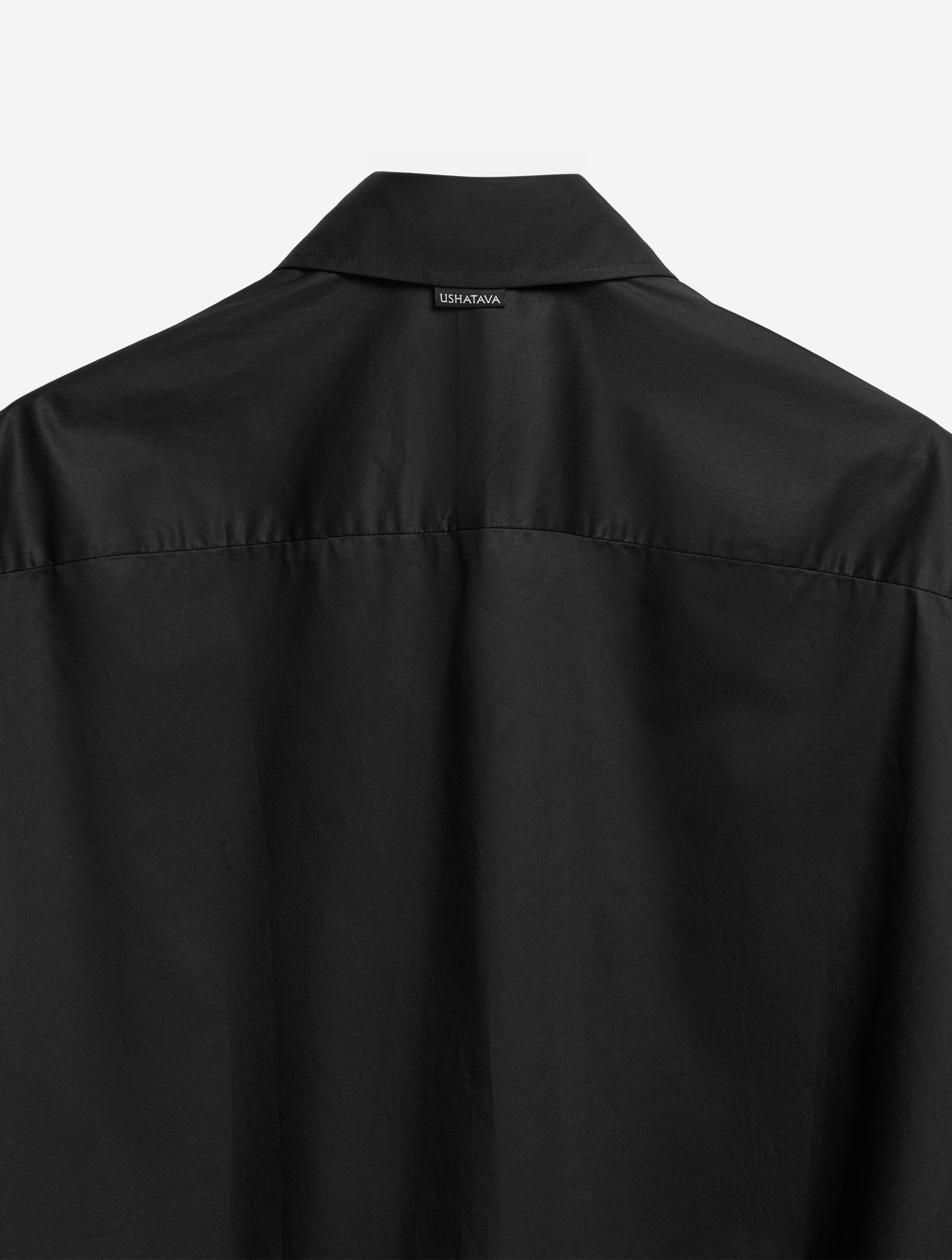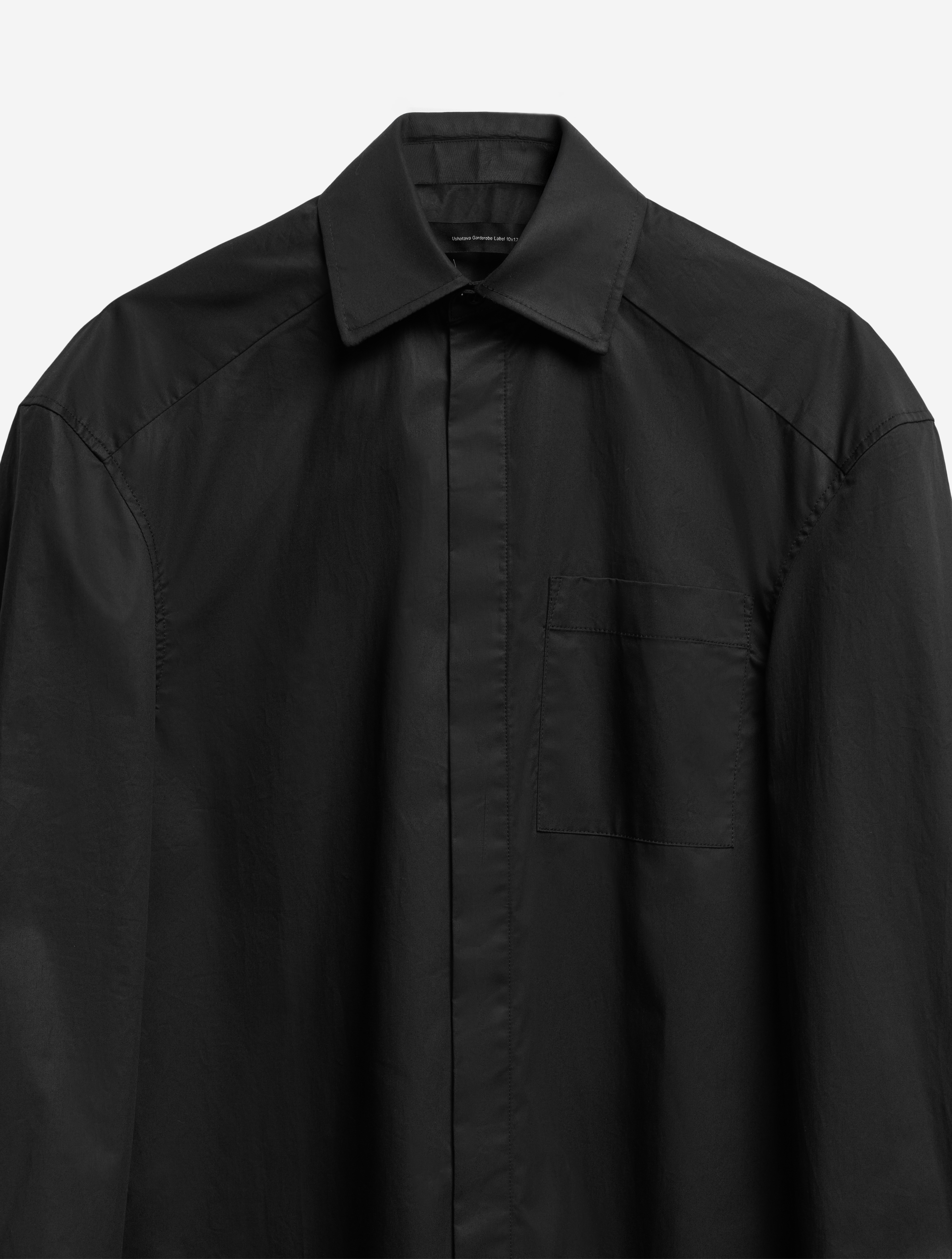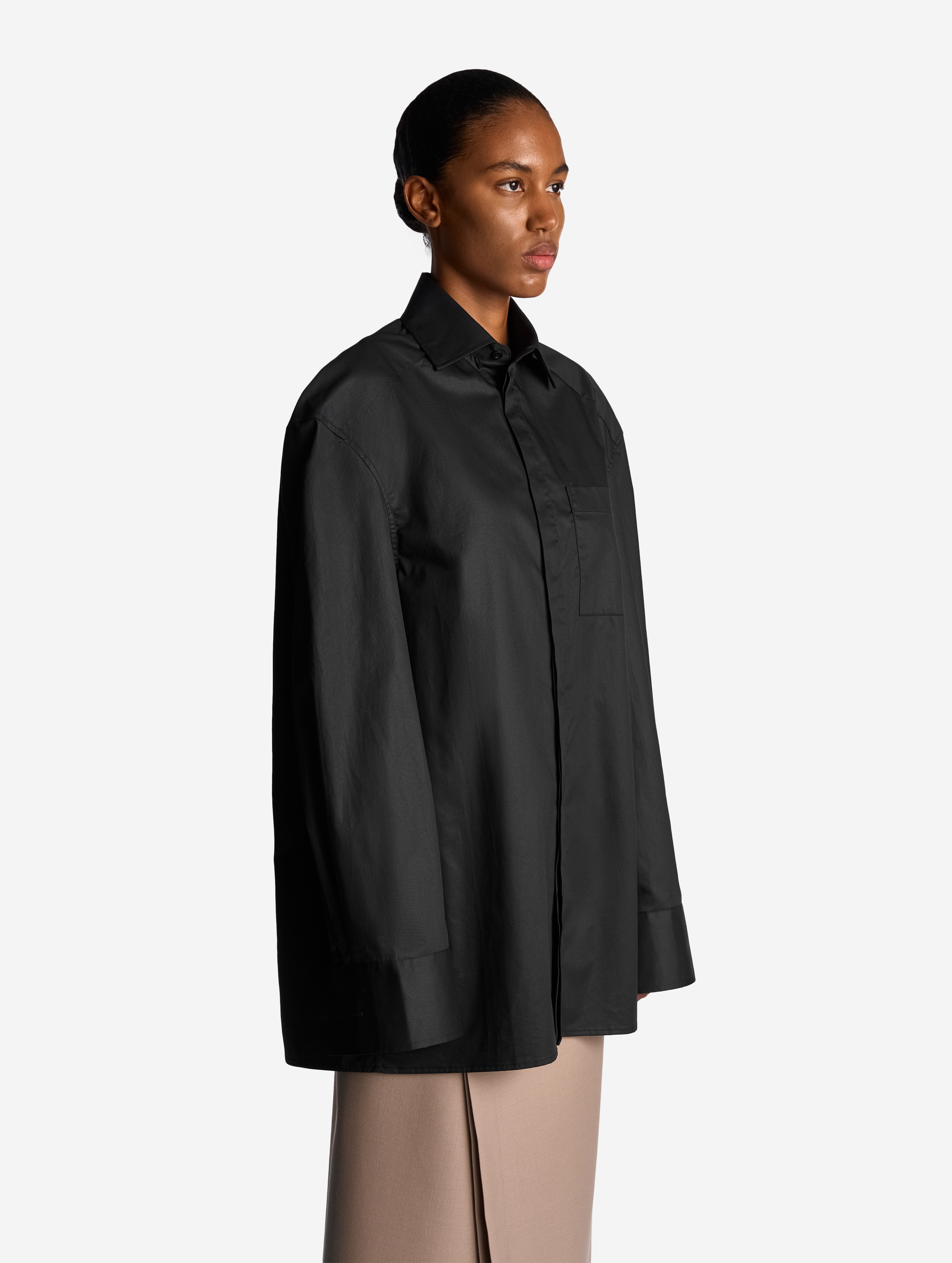 К описанию любой детали этой рубашки можно добавить приставку экстра-. У нее вытянутый силуэт, гипертрофированно длинные и объемные рукава, широкие манжеты с пуговицами, крупный воротник. Плечевая кокетка визуально преображает пропорции тела — плечи будто раздаются вширь. В глубокие разрезы в рукавах, оснащенные потайными молниями, можно продеть руки, и тогда рубашка превратится в кейп. К груди пришит глубокий карман. Рубашка застегивается на ряд пуговиц, спрятанных за планкой.