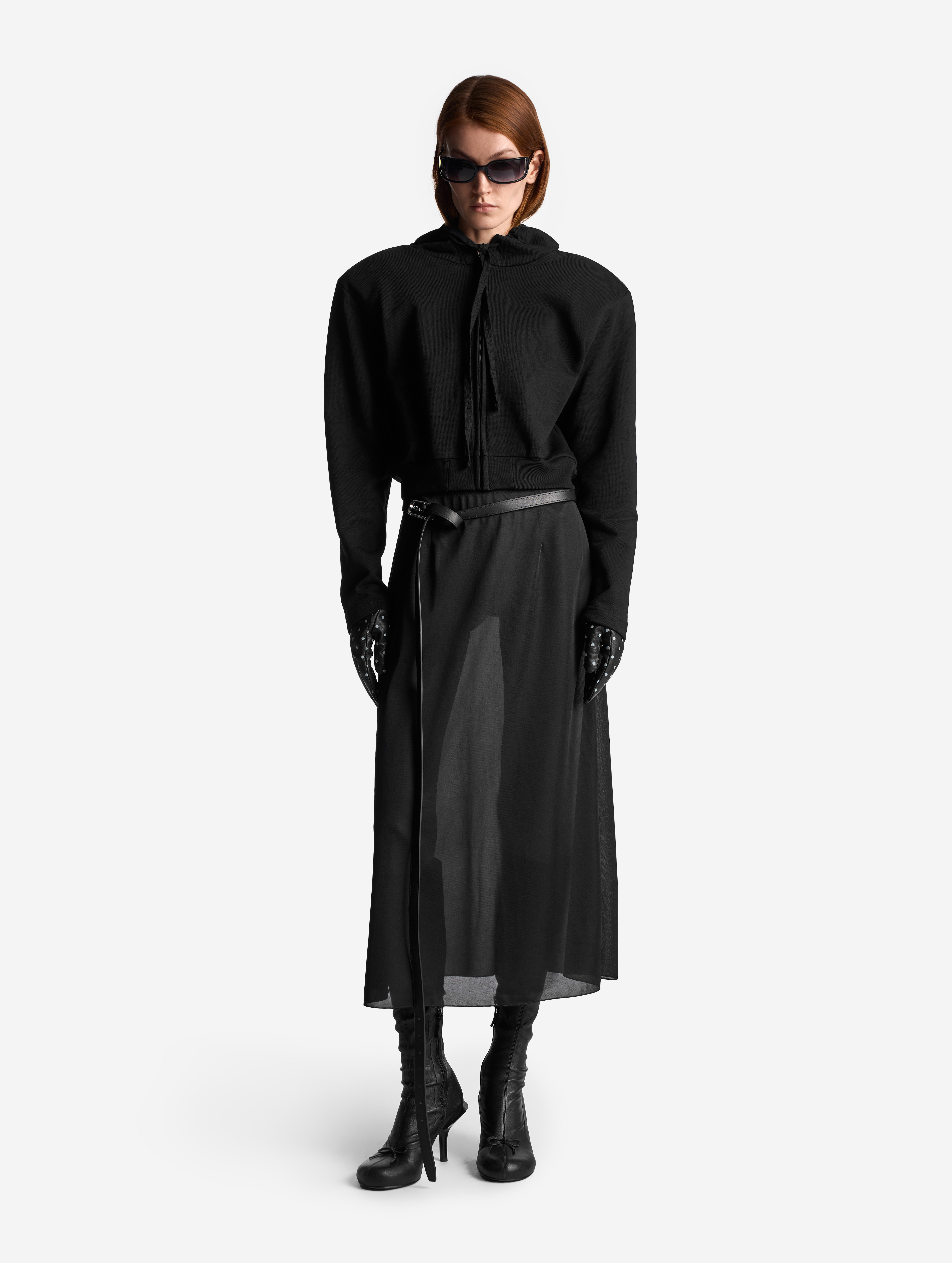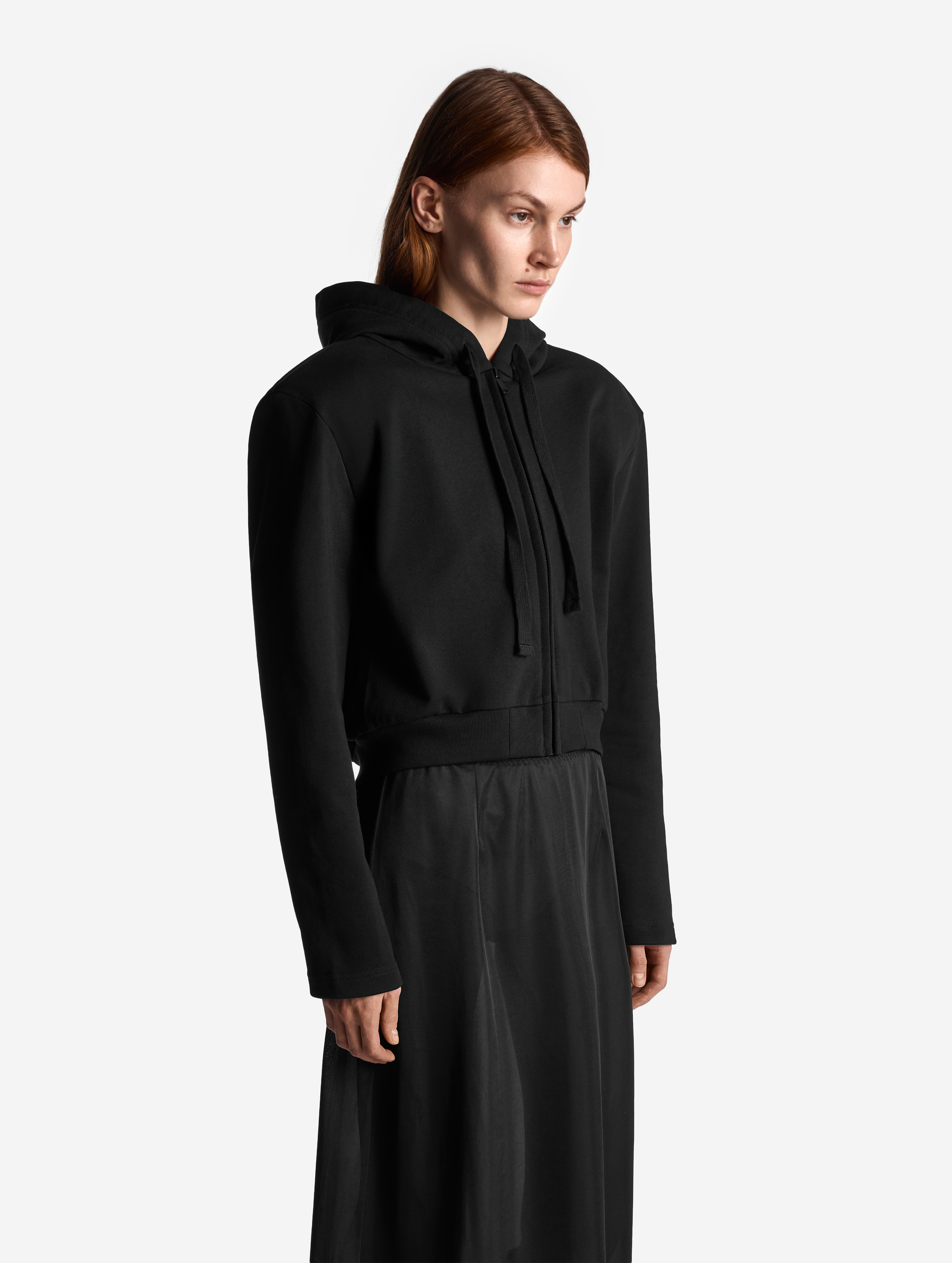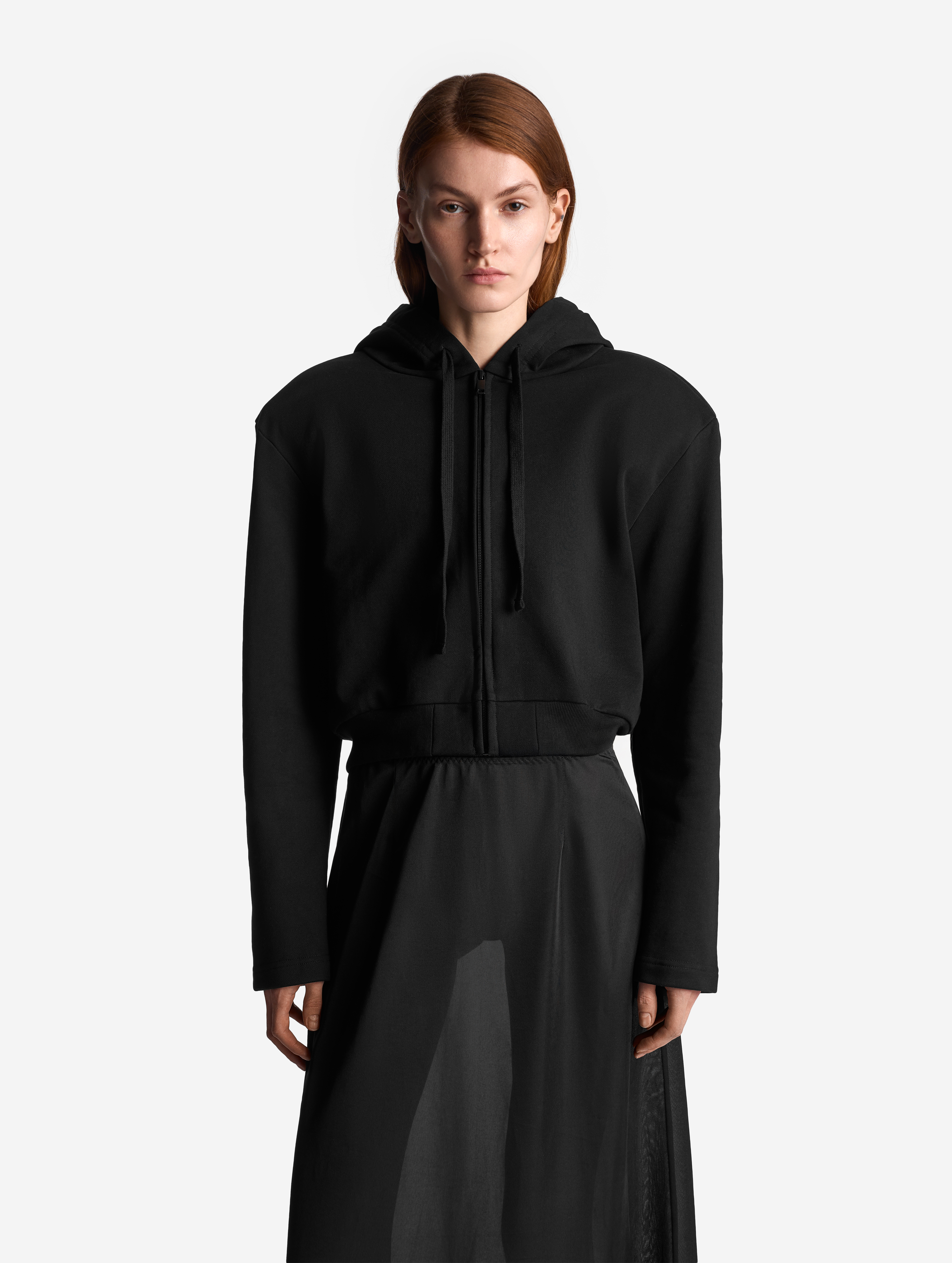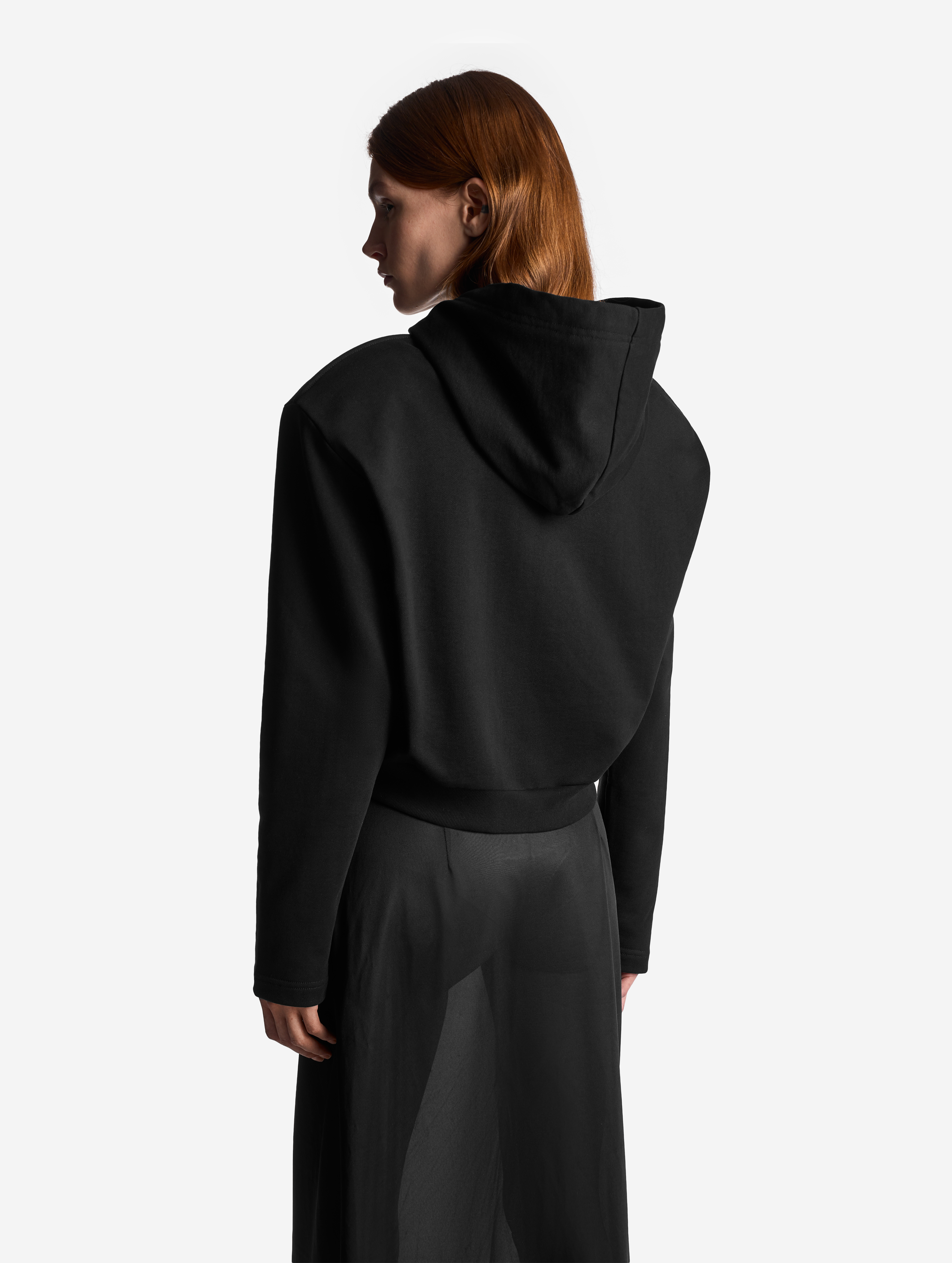 Главная особенность этого укороченного худи — высокие мягкие подплечники. Они крепятся к ткани при помощи маленьких кнопок: если их снять, силуэт станет более обтекаемым. Изделие выполнено из футера — мягкого, с легким peach-эффектом. Для этого материала характерна высокая износоустойчивость, поэтому даже после многочисленных стирок худи будет сохранять изначальную форму и вид. Изделие застегивается на молнию. Низ худи обработан плотной резинкой-подвязом. Глубокий капюшон затягивается шнурком.