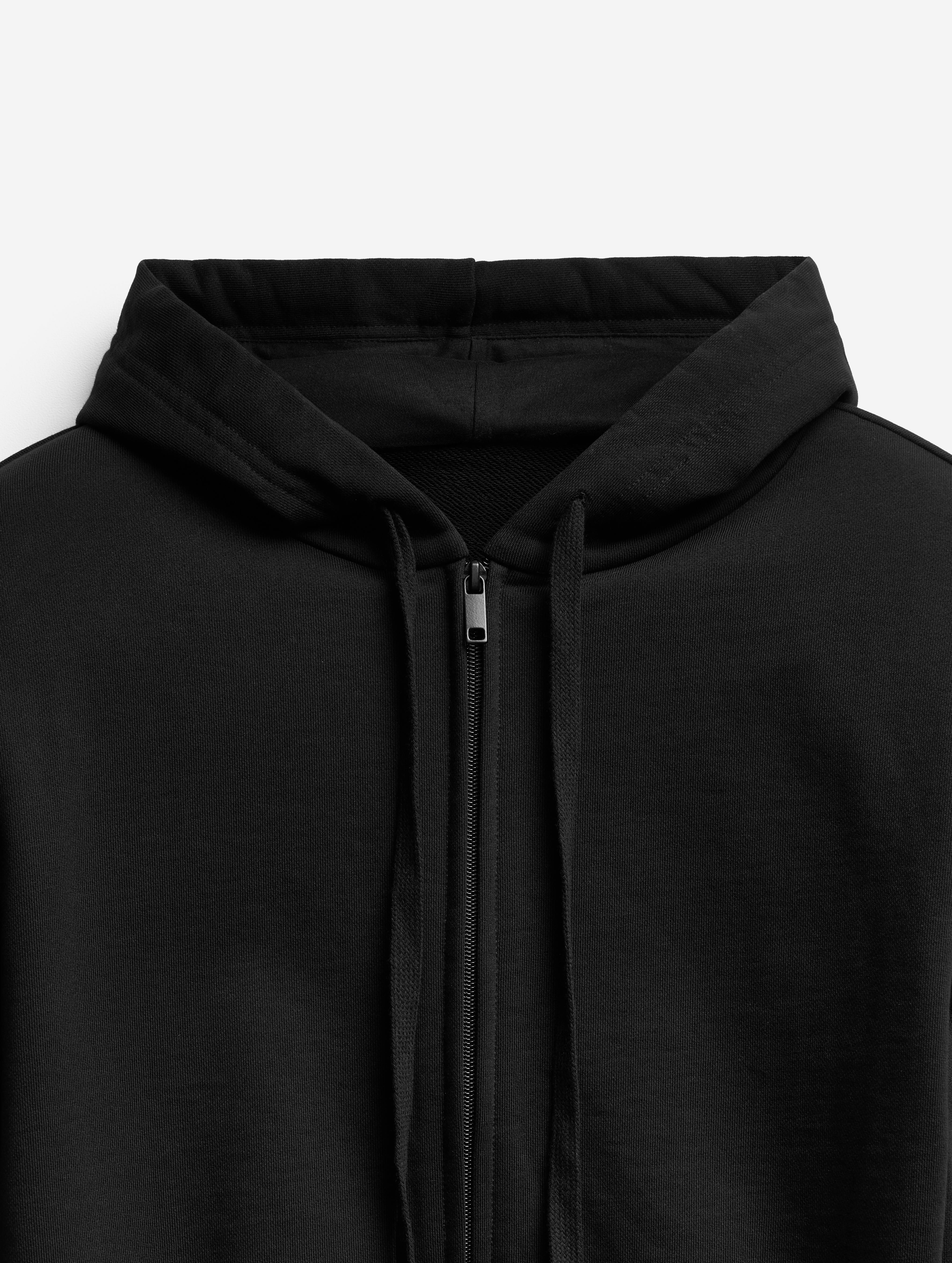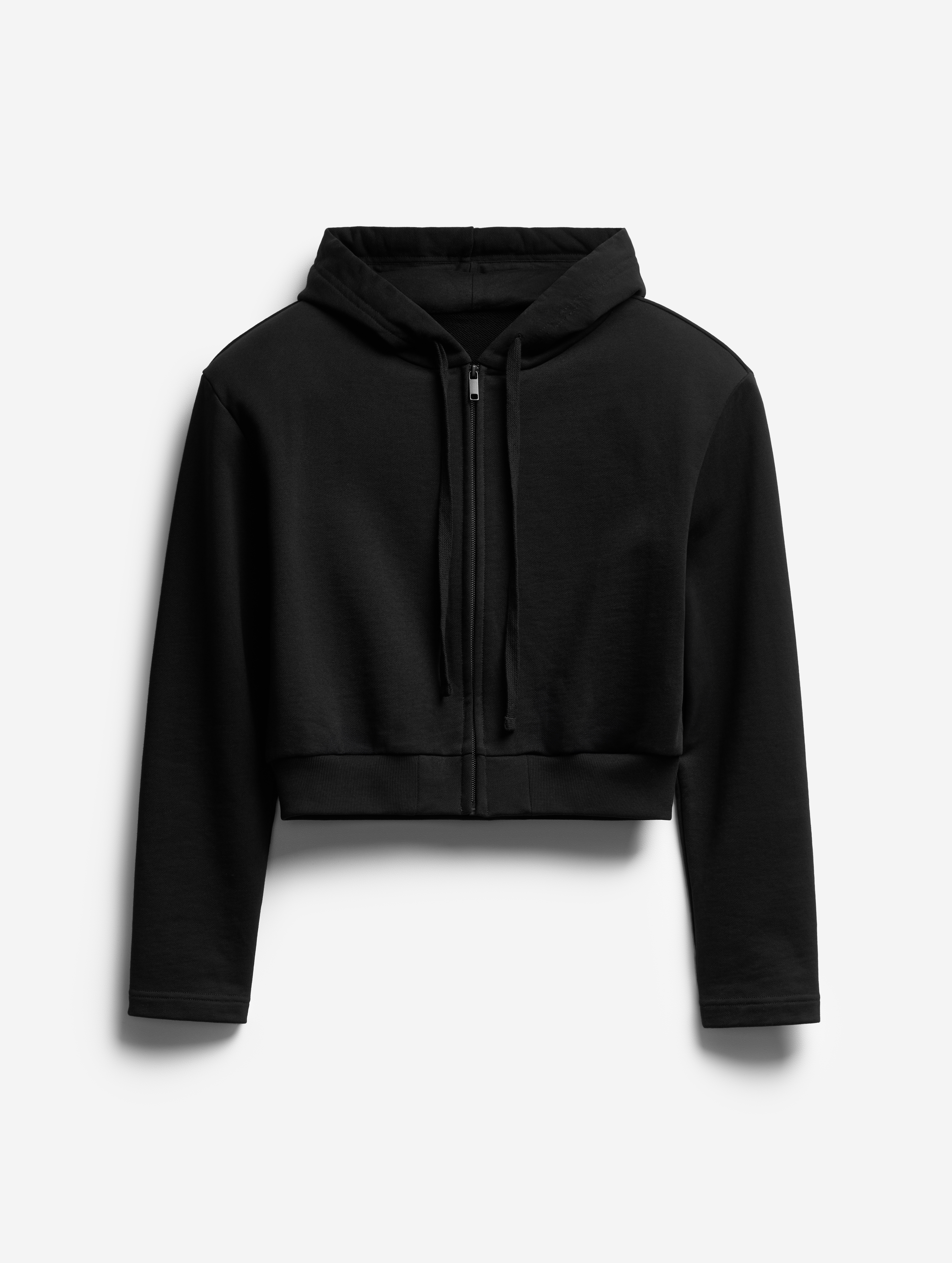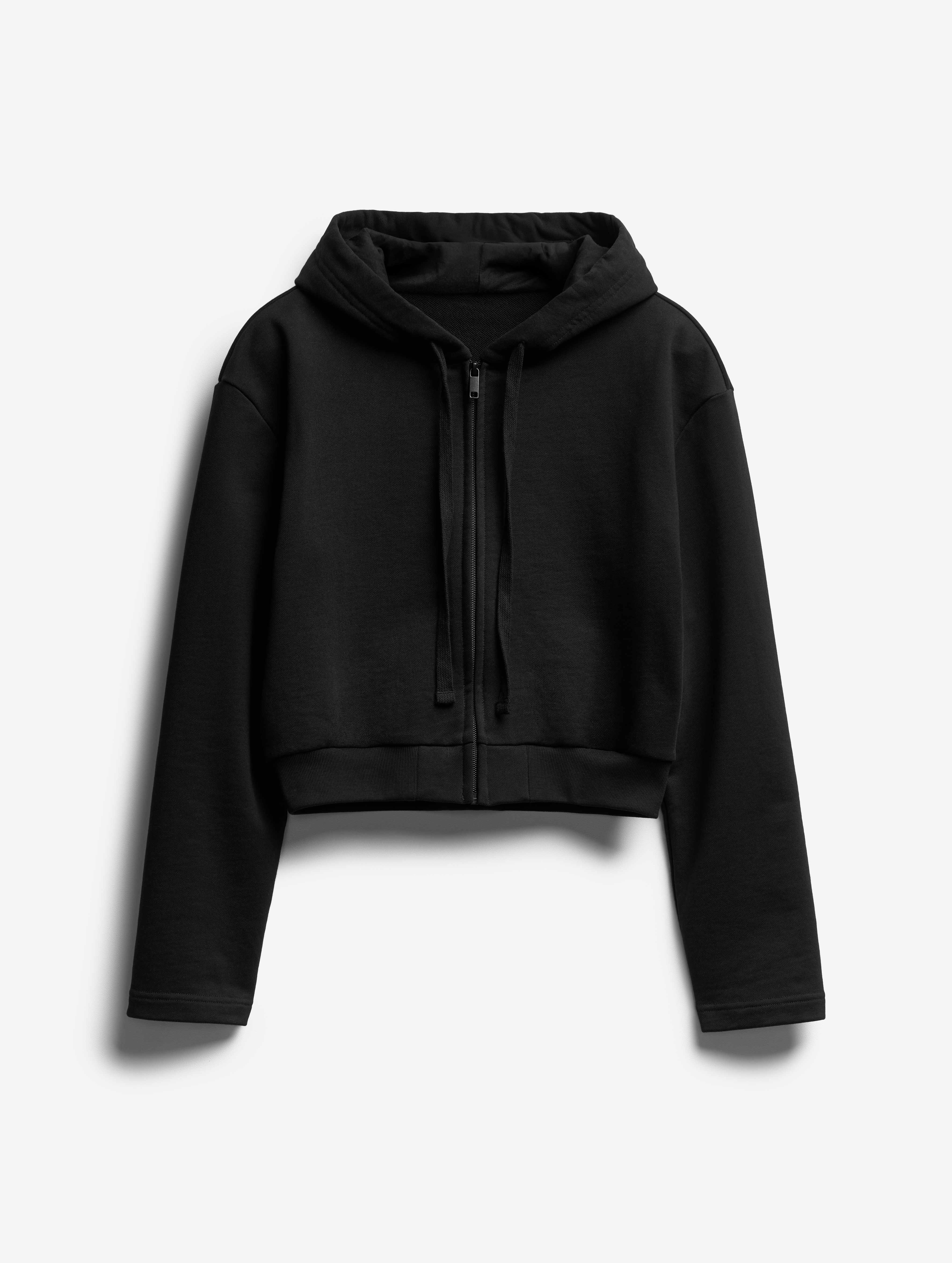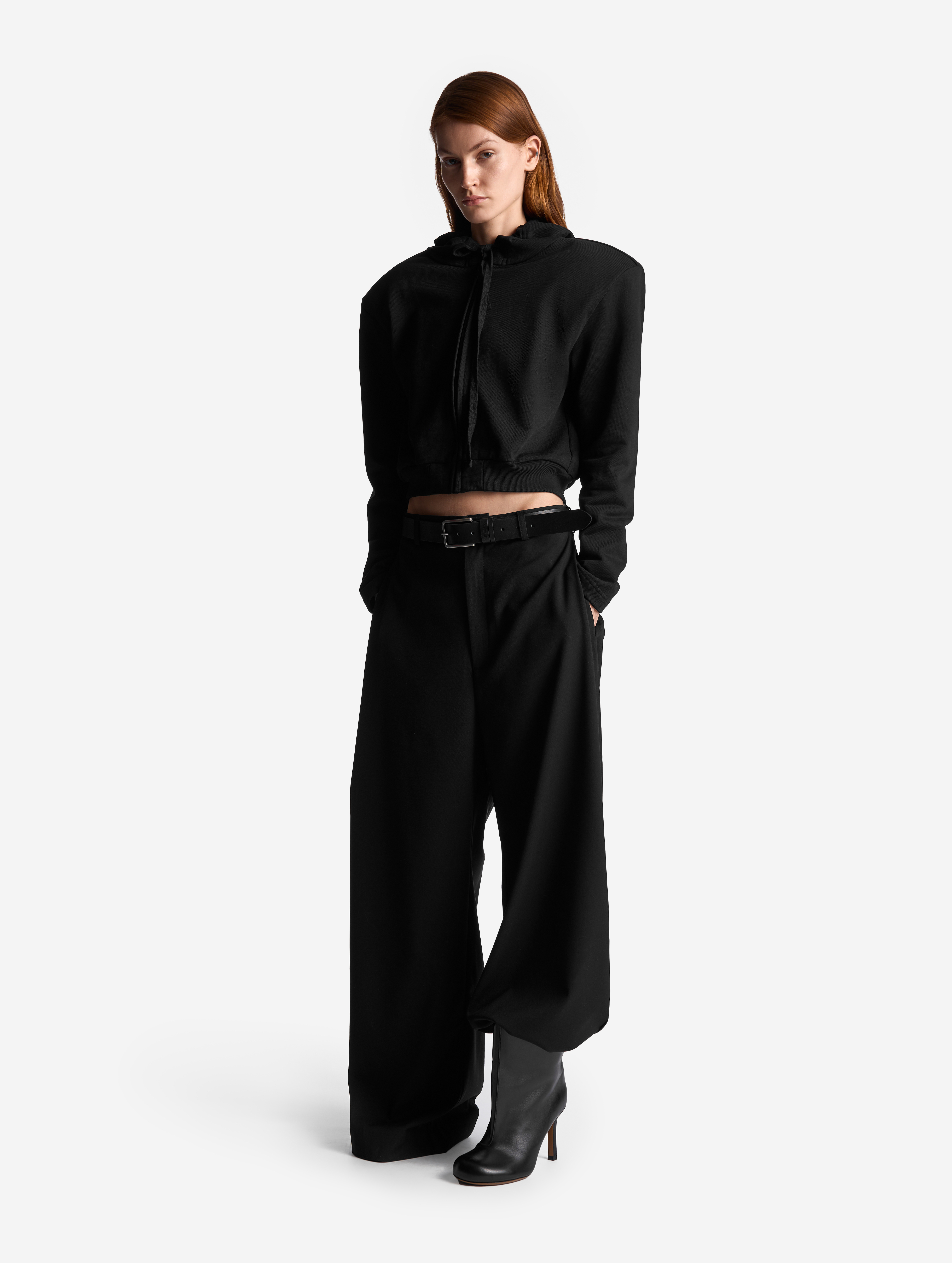 Главная особенность этого укороченного худи — высокие мягкие подплечники. Они крепятся к ткани при помощи маленьких кнопок: если их снять, силуэт станет более обтекаемым. Изделие выполнено из футера — мягкого, с легким peach-эффектом. Для этого материала характерна высокая износоустойчивость, поэтому даже после многочисленных стирок худи будет сохранять изначальную форму и вид. Изделие застегивается на молнию. Низ худи обработан плотной резинкой-подвязом. Глубокий капюшон затягивается шнурком.