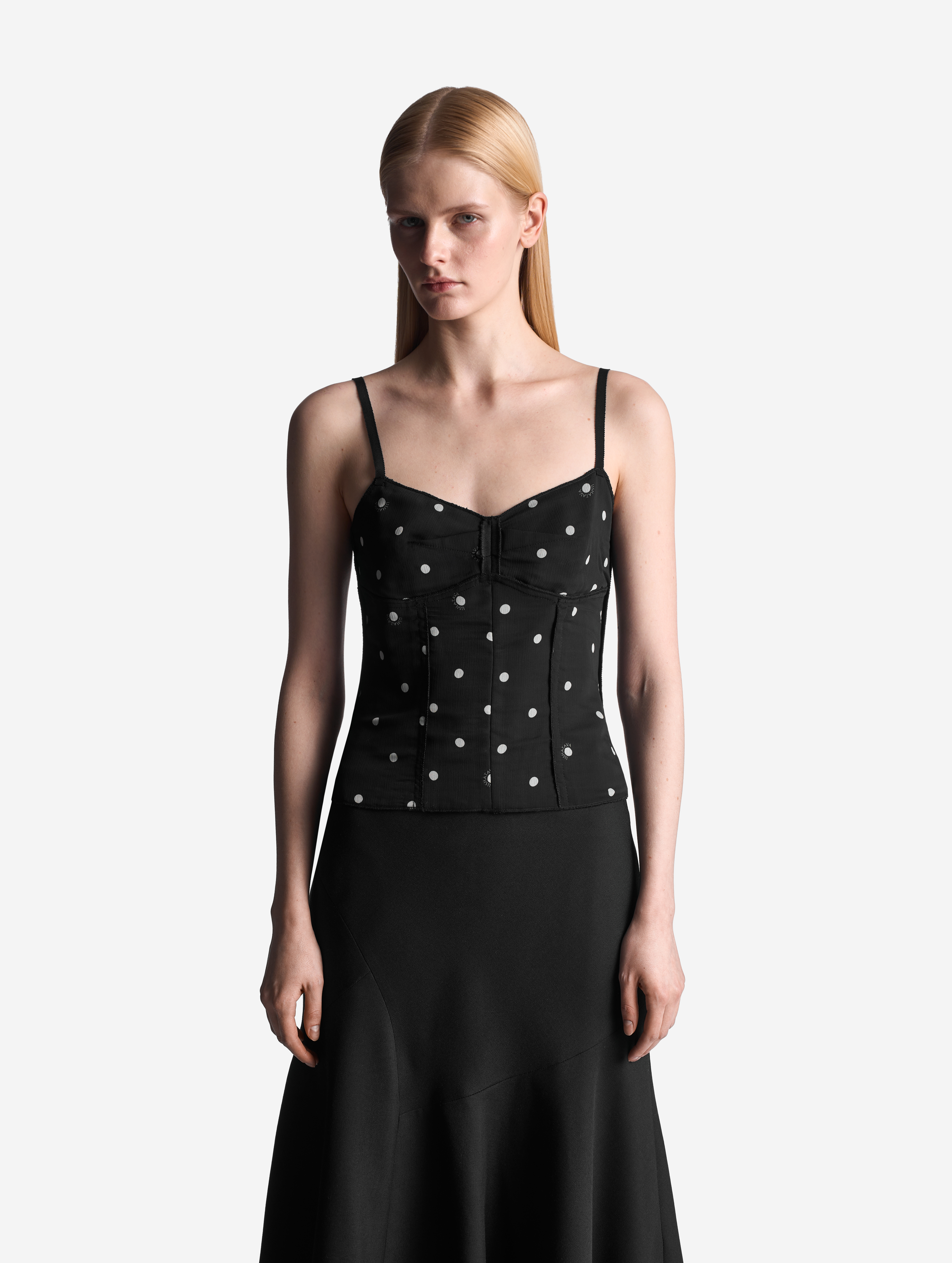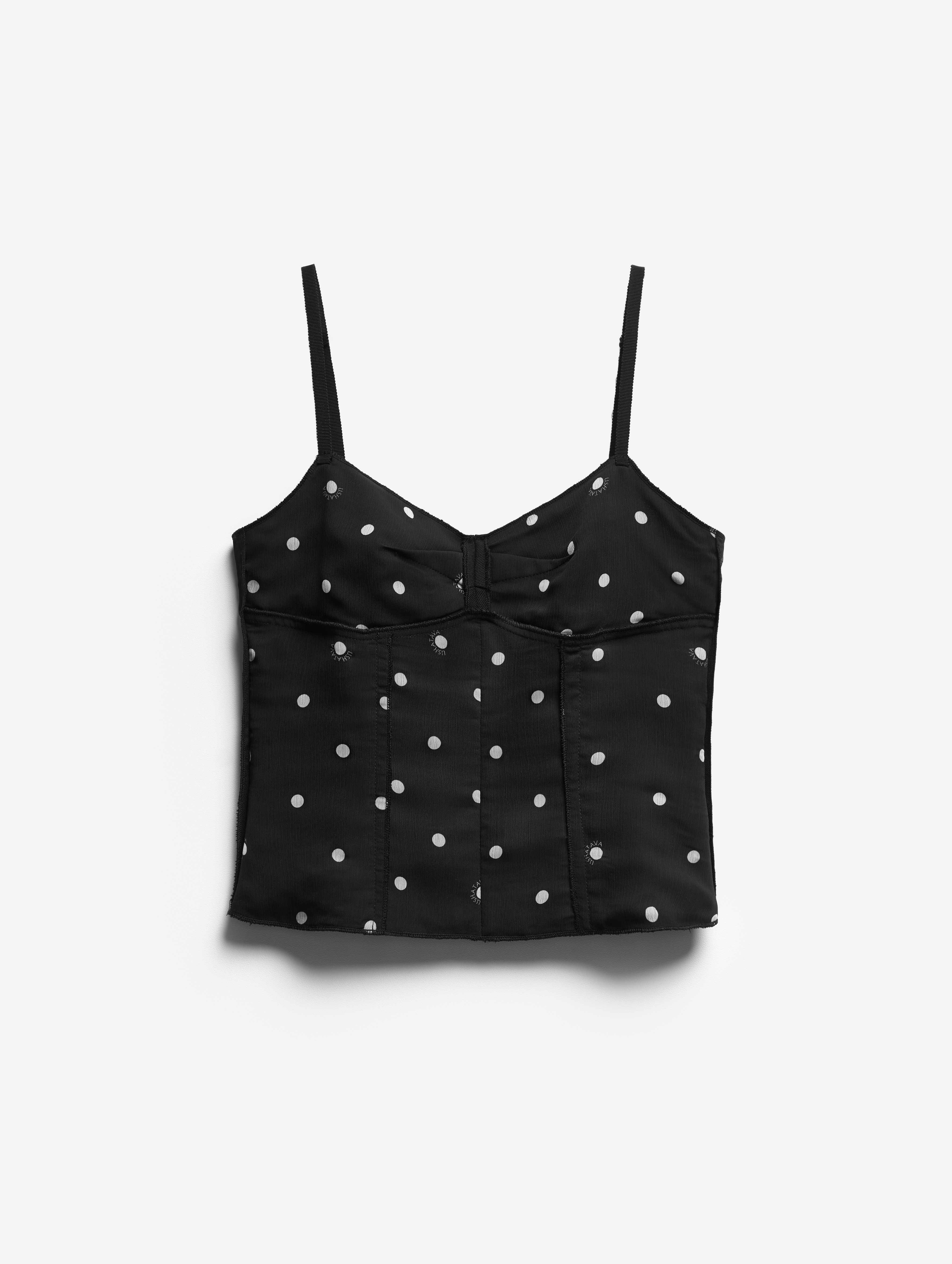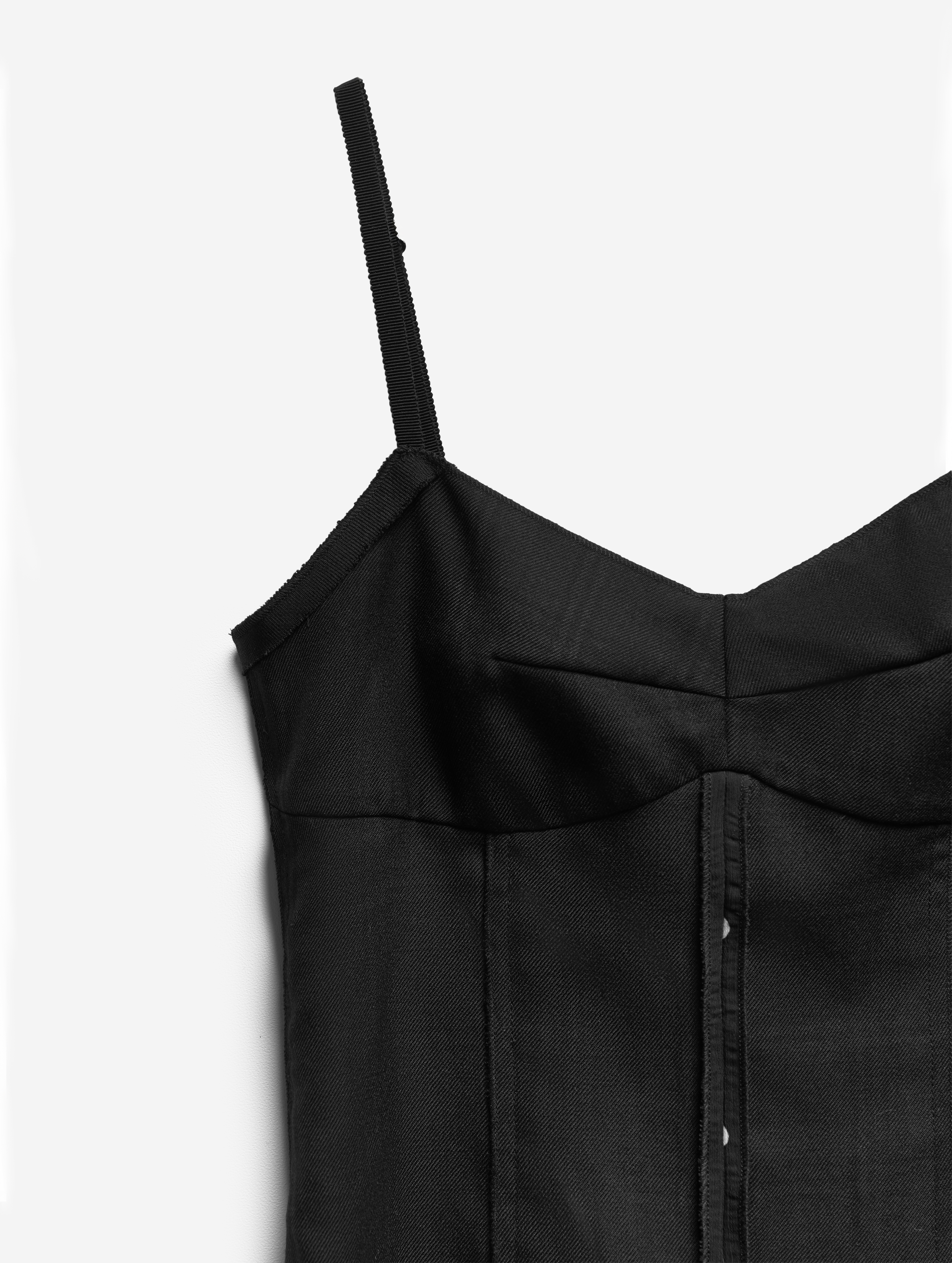 «Мы никогда не использовали косточки в Ushatava — все эти годы нам удавалось найти альтернативные способы создания конструкции», — говорит Нино Шаматава, креативный директор Ushatava. Мягкий облегающий корсет Archive отличается от классического тем, что не содержит ни косточек, ни шнуровки. Он держится на теле за счет рельефных швов, а сзади застегивается на молнию. Еще его можно носить на две стороны. Лицевая выполнена из плотной костюмной ткани, в составе которой присутствует шерсть. Изнанка обработана шифоном с крэш-эффектом — его украшает принт, специально разработанный дизайнерами Ushatava: если приглядеться внимательнее, можно заметить, как название модного Дома обрамляет белый горошек.