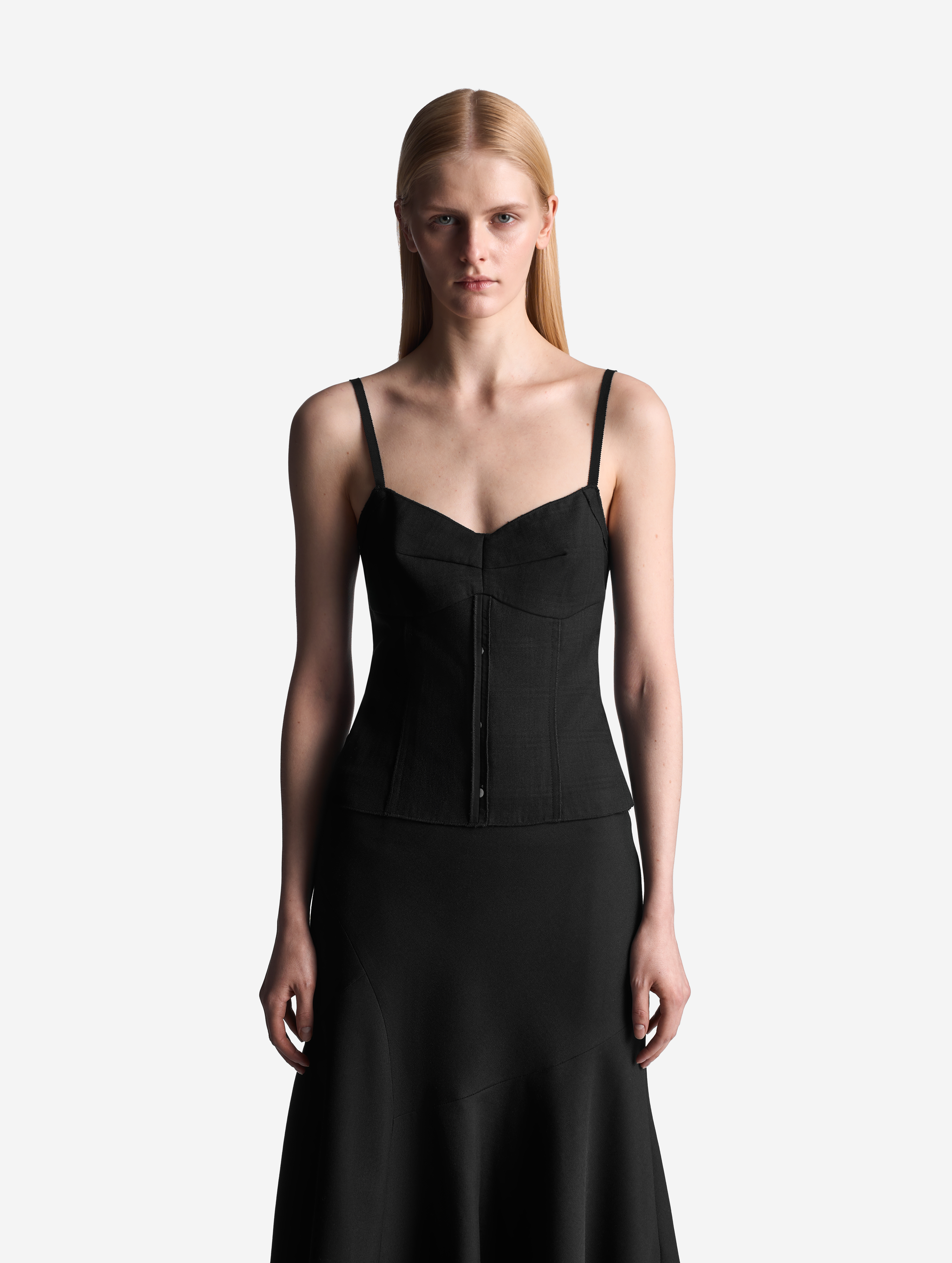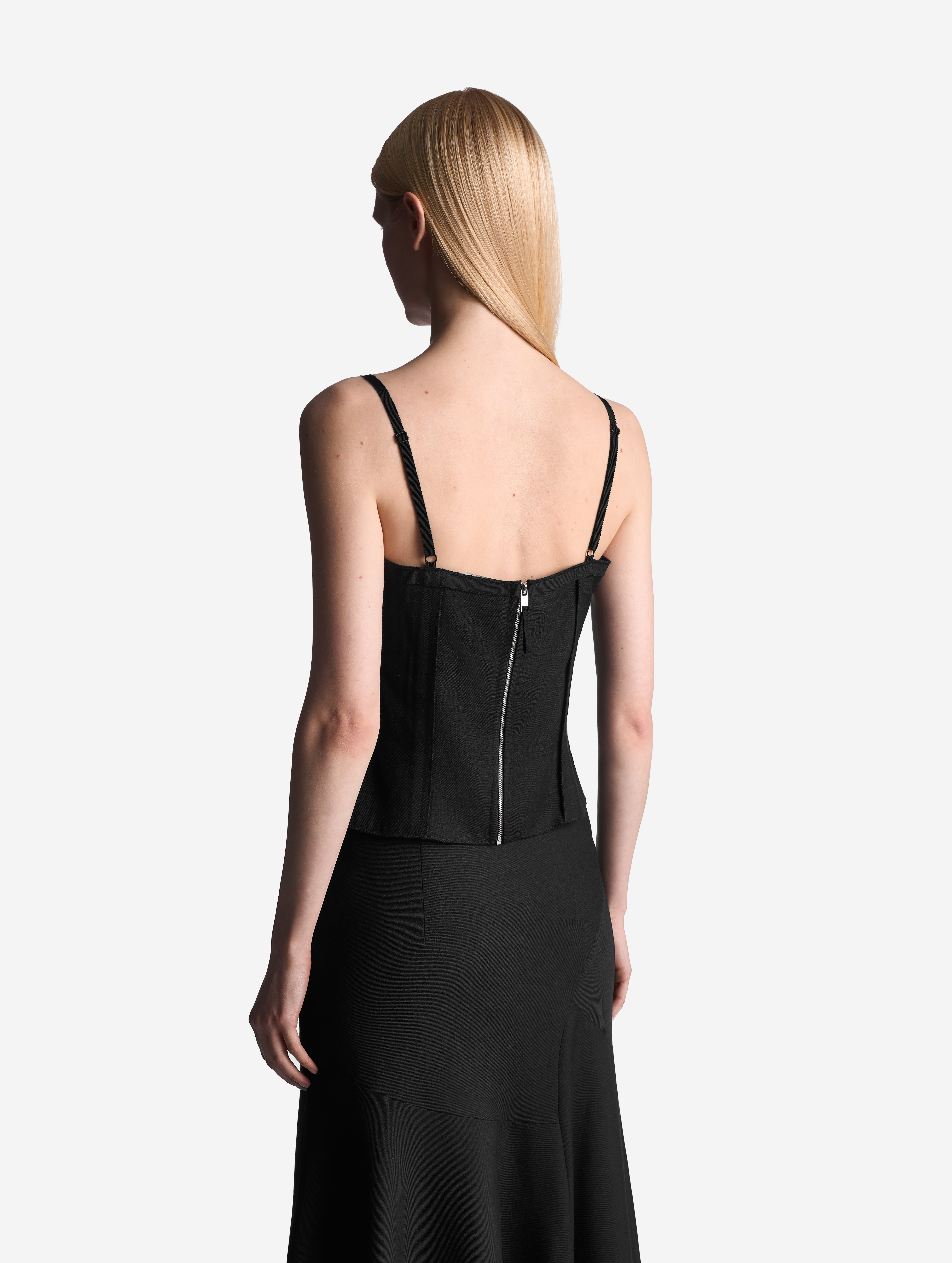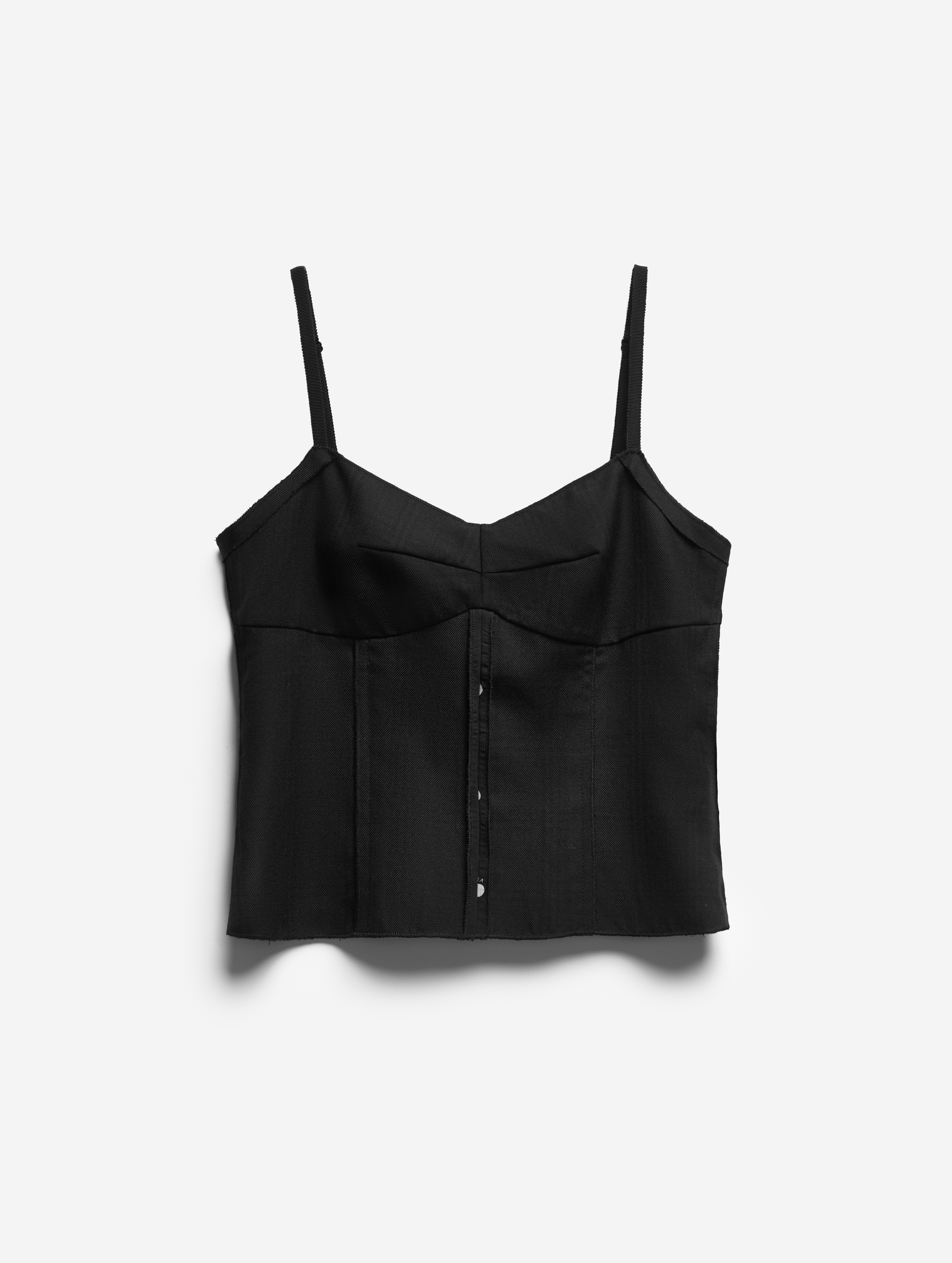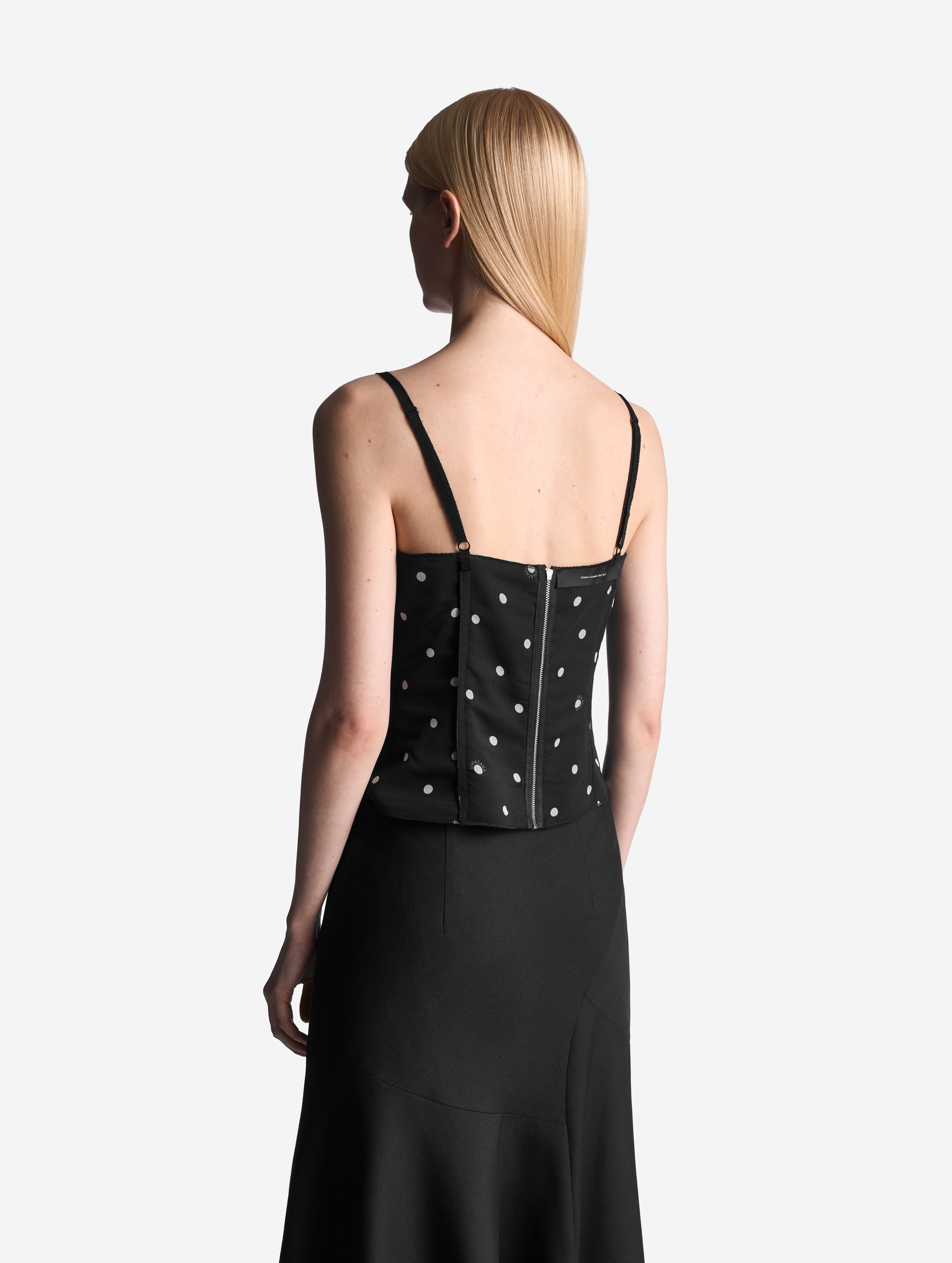 «Мы никогда не использовали косточки в Ushatava — все эти годы нам удавалось найти альтернативные способы создания конструкции», — говорит Нино Шаматава, креативный директор Ushatava. Мягкий облегающий корсет Archive отличается от классического тем, что не содержит ни косточек, ни шнуровки. Он держится на теле за счет рельефных швов, а сзади застегивается на молнию. Еще его можно носить на две стороны. Лицевая выполнена из плотной костюмной ткани, в составе которой присутствует шерсть. Изнанка обработана шифоном с крэш-эффектом — его украшает принт, специально разработанный дизайнерами Ushatava: если приглядеться внимательнее, можно заметить, как название модного Дома обрамляет белый горошек.