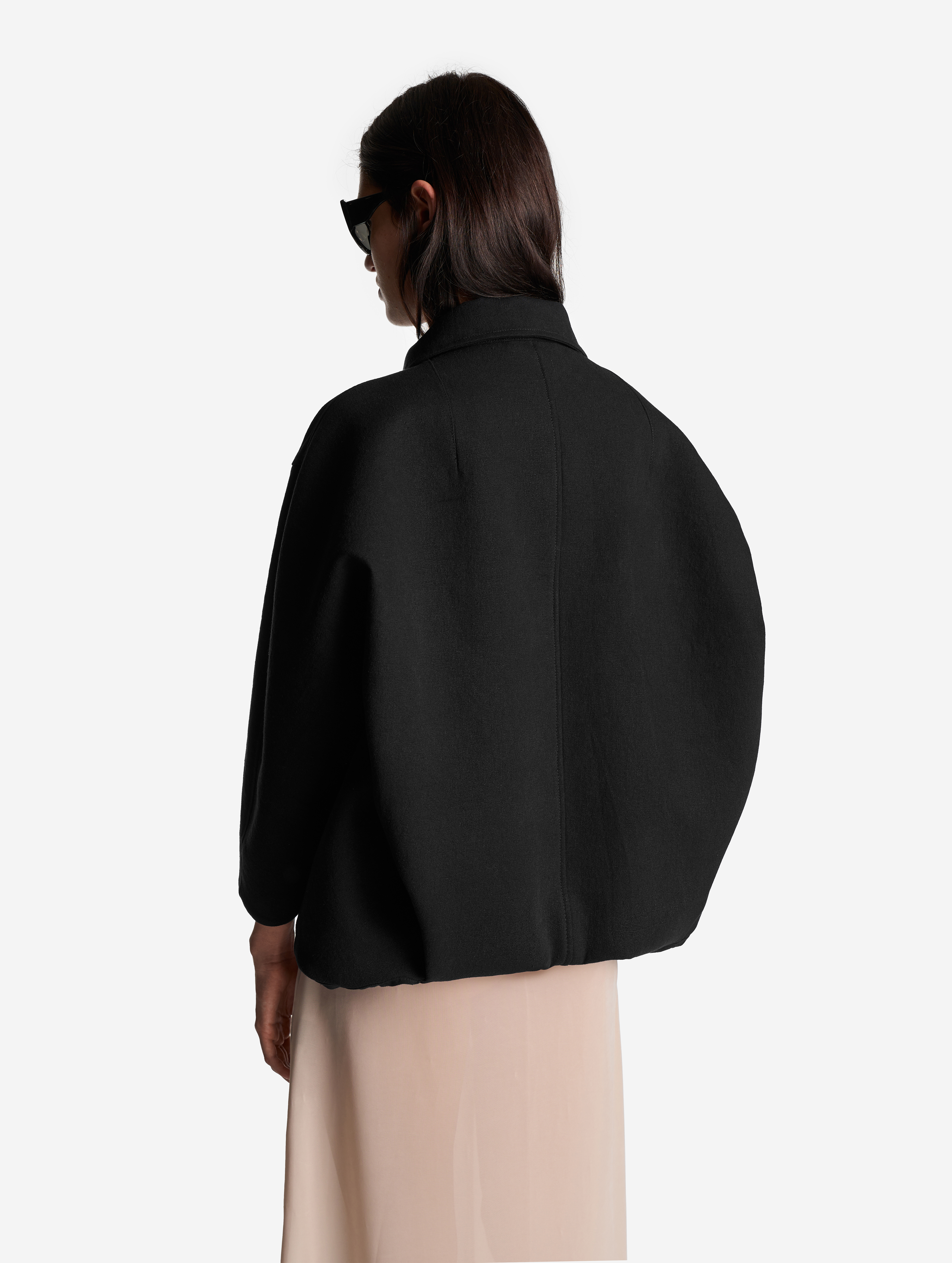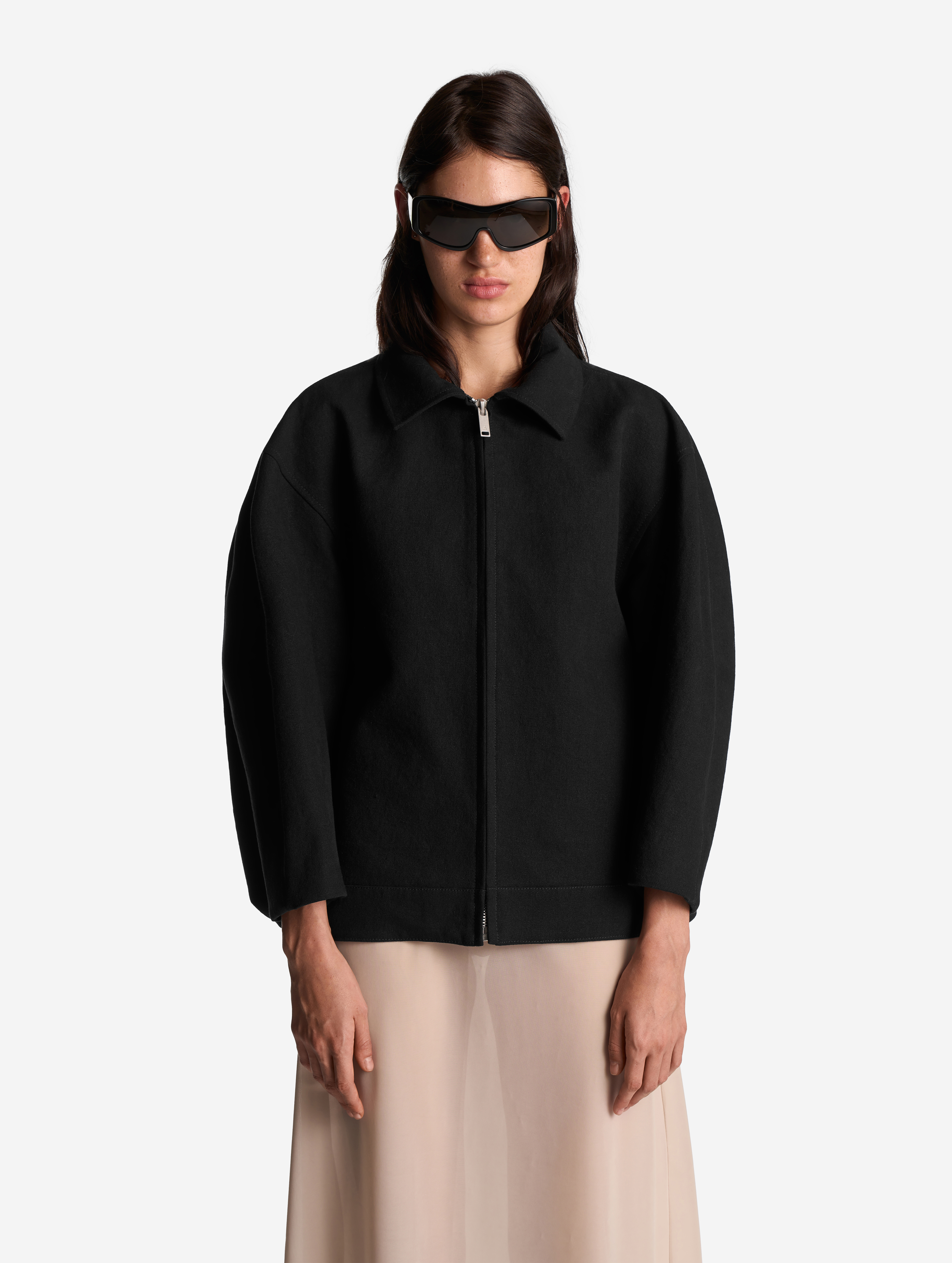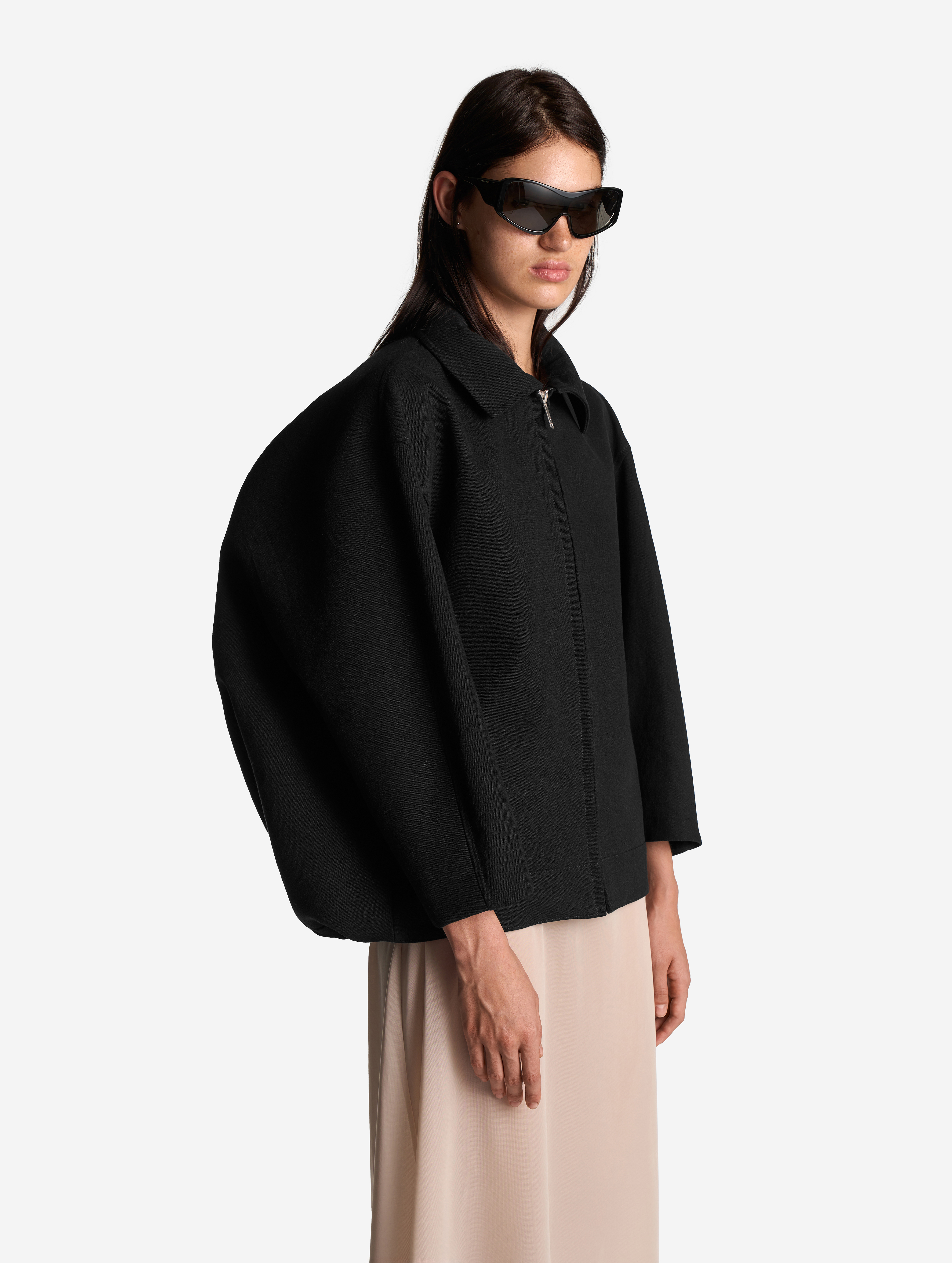 Среди бестселлеров модного Дома встречаются изделия, получившие название за сходство с какой-либо буквой. Силуэт этой куртки в профиль напоминает вид латинской буквы D. По нижнему краю изделия протянута шляпная резинка, которая затягивается изнутри и позволяет регулировать посадку вещи. Куртка выполнена из формоустойчивого плотного льна, у нее расслабленная посадка и оверсайз-силуэт. Для создания покатого спущенного плеча мы применили комбинированный покрой рукава. Особенность его конструкции заключается в том, что спереди рукав втачной, а на спинке — реглан. Сам рукав заужен книзу и по длине достигает запястья. Куртка застегивается на молнию. Есть два боковых кармана и один внутренний.