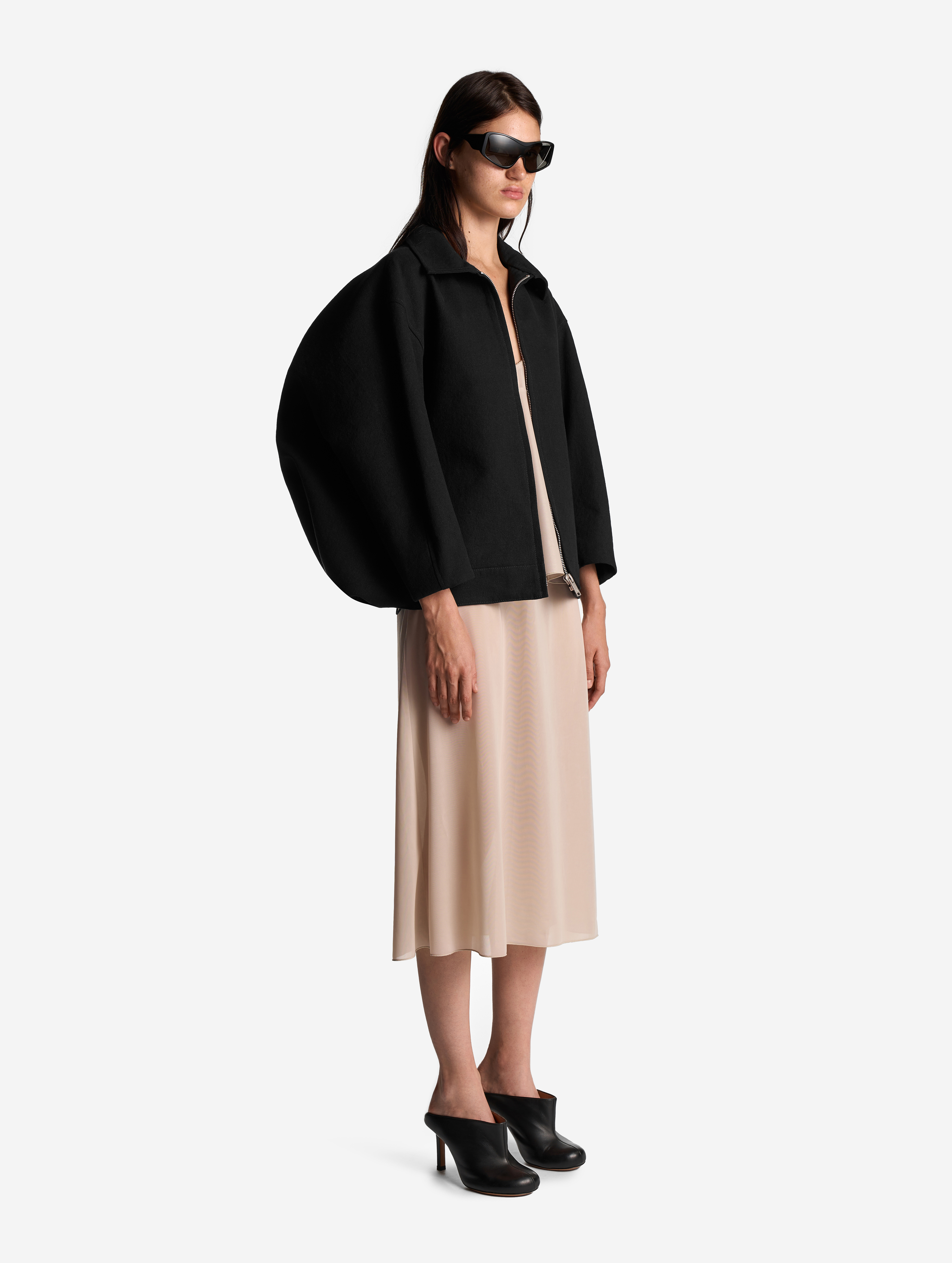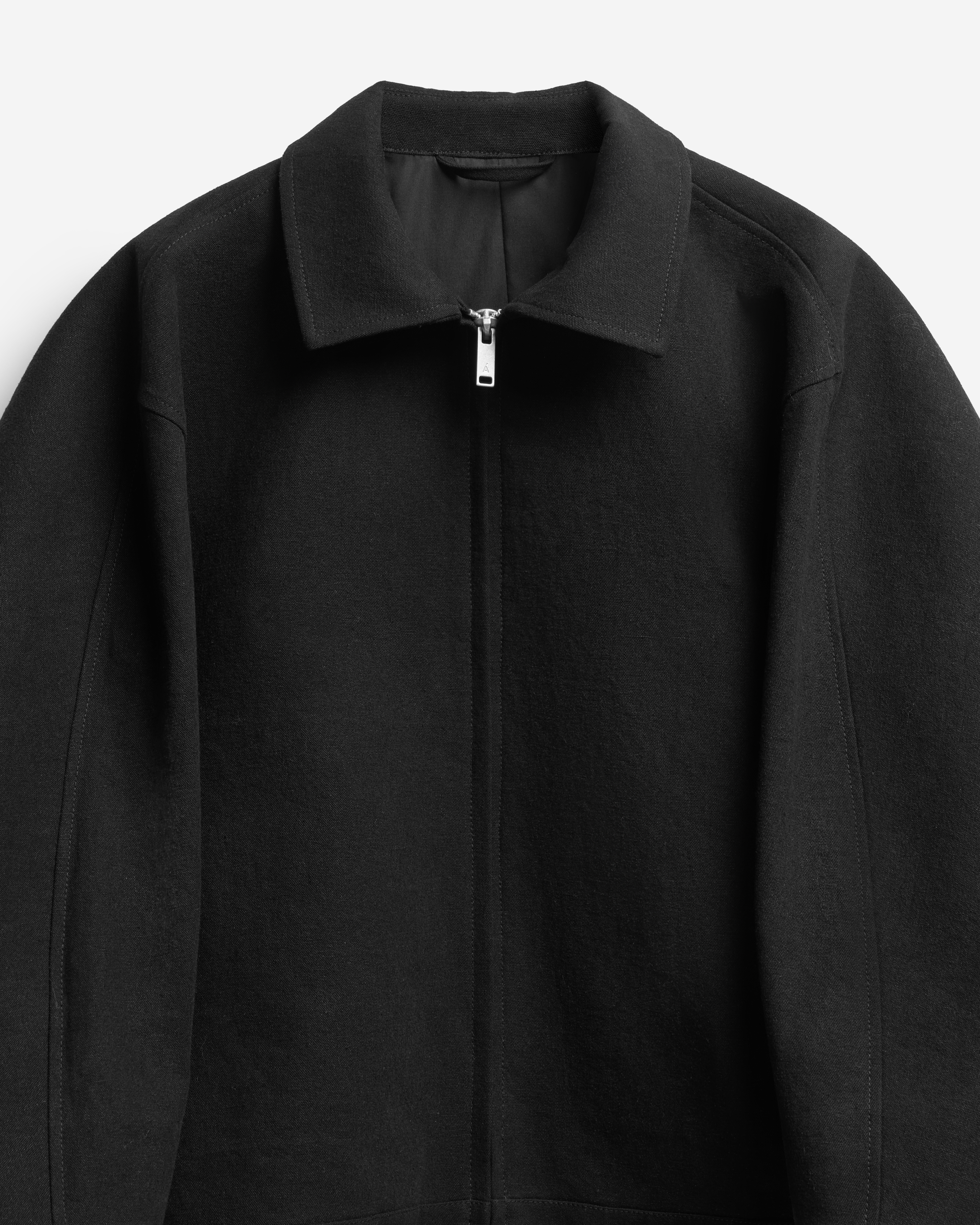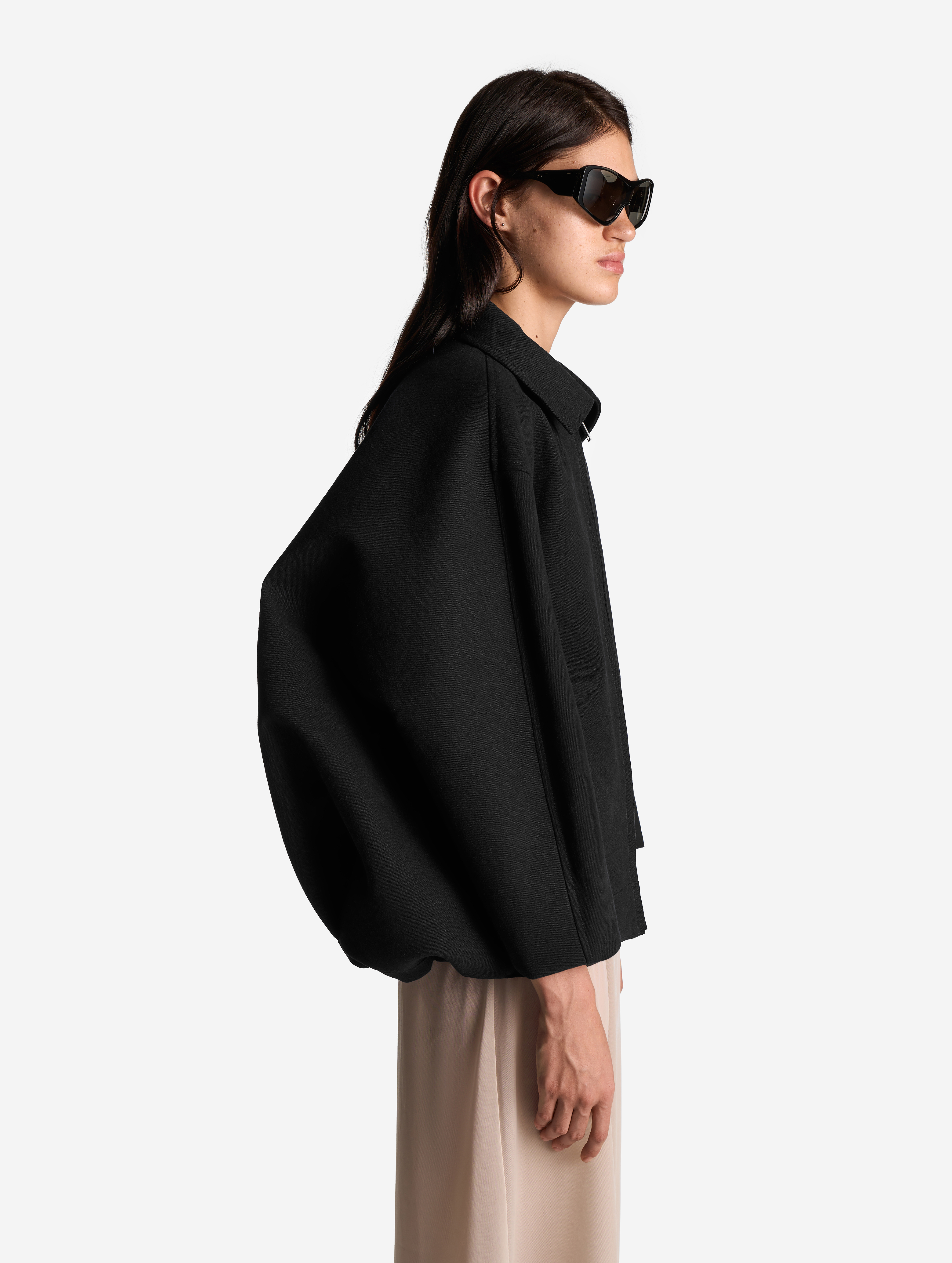 Среди бестселлеров модного Дома встречаются изделия, получившие название за сходство с какой-либо буквой. Силуэт этой куртки в профиль напоминает вид латинской буквы D. По нижнему краю изделия протянута шляпная резинка, которая затягивается изнутри и позволяет регулировать посадку вещи. Куртка выполнена из формоустойчивого плотного льна, у нее расслабленная посадка и оверсайз-силуэт. Для создания покатого спущенного плеча мы применили комбинированный покрой рукава. Особенность его конструкции заключается в том, что спереди рукав втачной, а на спинке — реглан. Сам рукав заужен книзу и по длине достигает запястья. Куртка застегивается на молнию. Есть два боковых кармана и один внутренний.
