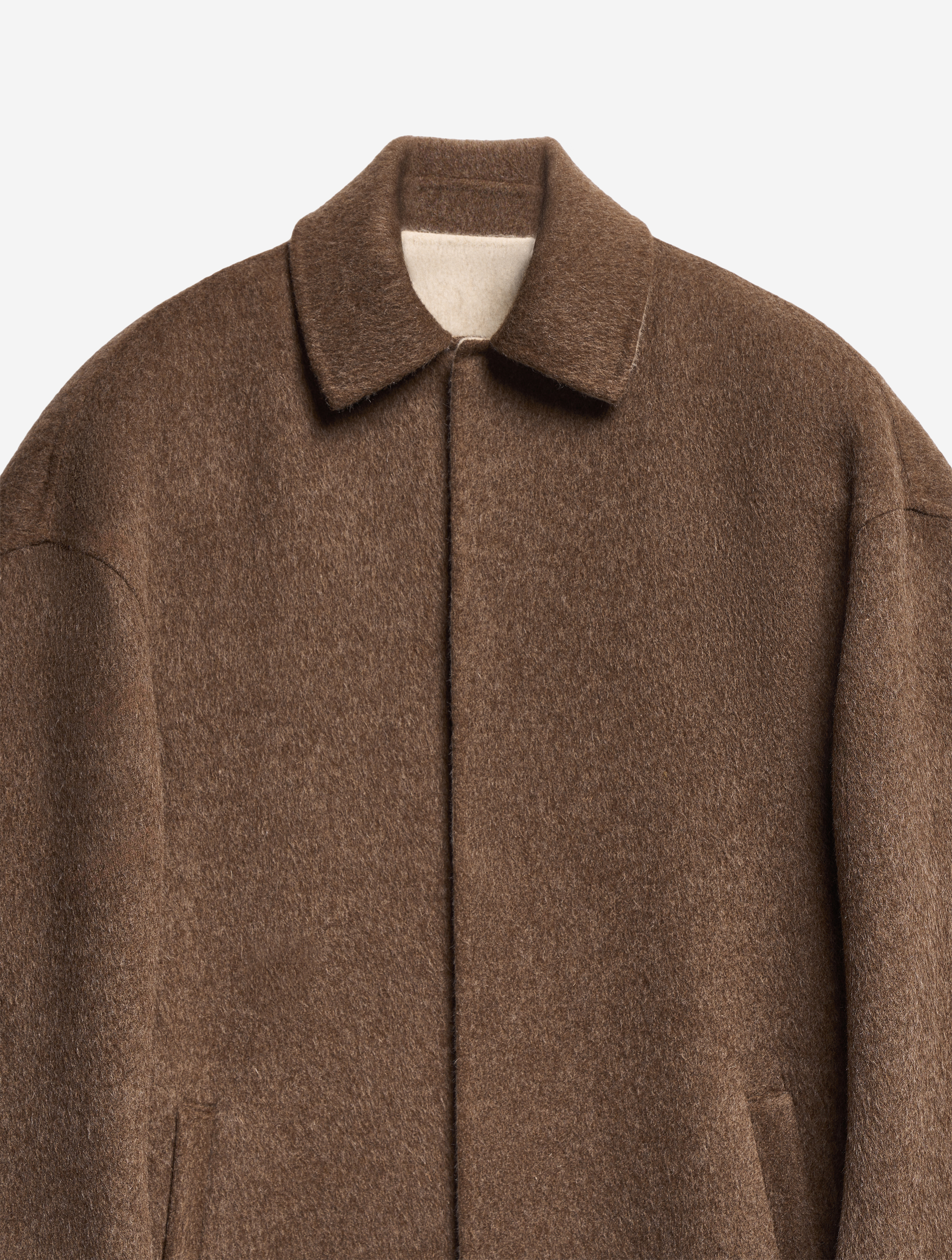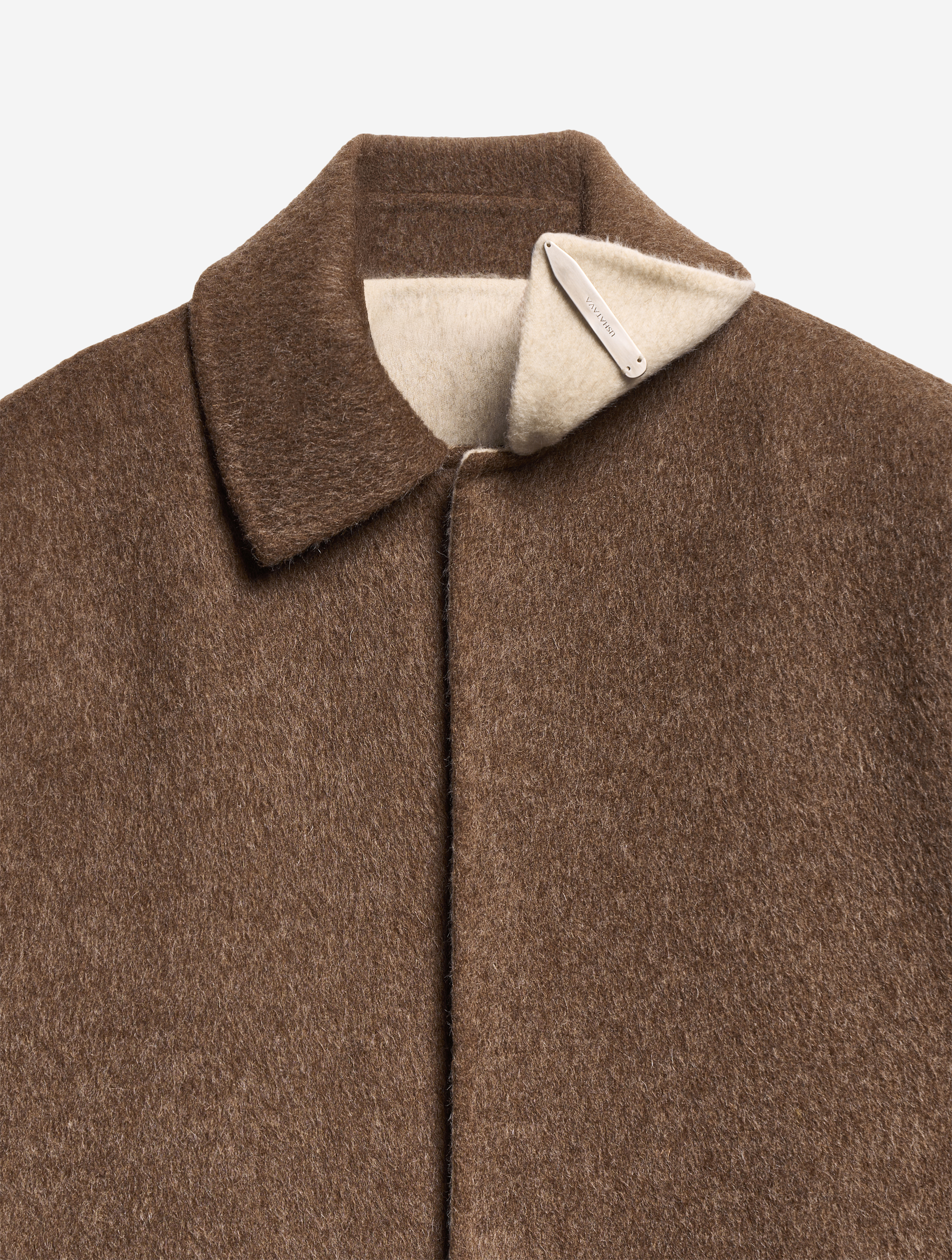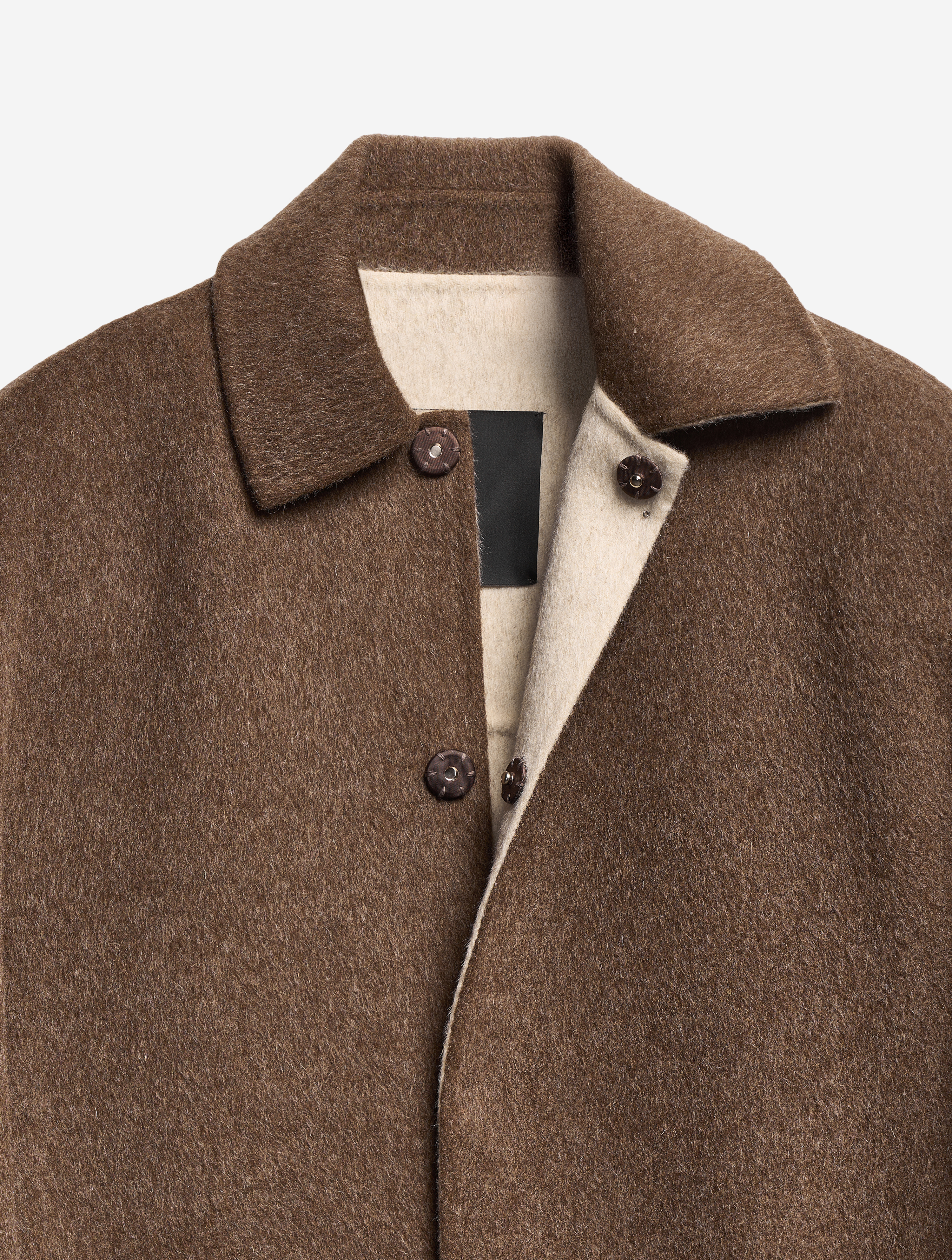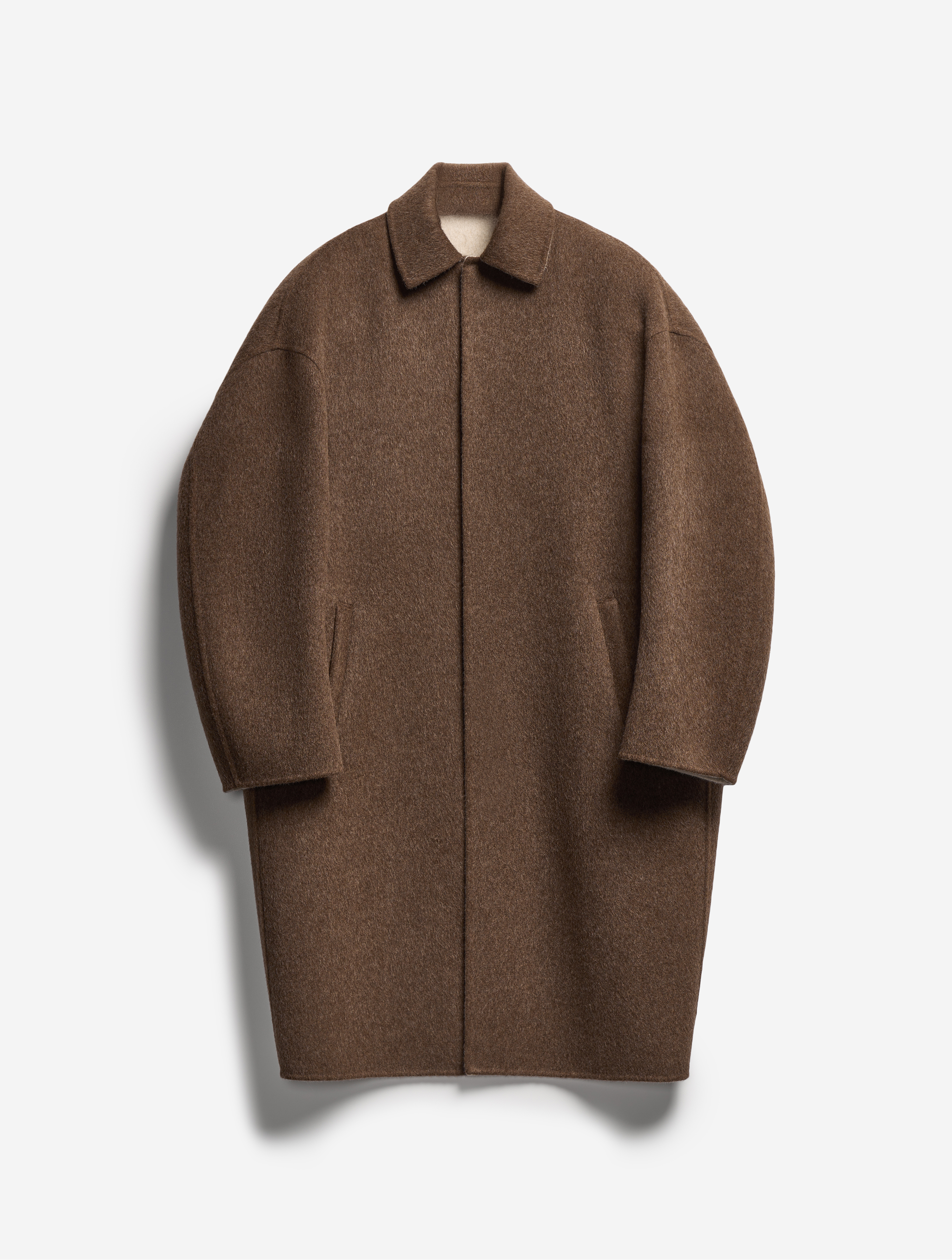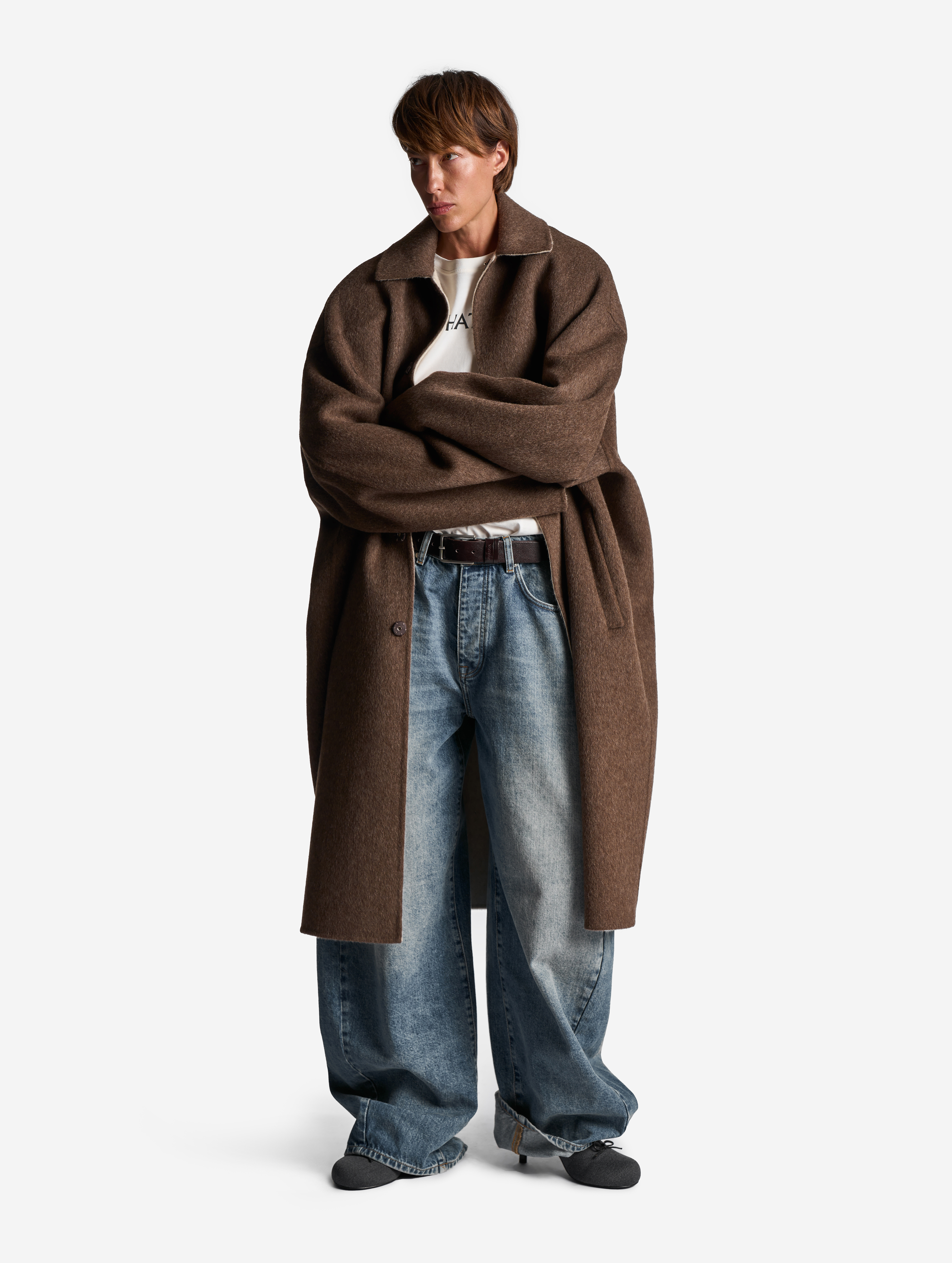 У силуэтов Ushatava есть имена. Так мы объединяем модели по схожим характерным чертам. «О» — иконическая форма, которая впервые появляется в дизайне пальто Garderobe FW25/26. Конструкция изделия напоминает овал: его форма заужена в плечах и голенях, но расширяется в районе бедер. Есть и другие особенности кроя — например, воротник фиксируется в положении стойки при помощи тяжелых пришивных уголков, а к изнанке можно пристегнуть съемные подплечники — чтобы усилить покатую структуру плеч. У пальто есть два кармана. В качестве застежки — четыре кнопки.