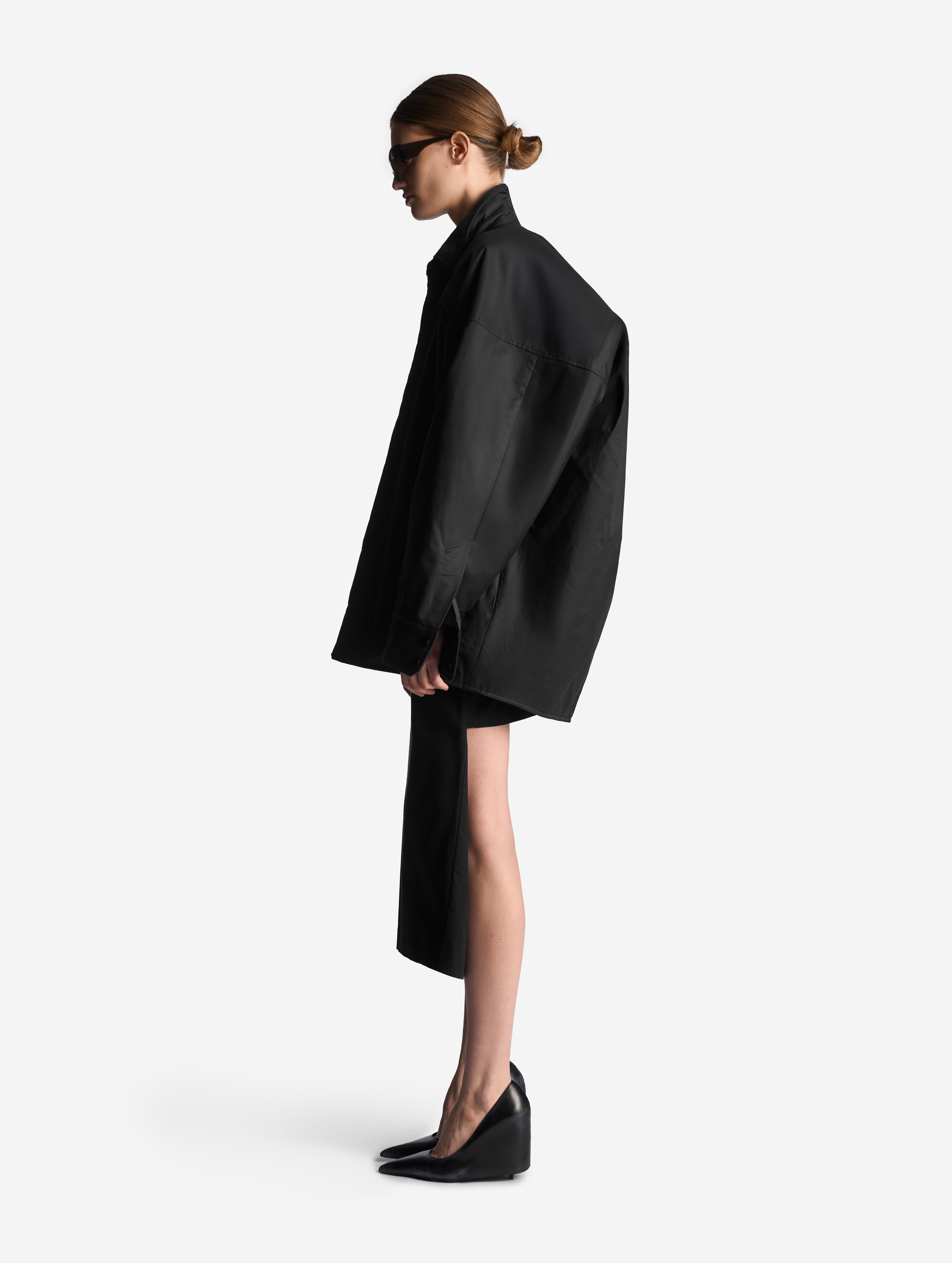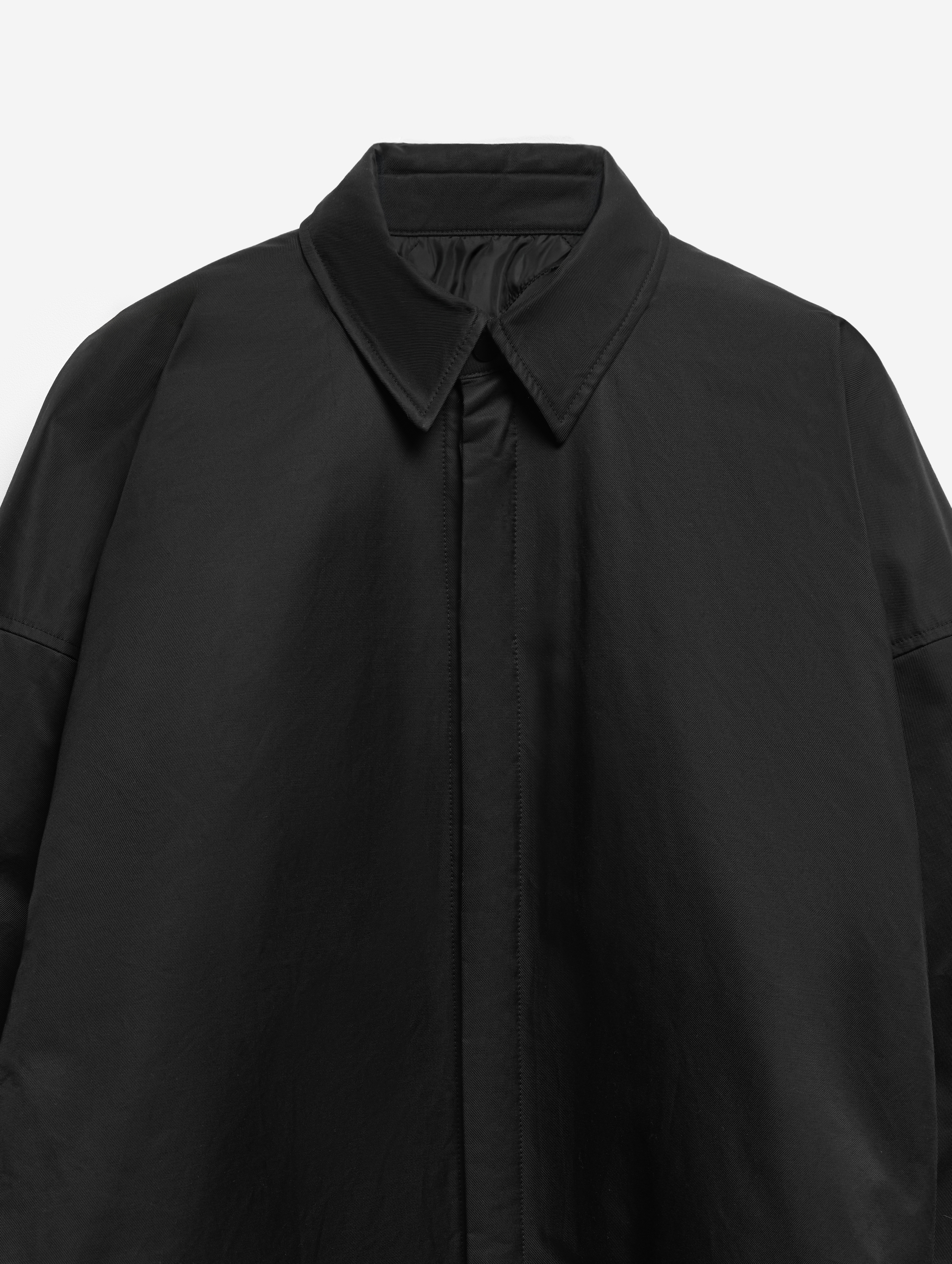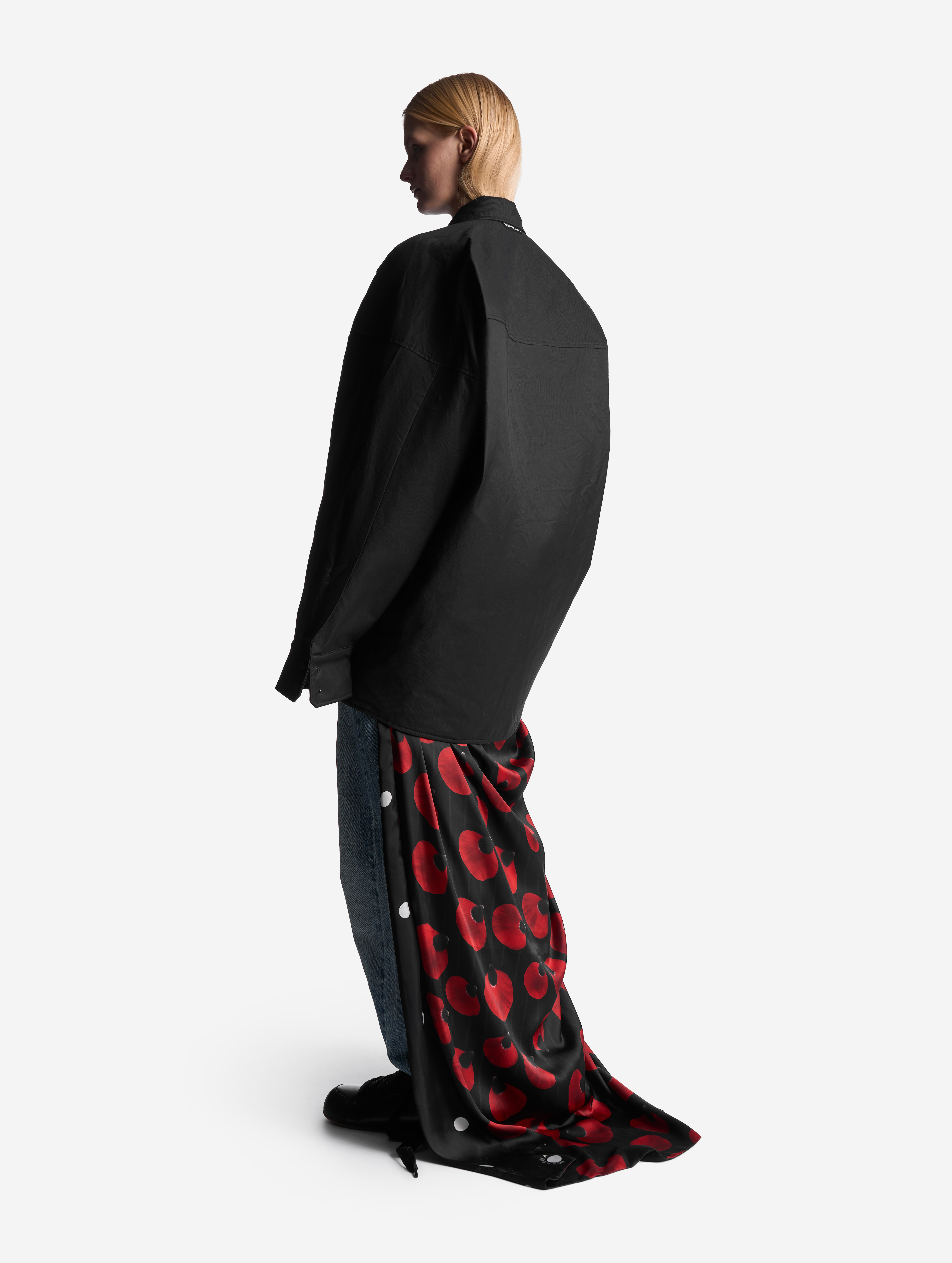 Прототипом этого изделия стала классическая рубашка плоского кроя, конструкция которой представляет собой цельную деталь простой геометрической формы. В новом прочтении оверсайз-силуэт раздулся, словно пузырь, а рукава увеличились в объеме. Изделие выполнено из гладкого хлопкового материала, в составе которого присутствует нейлон. Поверхность ткани обработана водоотталкивающей пропиткой, а в качестве изнанки — подкладка из плащовки с утеплителем. Благодаря свойствам материала модель хорошо защищает от ветра и сохраняет тепло, а еще ее можно носить на две стороны. Рубашка, как и манжеты рукавов, застегивается на кнопки. Есть два прорезных кармана. Воротник украшен флажком с названием модного Дома.