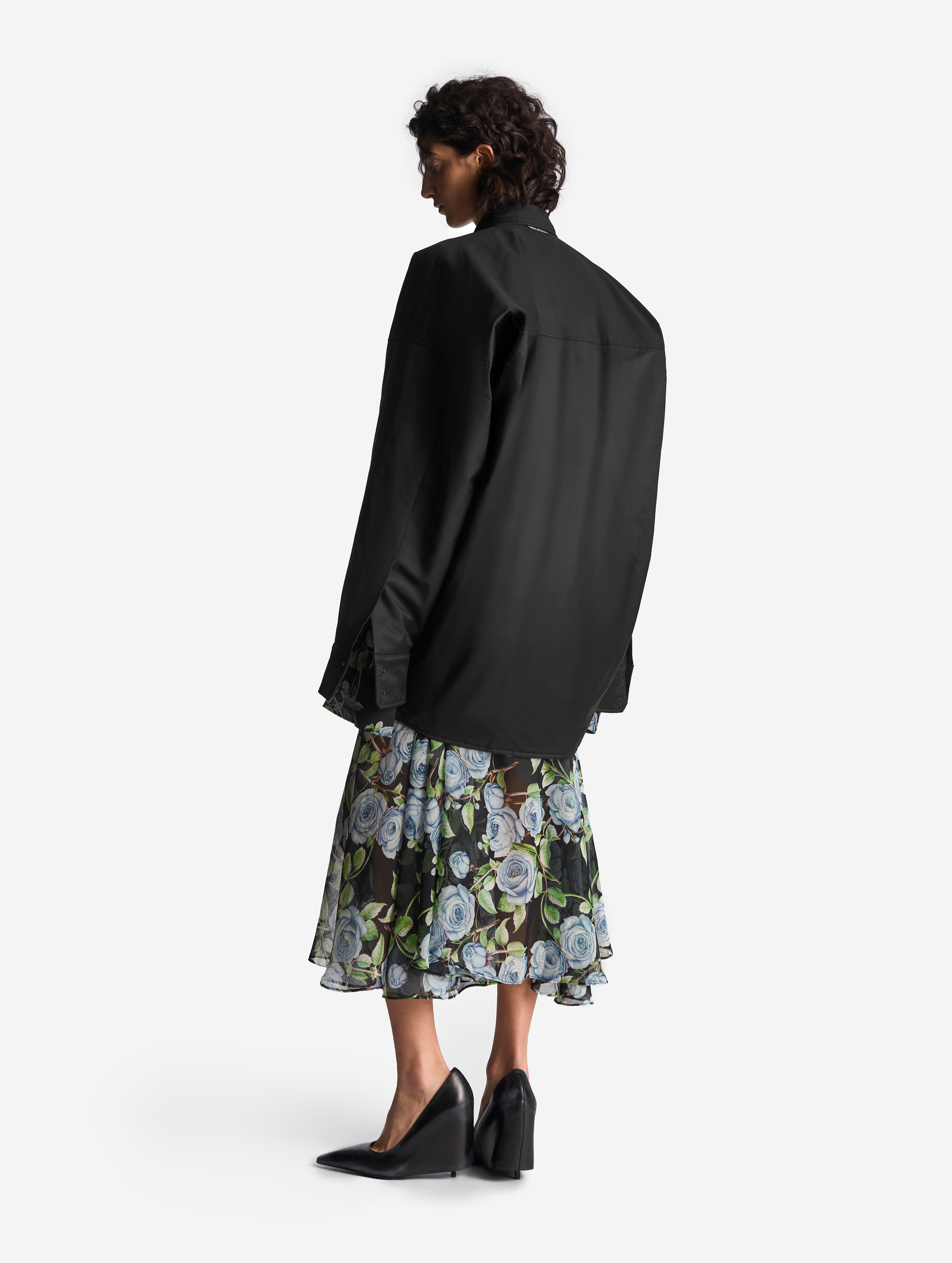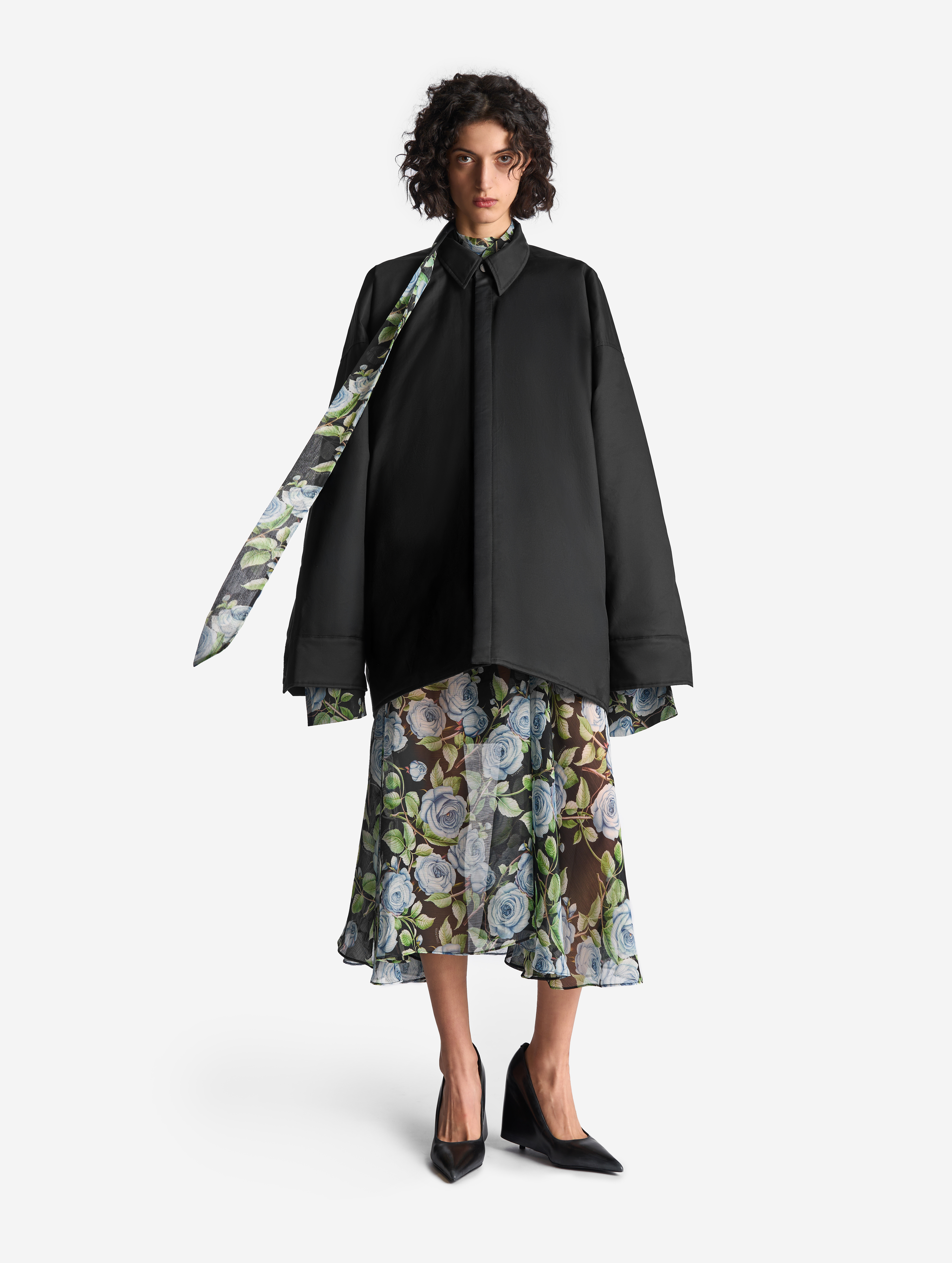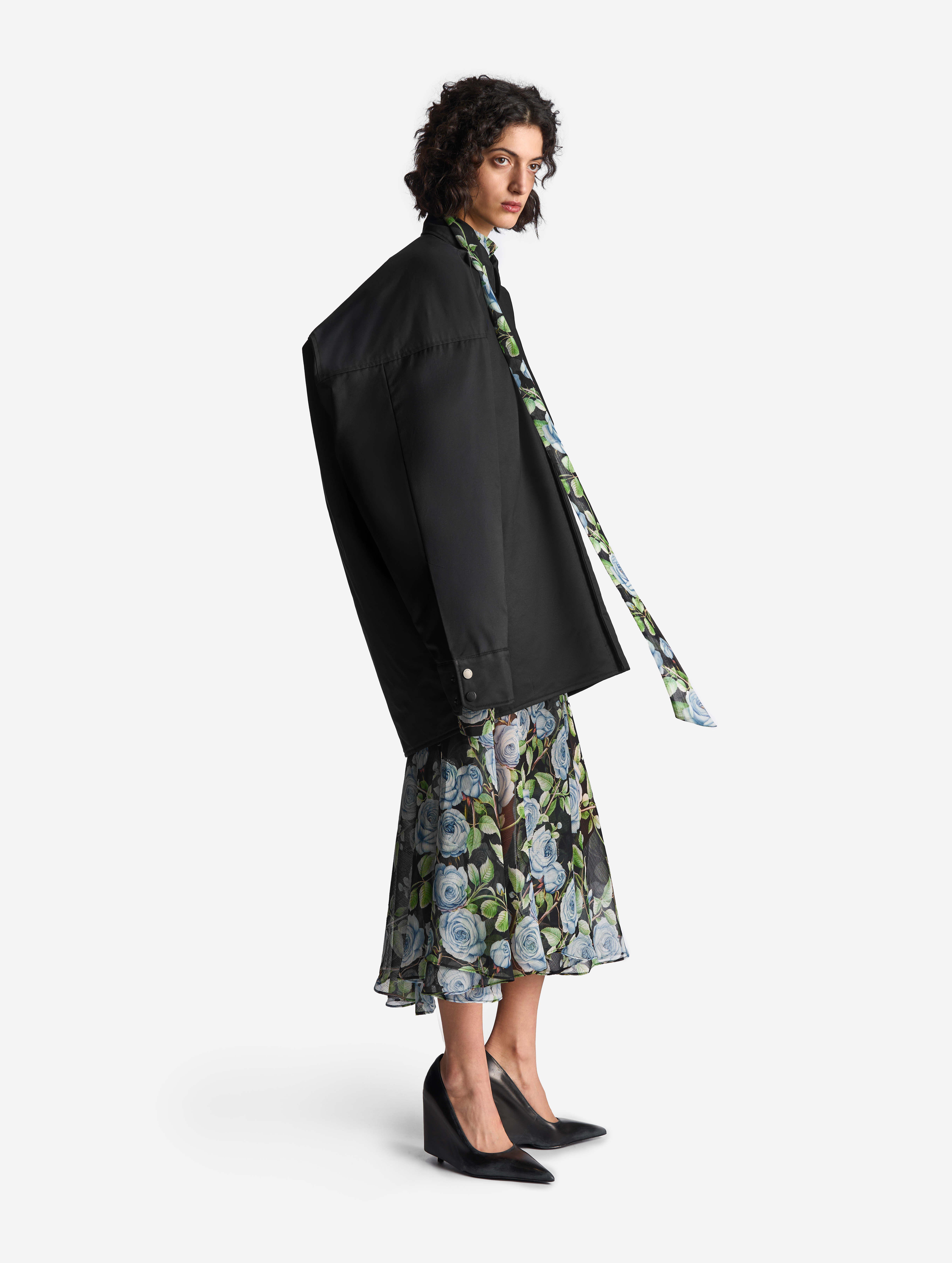Прототипом этого изделия стала классическая рубашка плоского кроя, конструкция которой представляет собой цельную деталь простой геометрической формы. В новом прочтении оверсайз-силуэт раздулся, словно пузырь, а рукава увеличились в объеме. Изделие выполнено из гладкого хлопкового материала, в составе которого присутствует нейлон. Поверхность ткани обработана водоотталкивающей пропиткой, а в качестве изнанки — подкладка из плащовки с утеплителем. Благодаря свойствам материала модель хорошо защищает от ветра и сохраняет тепло, а еще ее можно носить на две стороны. Рубашка, как и манжеты рукавов, застегивается на кнопки. Есть два прорезных кармана. Воротник украшен флажком с названием модного Дома.