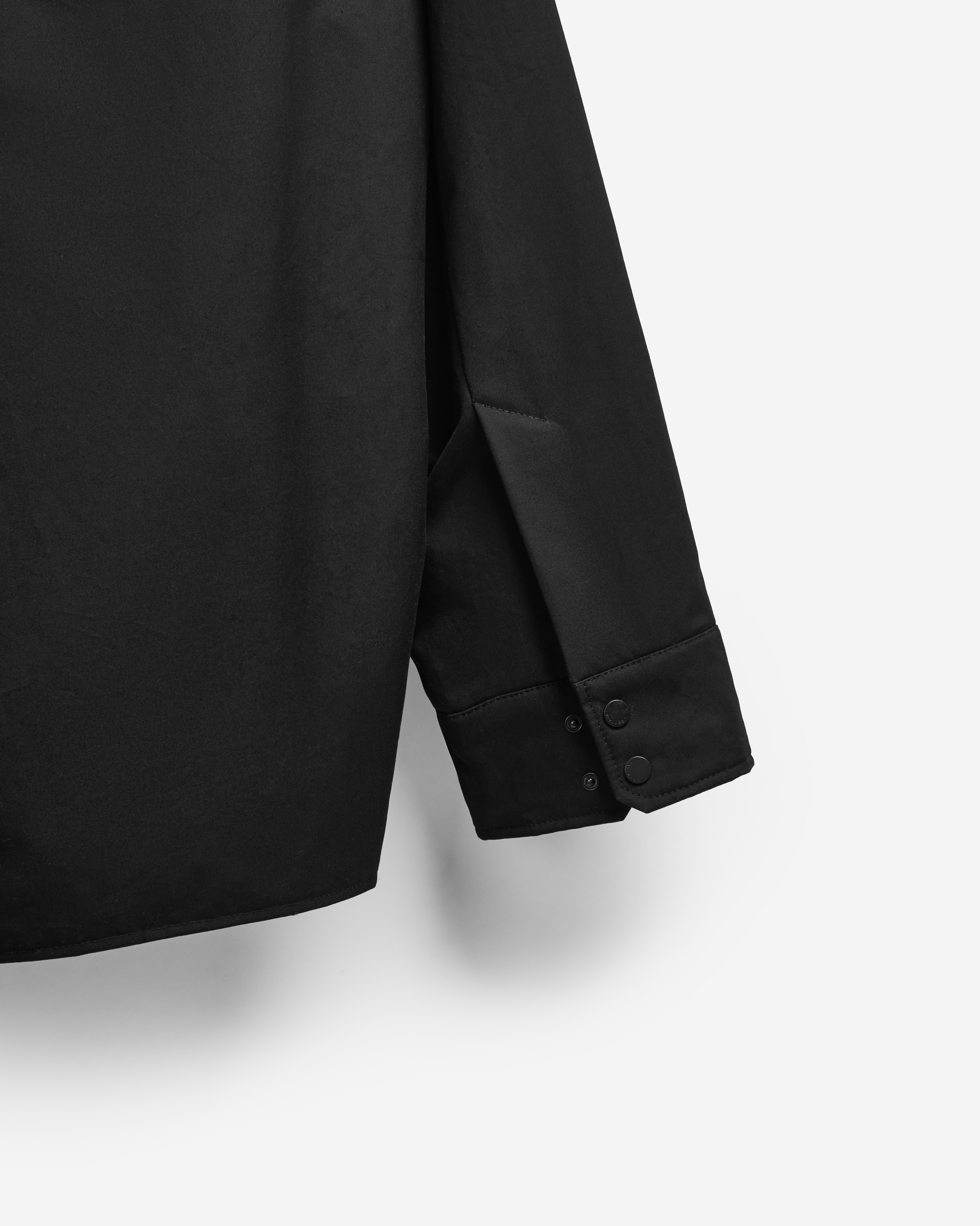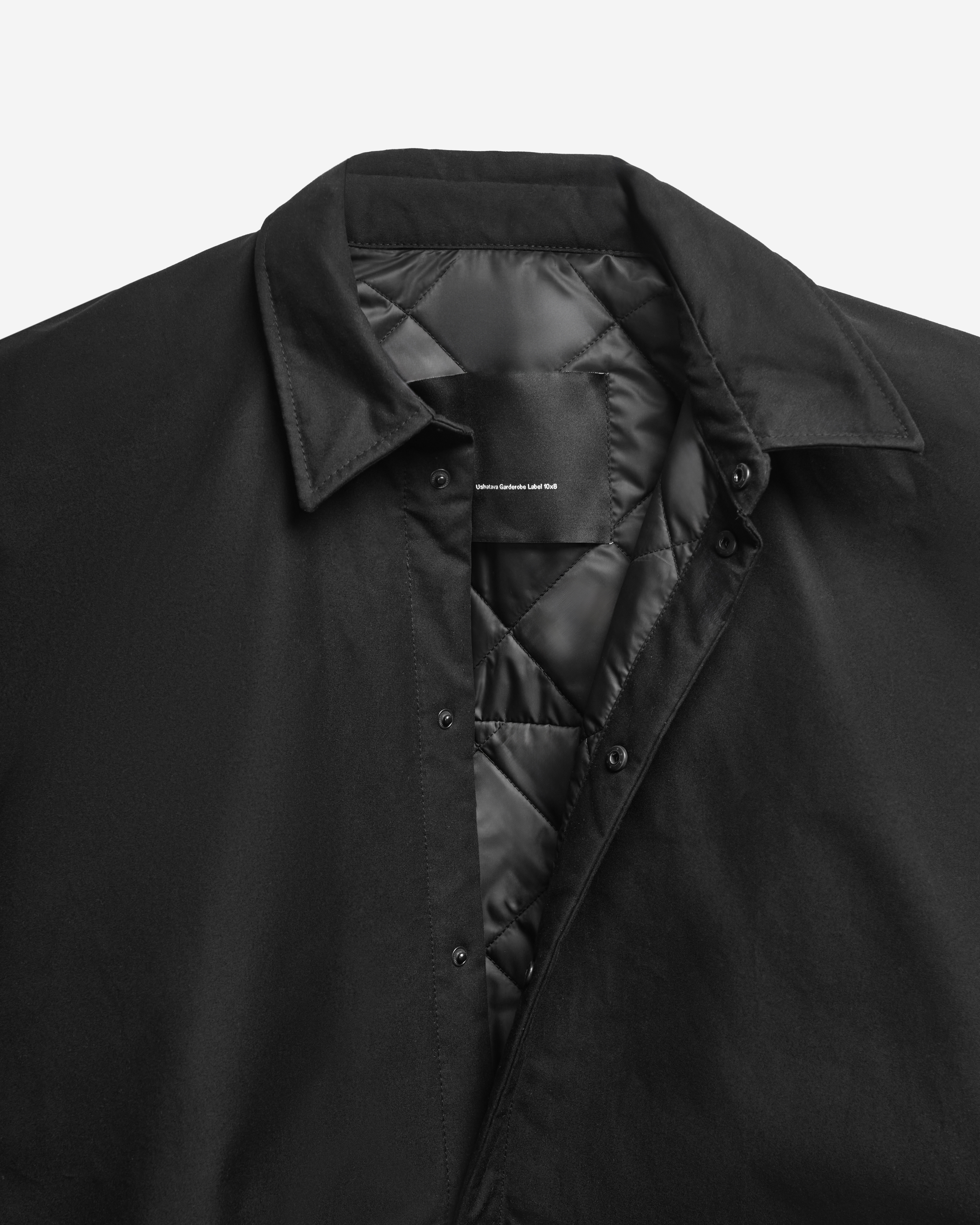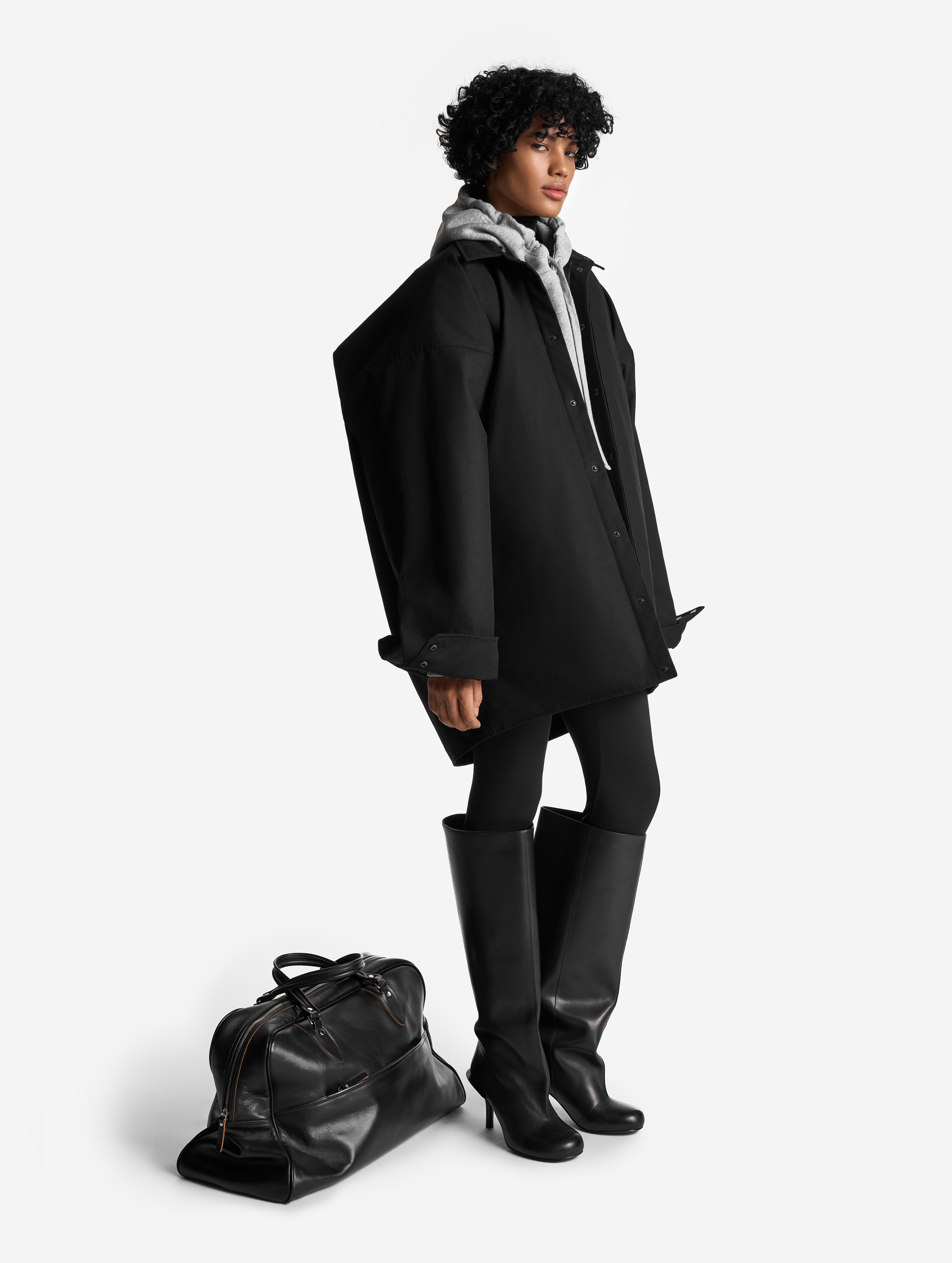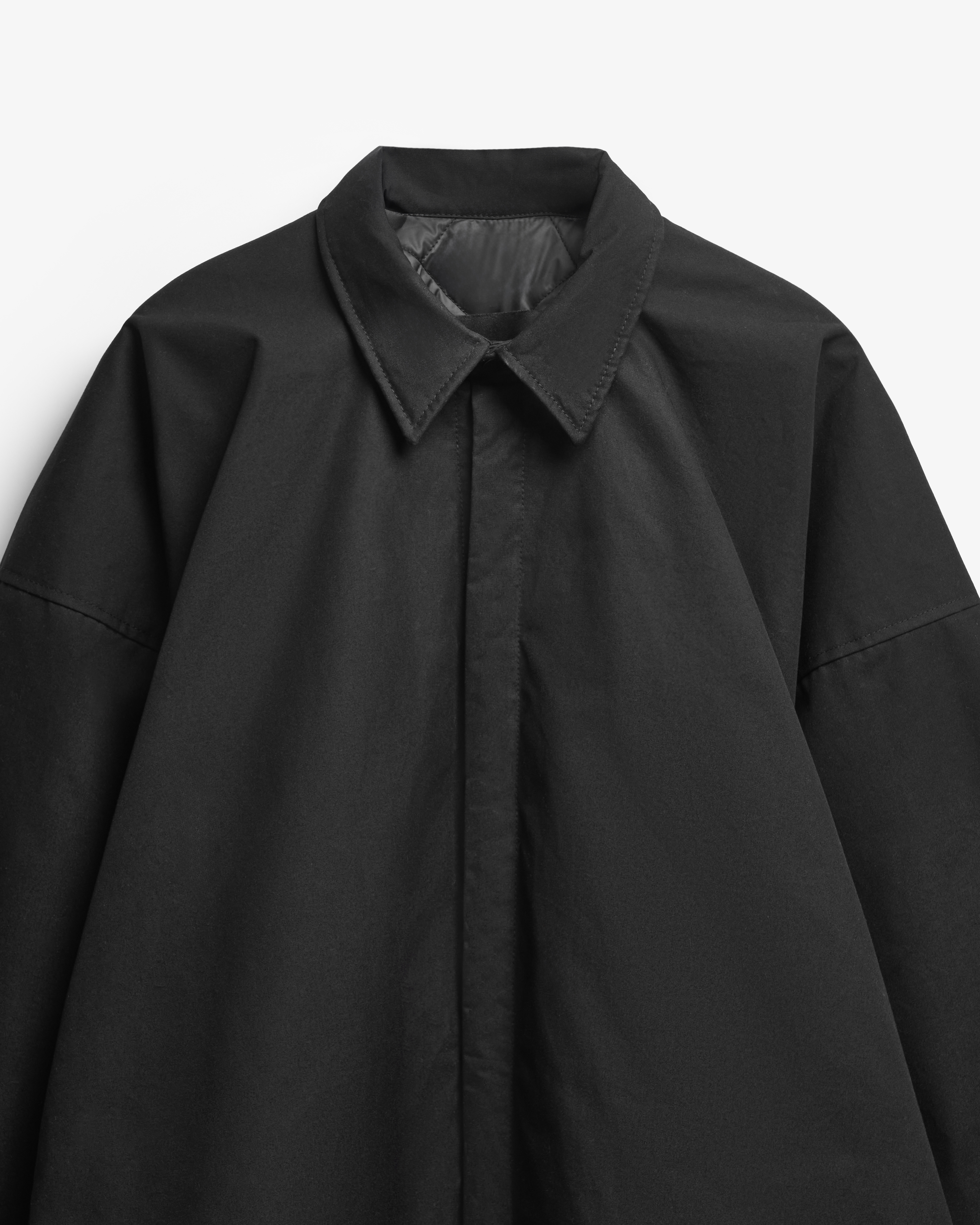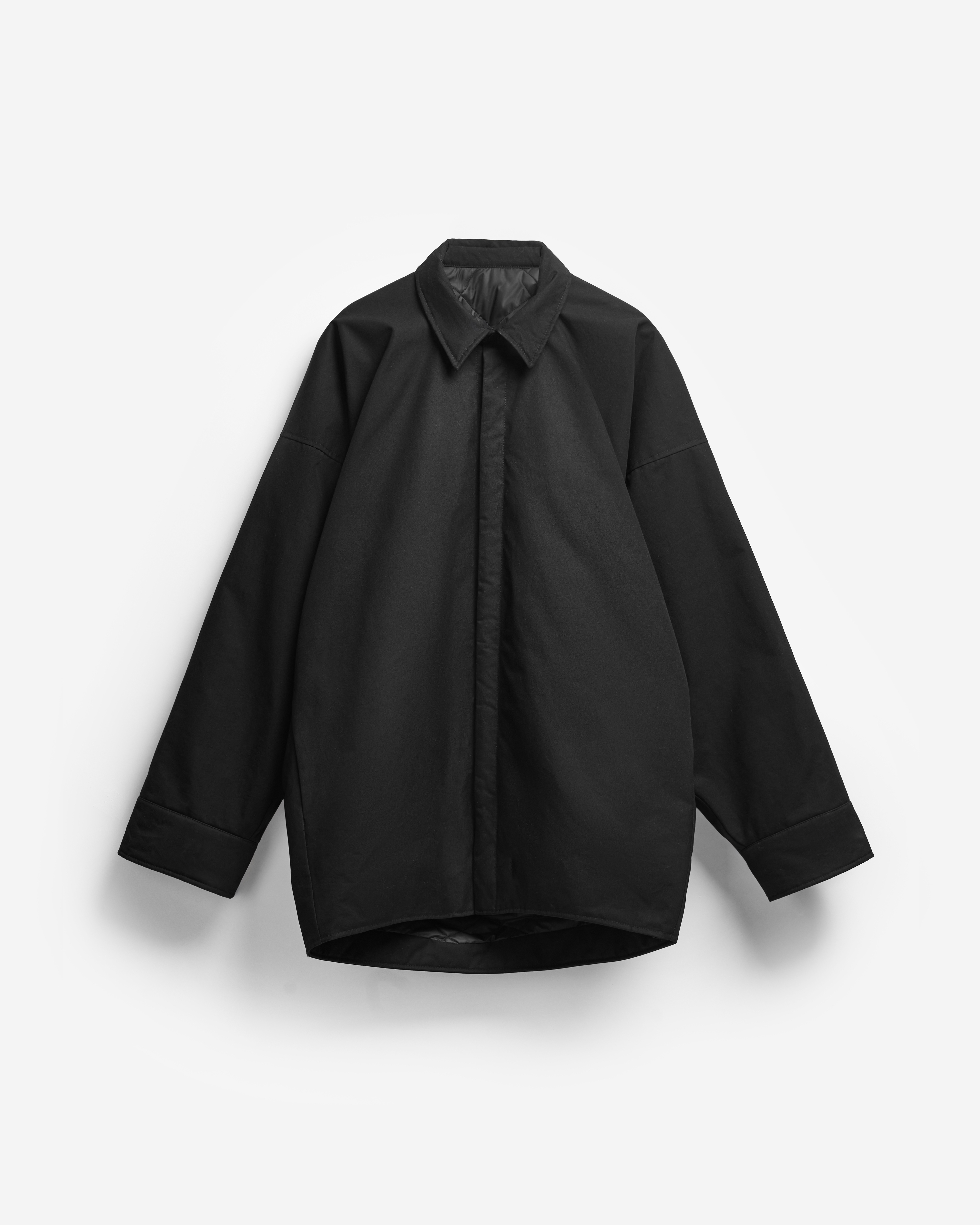 Прототипом этого изделия стала классическая рубашка плоского кроя, конструкция которой представляет собой цельную деталь простой геометрической формы. В новом прочтении оверсайз-силуэт раздулся, словно пузырь, а рукава увеличились в объеме. Изделие выполнено из плотного хлопка с водоотталкивающим покрытием, изнанка которого обработана подкладкой из плащовки с утеплителем. Благодаря свойствам материала модель хорошо защищает от ветра и сохраняет тепло, а еще ее можно носить на две стороны. Рубашка, как и манжеты рукавов, застегивается на кнопки. Есть два прорезных кармана. Воротник украшен флажком с названием модного Дома.