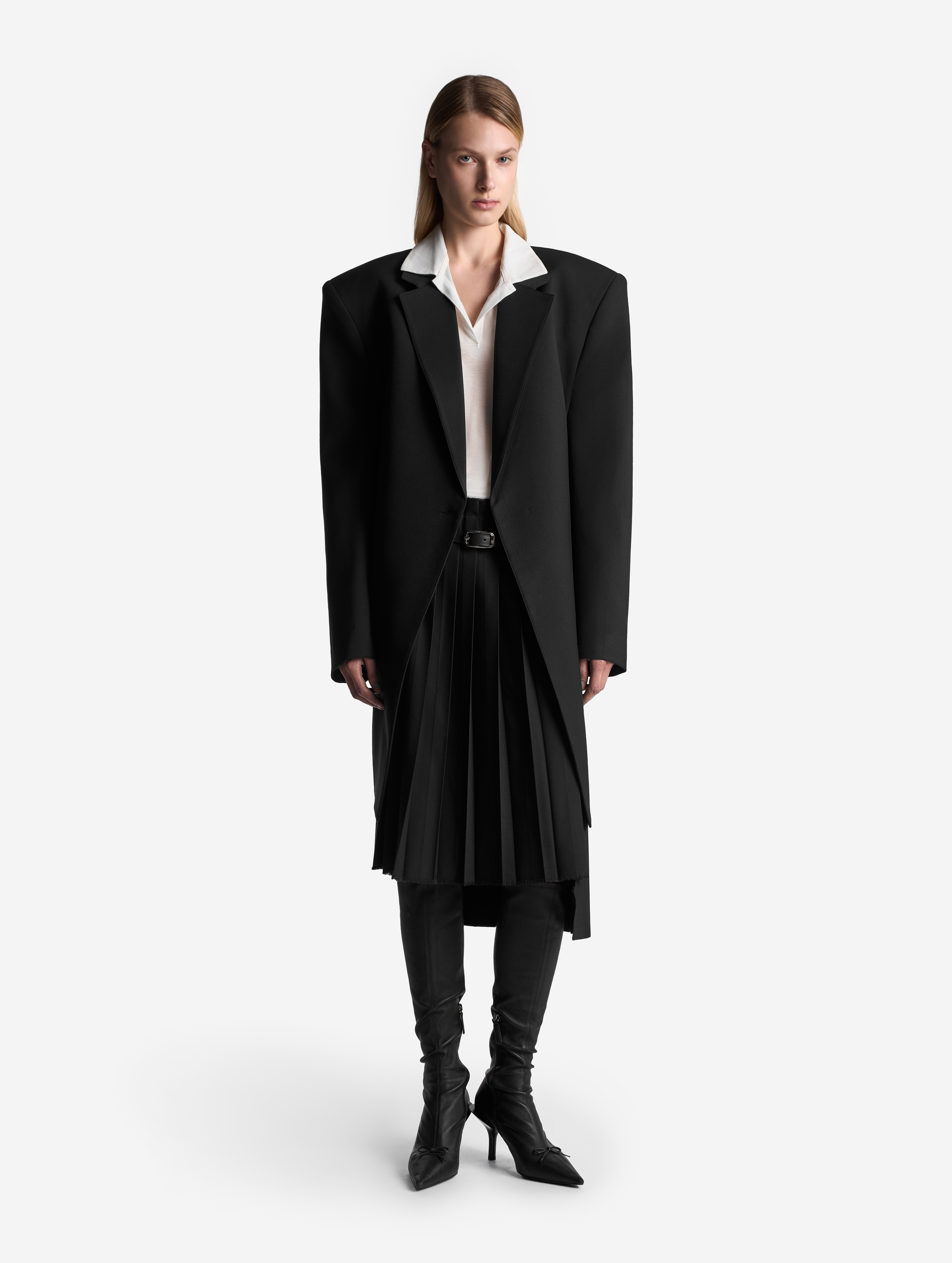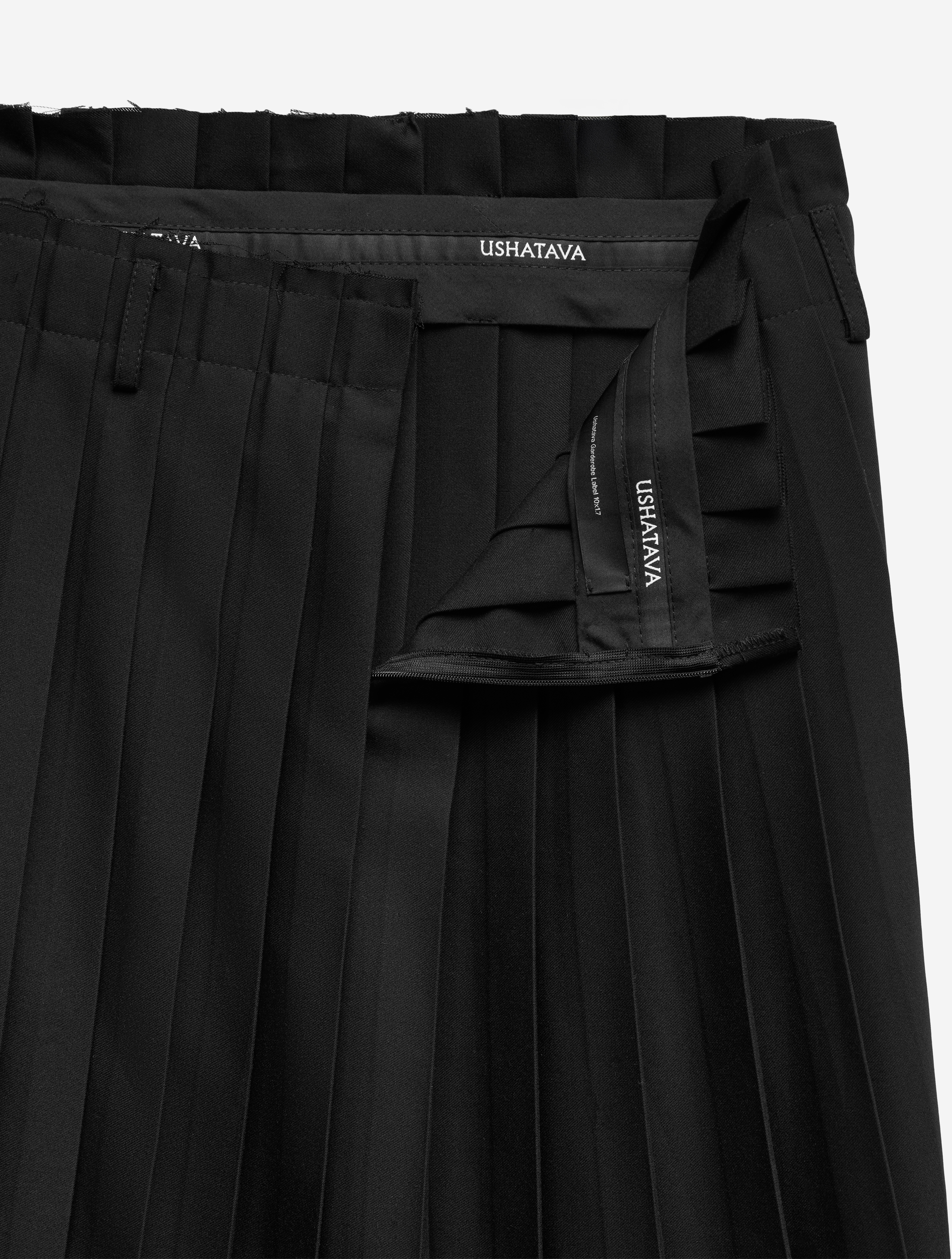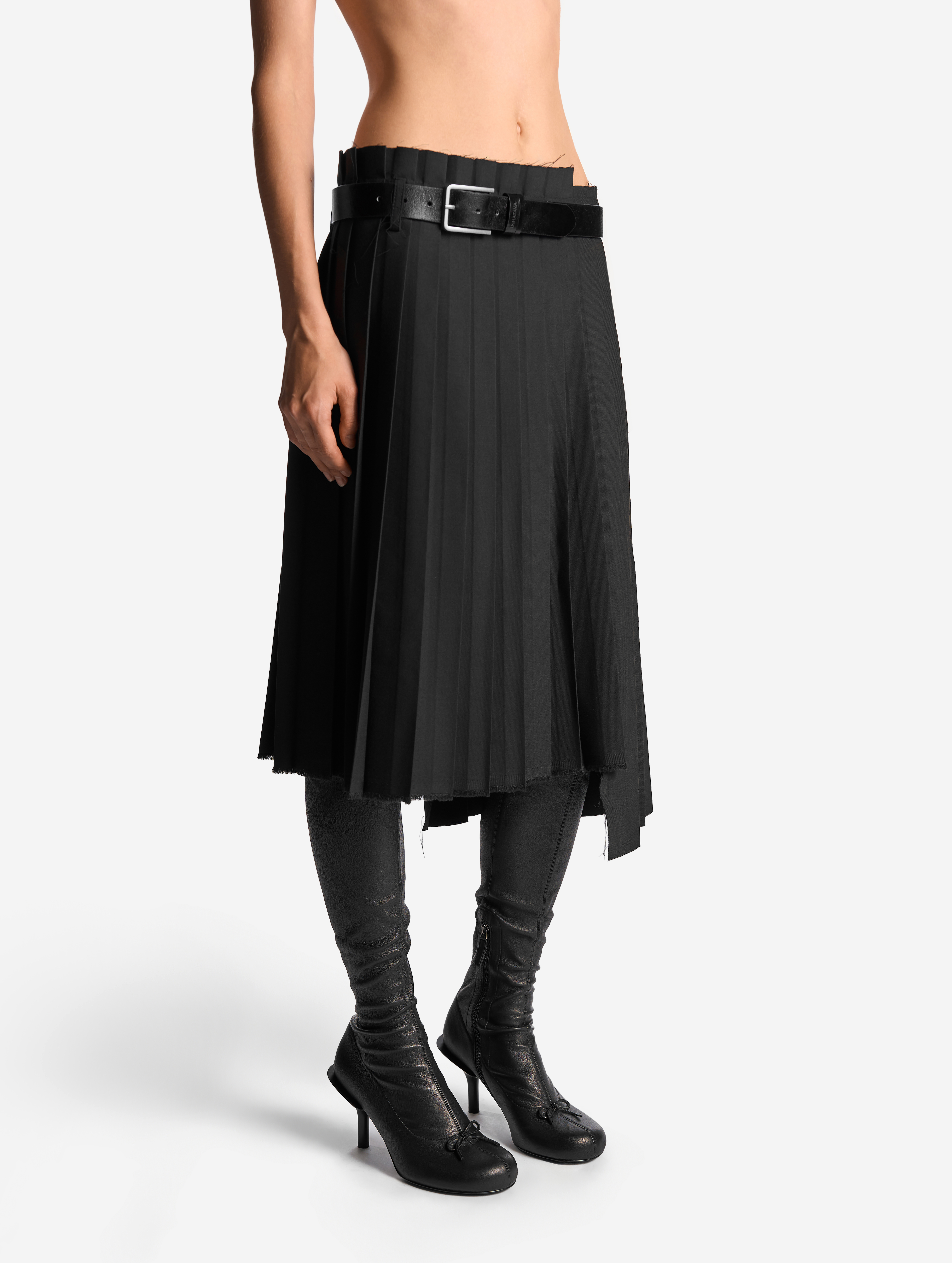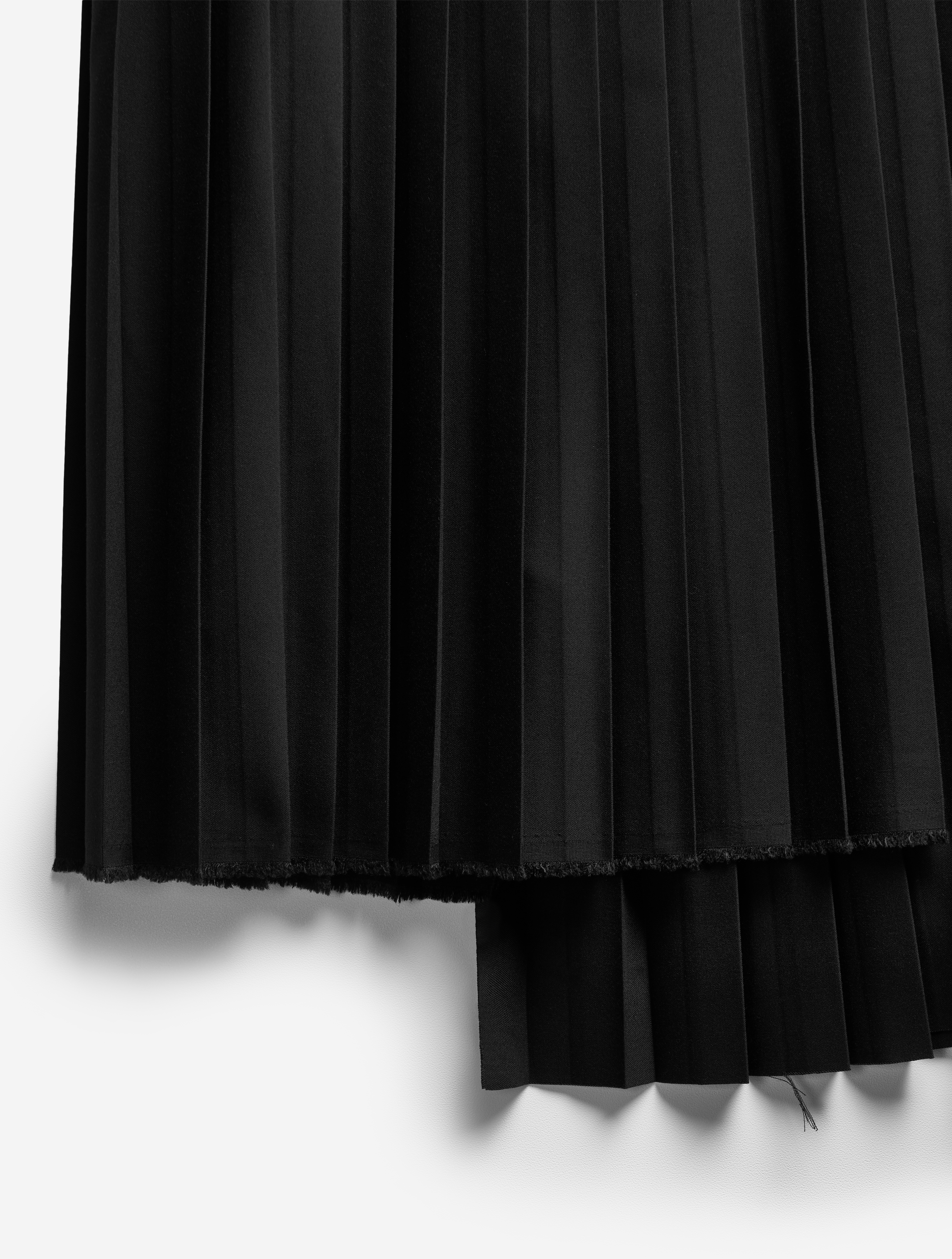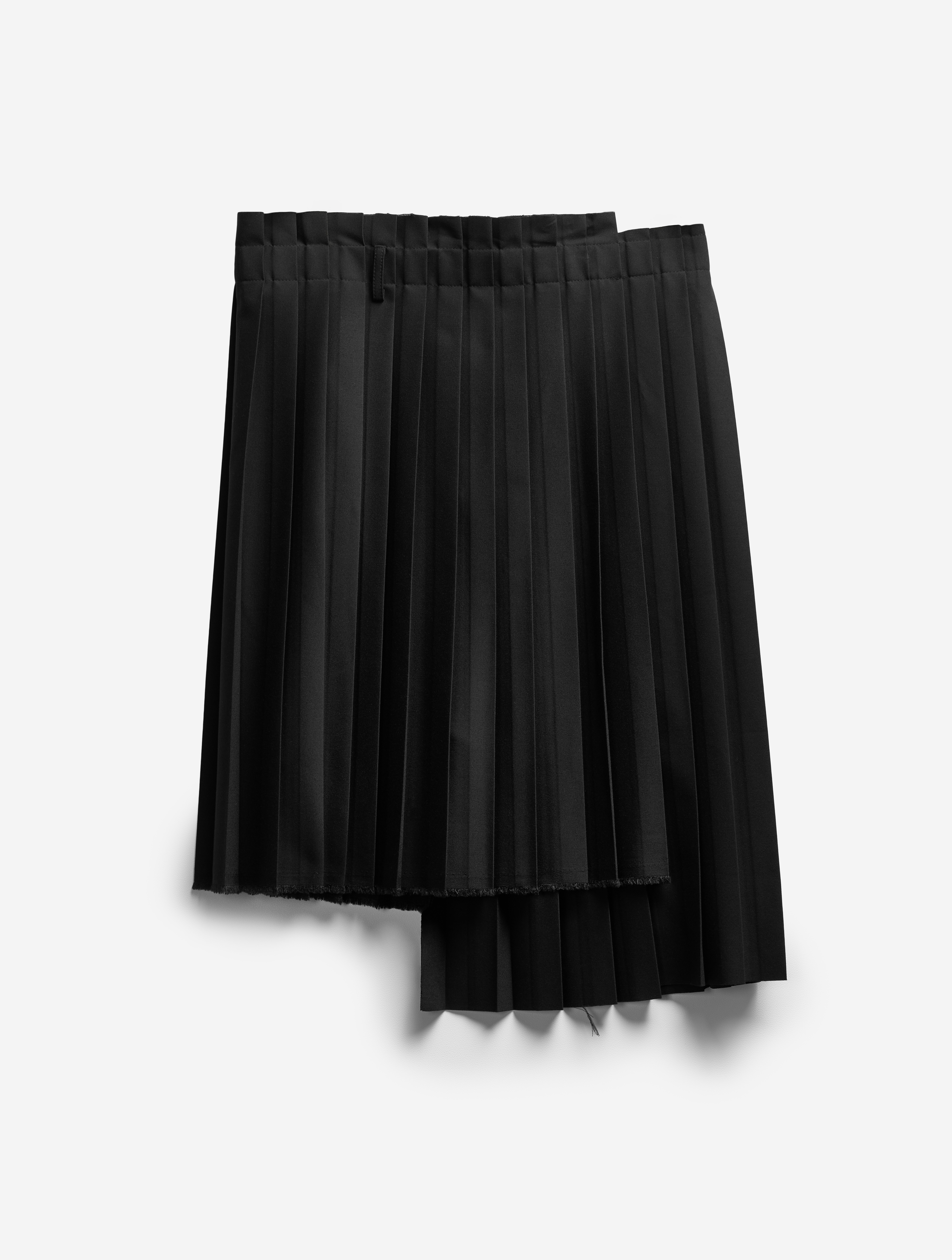Мы стремились создать плиссированную юбку, избегая слишком строгого А-силуэта в стиле преппи. Так у юбки появилась асимметрия — элемент деконструкции, который ломает привычный контур и создает архитектурный. Посадка на бедрах формирует прямой силуэт, который раскрывается при движении. Необработанная кромка, идущая по низу подола, дополнительно усиливает деконструкцию кроя. Пояс обработан корсажной лентой с логотипом, есть шлевки для ремня. Юбка застегивается на молнию и крючок.