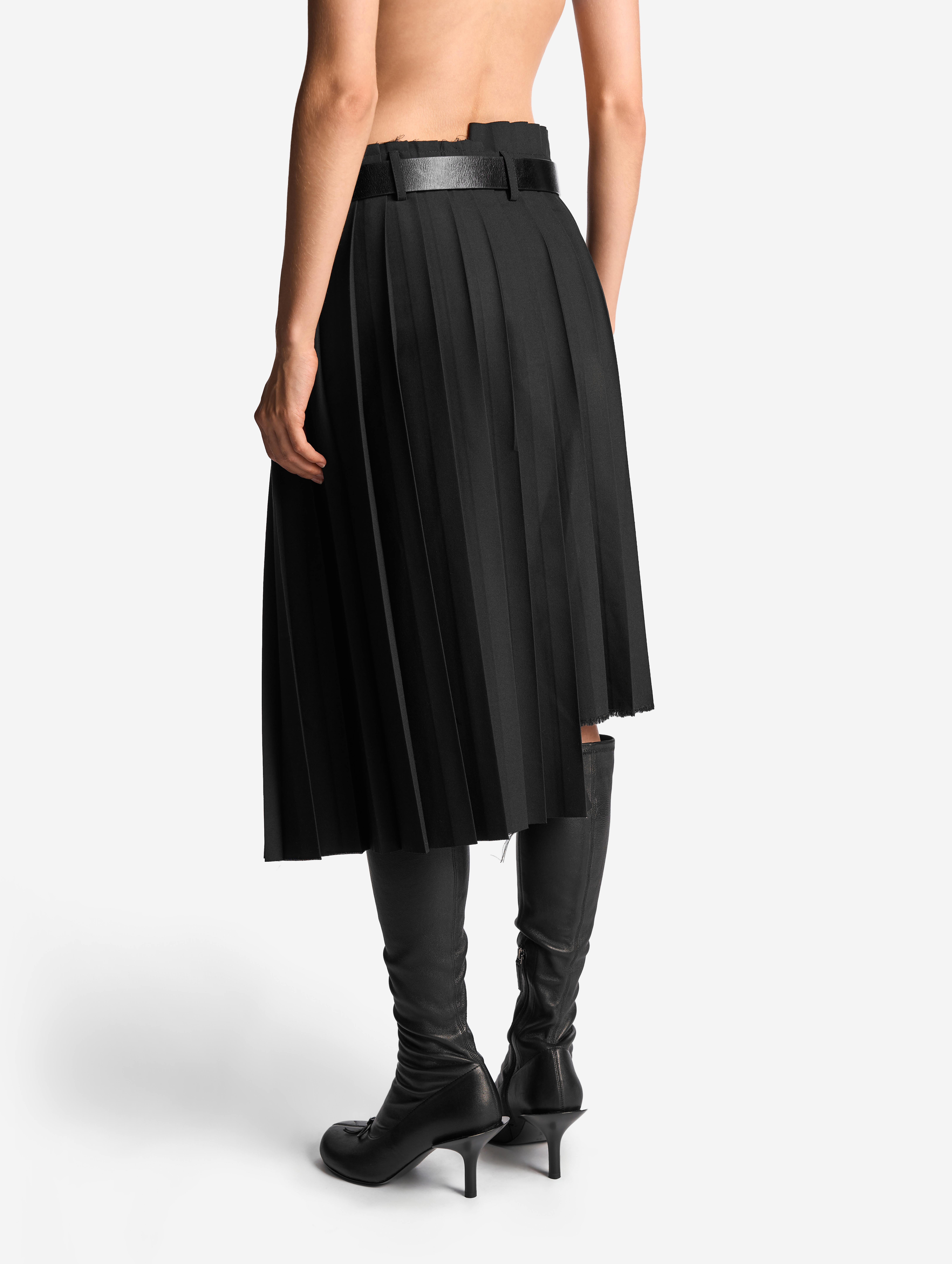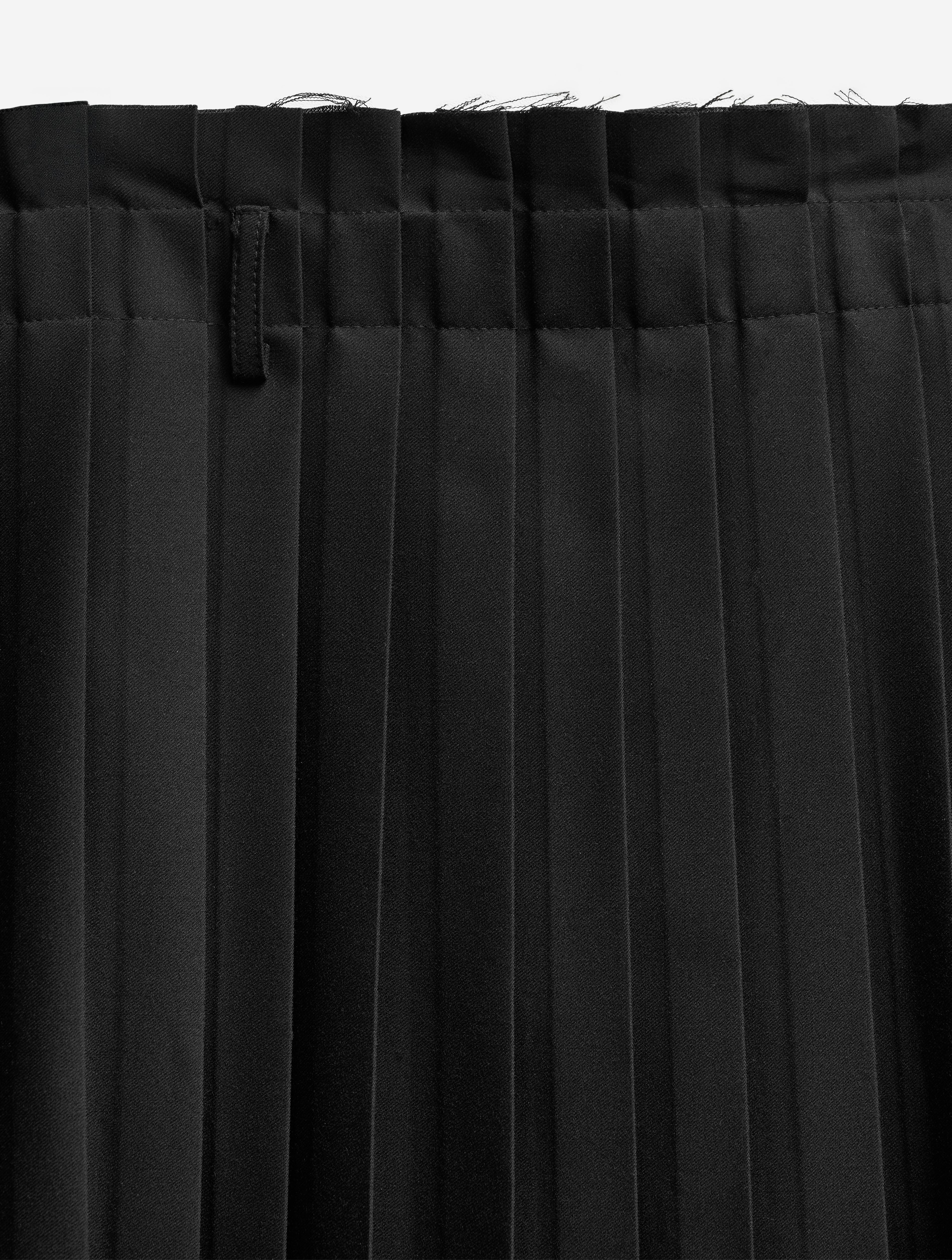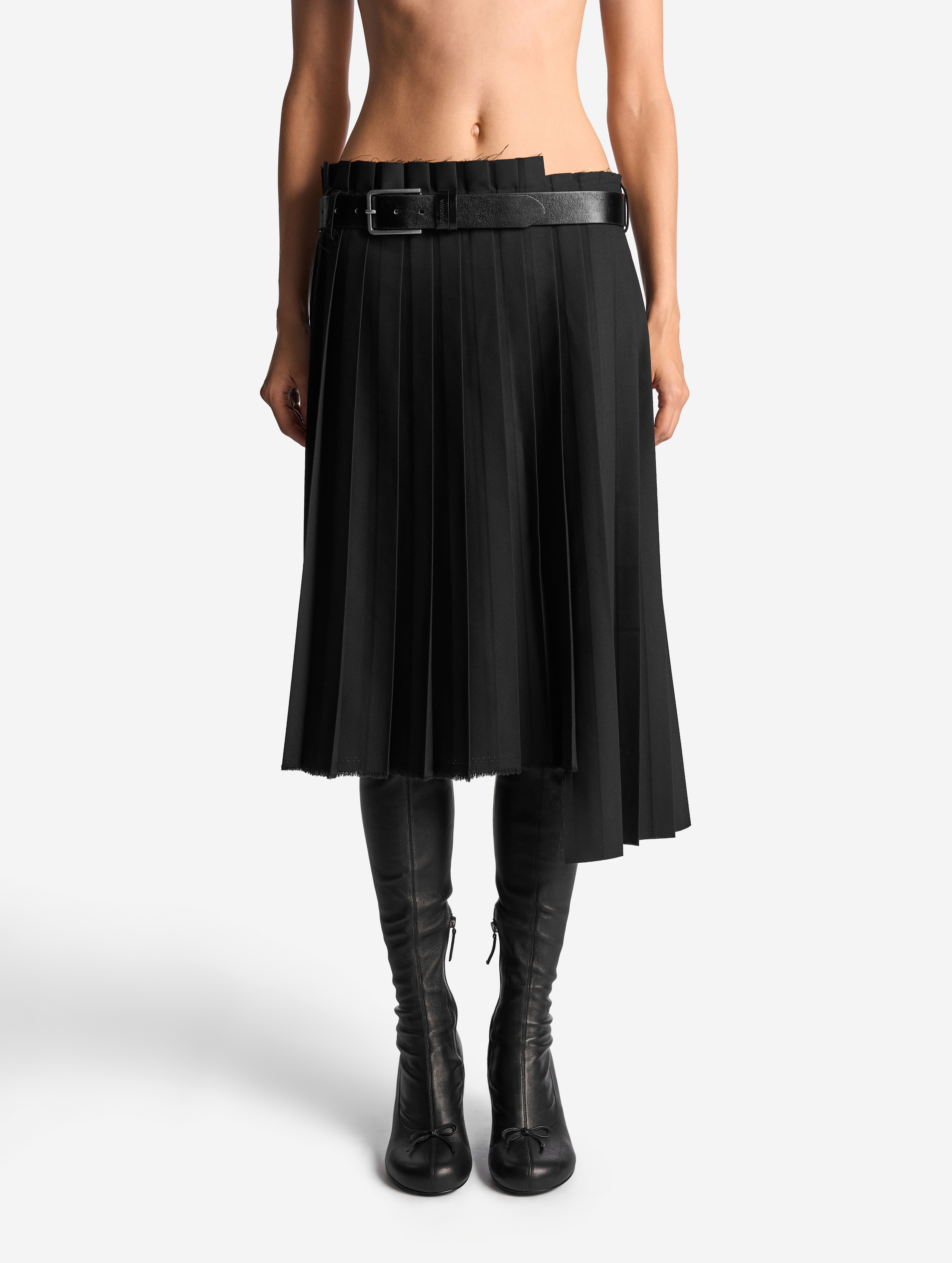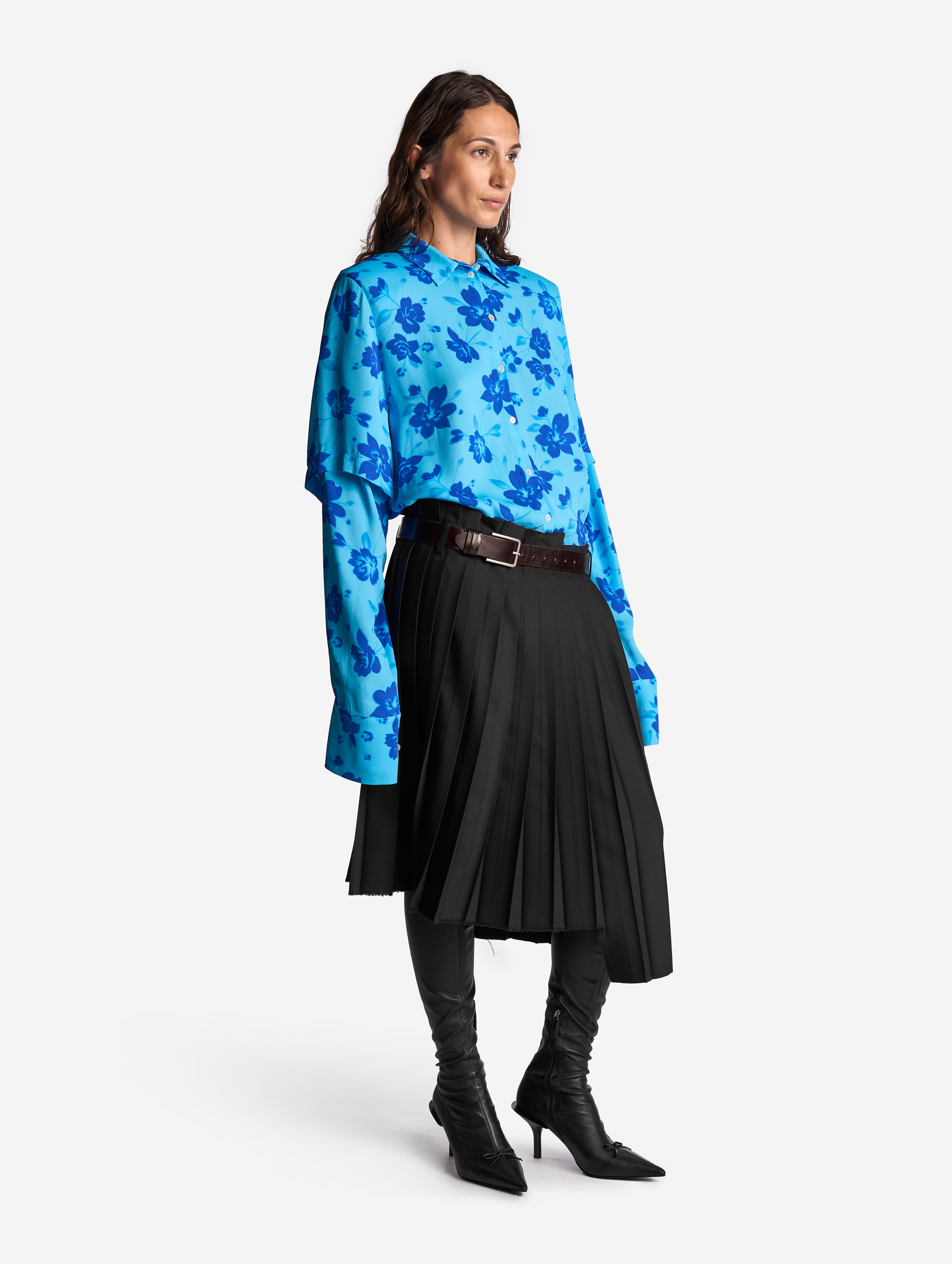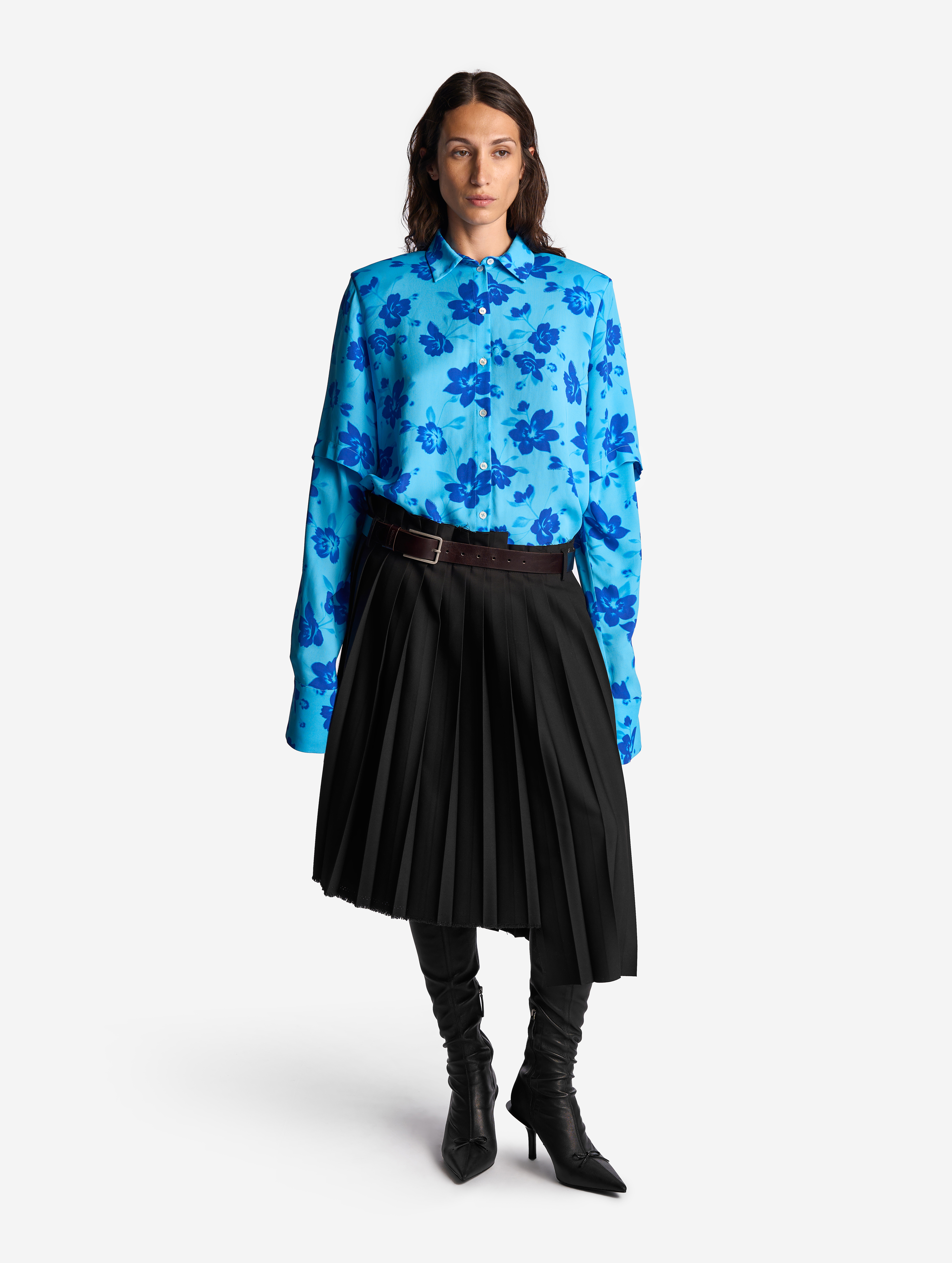 Мы стремились создать плиссированную юбку, избегая слишком строгого А-силуэта в стиле преппи. Так у юбки появилась асимметрия — элемент деконструкции, который ломает привычный контур и создает архитектурный. Посадка на бедрах формирует прямой силуэт, который раскрывается при движении. Необработанная кромка, идущая по низу подола, дополнительно усиливает деконструкцию кроя. Пояс обработан корсажной лентой с логотипом, есть шлевки для ремня. Юбка застегивается на молнию и крючок.