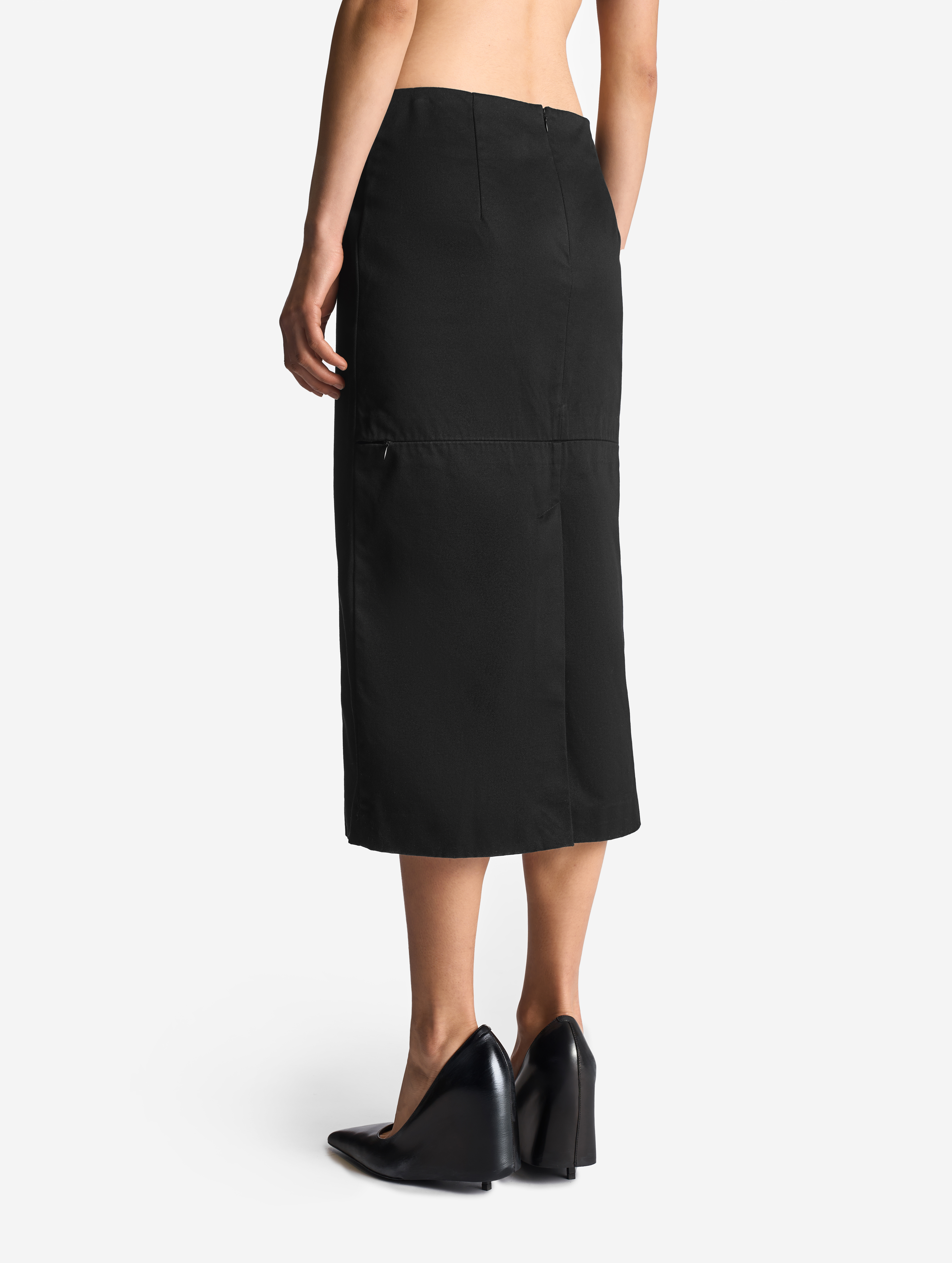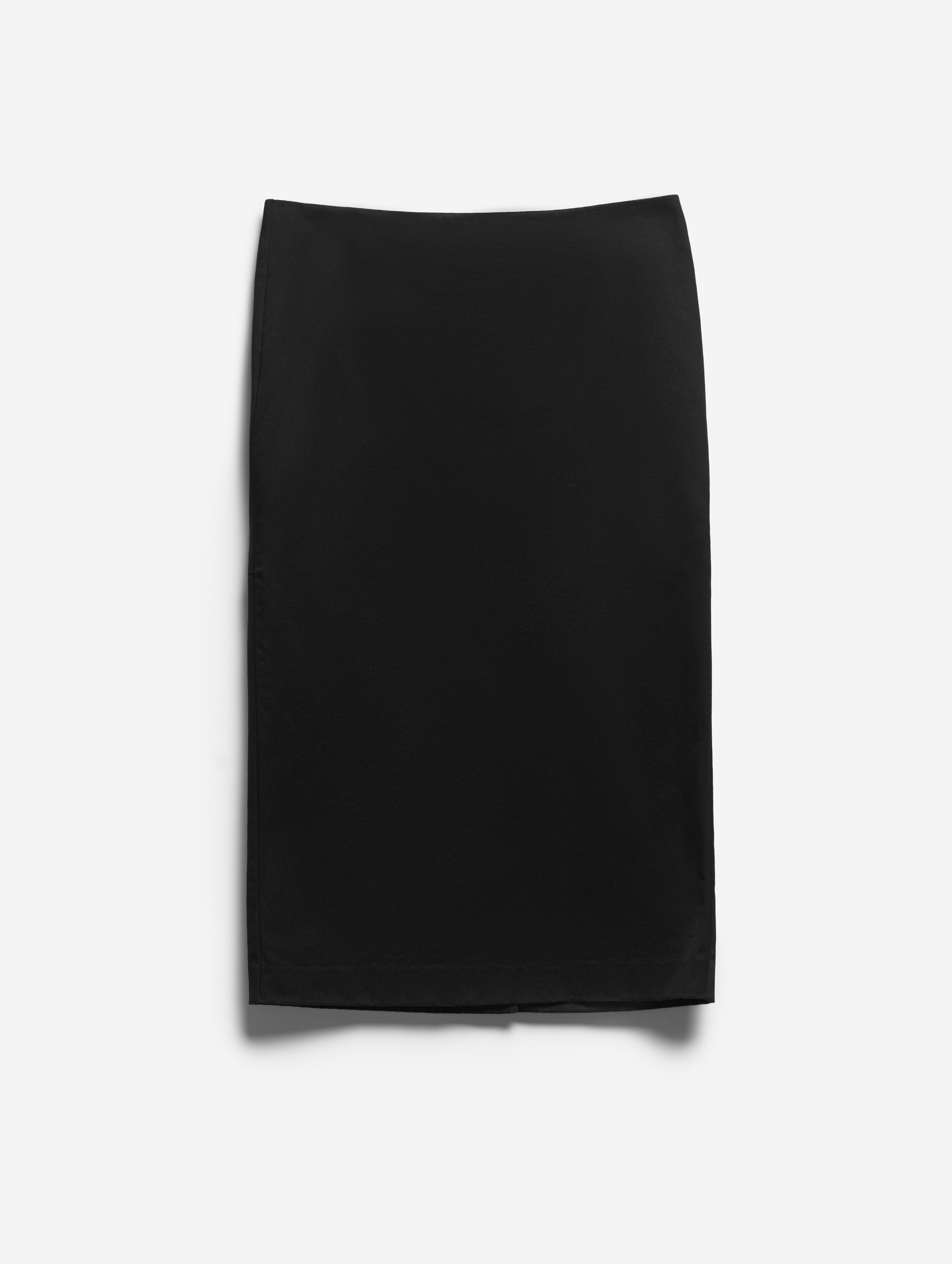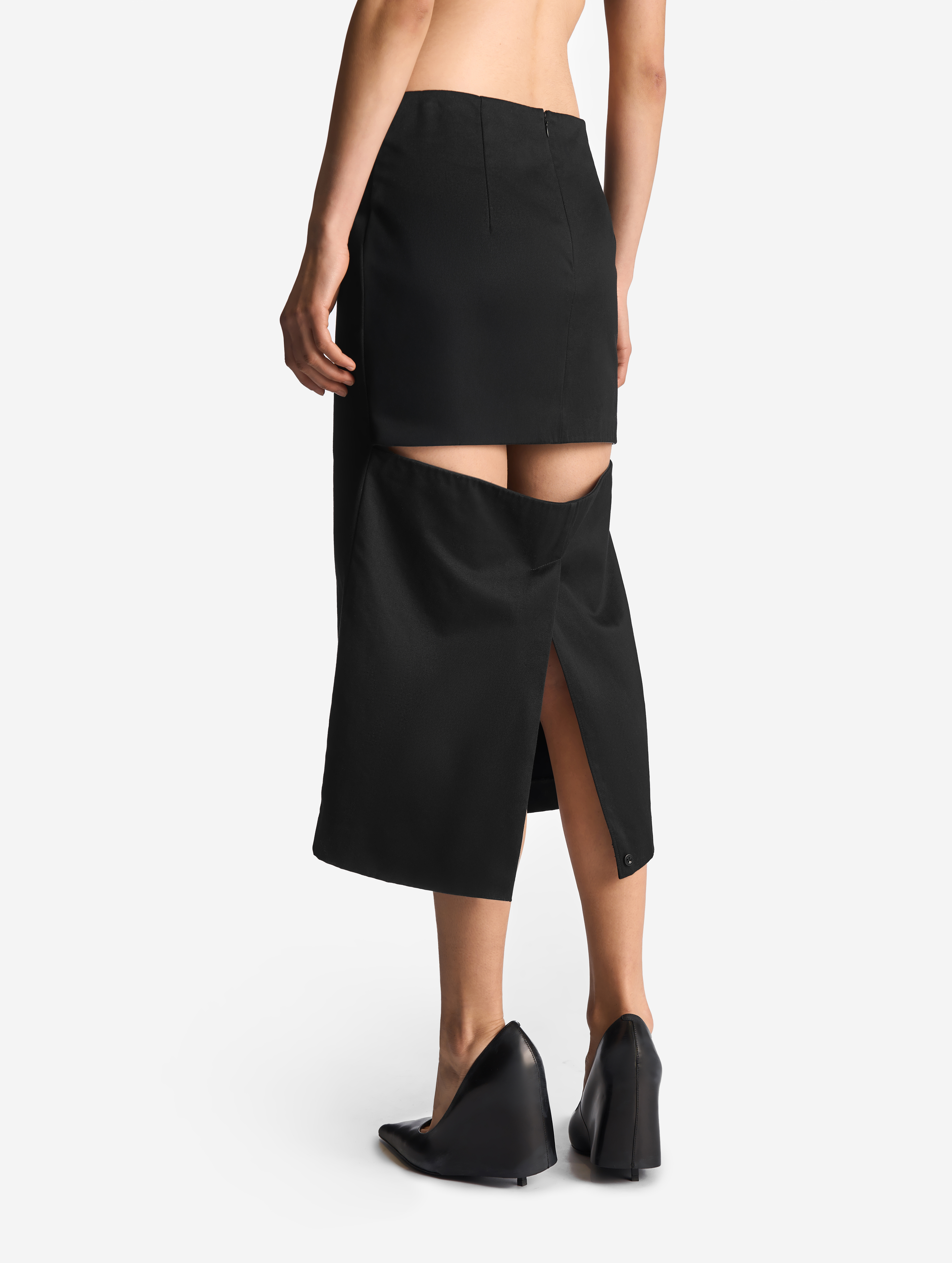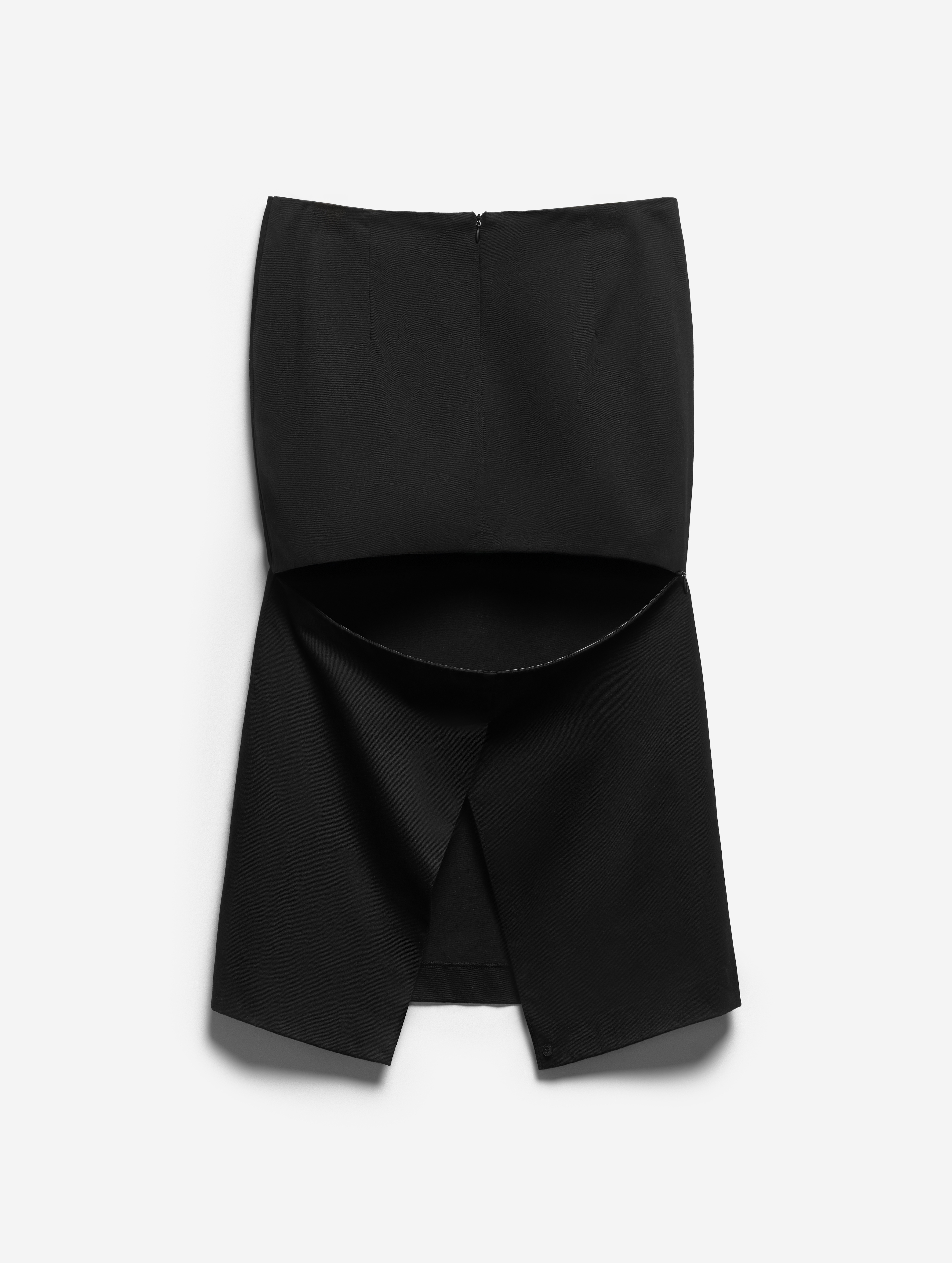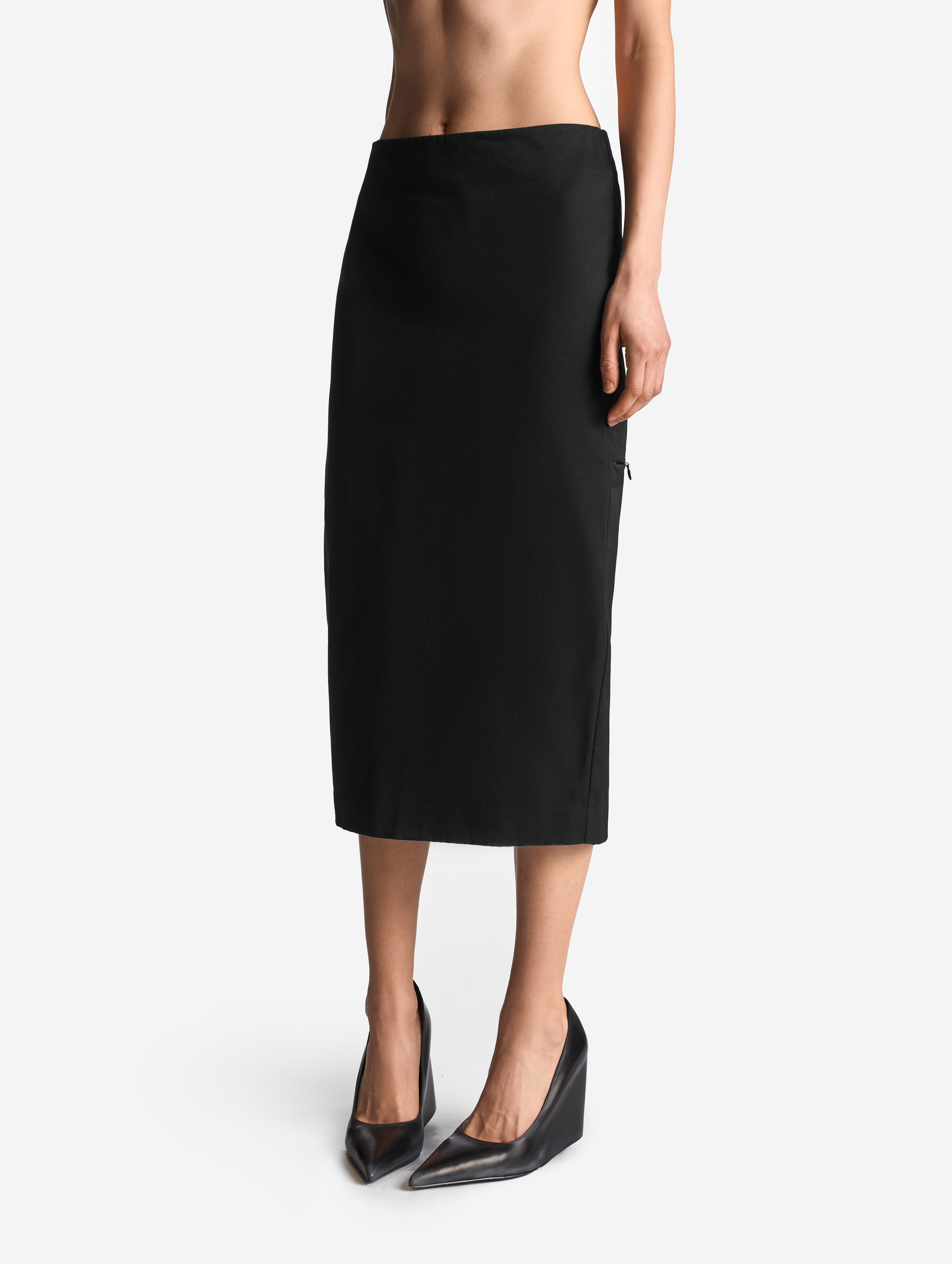 Эту юбку-карандаш мы задумывали как вещь-трансформер. Сзади, на уровне середины бедра, вшита горизонтальная потайная молния — в расстегнутом виде она позволяет перекидывать нижнюю часть юбки вперед. Таким образом с разных сторон изделие обретает асимметрию длин: макси спереди и мини сзади. Застегивается на потайную молнию в среднем шве, который переходит в глубокую шлицу. У нее есть петля и пуговица, чтобы юбка сохраняла прямой силуэт в любом состоянии.