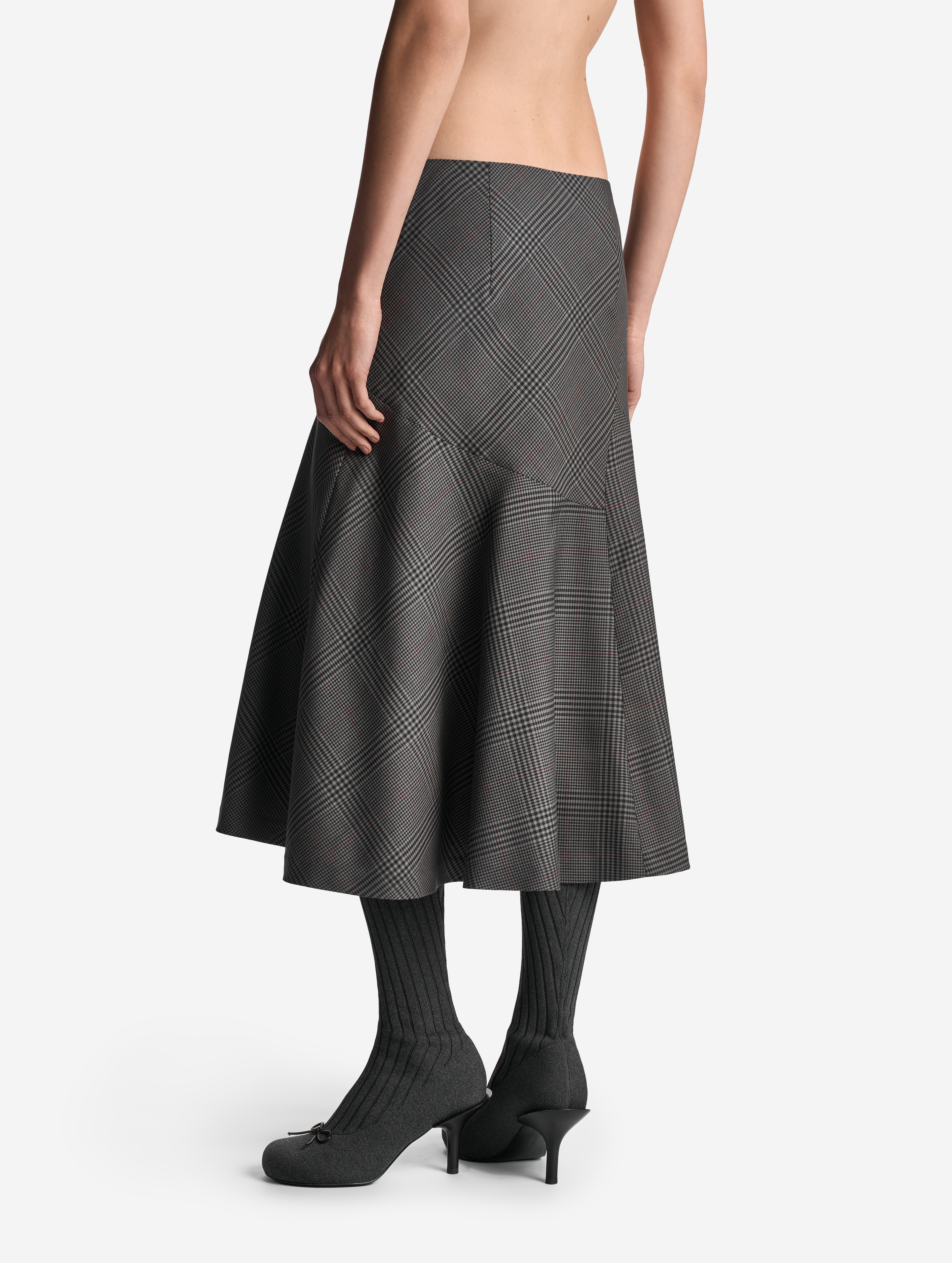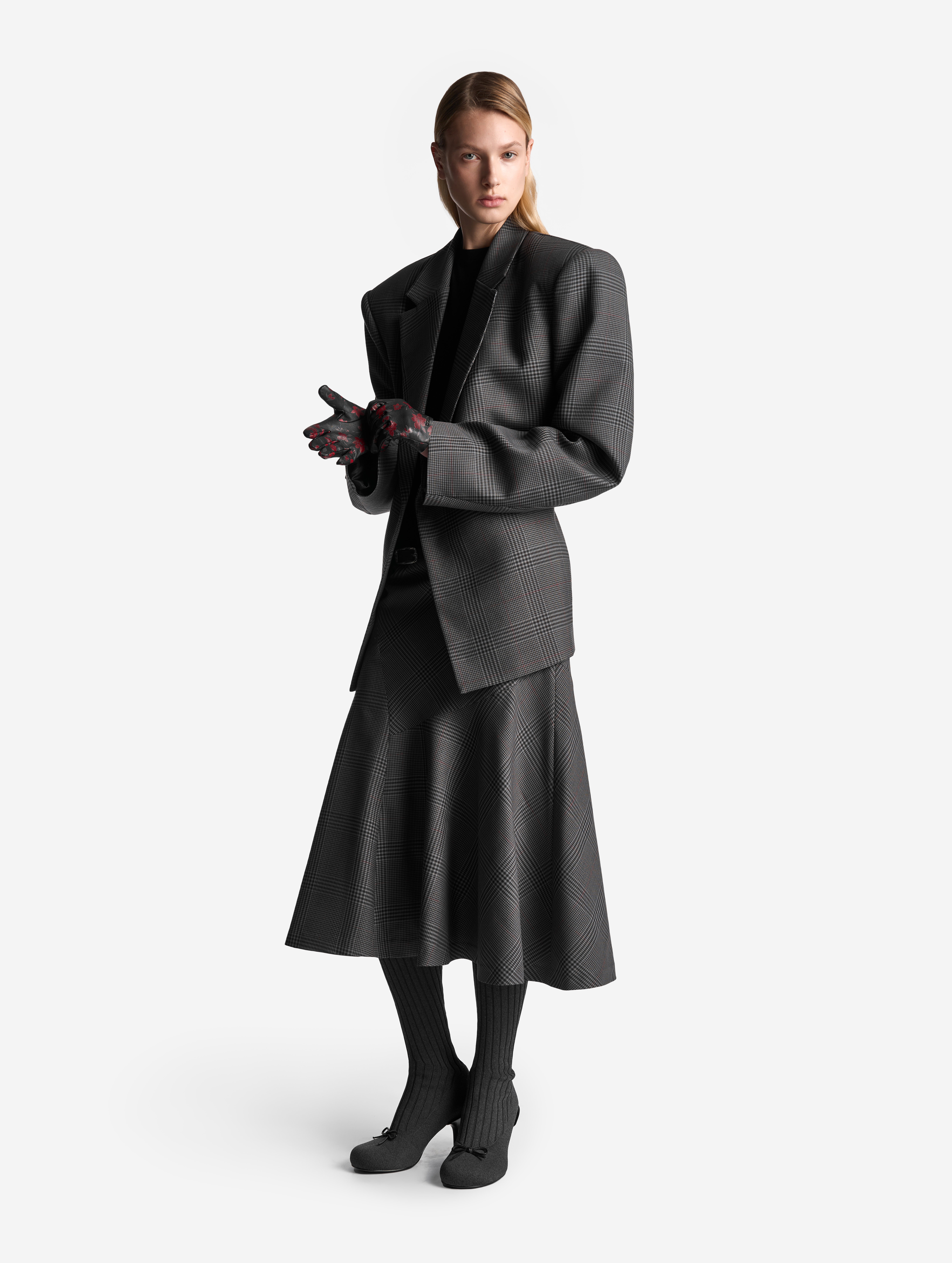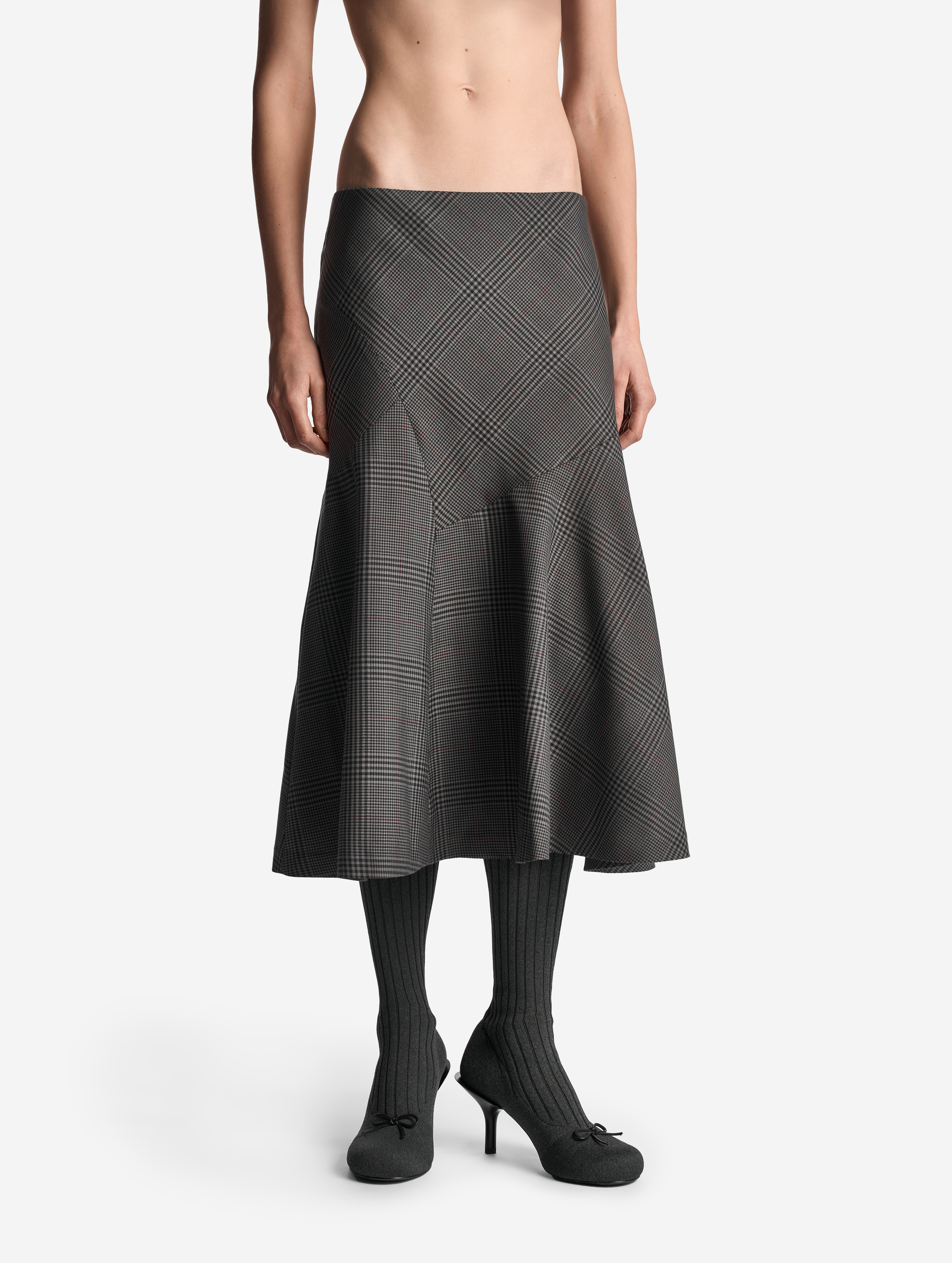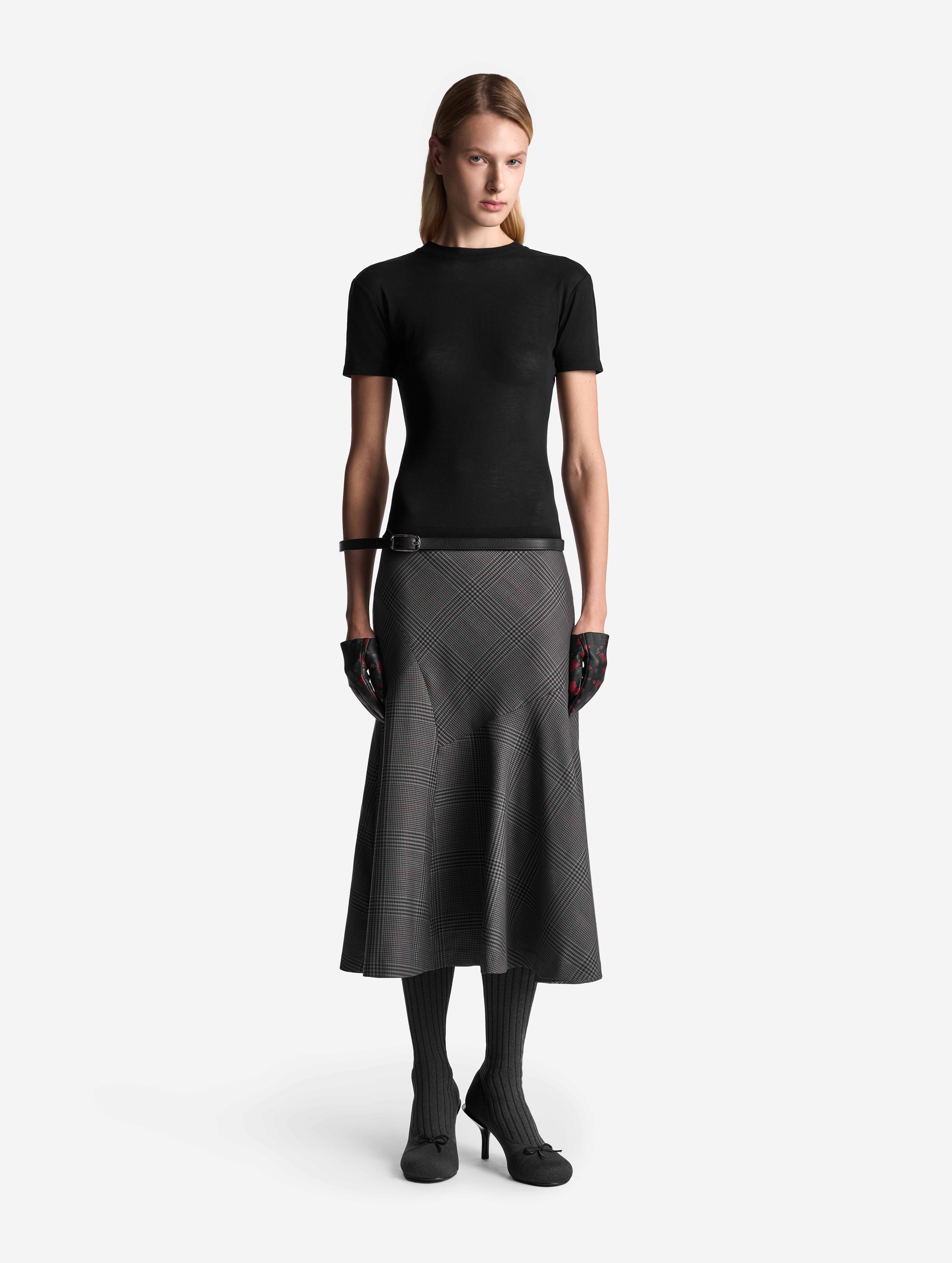 Неклассическая юбка годе — силуэт, ставший для Ushatava иконическим. Конструкция новой модели составлена из клиньев разной конфигурации: такой прием дает асимметрию и сочетание разных «ритмов» геометрического принта. Дизайнеры Ushatava сознательно нарушают правила и никогда не стыкуют рисунок по шву.