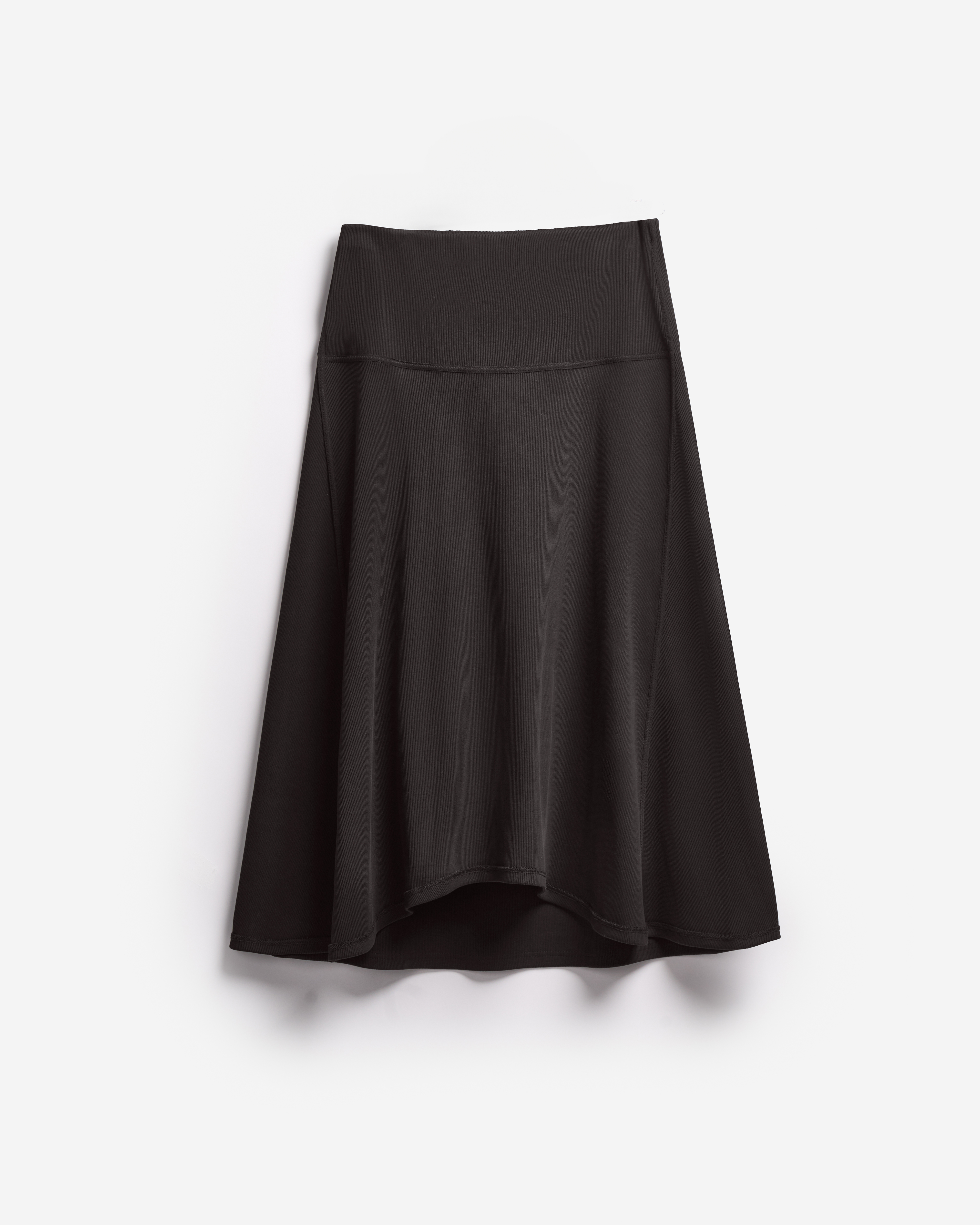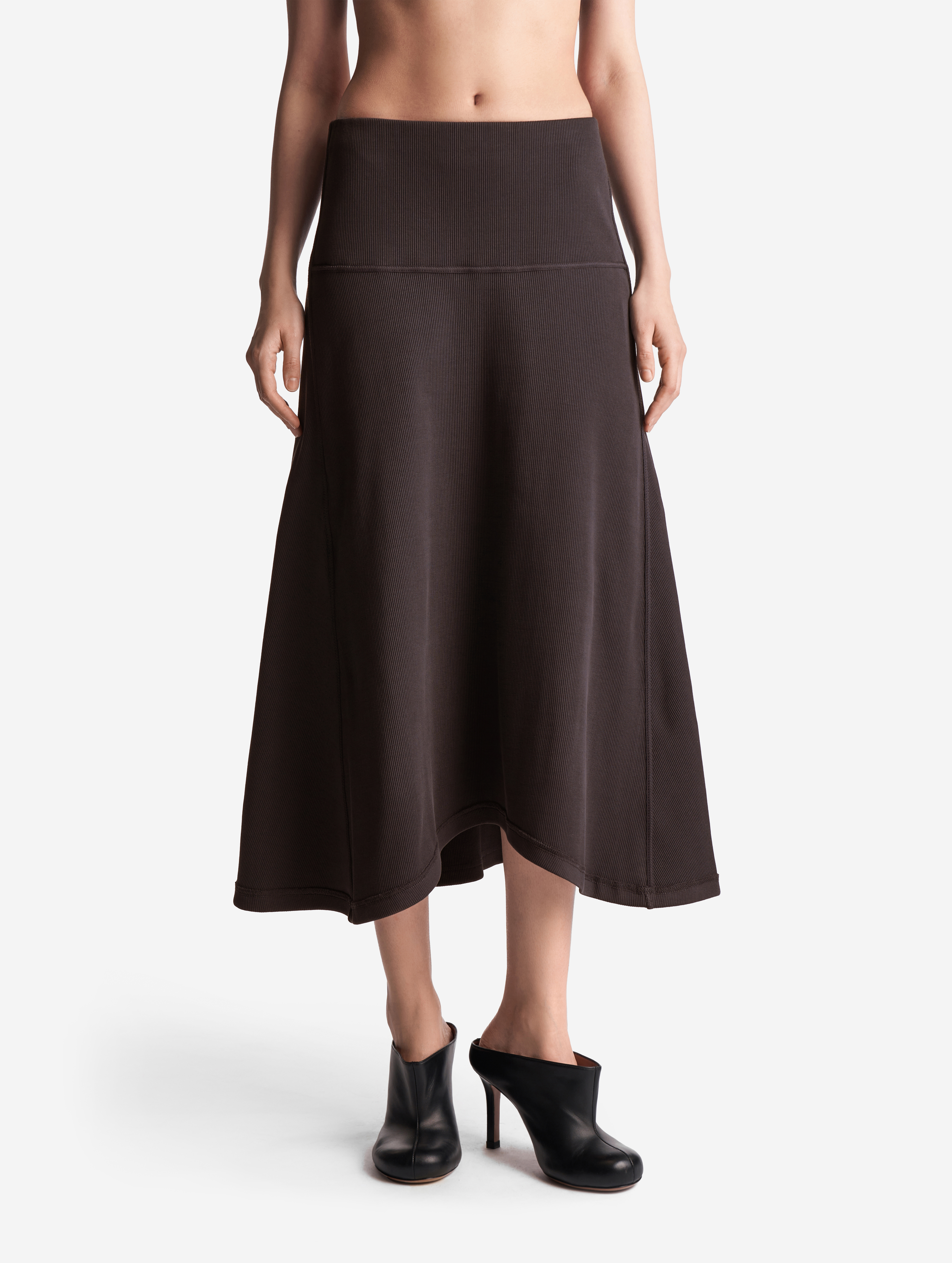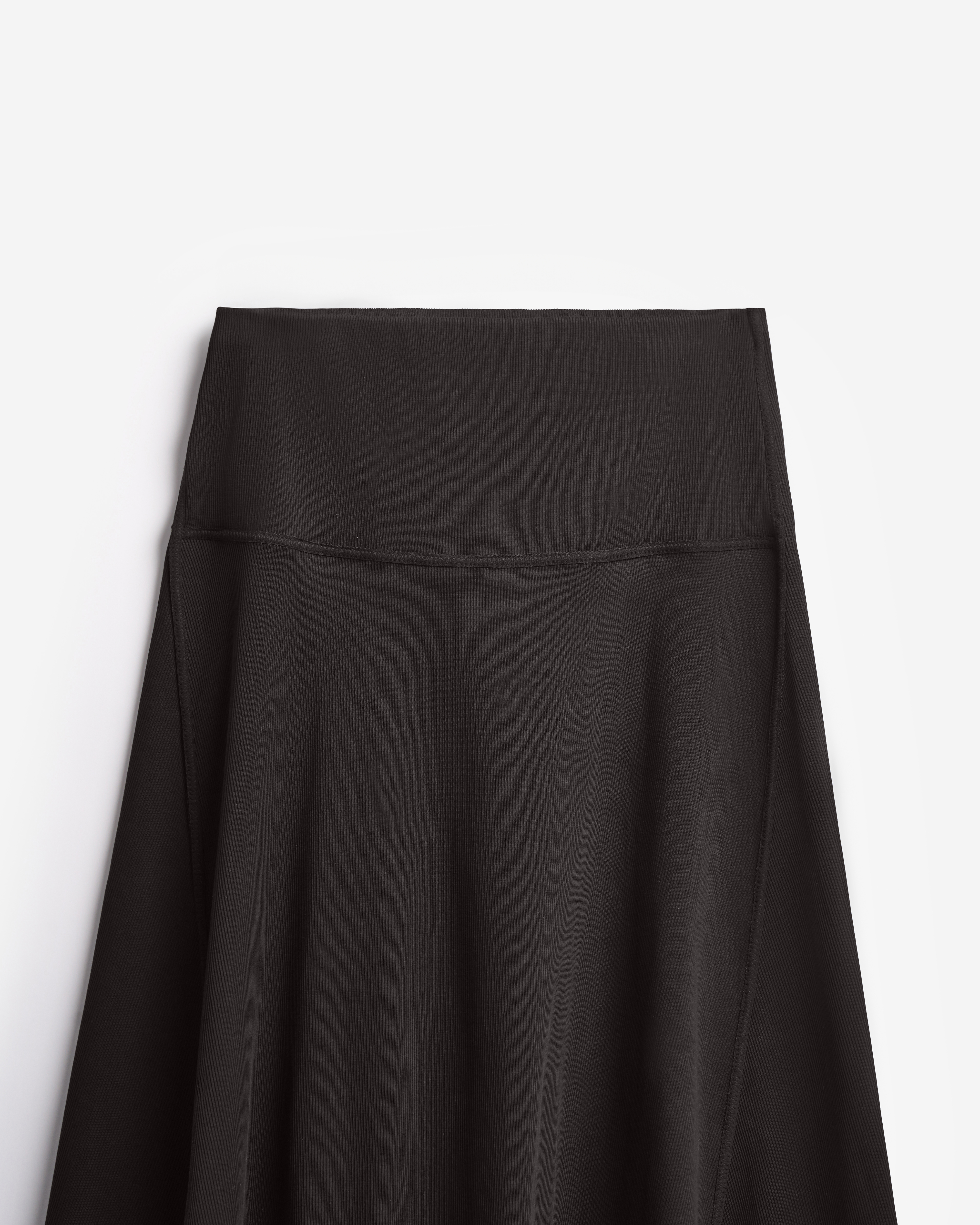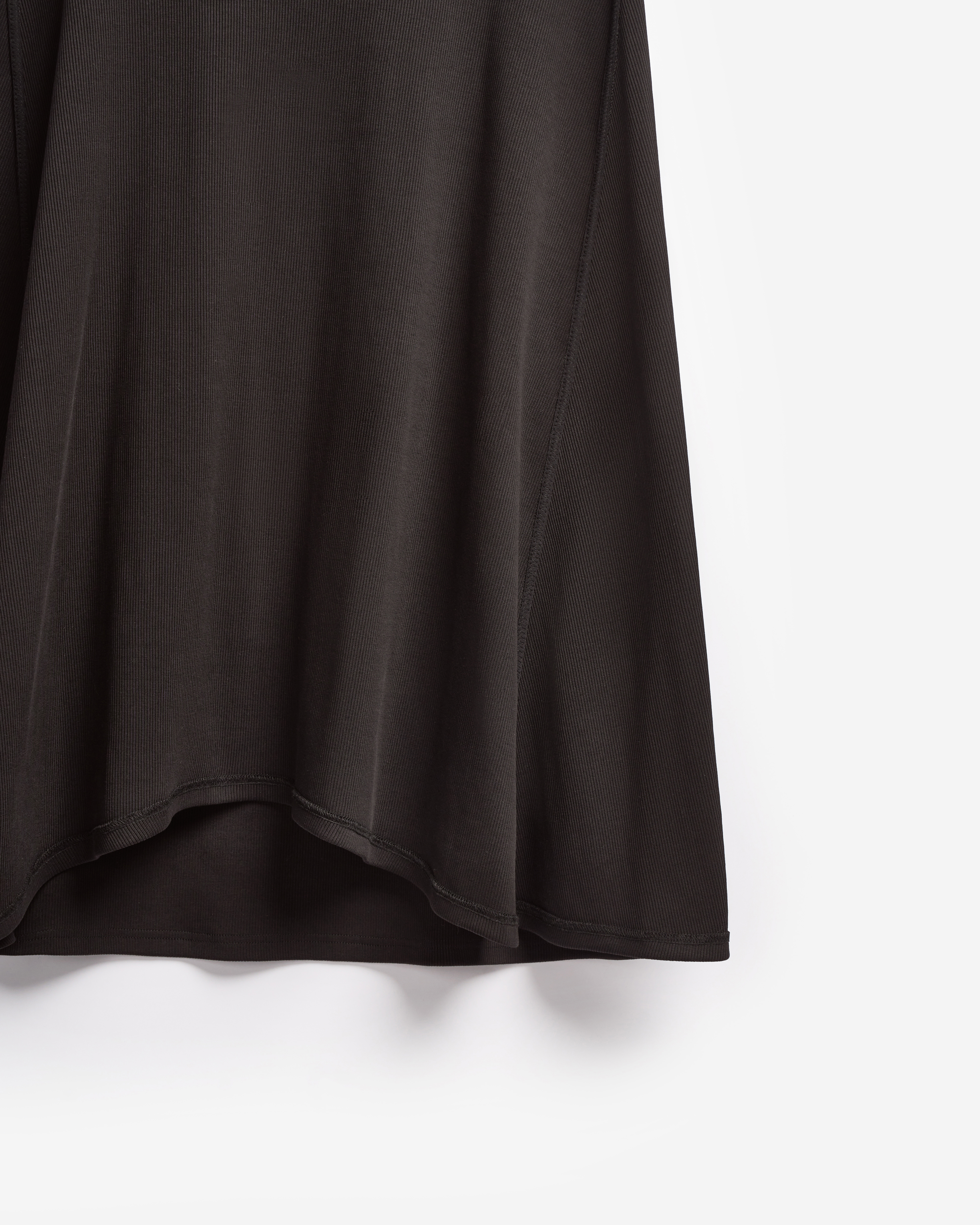 Неклассическая юбка годе из кашкорсе. Вставка из ткани в виде полусолнца формирует клинья, идущие от бедра. Юбку можно перекручивать, чтобы клинья формировались сзади или сбоку, — в любом положении она будет сидеть по фигуре. Все детали обработаны бретелечной резинкой для создания эффекта вывернутой наизнанку вещи — это один из ключевых дизайн-приемов Ushatava. Изделие застегивается на потайную молнию. Юбка украшена флажком с именем модного Дома.