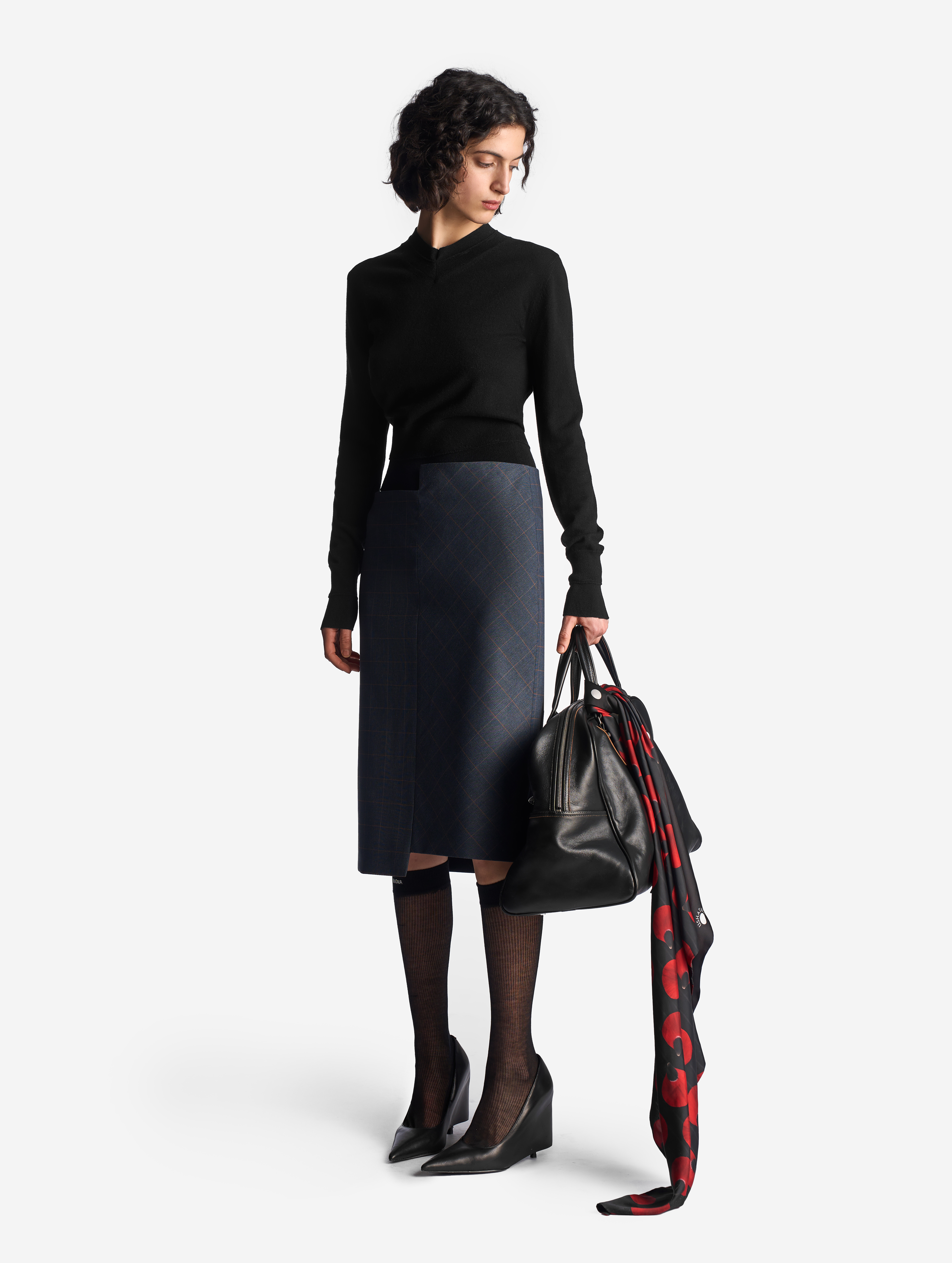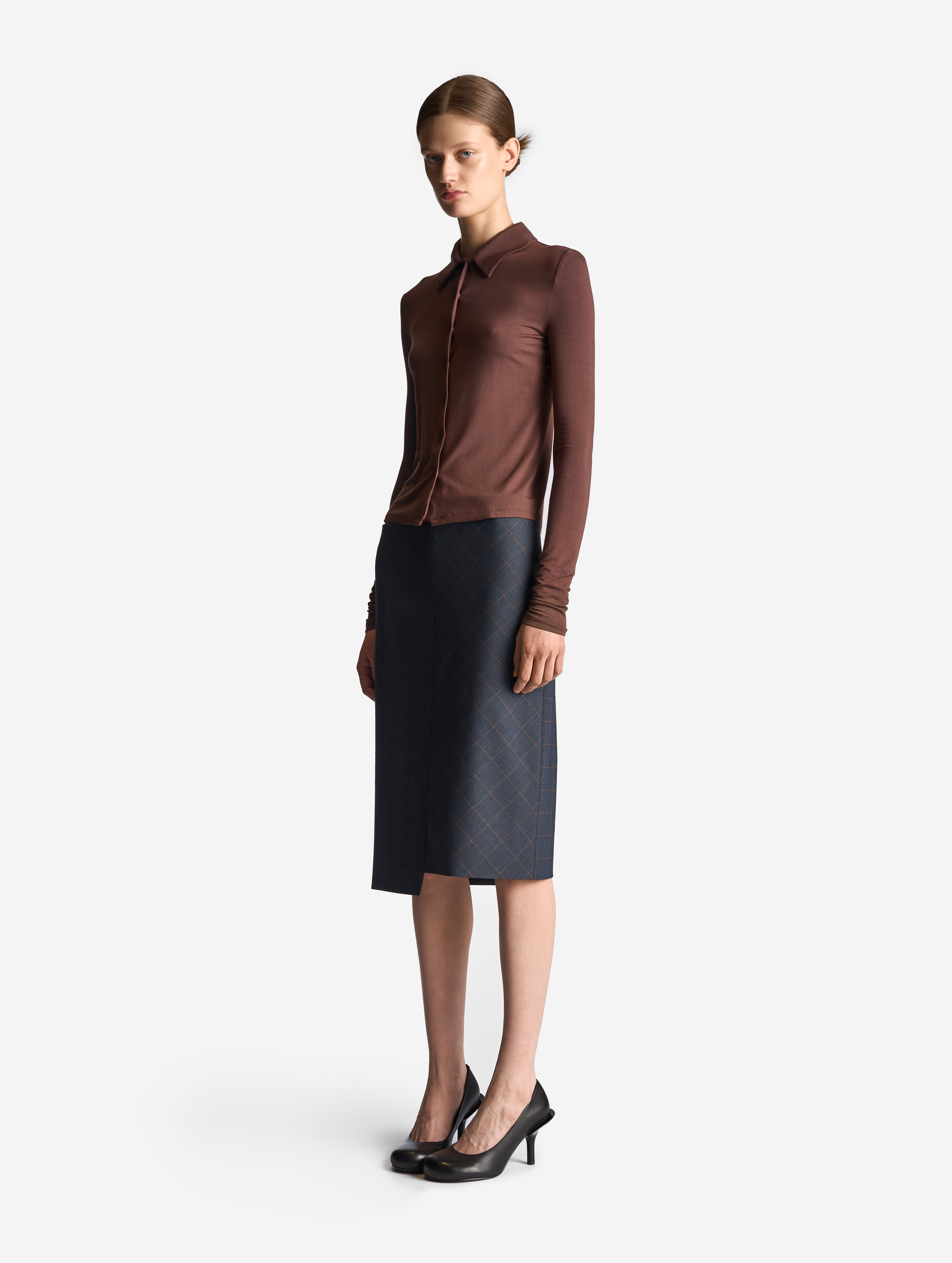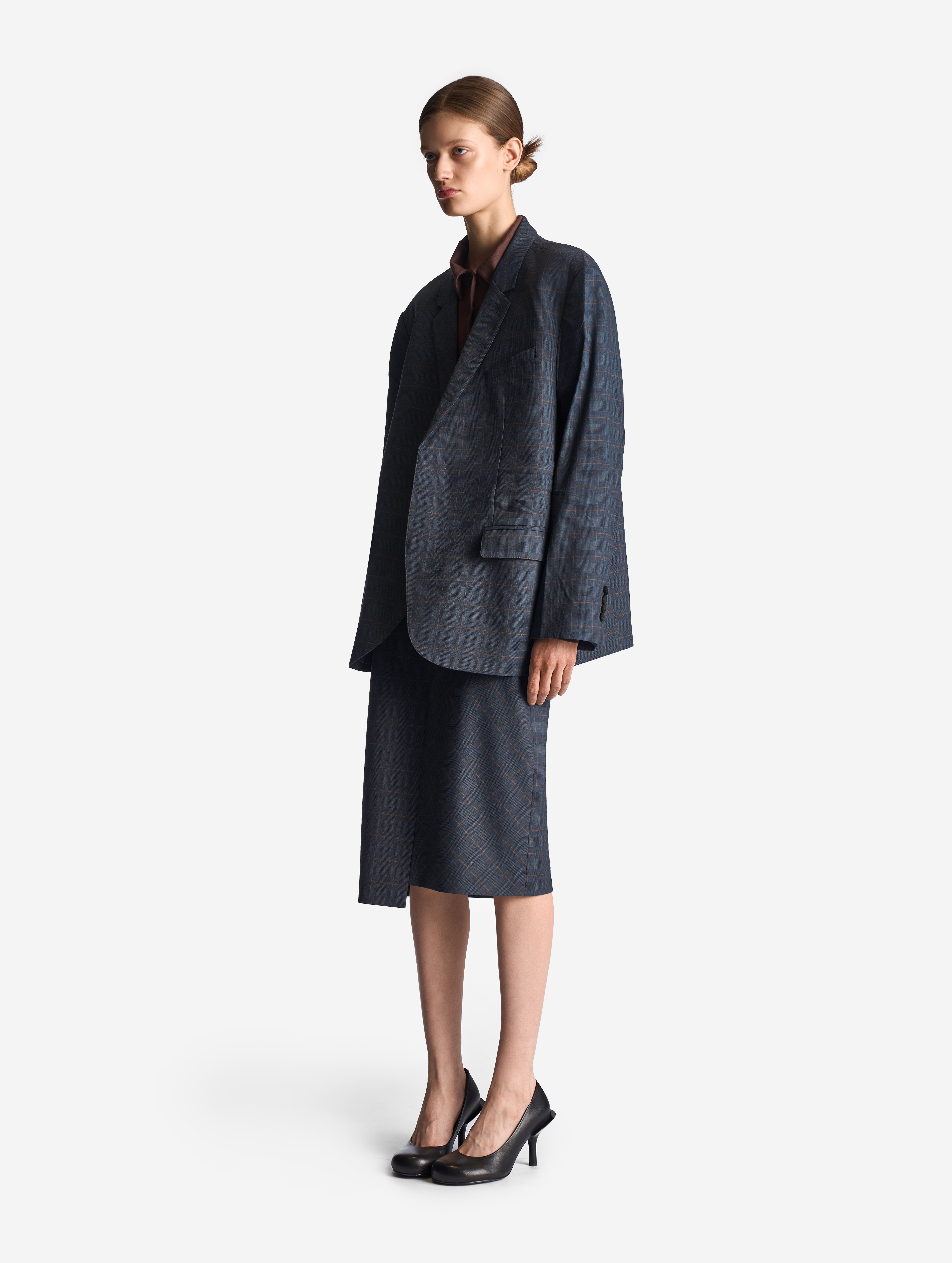 «Эта вещь олицетворяет Ushatava. Она вне времени, но одновременно с нашим авторским твистом», — говорит Нино Шаматава, креативный директор бренда. Юбка-карандаш входит в число иконических силуэтов модного Дома, и в Garderobe SS26 она появляется в новом прочтении. Ее асимметричная конструкция подчеркивается сбитым рисунком принта — мы не стыкуем клетку в предметах одежды с первых коллекций Ushatava. Юбка застегивается на потайную молнию. Сзади есть шлица, глубина которой вымерялась нами в соответствии со средней шириной шага.