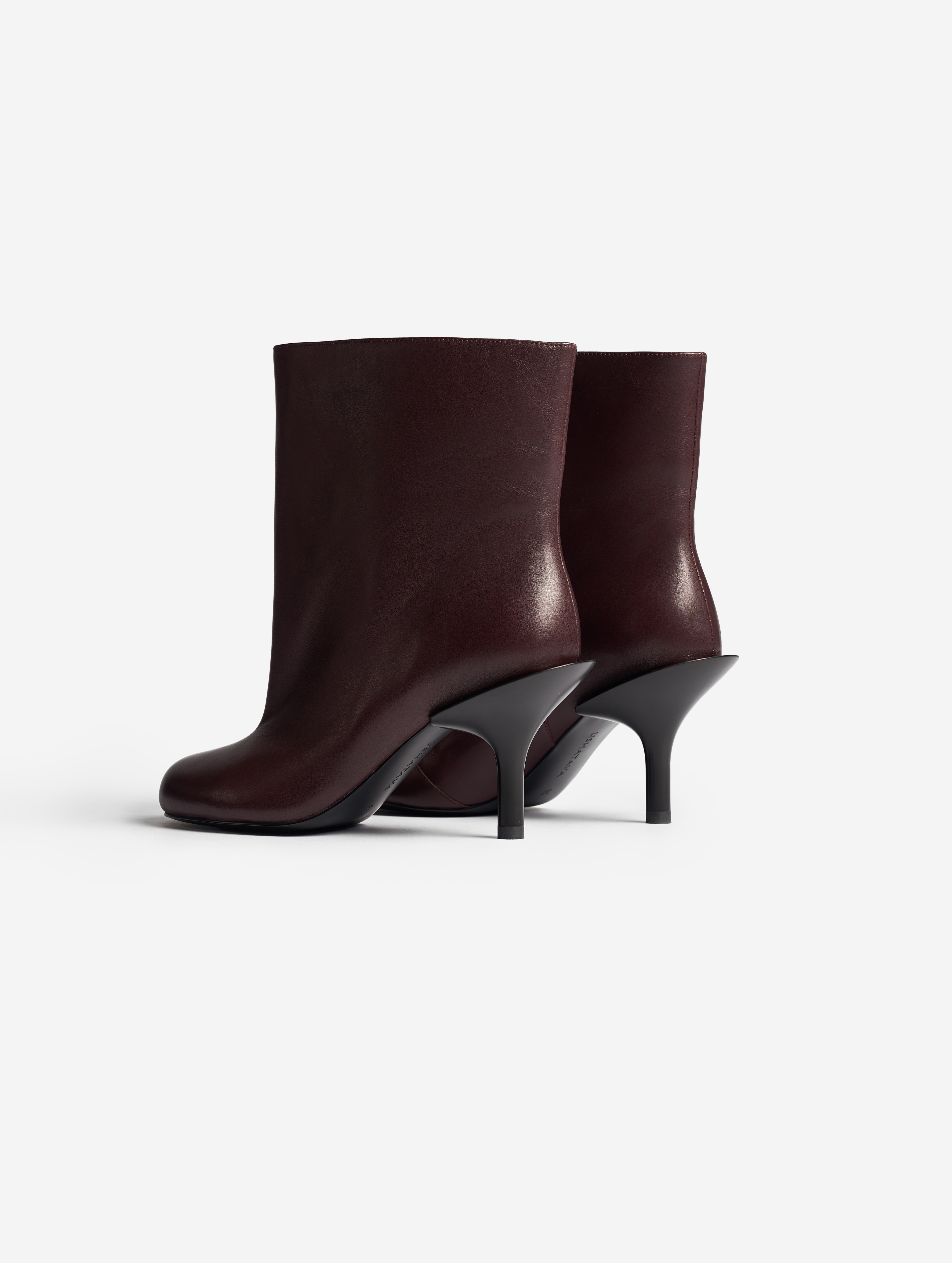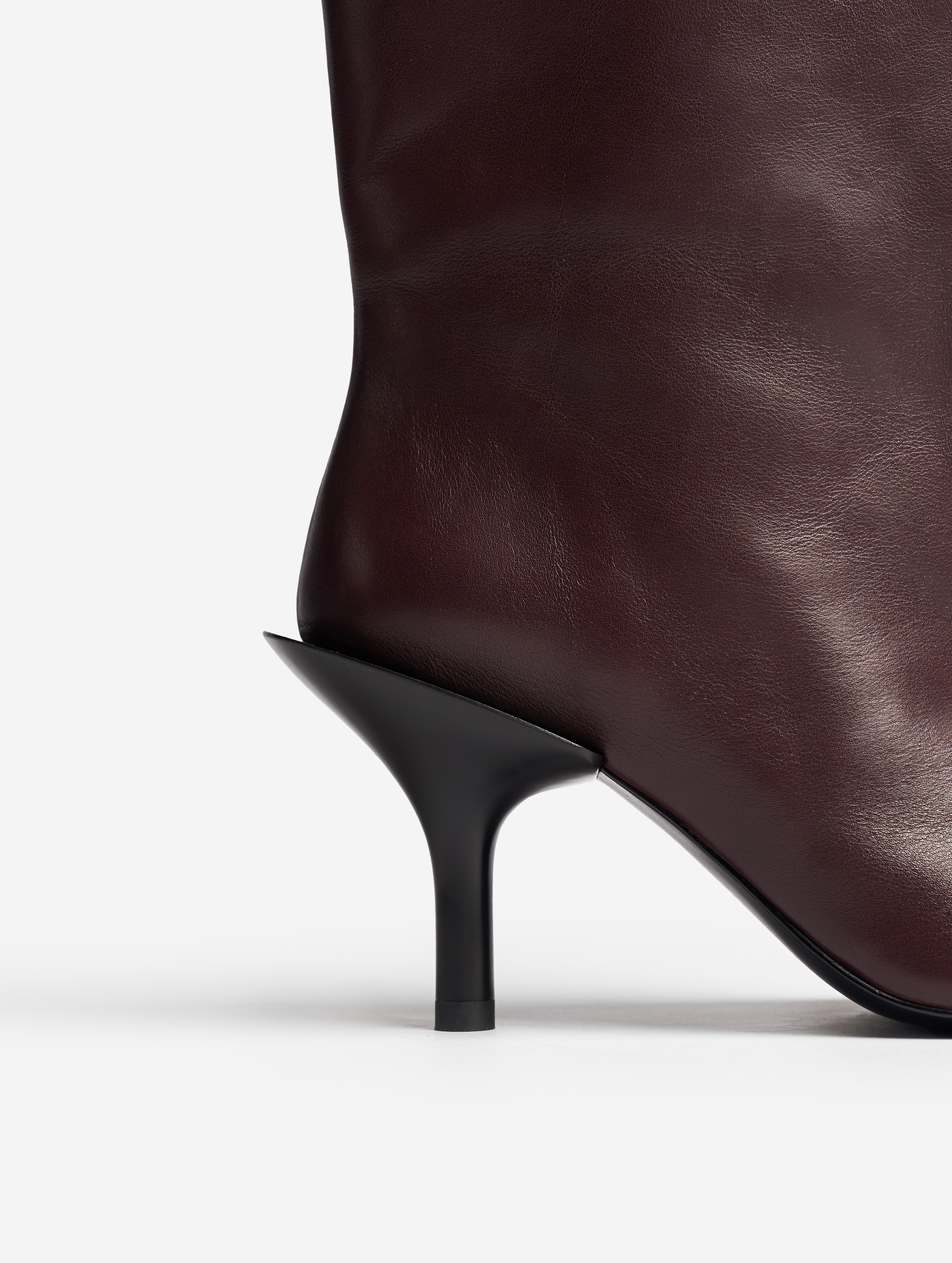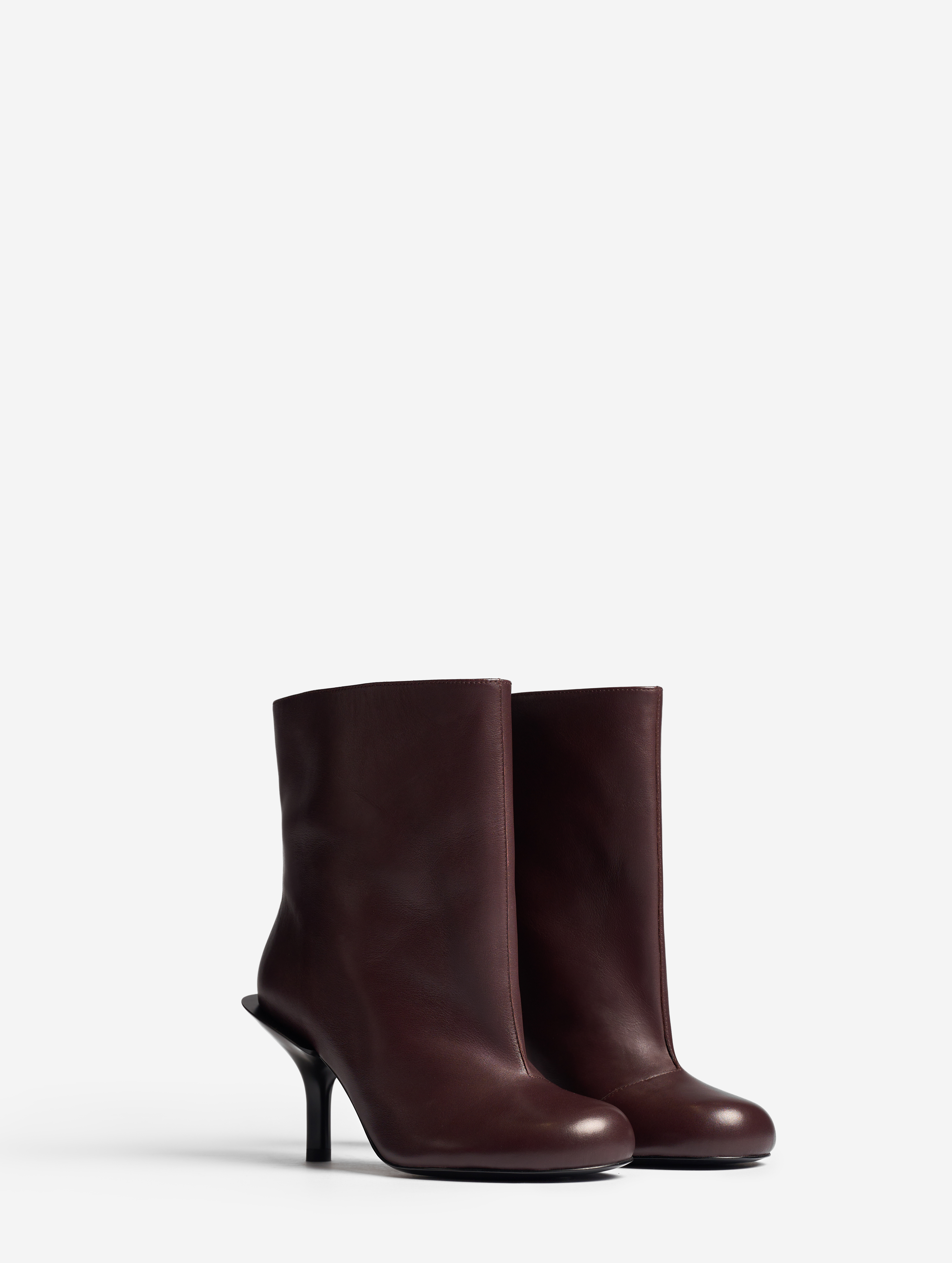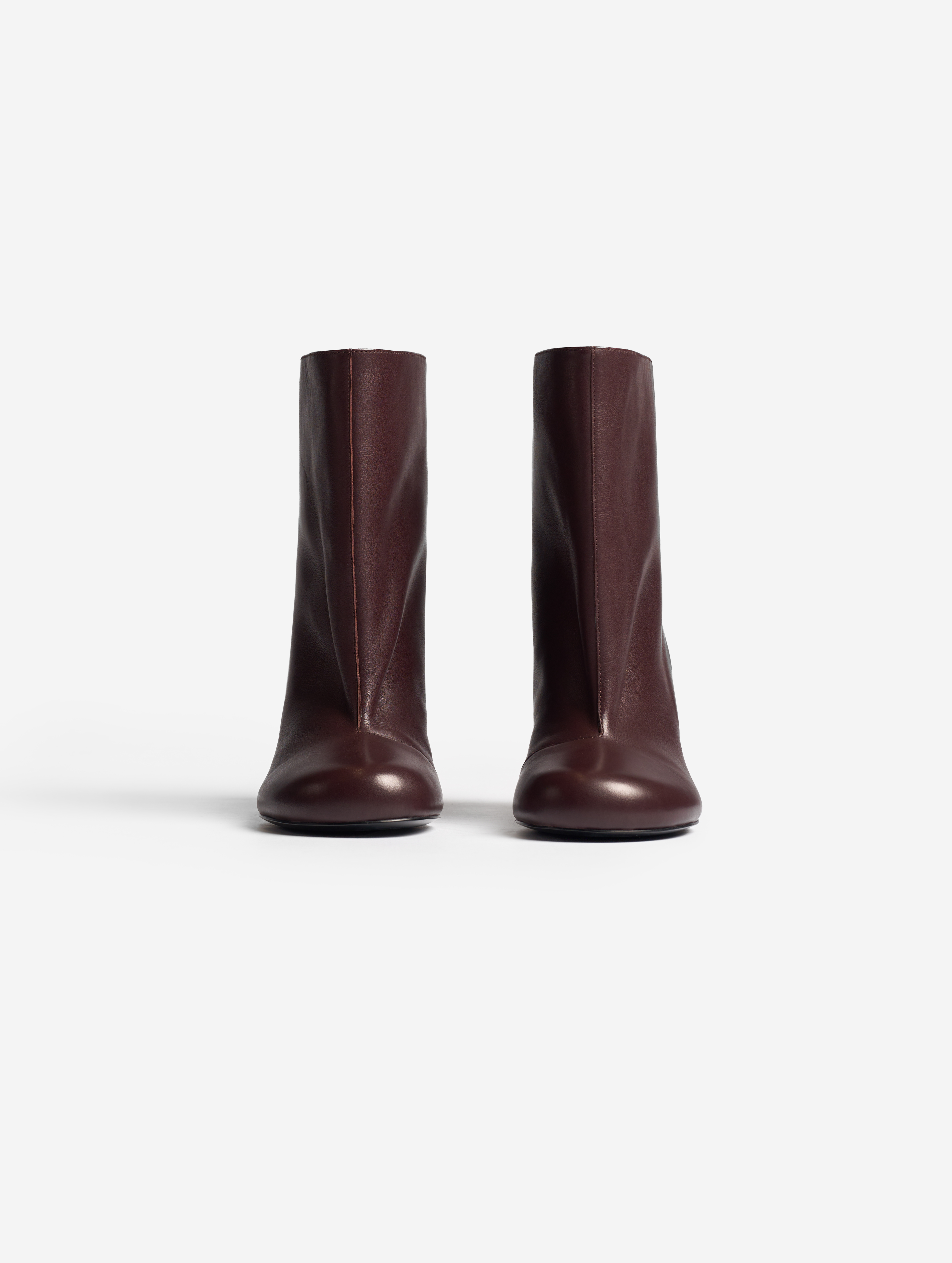 Демисезонные ботильоны-трубы выполнены из натуральной кожи наппа. Этот материал отличают мягкость, пластичность, но вместе с тем — прочность и долговечность. Каблук высотой 7.5 см — золотой стандарт Ushatava: он устойчивый и обеспечивает комфортный взъем. Каблук отвечает идее деконструкции: основа шпильки вынесена за пределы пяточной зоны и формирует выступающий кант. Кажется, будто его приклеили в спешке. Широкое голенище позволяет заправить в сапоги даже самые просторные брюки. Такой силуэт визуально вытягивает ноги, особенно в сочетании с леггинсами. Температурный режим — от +15°C до 5°C, с теплым носком — от 5°C до 0°C.