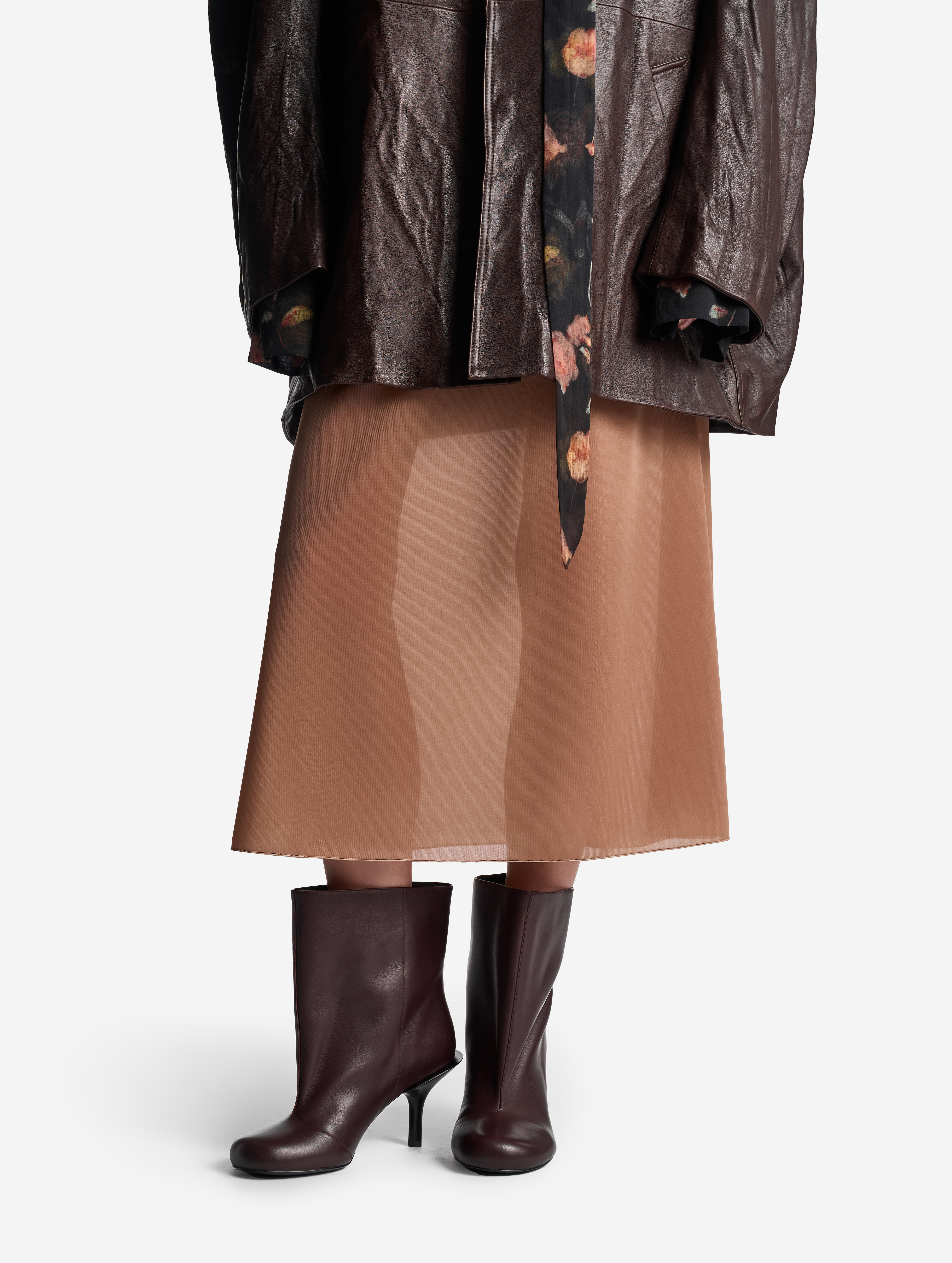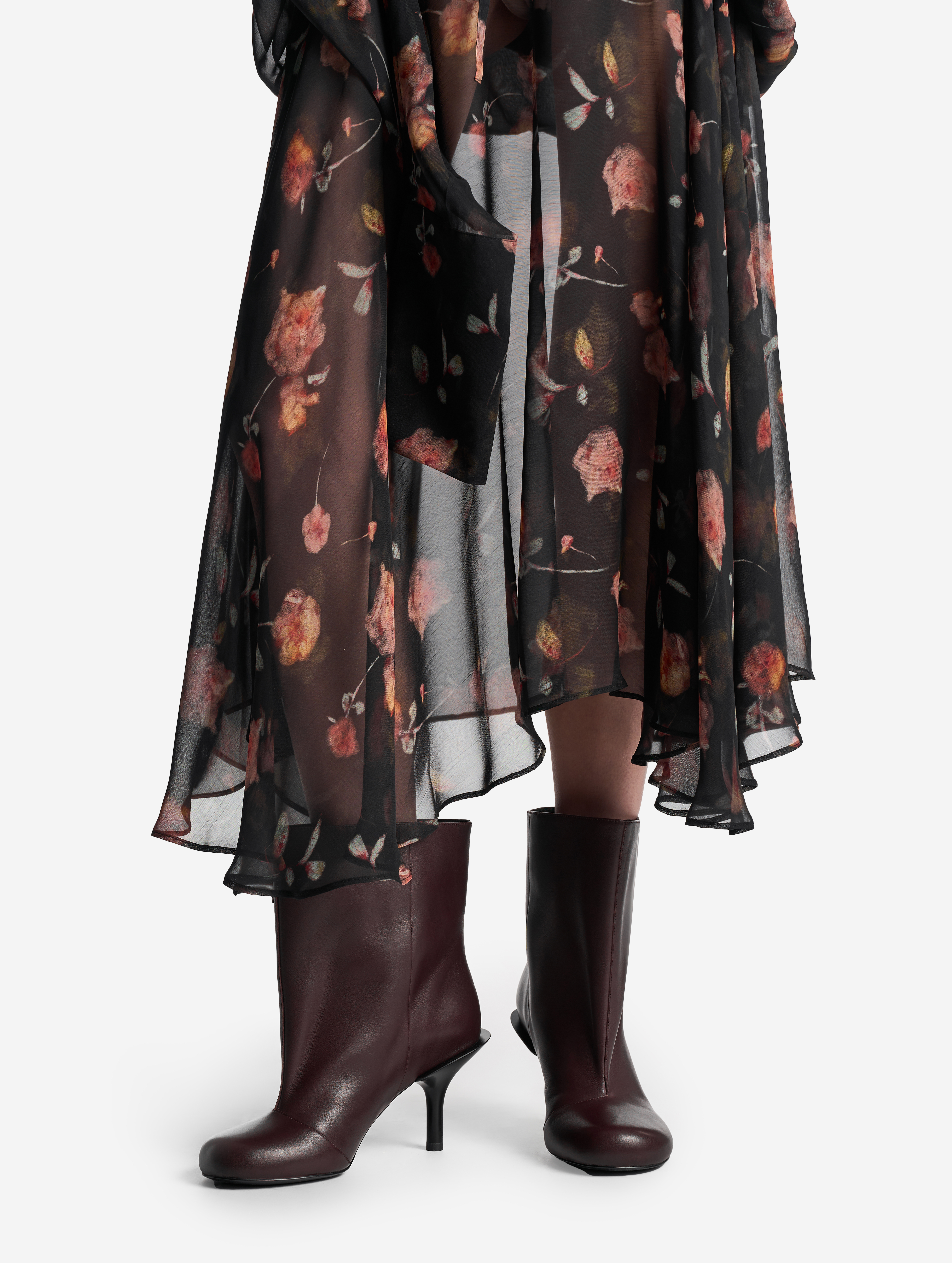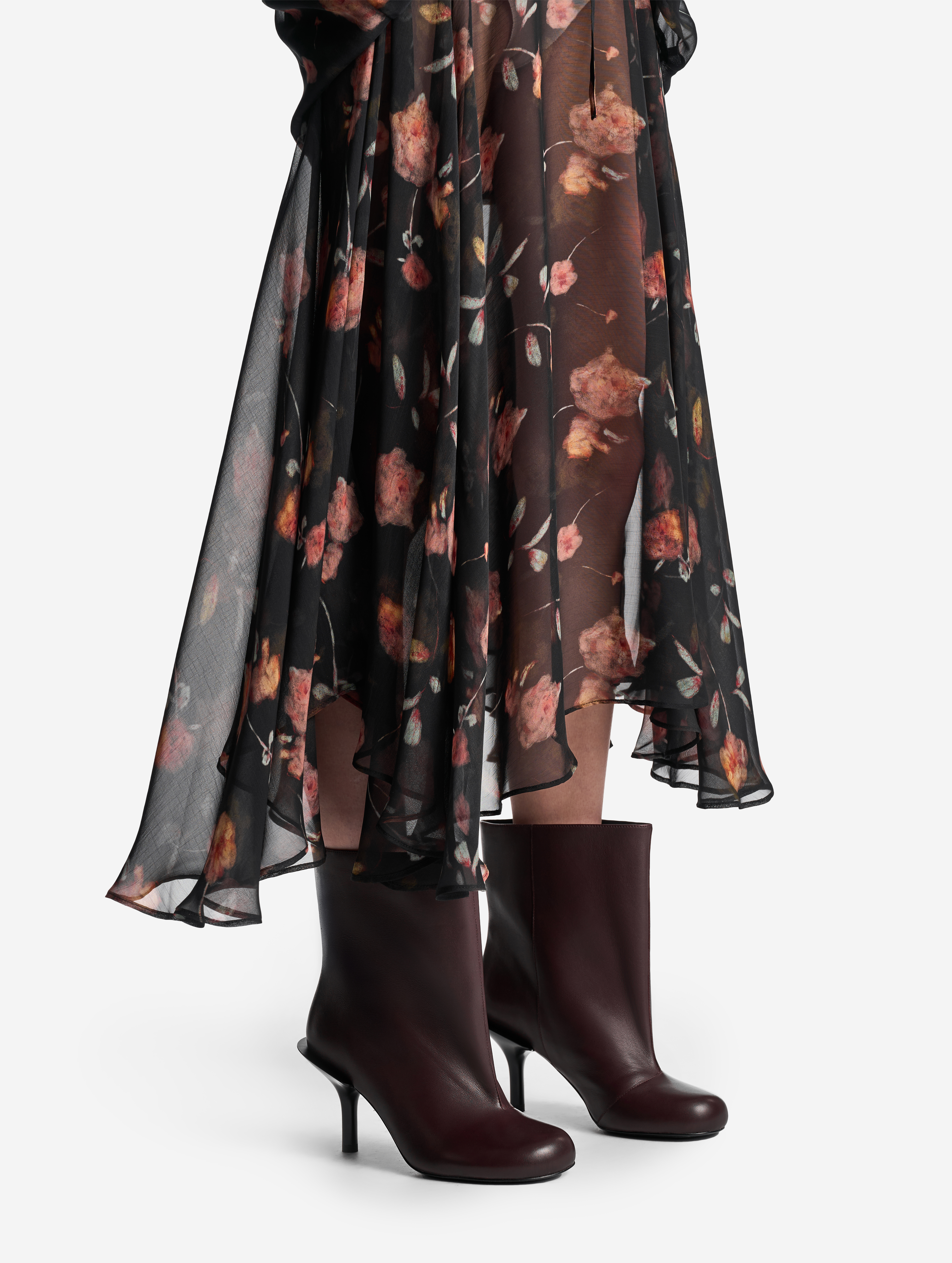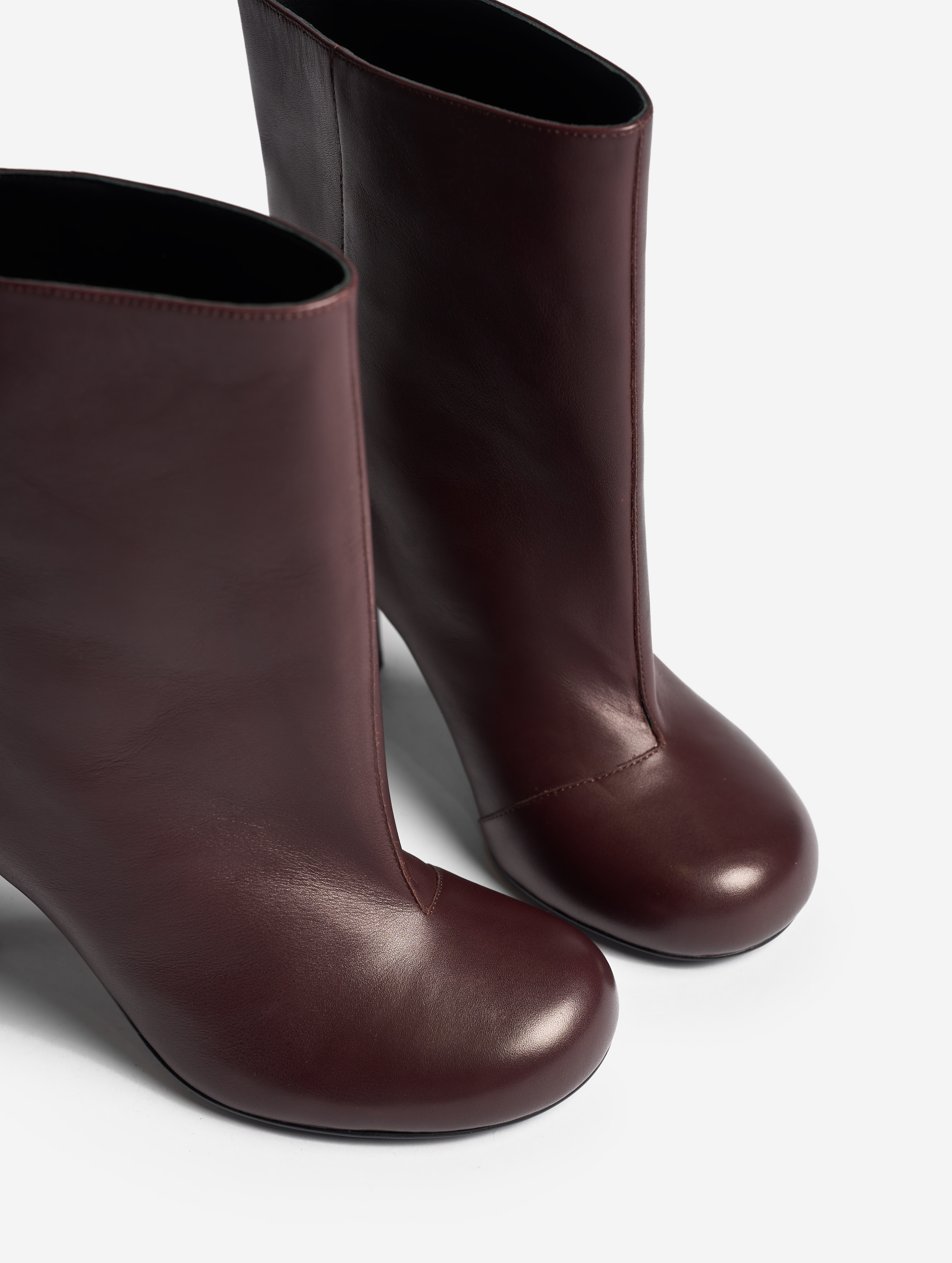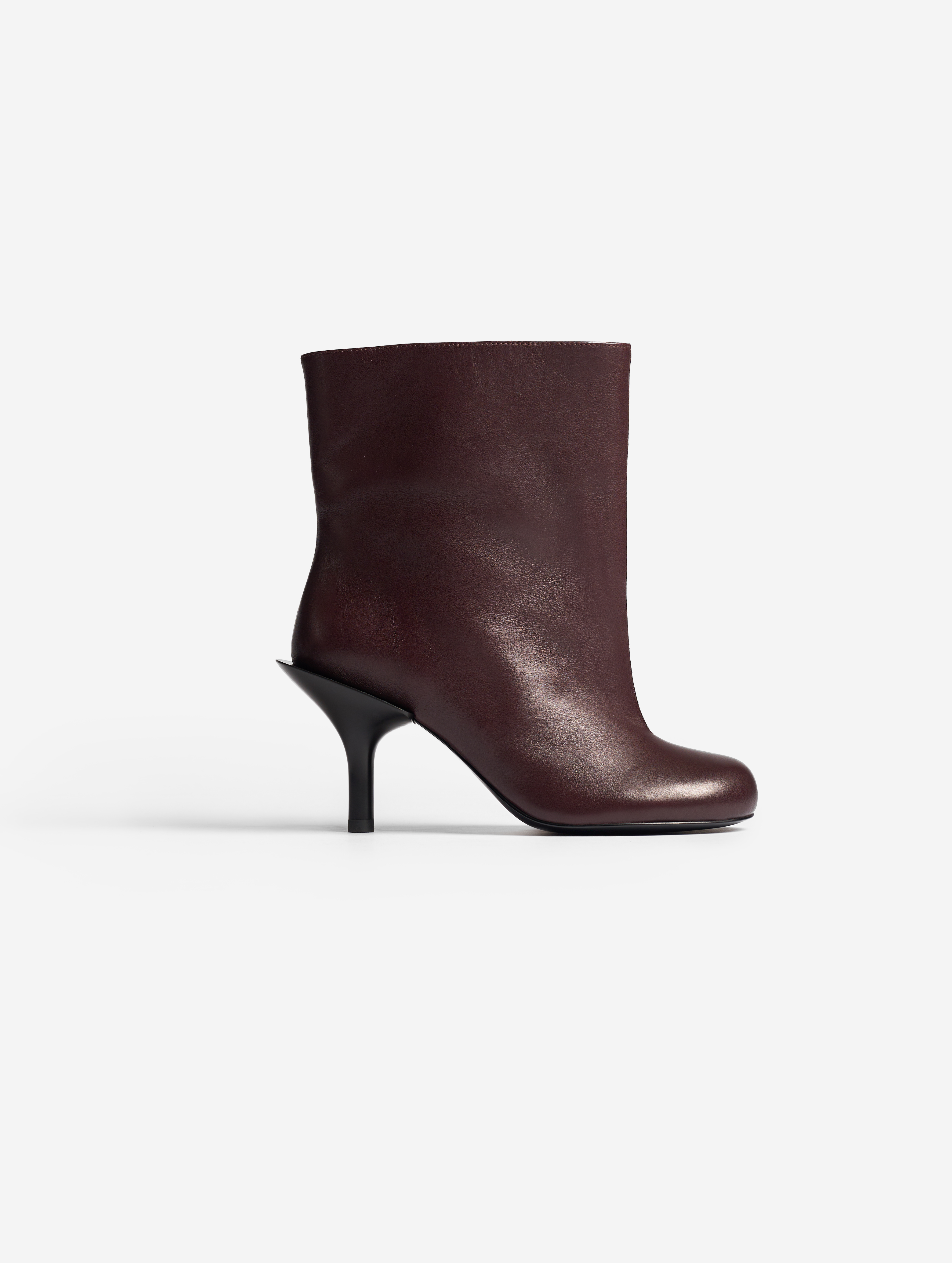 Демисезонные ботильоны-трубы выполнены из натуральной кожи наппа. Этот материал отличают мягкость, пластичность, но вместе с тем — прочность и долговечность. Каблук высотой 7.5 см — золотой стандарт Ushatava: он устойчивый и обеспечивает комфортный взъем. Каблук отвечает идее деконструкции: основа шпильки вынесена за пределы пяточной зоны и формирует выступающий кант. Кажется, будто его приклеили в спешке. Широкое голенище позволяет заправить в сапоги даже самые просторные брюки. Такой силуэт визуально вытягивает ноги, особенно в сочетании с леггинсами. Температурный режим — от +15°C до 5°C, с теплым носком — от 5°C до 0°C.
