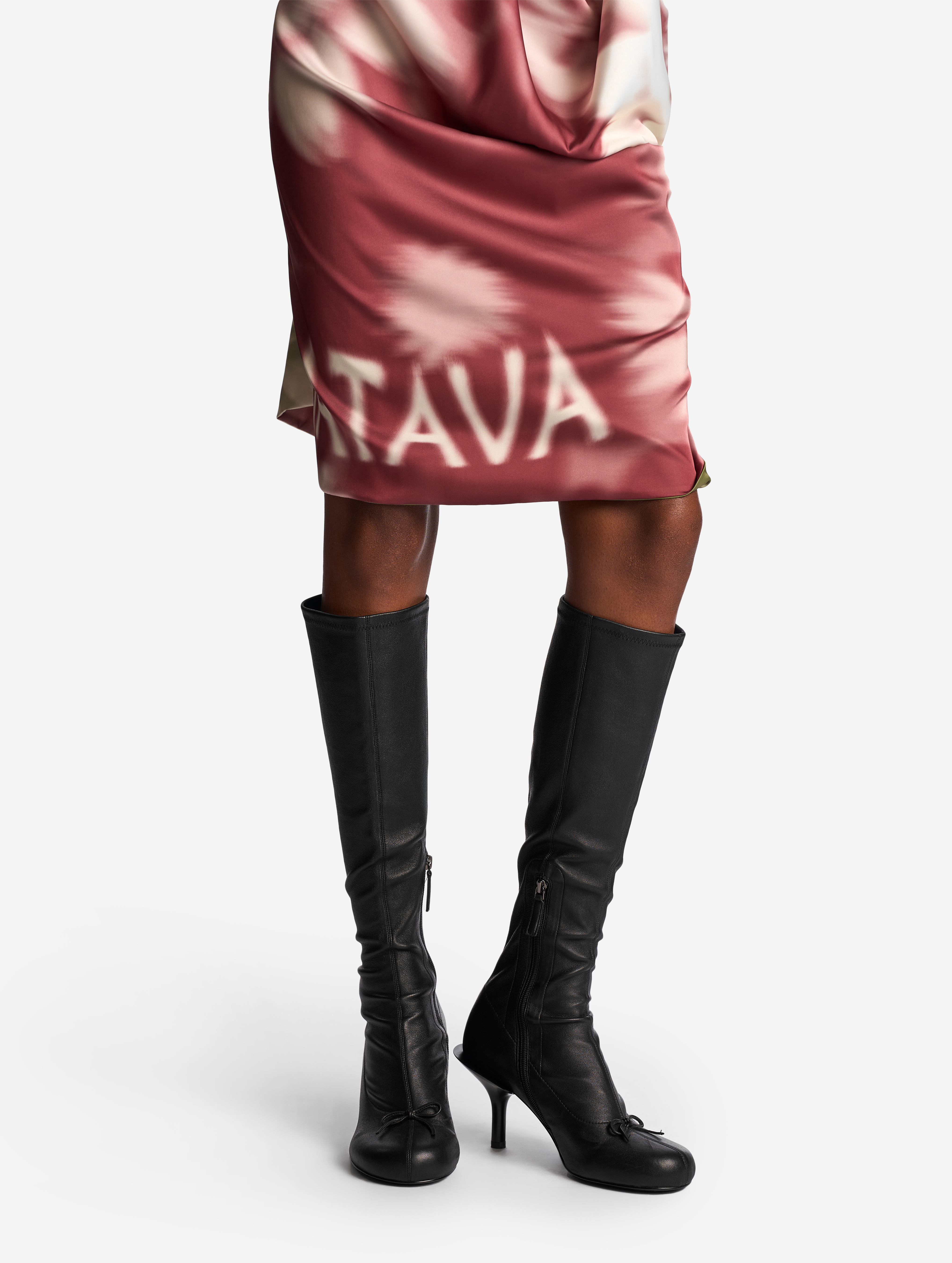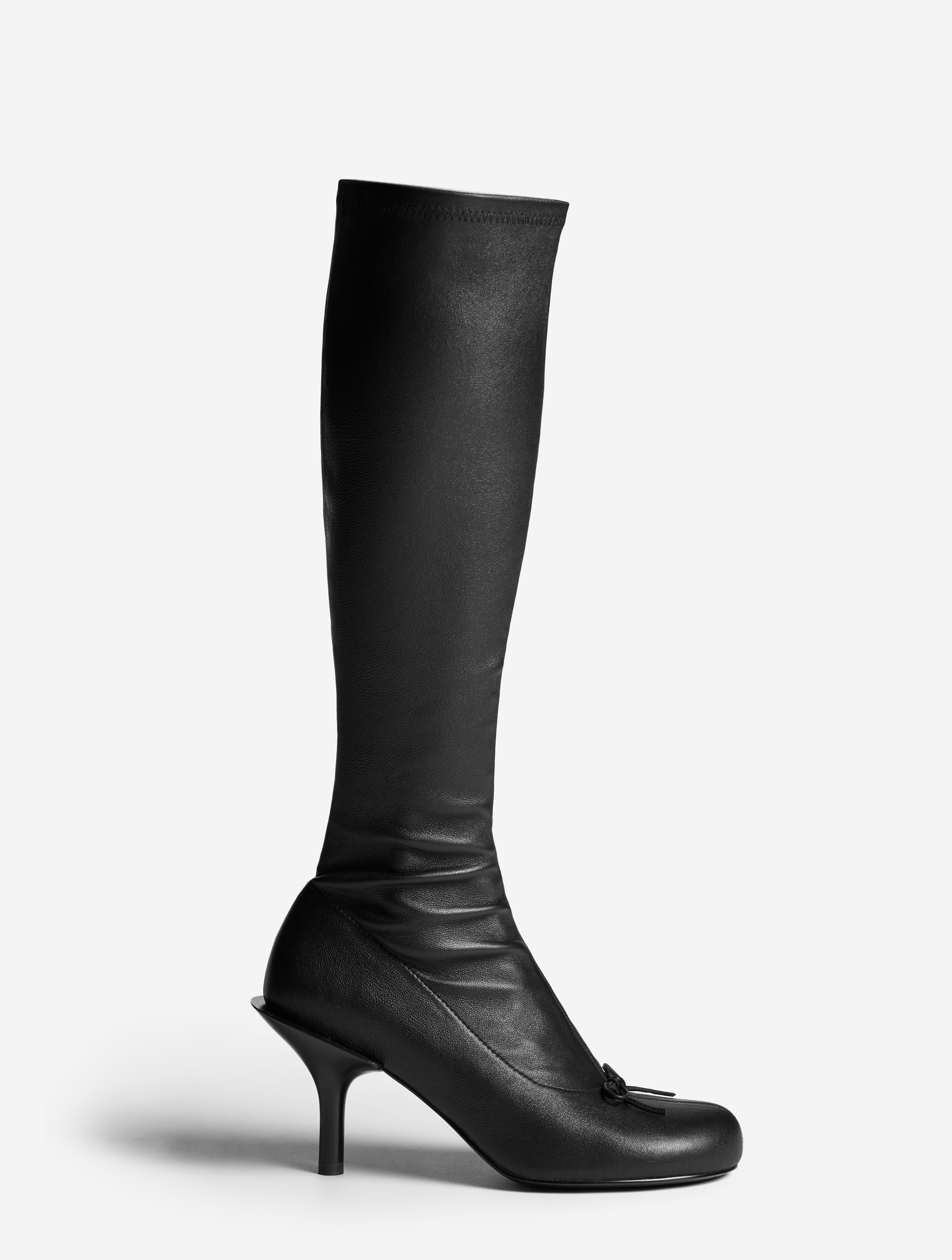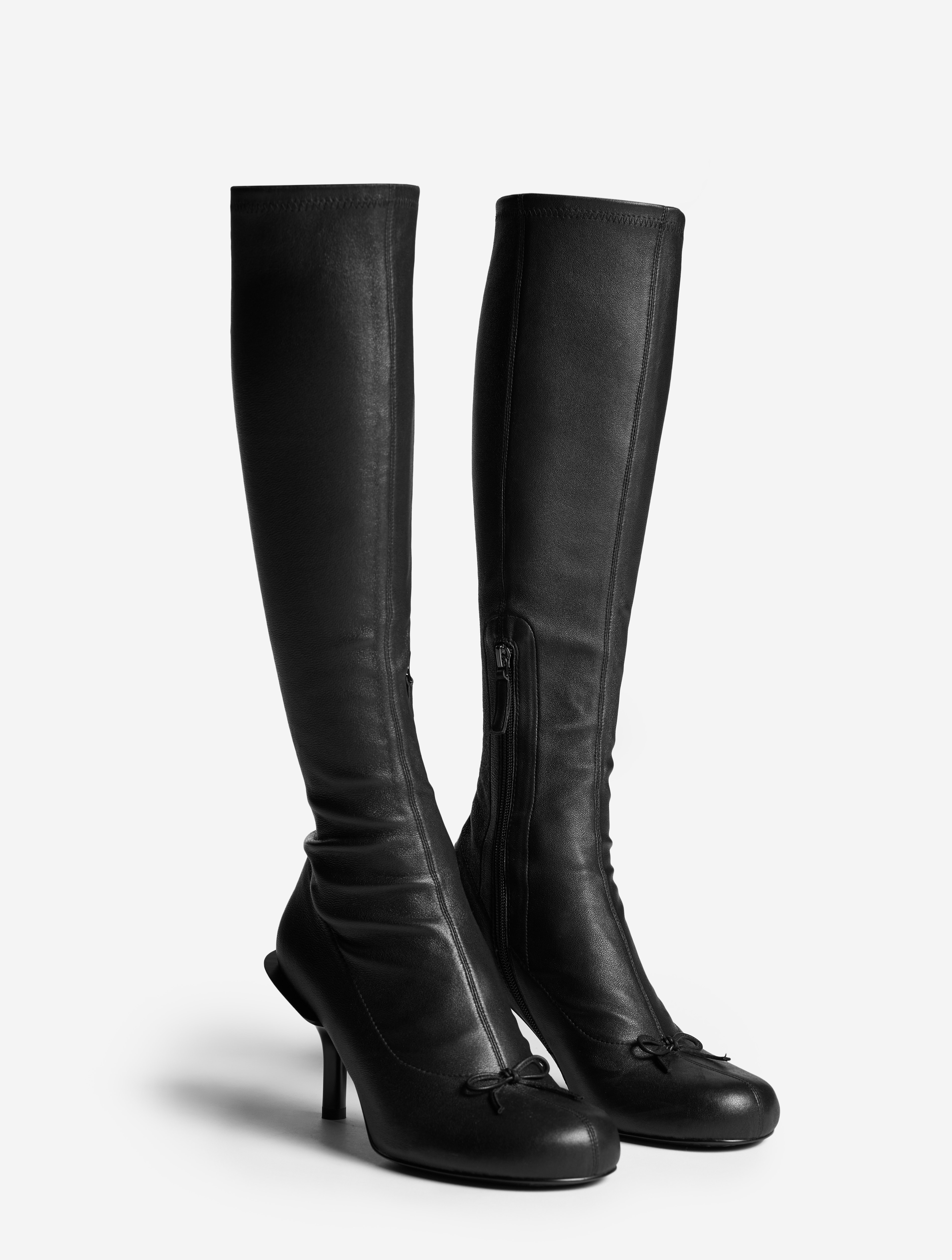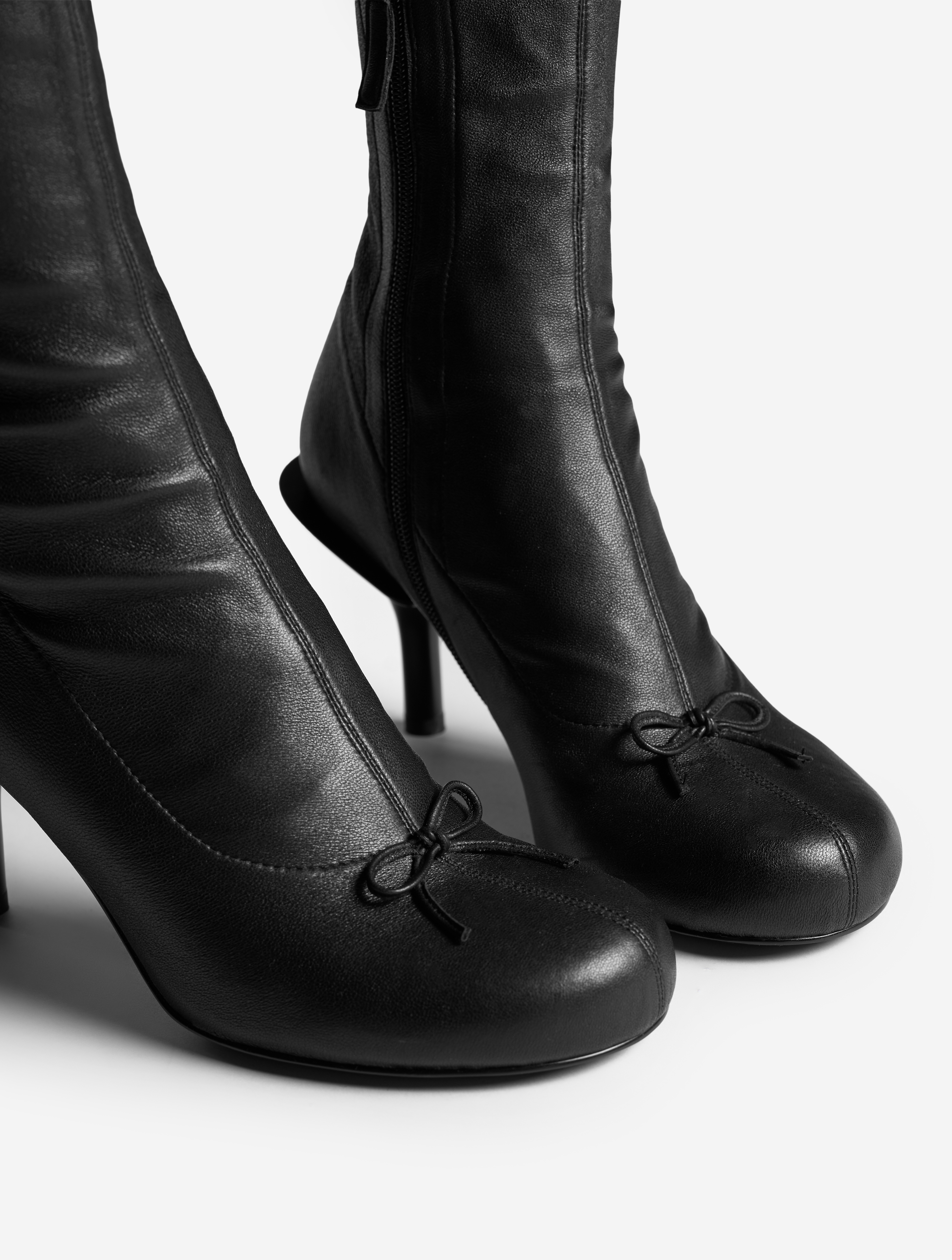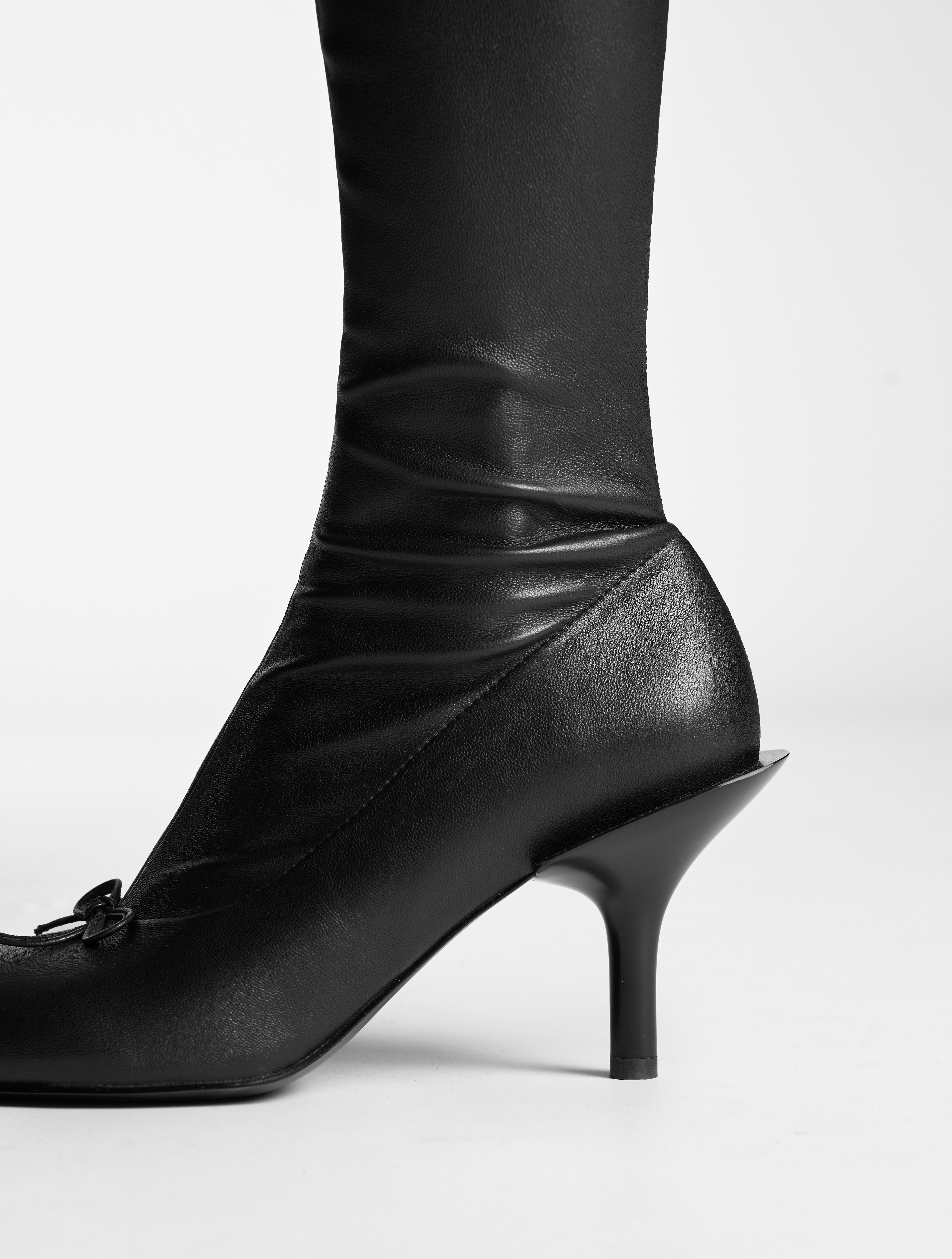 Один из любимых стайлинг-трюков Ushatava — туфли, надетые поверх чулок в тон. К десятилетию модного Дома мы решили увековечить его и создали сапоги, имитирующие этот эффект. Мягкая кожа стрейч-шевро облегает ногу и подчеркивает искусственно созданный контур туфель с круглым носом. Их украшает бантик — игривый элемент бельевой фурнитуры, который неожиданно появляется в дизайне обуви.