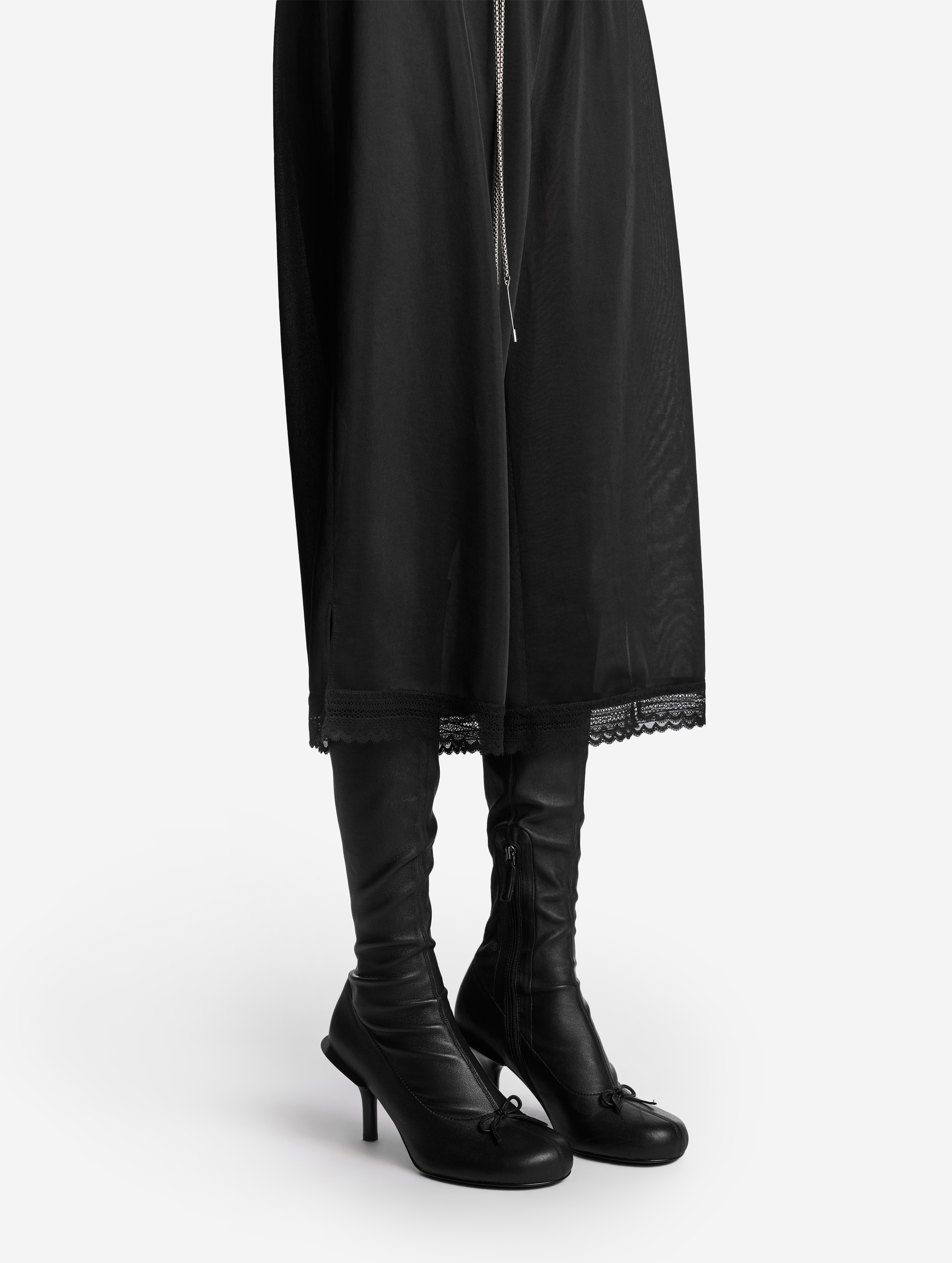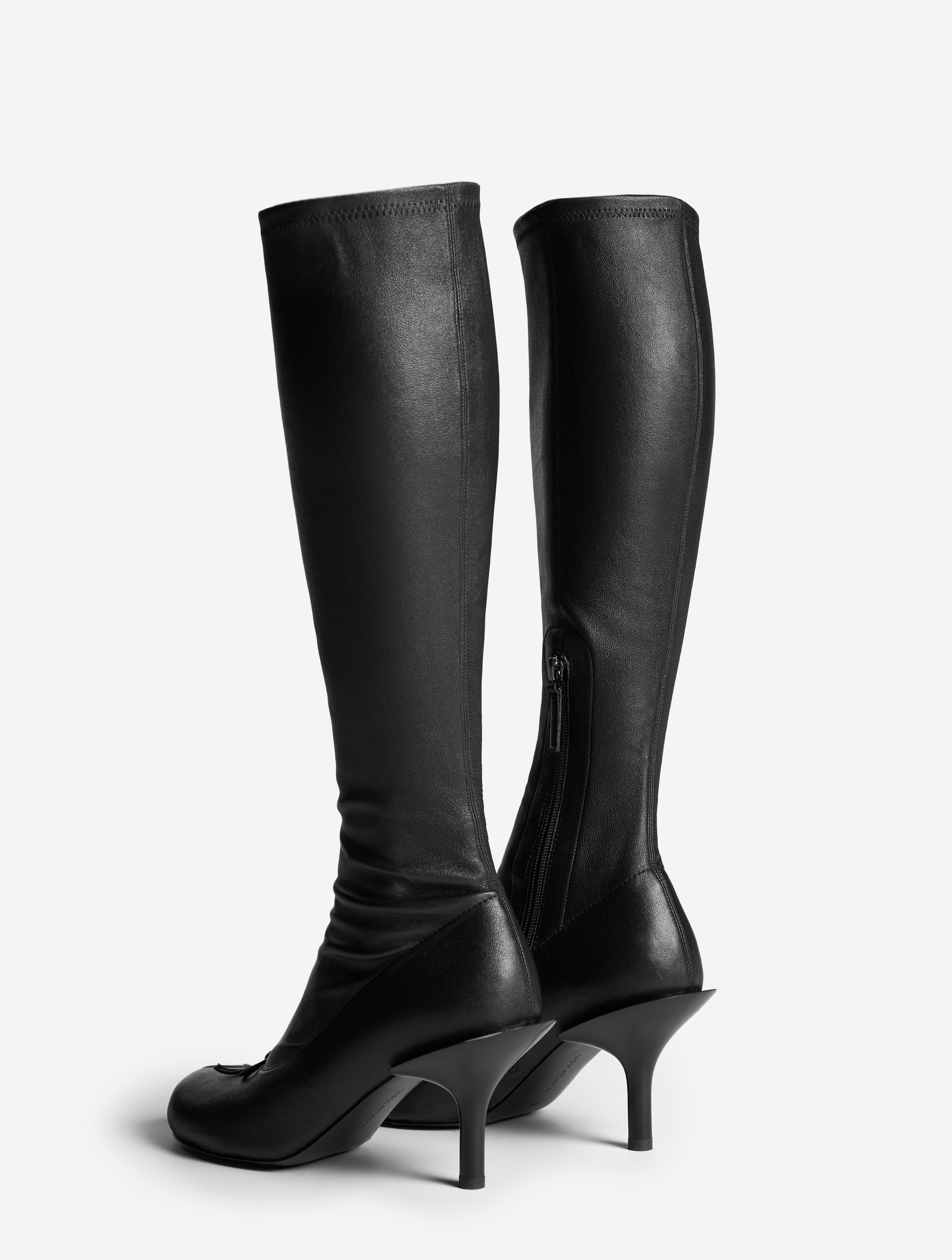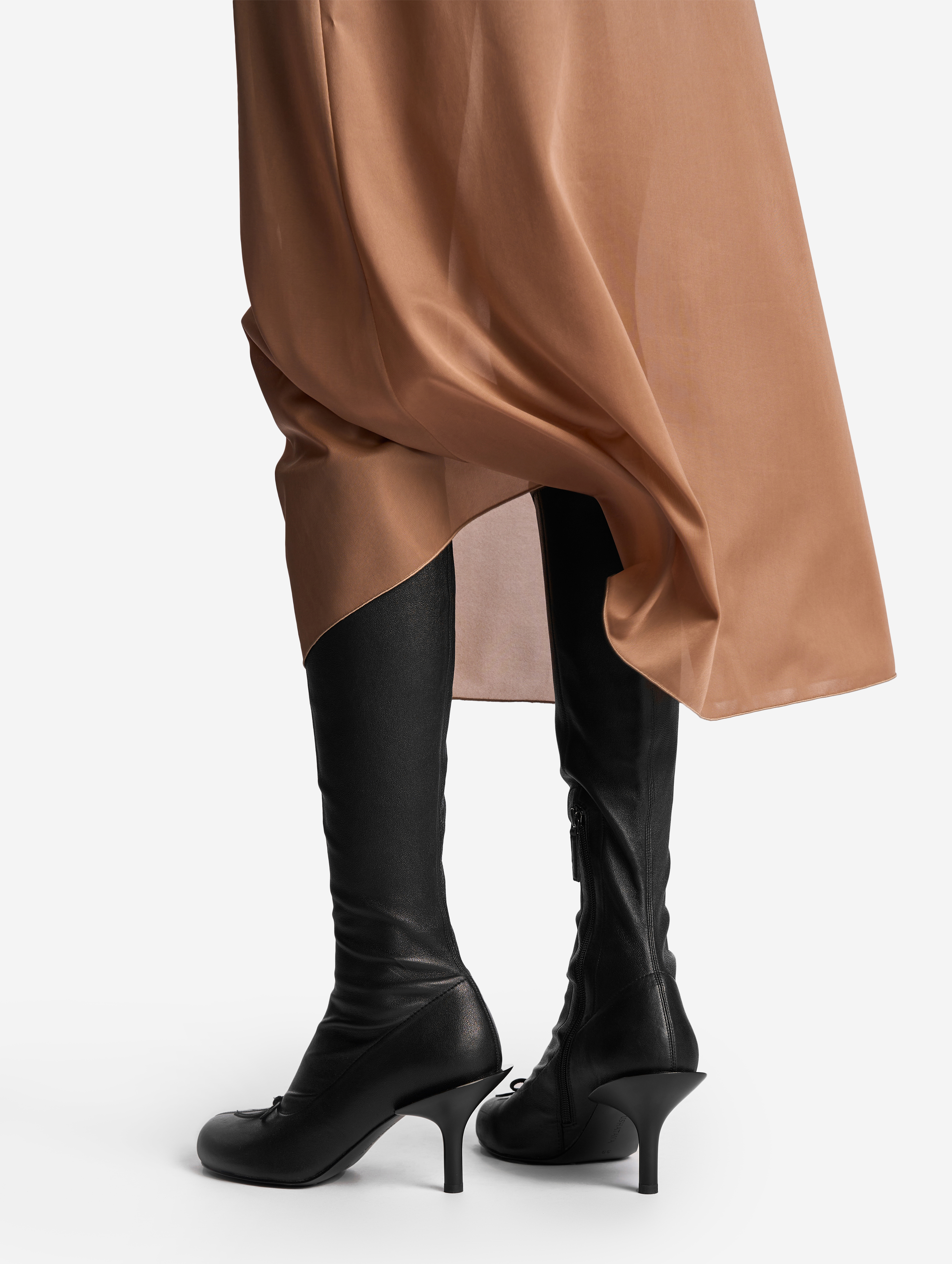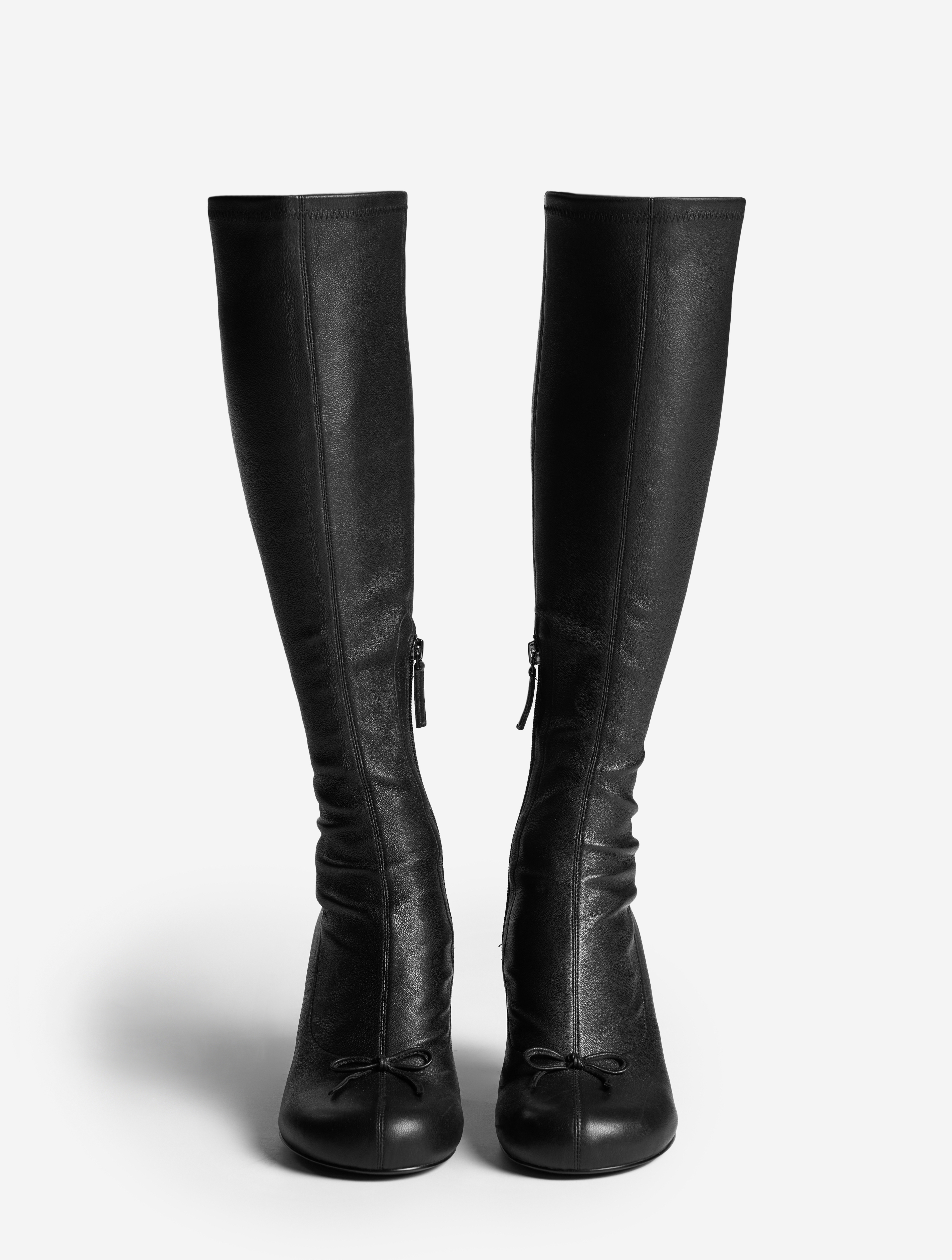 Один из любимых стайлинг-трюков Ushatava — туфли, надетые поверх чулок в тон. К десятилетию модного Дома мы решили увековечить его и создали сапоги, имитирующие этот эффект. Мягкая кожа стрейч-шевро облегает ногу и подчеркивает искусственно созданный контур туфель с круглым носом. Их украшает бантик — игривый элемент бельевой фурнитуры, который неожиданно появляется в дизайне обуви.