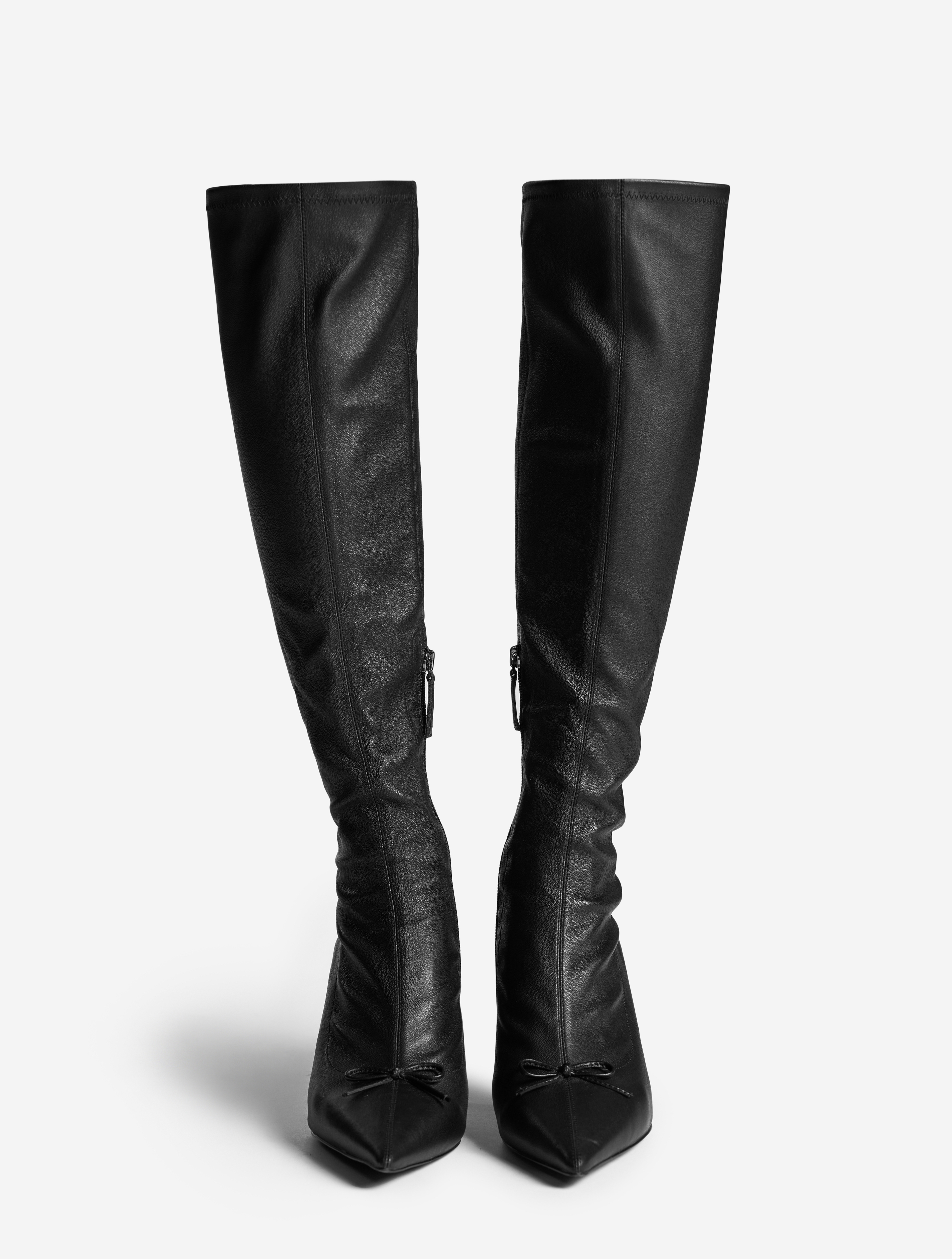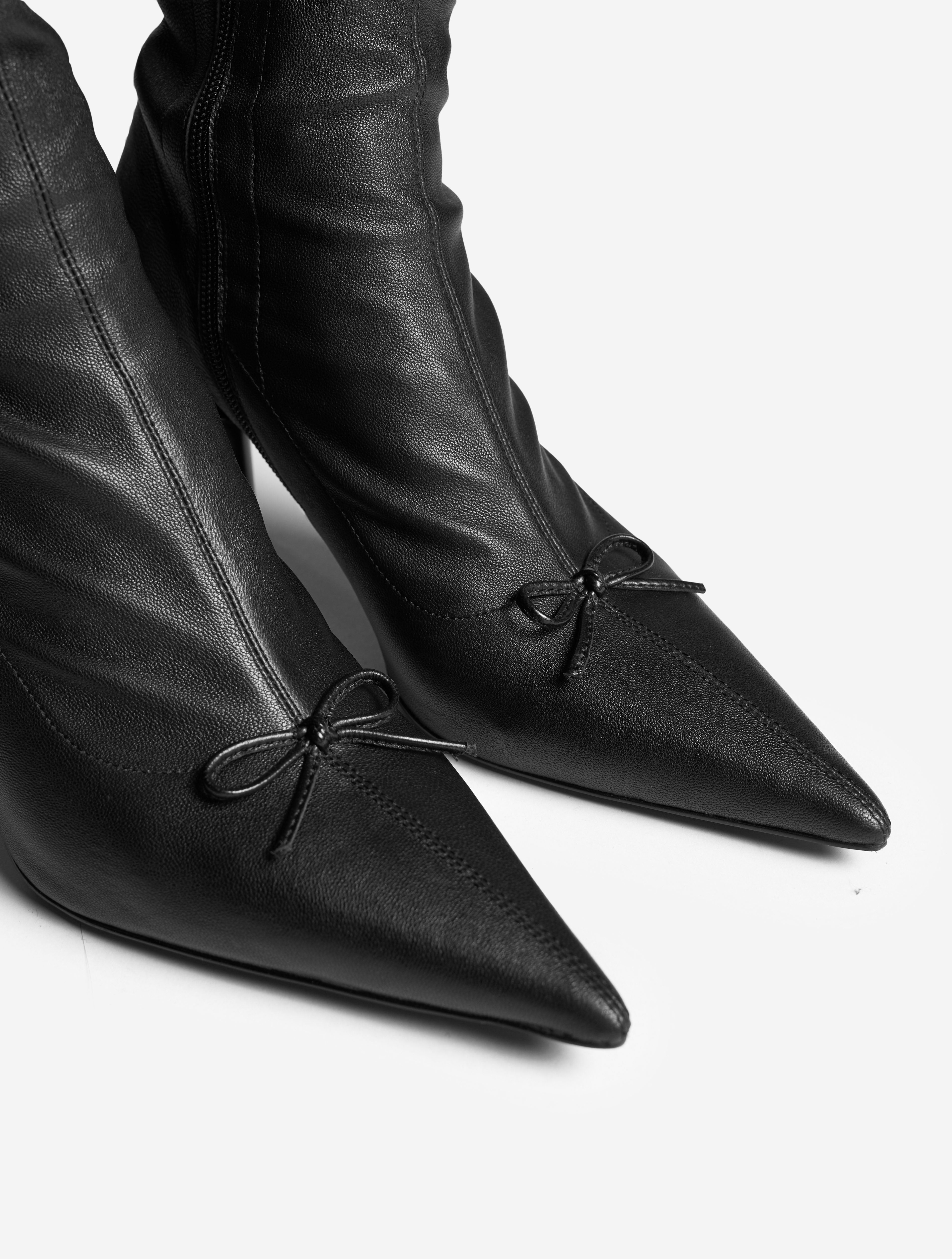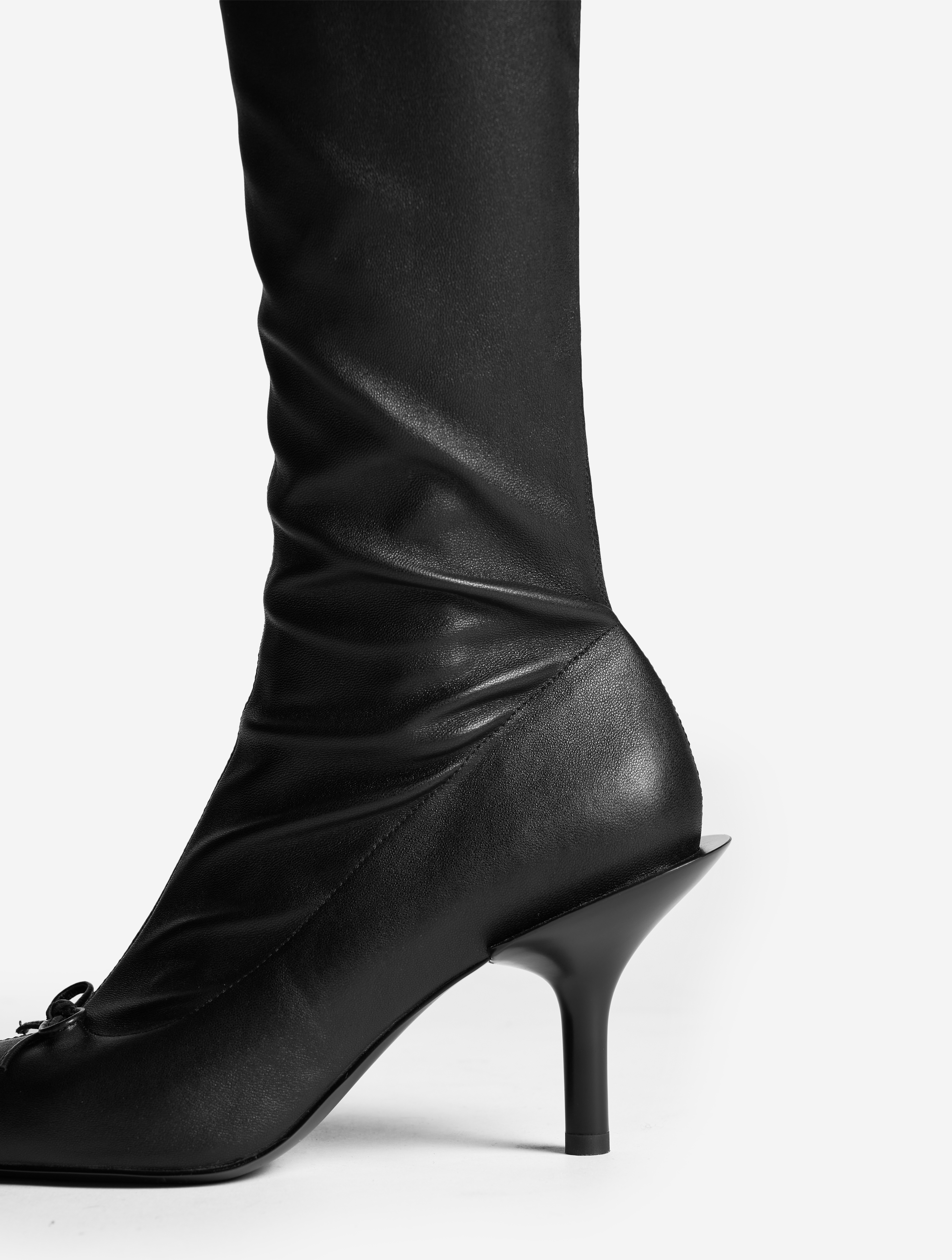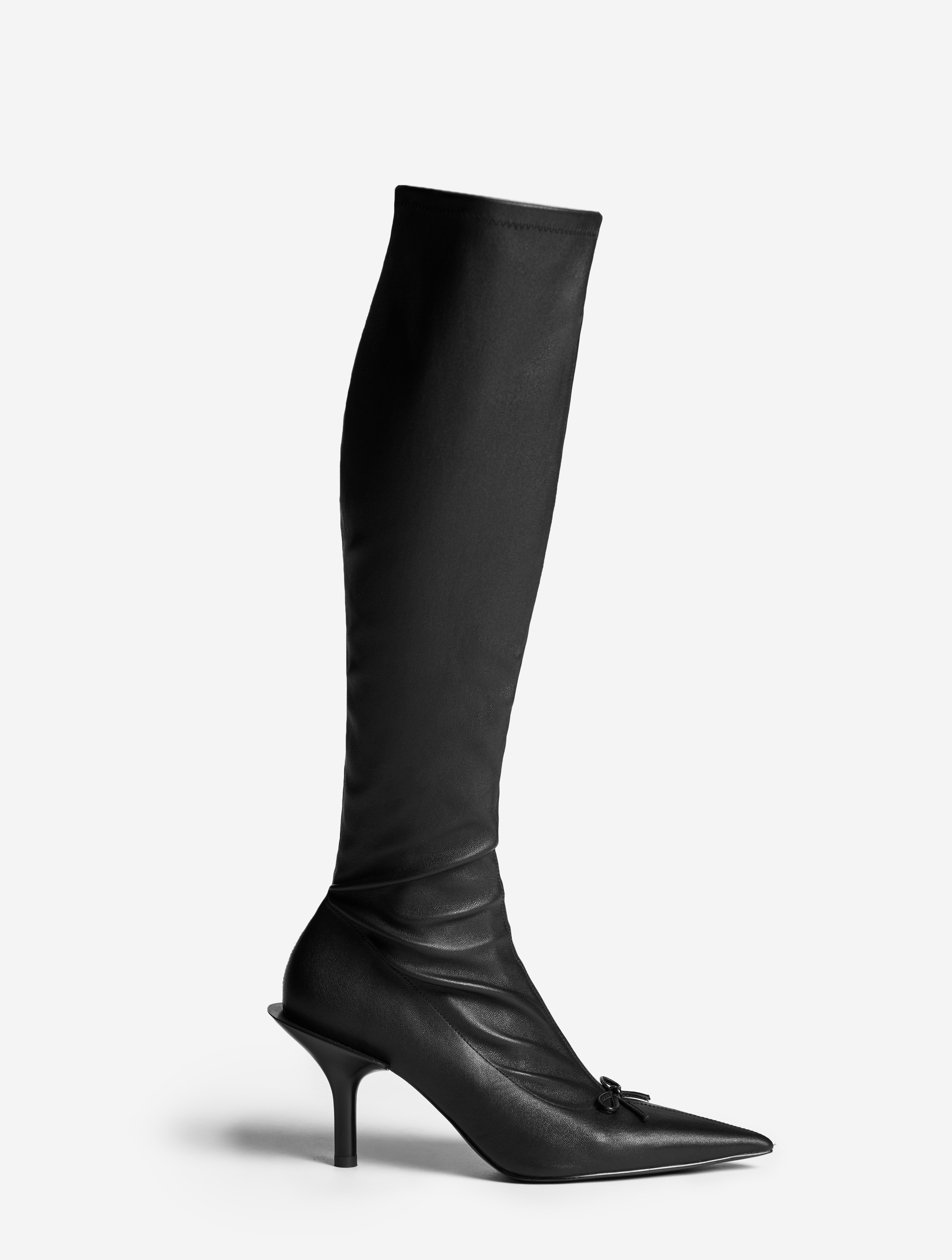 Один из любимых стайлинг-трюков Ushatava — туфли, надетые поверх чулок в тон. К десятилетию модного Дома мы решили увековечить его и создали сапоги, имитирующие этот эффект. Мягкая кожа стрейч-шевро облегает ногу и подчеркивает искусственный контур туфель с острым носом. Их украшает бантик — игривый элемент бельевой фурнитуры, который неожиданно появляется в дизайне обуви.
