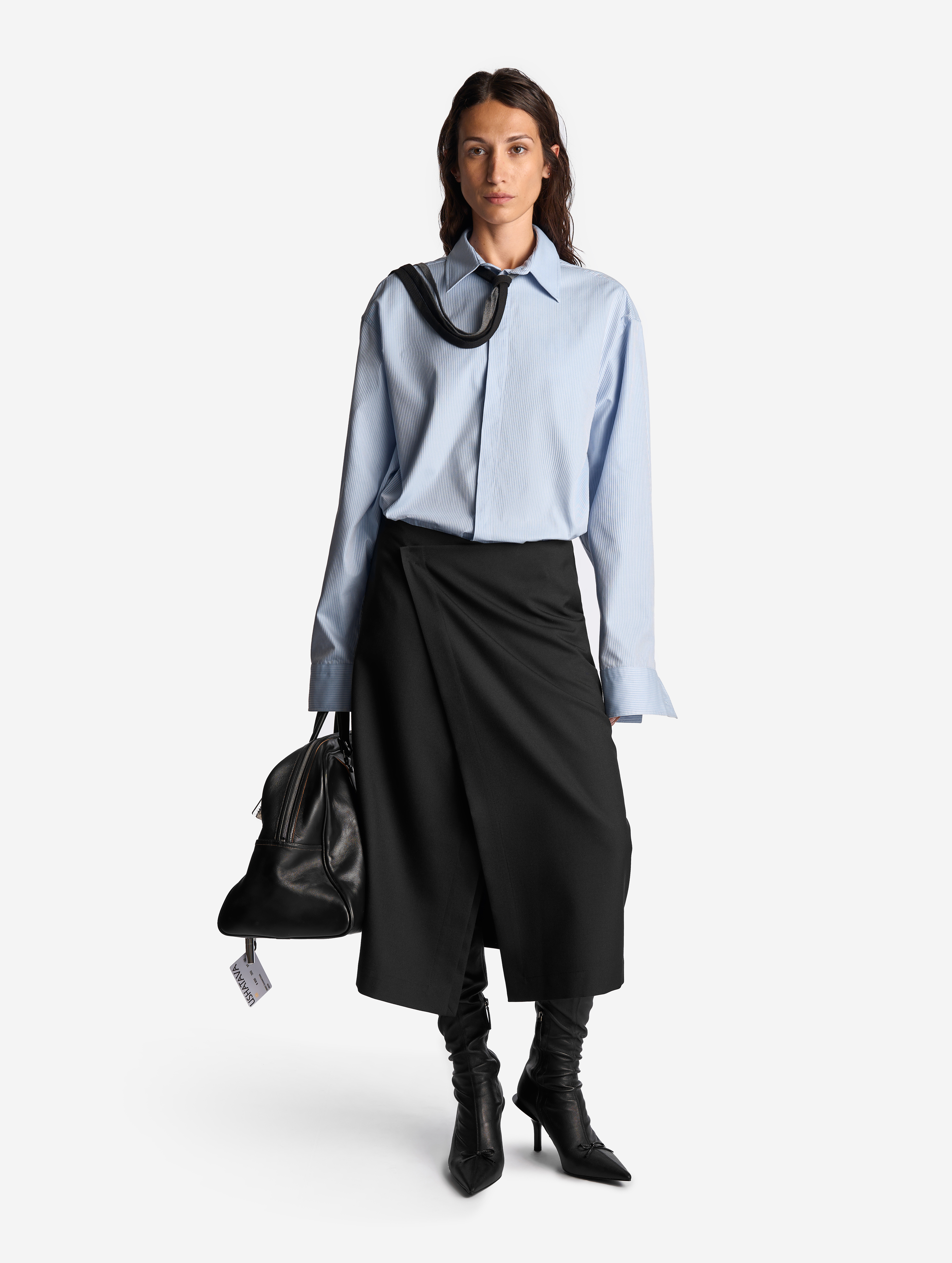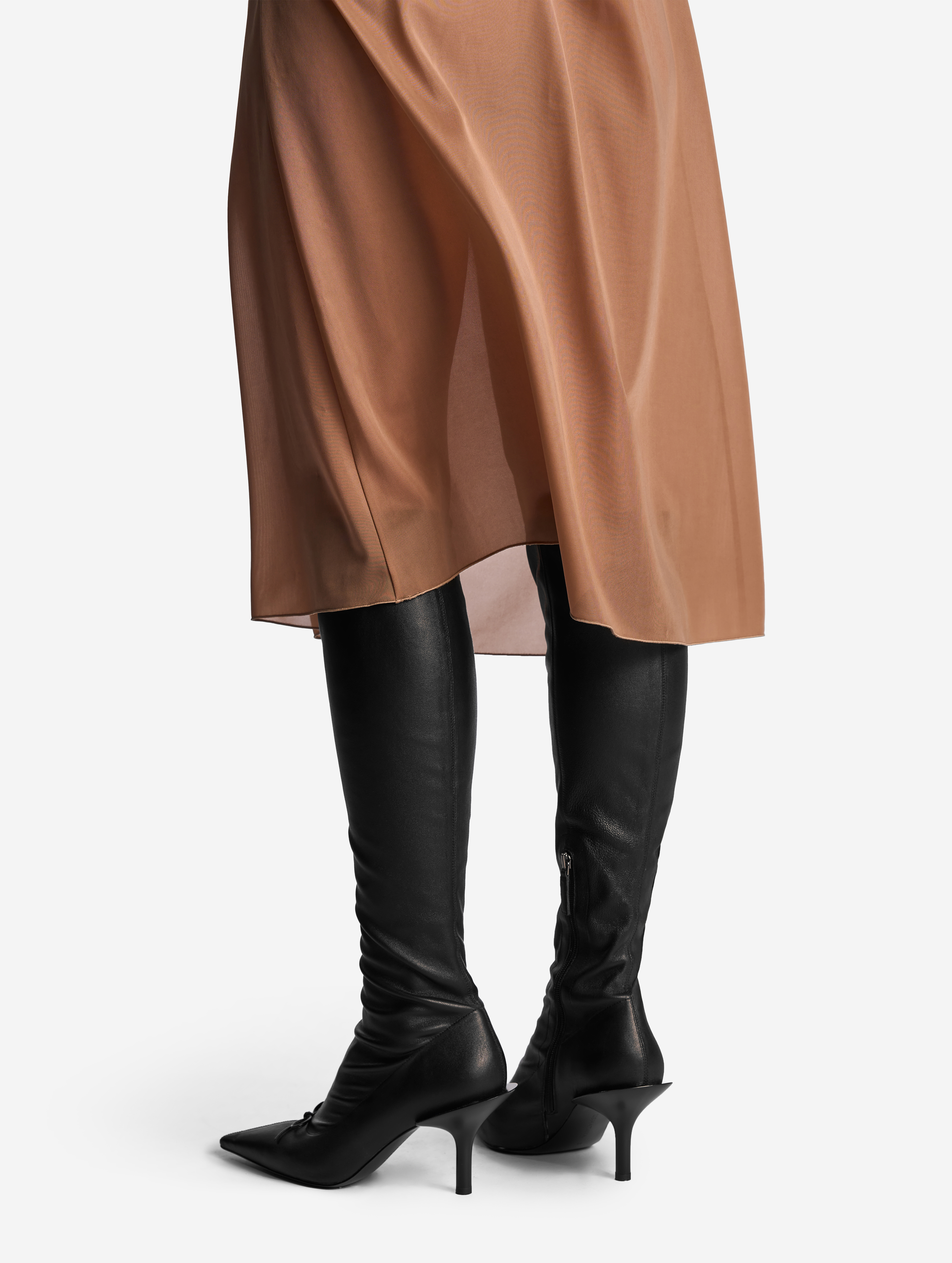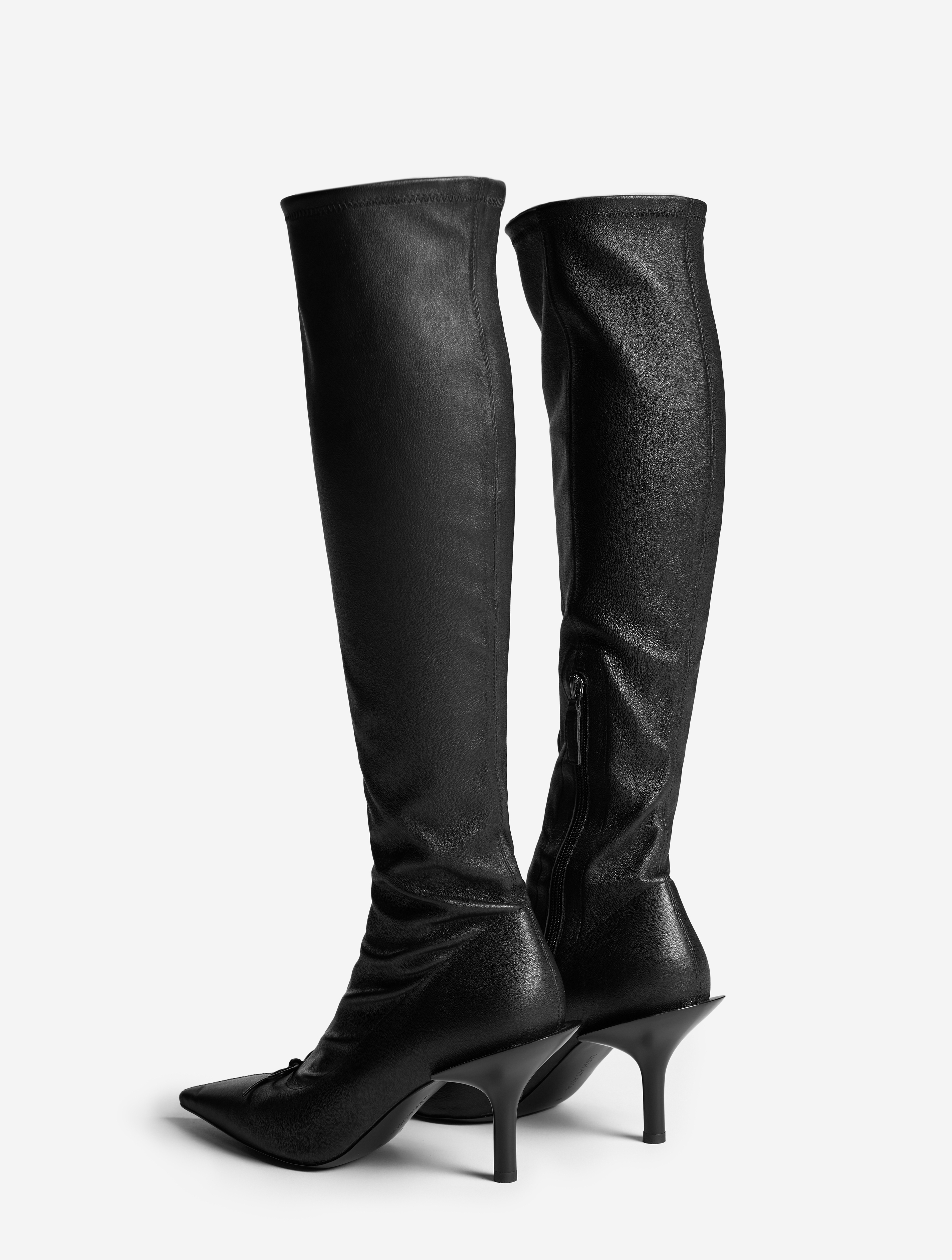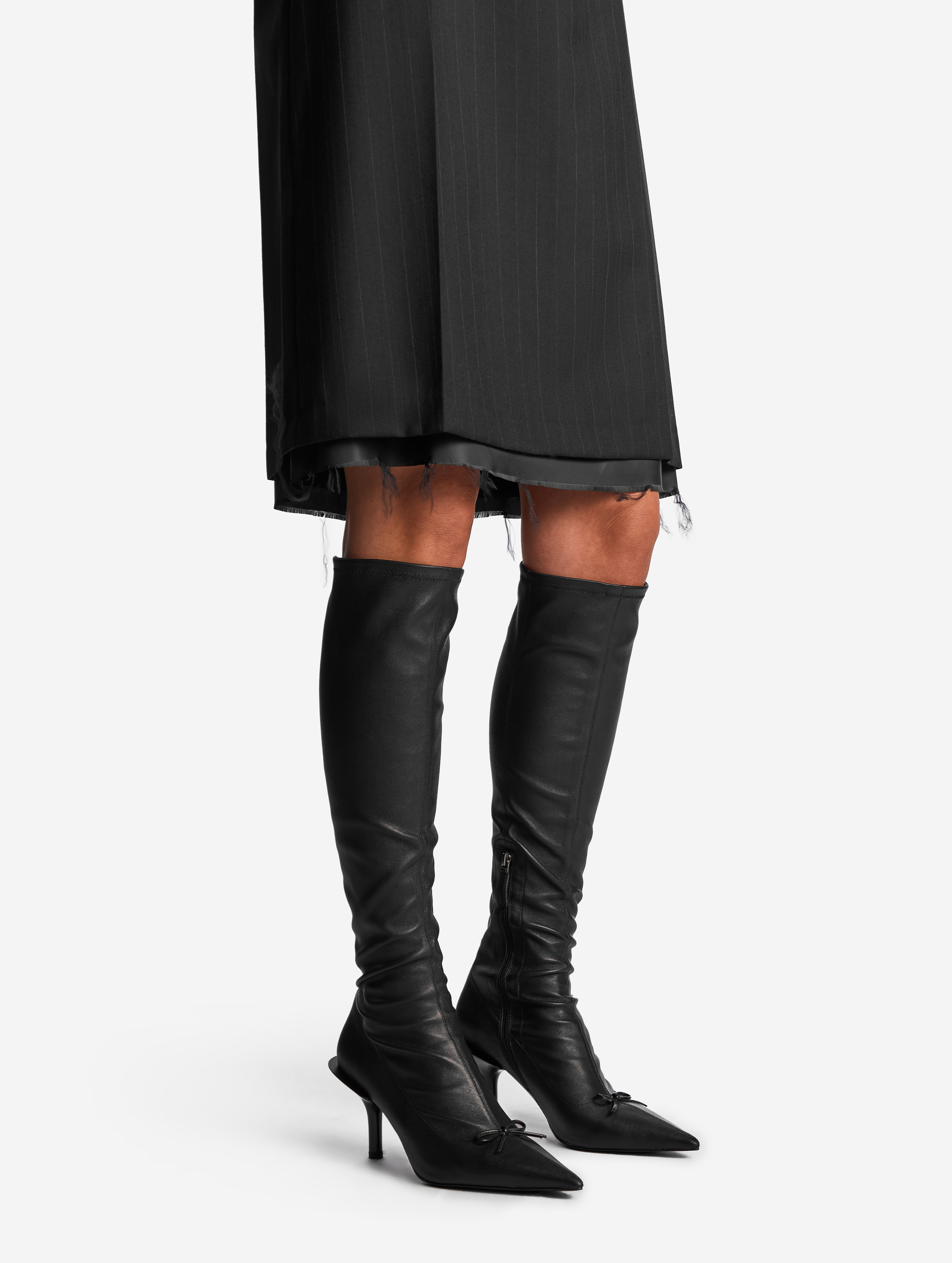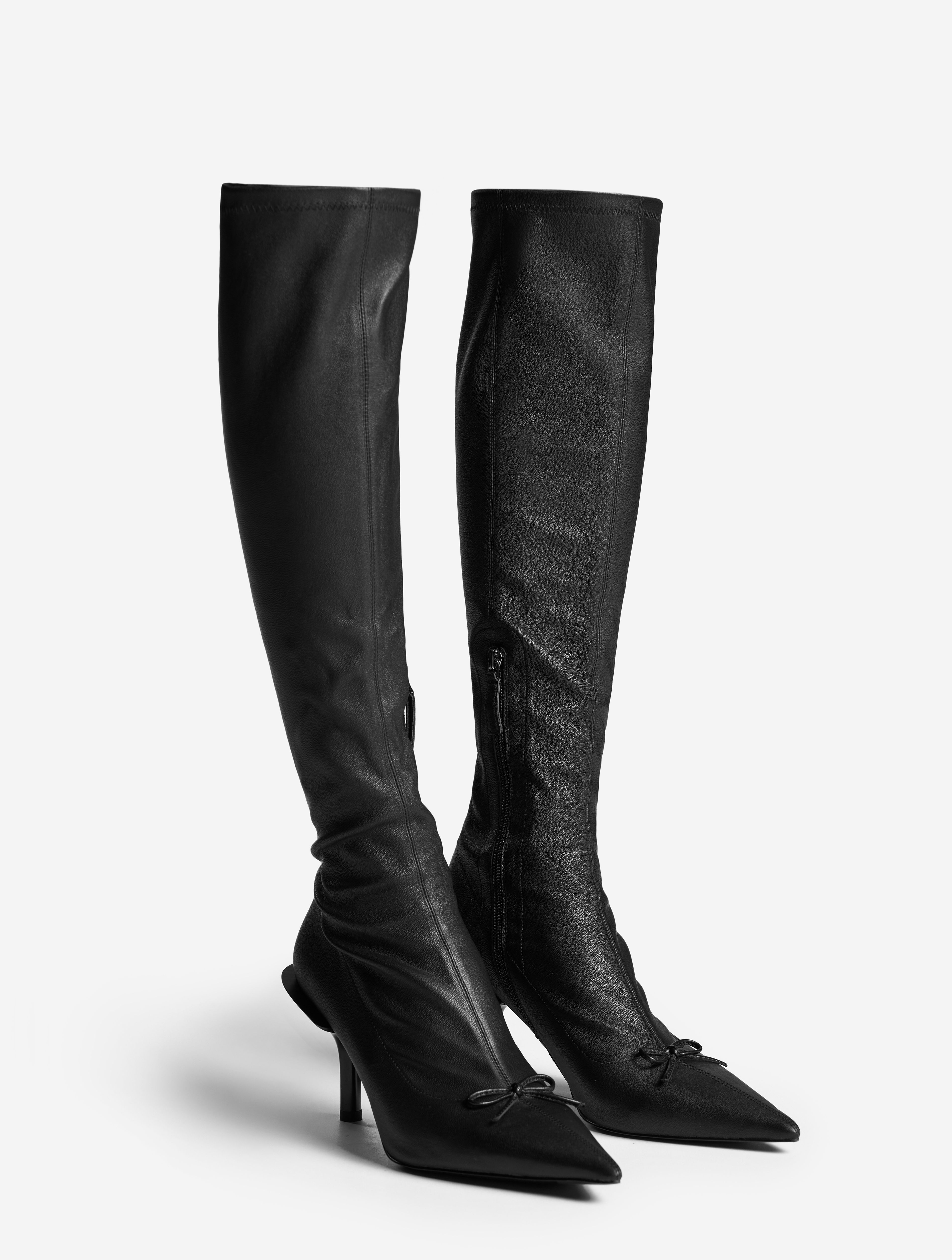Один из любимых стайлинг-трюков Ushatava — туфли, надетые поверх чулок в тон. К десятилетию модного Дома мы решили увековечить его и создали сапоги, имитирующие этот эффект. Мягкая кожа стрейч-шевро облегает ногу и подчеркивает искусственный контур туфель с острым носом. Их украшает бантик — игривый элемент бельевой фурнитуры, который неожиданно появляется в дизайне обуви.