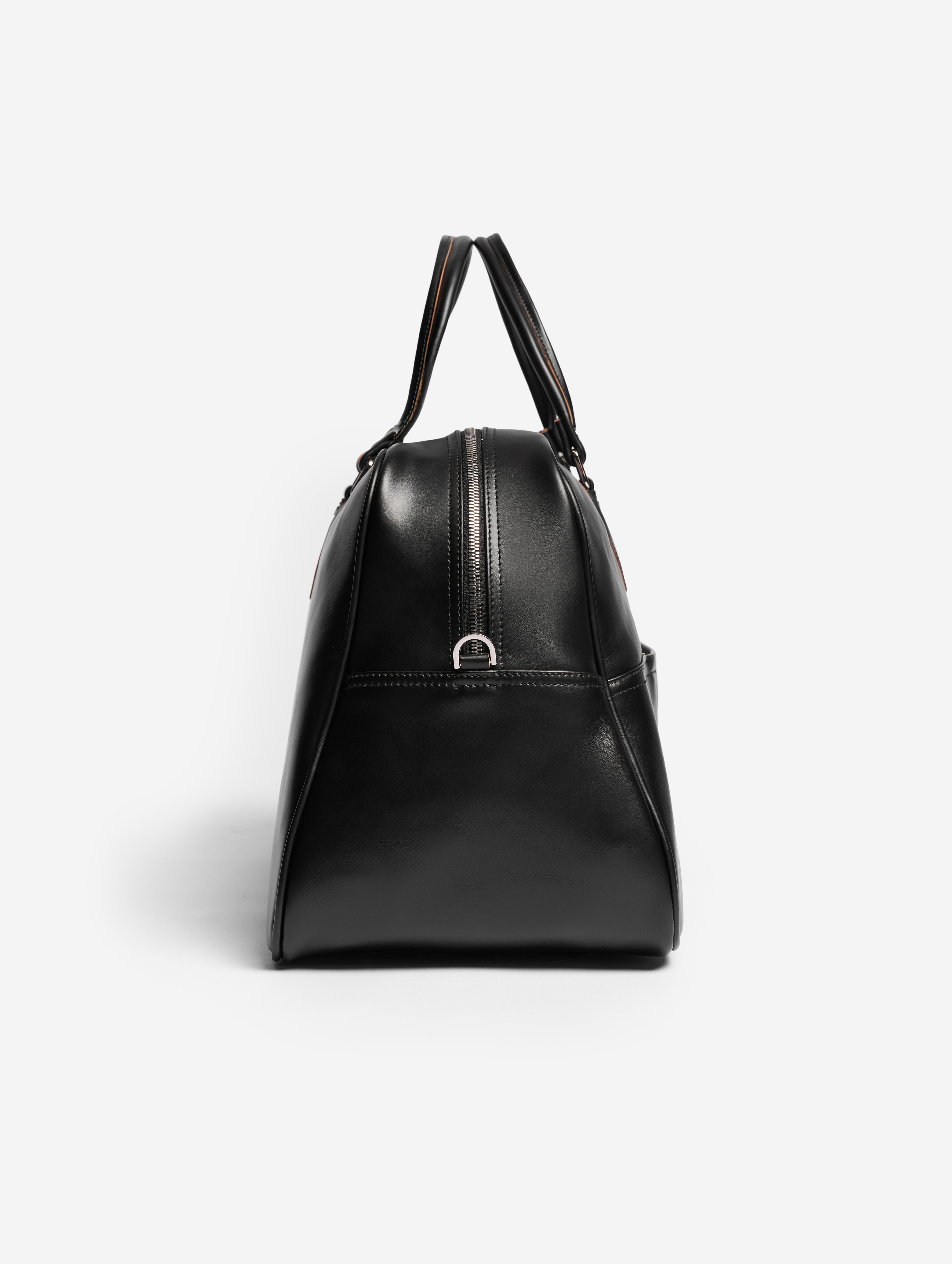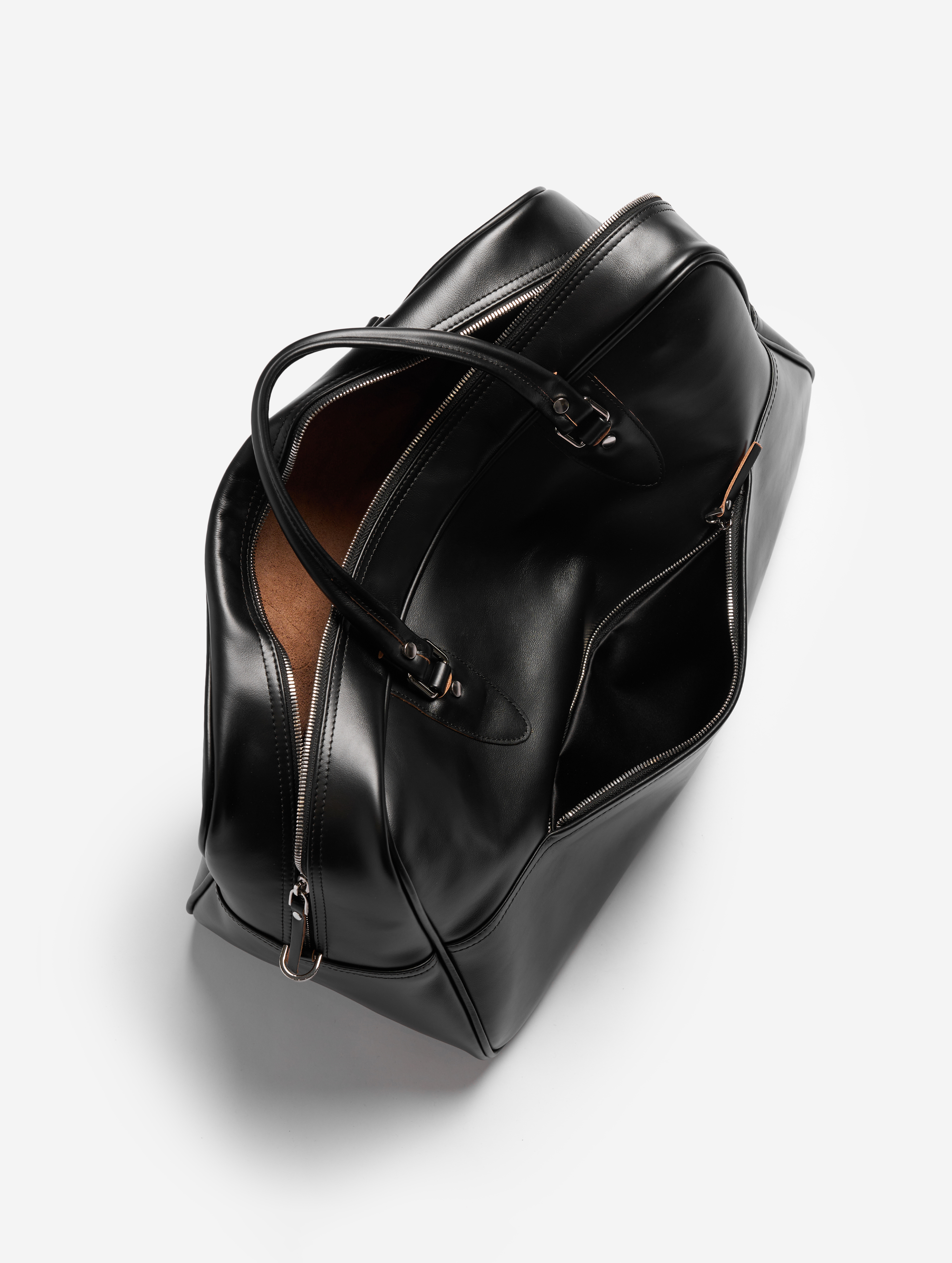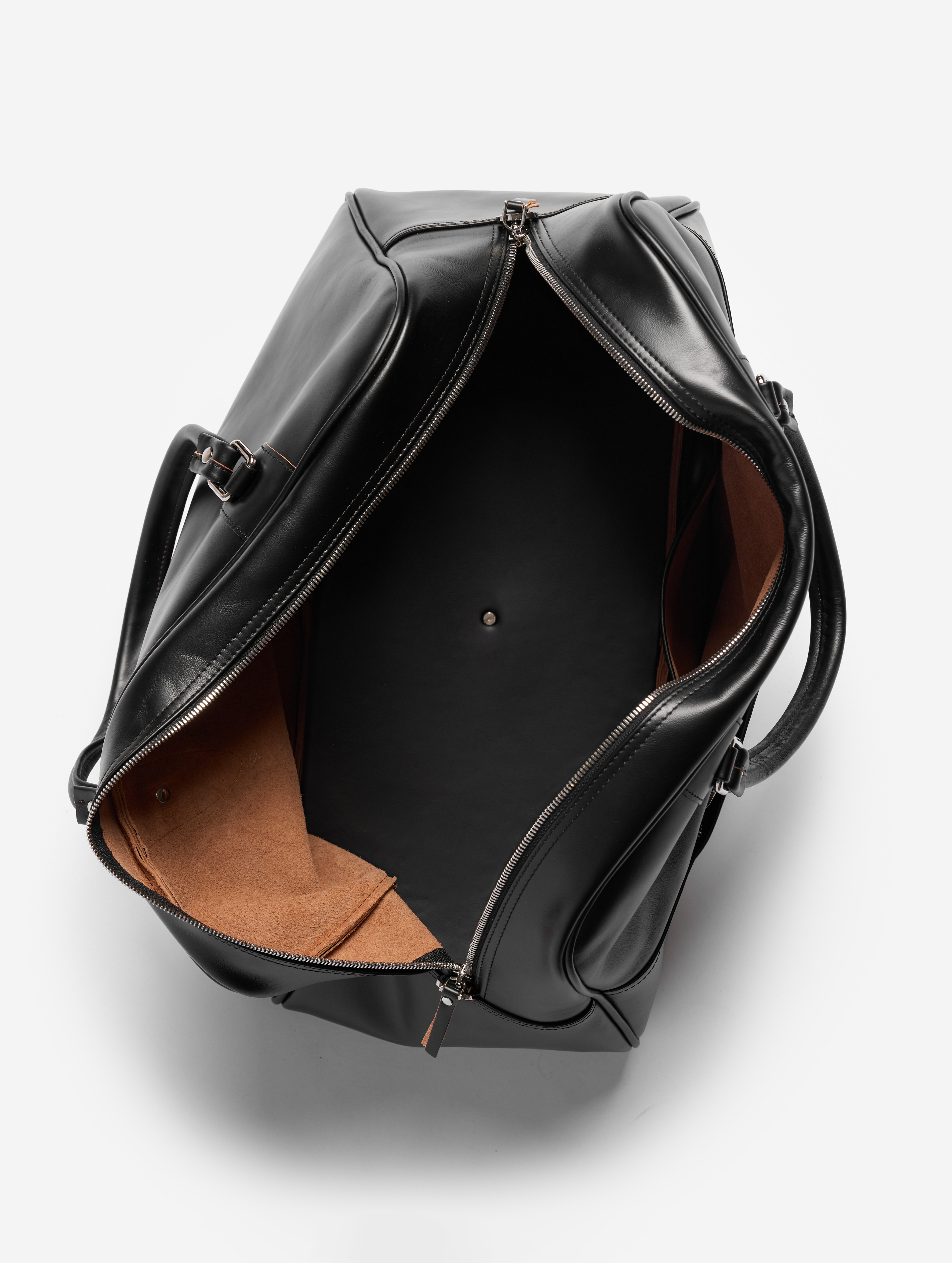 Сумка выполнена из натуральной кожи черного цвета с легким блеском. Ее изнаночная сторона — из мягкой и гладкой рыжей замши. Все швы оставлены без обработки и подчеркивают естественную текстуру материала.