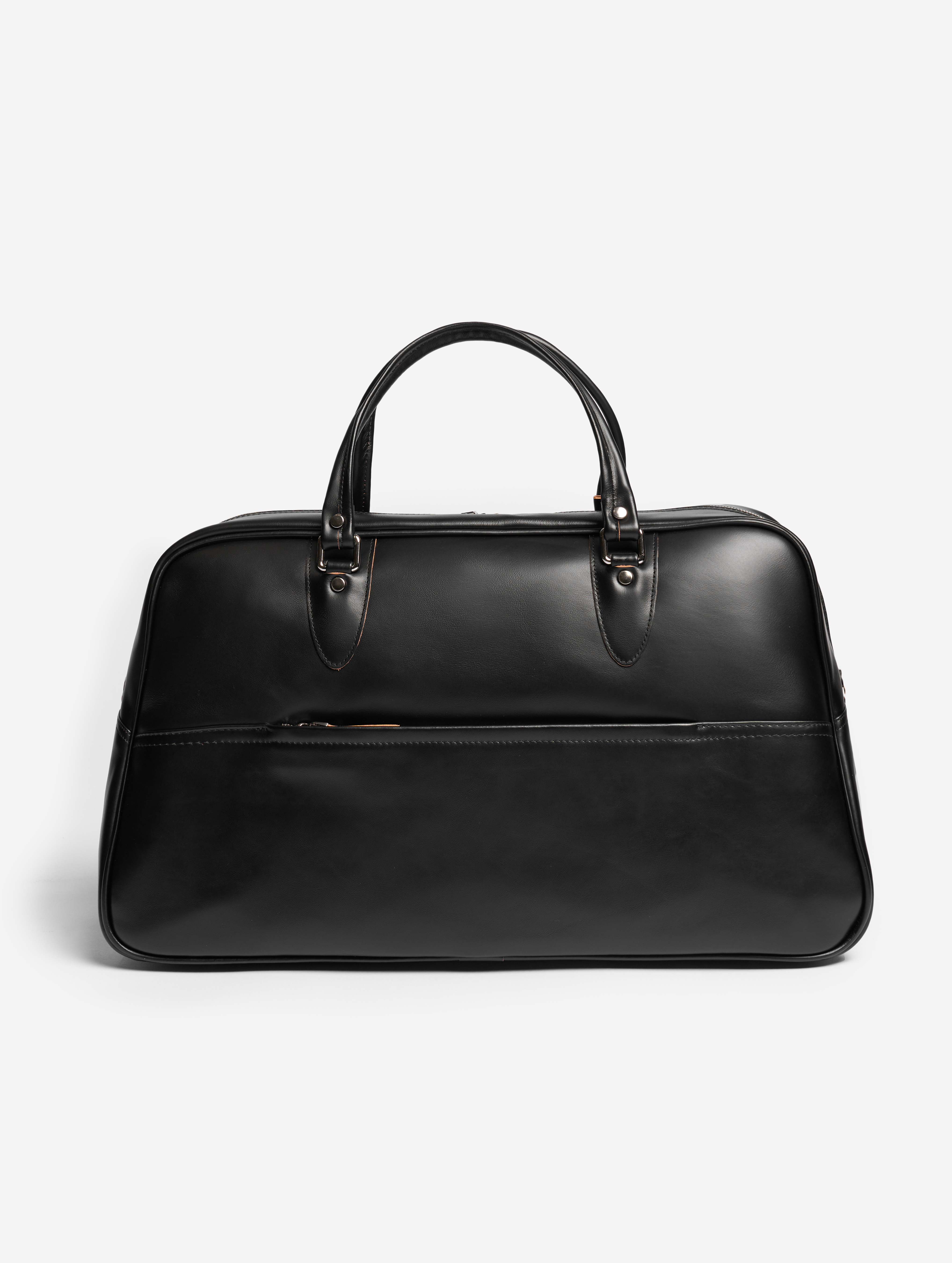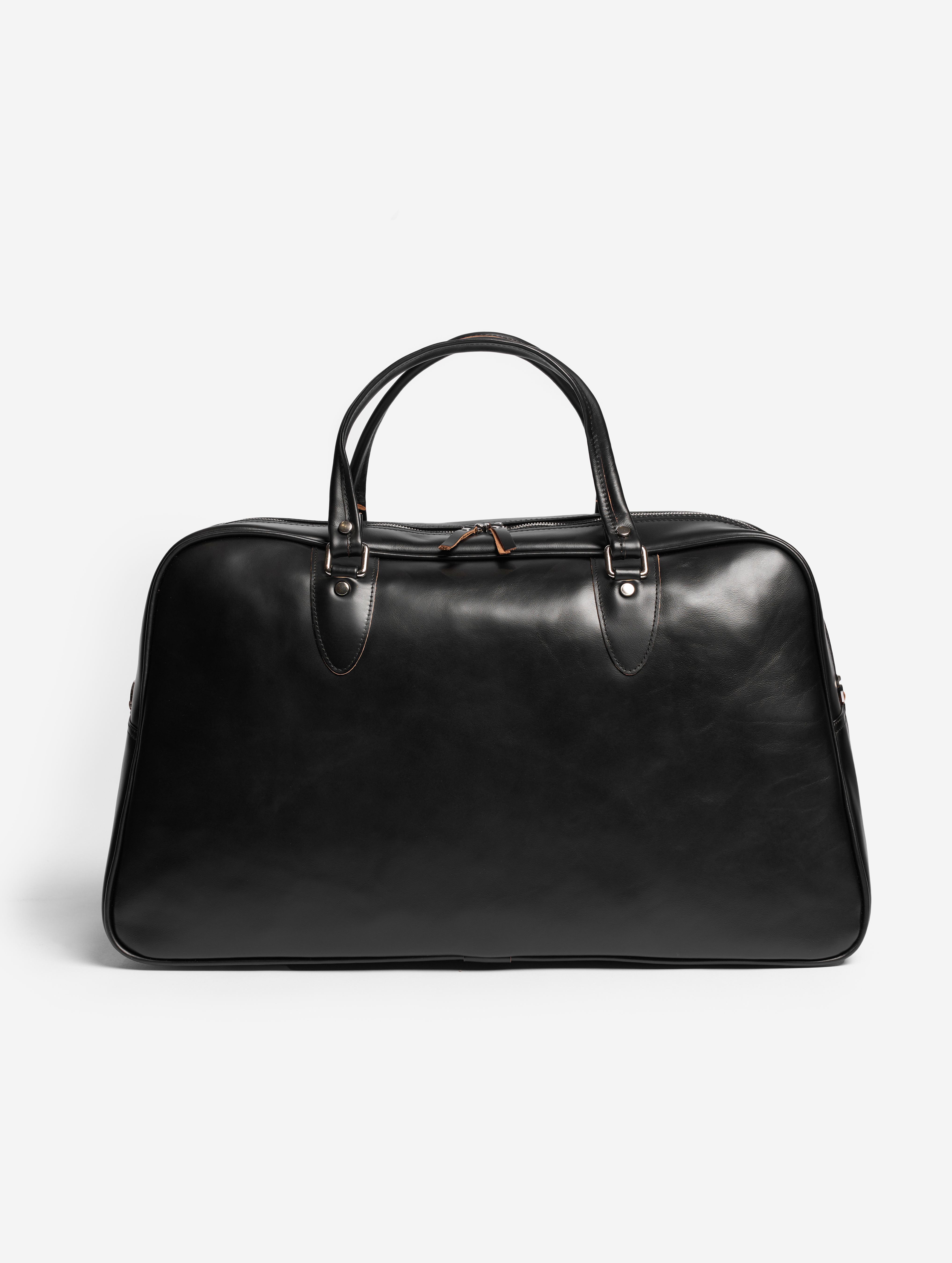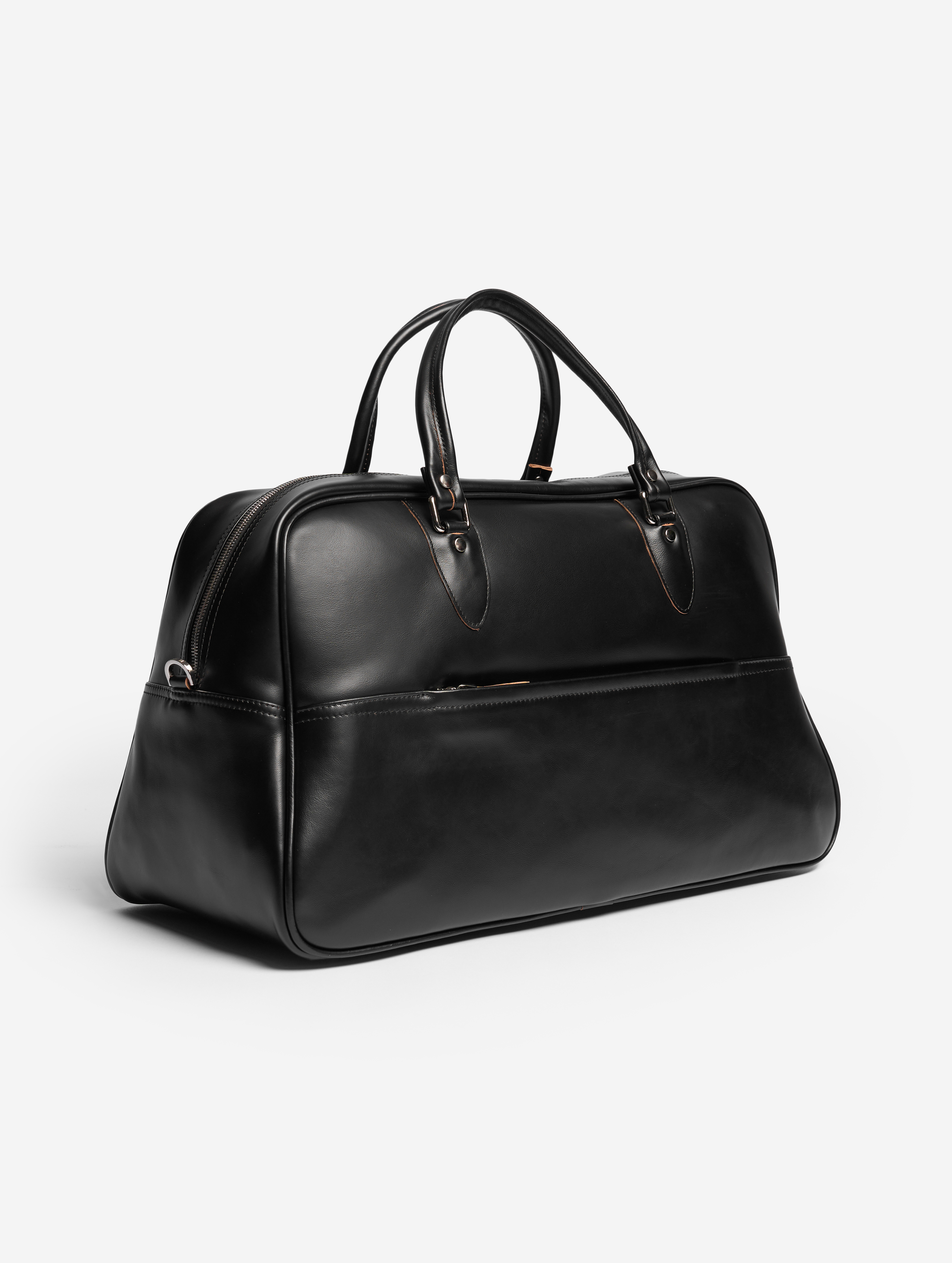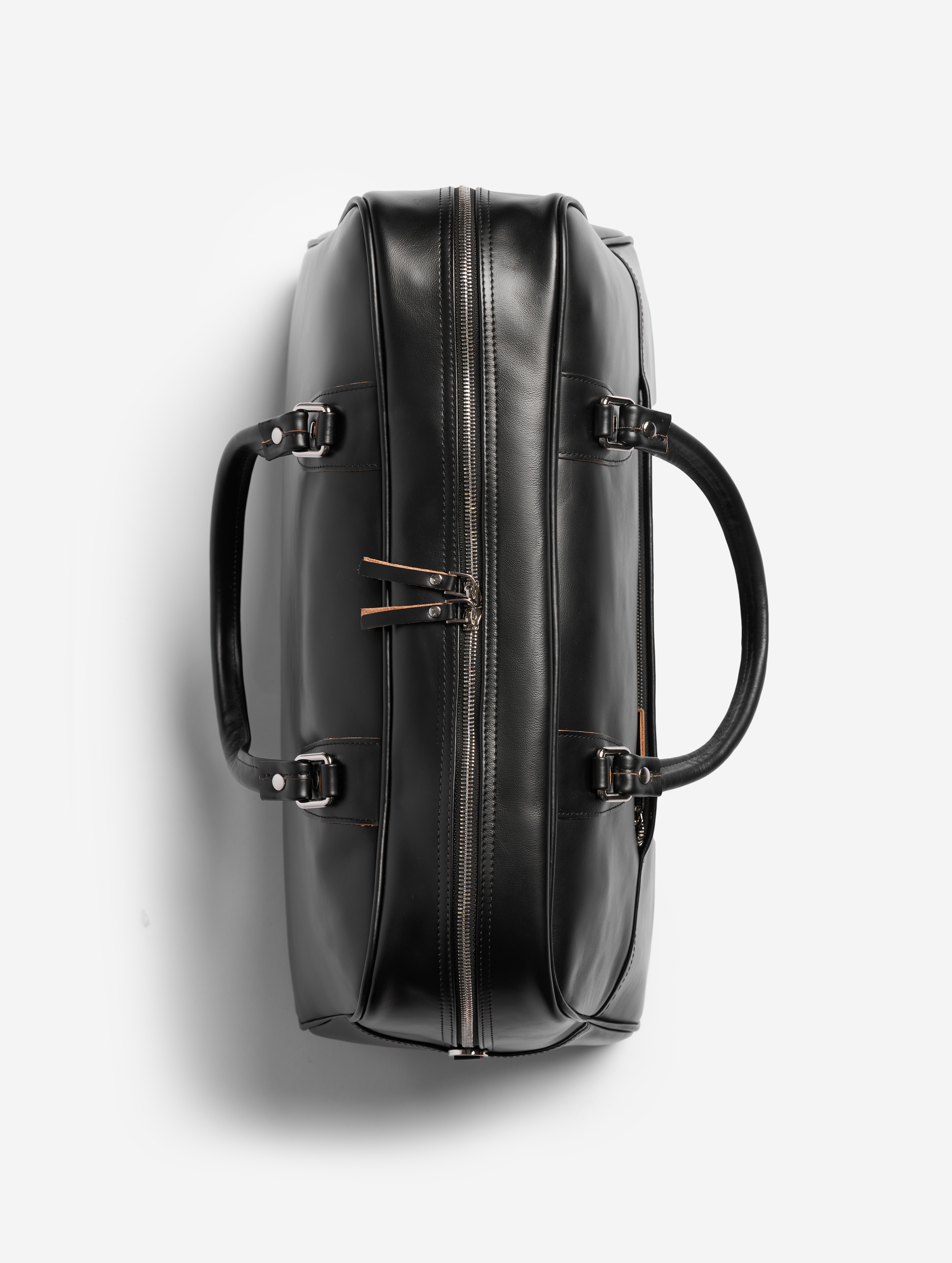 Сумка выполнена из натуральной кожи черного цвета с легким блеском. Ее изнаночная сторона — из мягкой и гладкой рыжей замши. Все швы оставлены без обработки и подчеркивают естественную текстуру материала.
