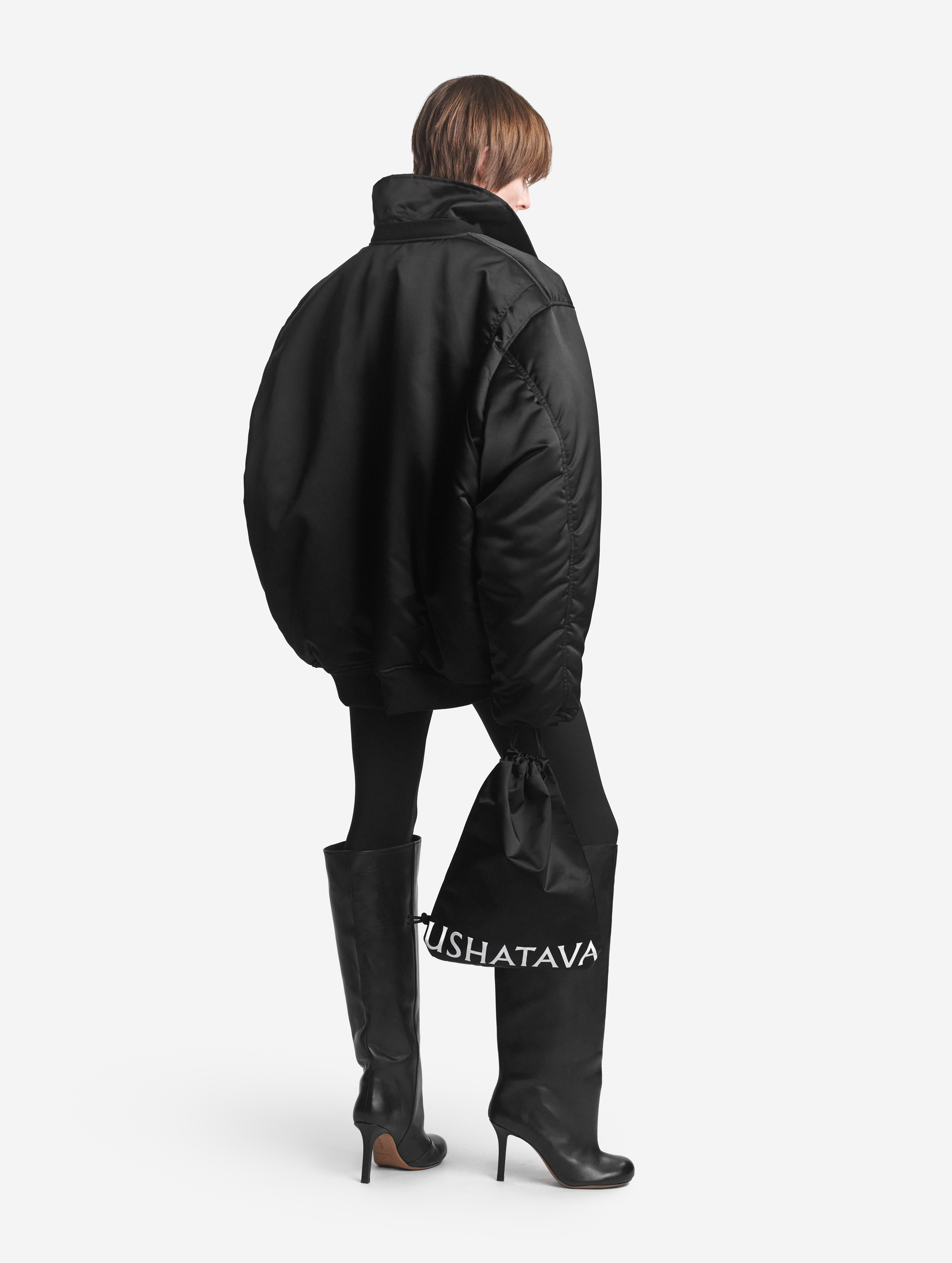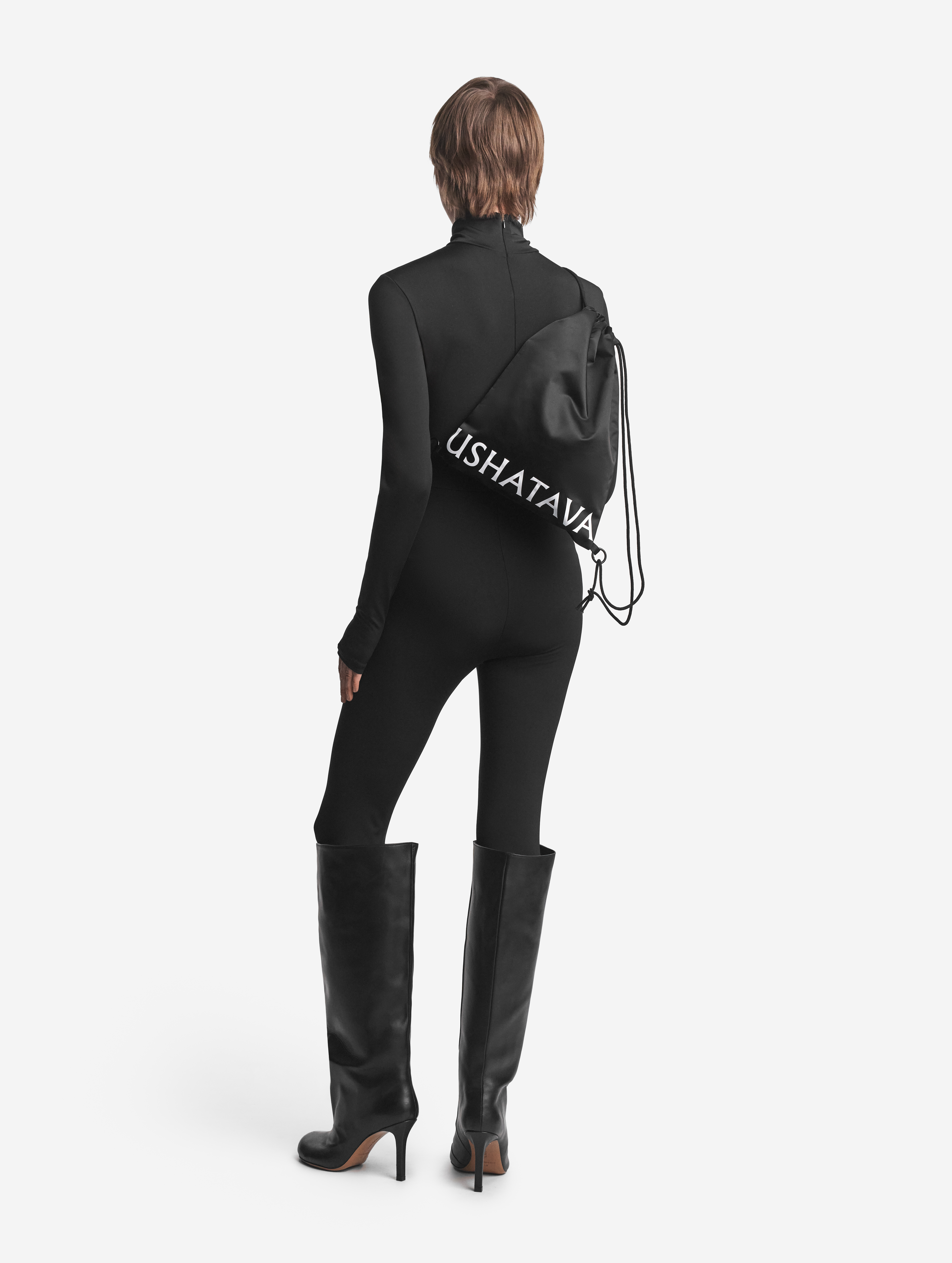 Эта сумка создана для тех, кто проводит праздник на каблуках, а путь к нему — в зимней обуви. Мешок из плащевки, вдохновленный пакетом для сменки, вмещает не только пару туфель, но и необходимые мелочи. У сумки простая конструкция: через металлические кольца протянуты регулирующиеся шнурки, которые позволяют носить это изделие как сумку на одно плечо или использовать в качестве рюкзака-торбы. Поверхность предмета украшает принт с названием модного Дома.