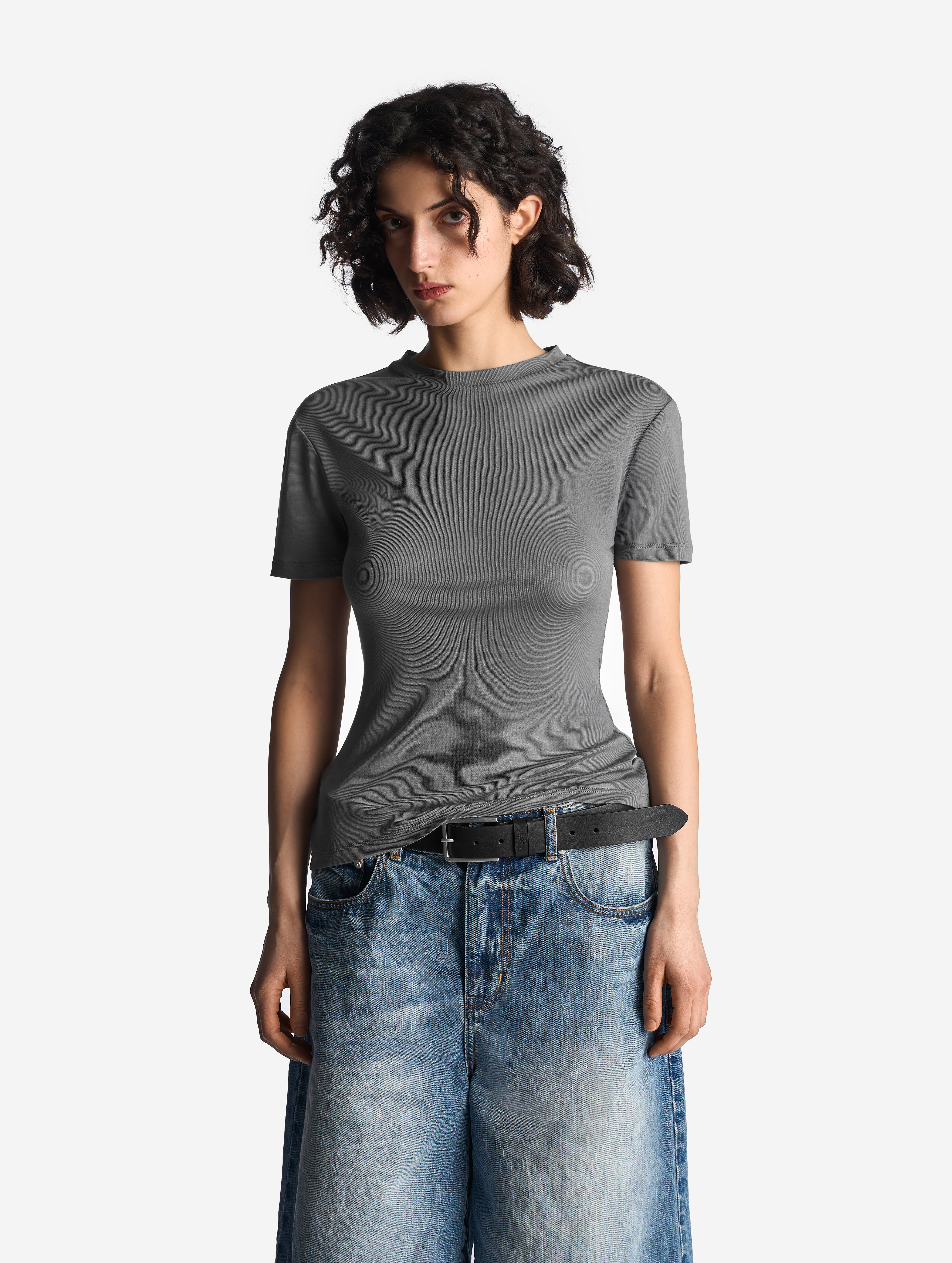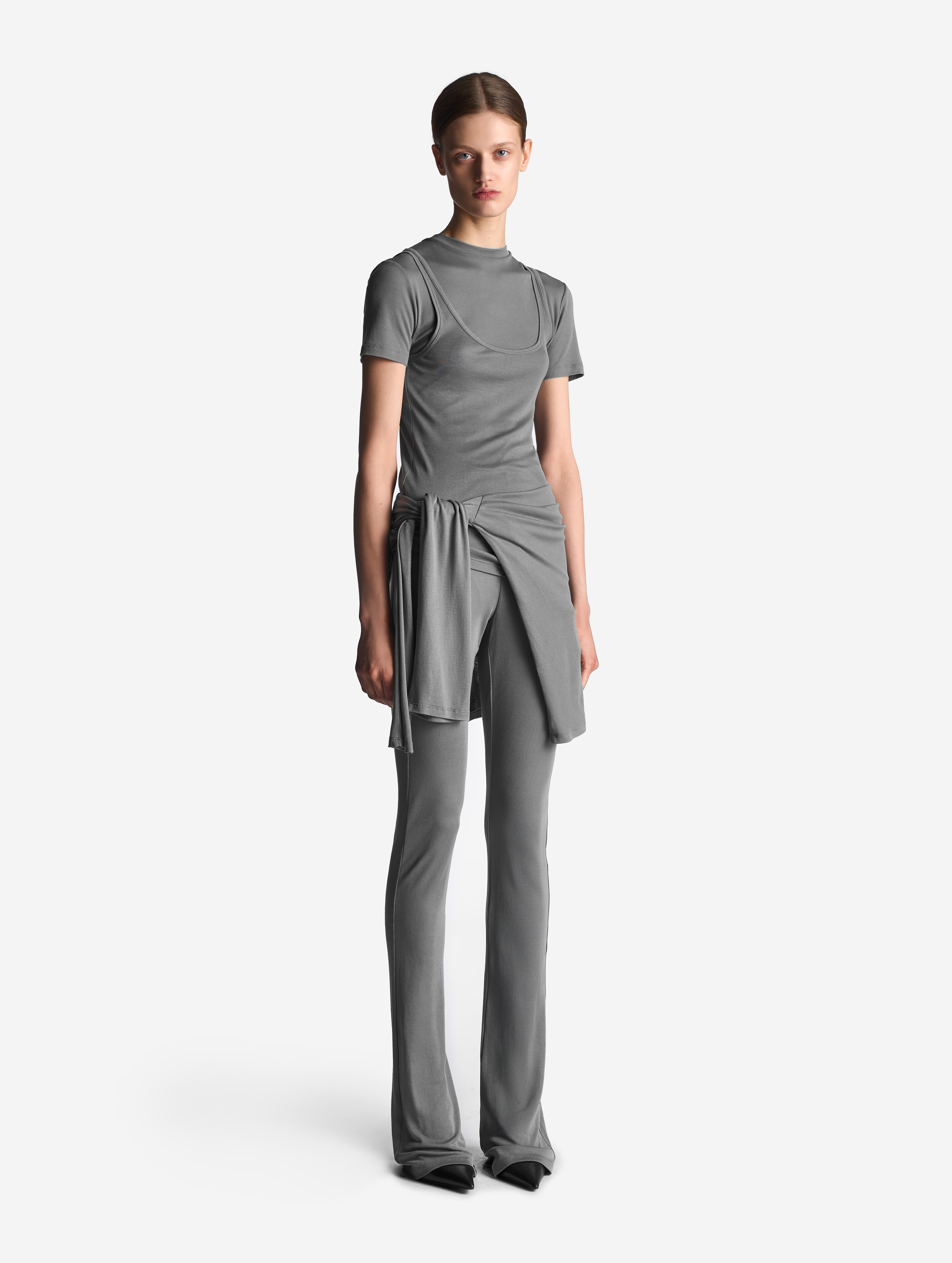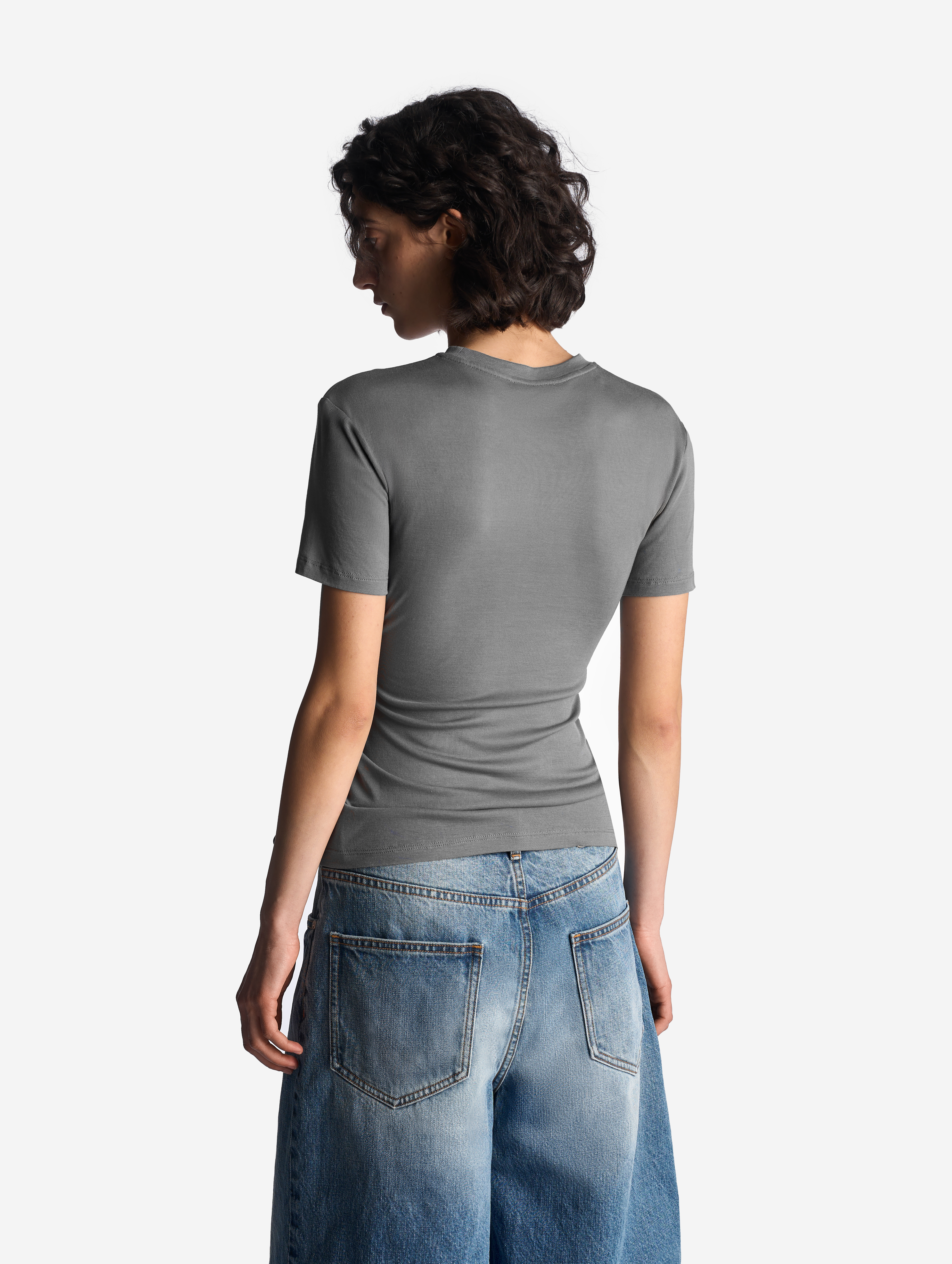 Футболка выполнена из тонкого полупрозрачного трикотажа. У нее вытянутый полуприлегающий силуэт, длина рукава не доходит до сгиба локтя. Изделие отличается плотной узкой горловиной, которая не растянется со временем. Самодостаточная вещь, в то же время способная выполнять функцию второго слоя.