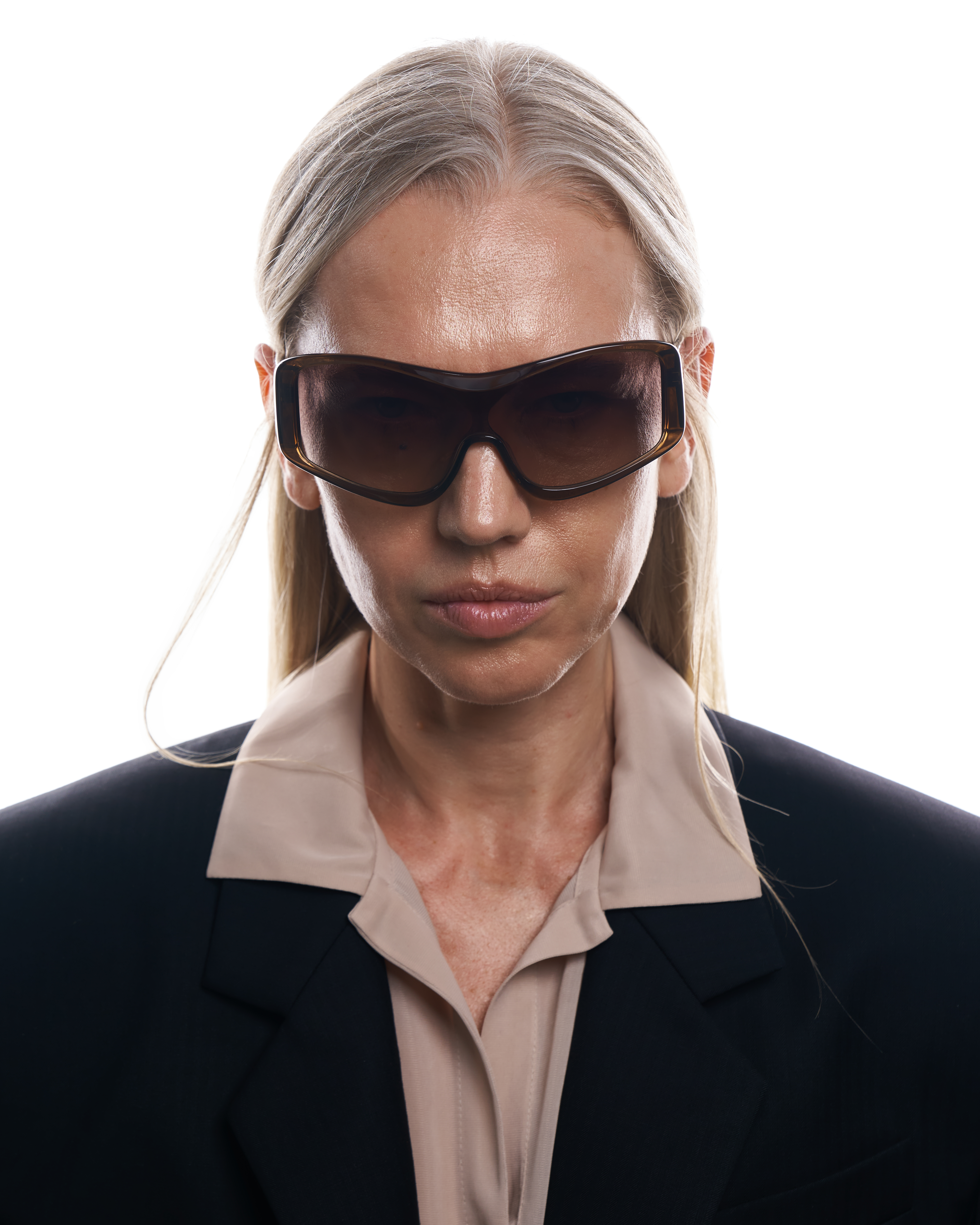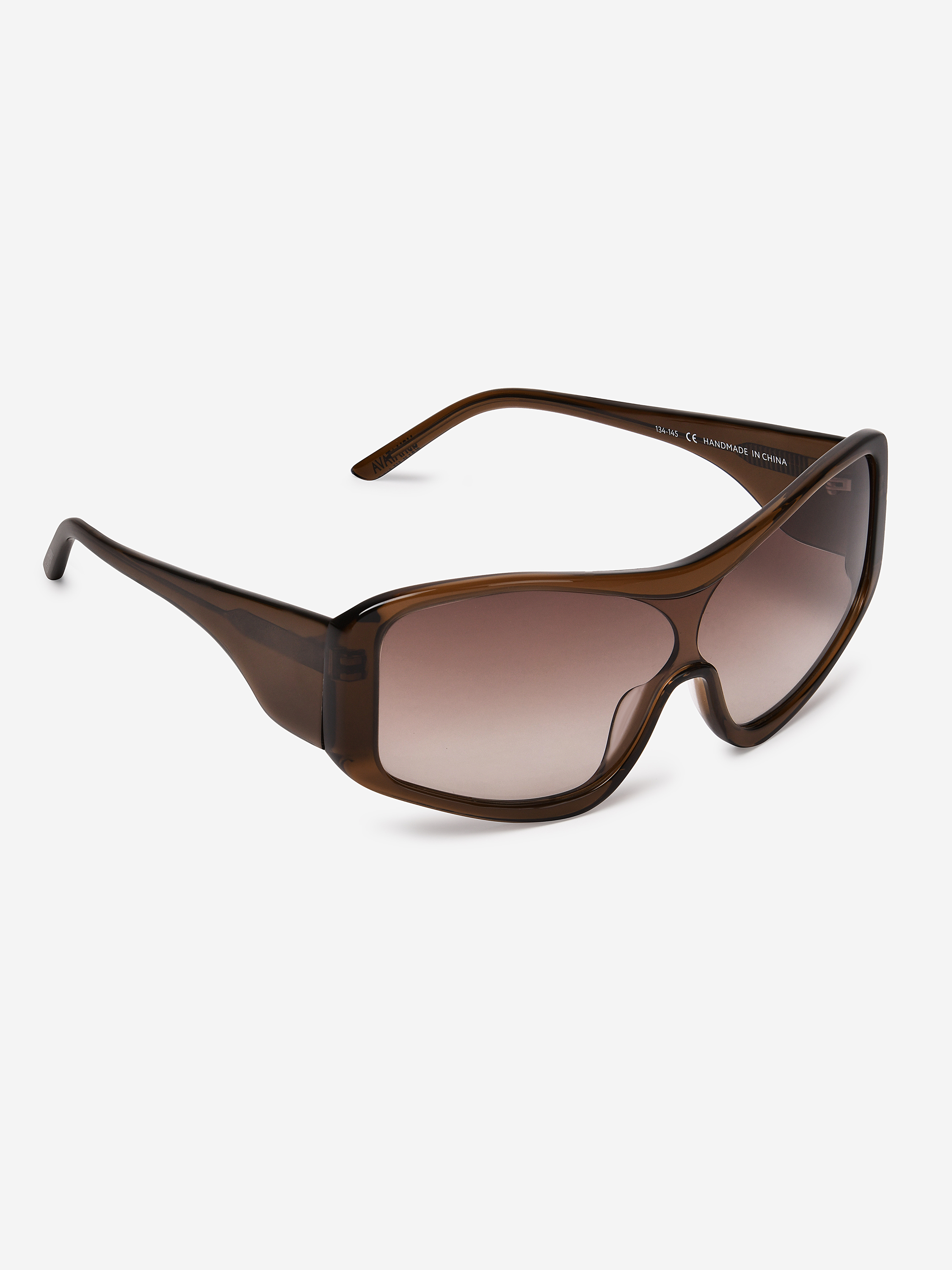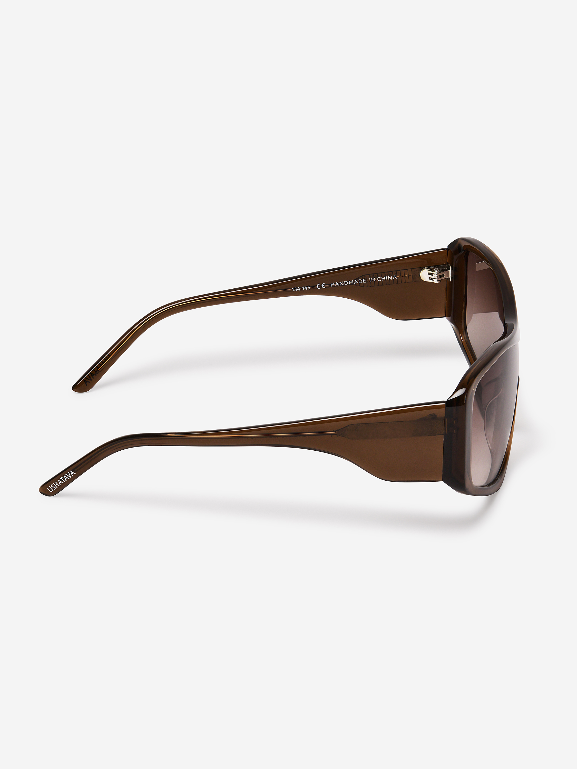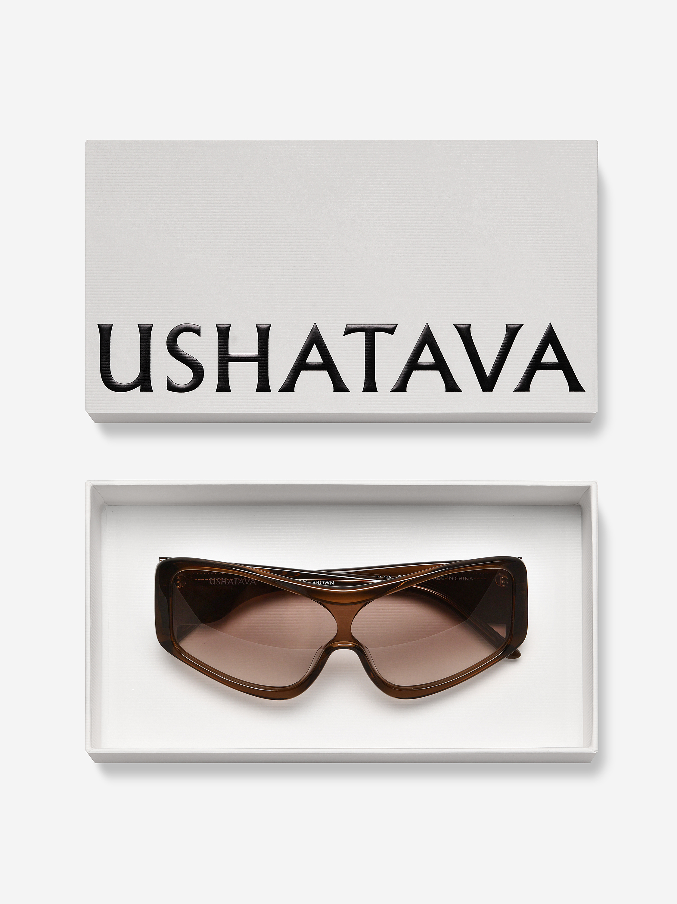 Креативный директор Ushatava Нино Шаматава называет эти очки «маской». Их форма действительно напоминает защитную экипировку или горнолыжное снаряжение. Такой тип конструкции называется «монолинза» — в ней отсутствует мостик на переносице, а крупная оправа расширяет область взгляда. На внутреннюю сторону дужек нанесена гравировка с логотипом модного Дома.