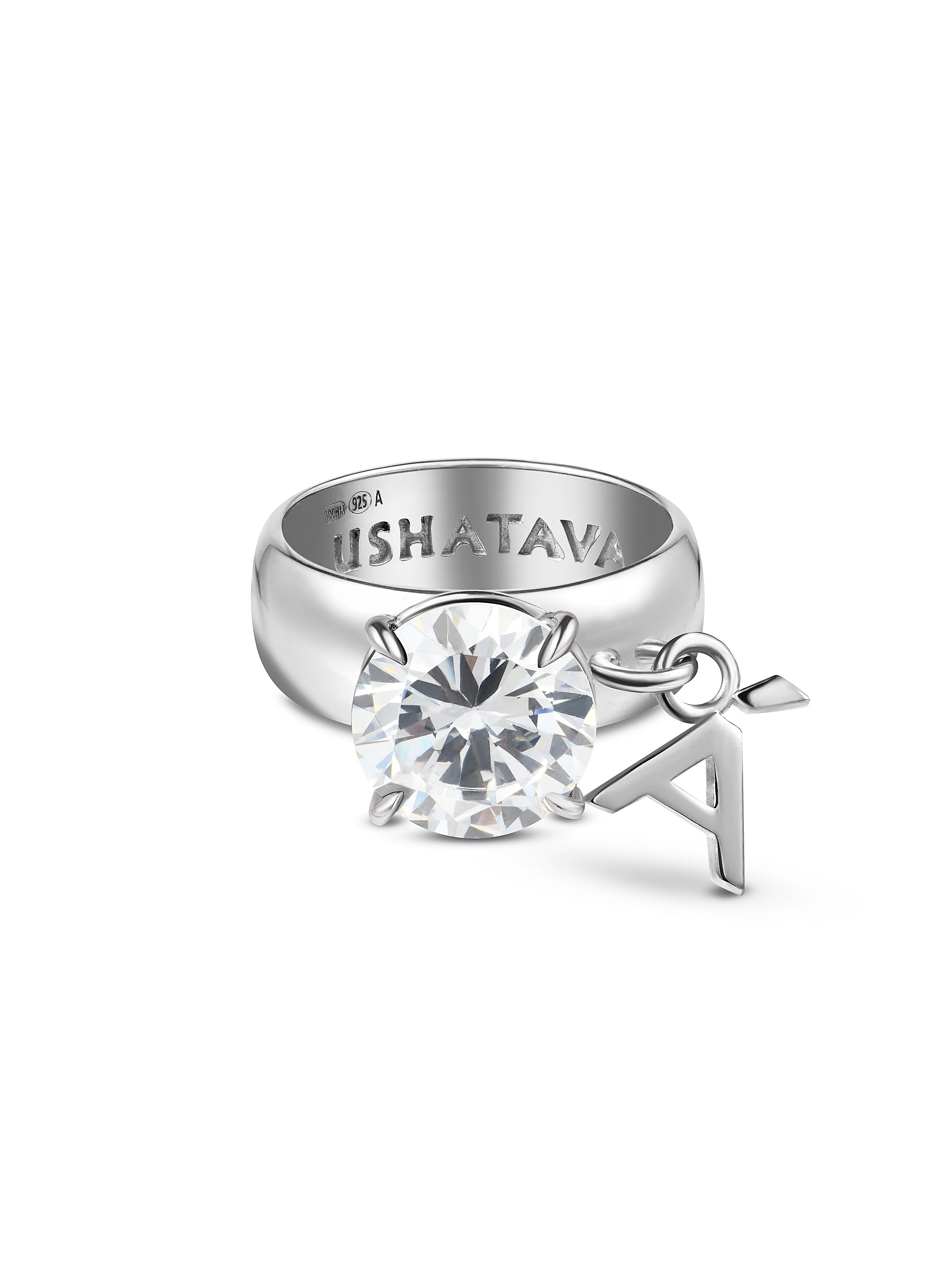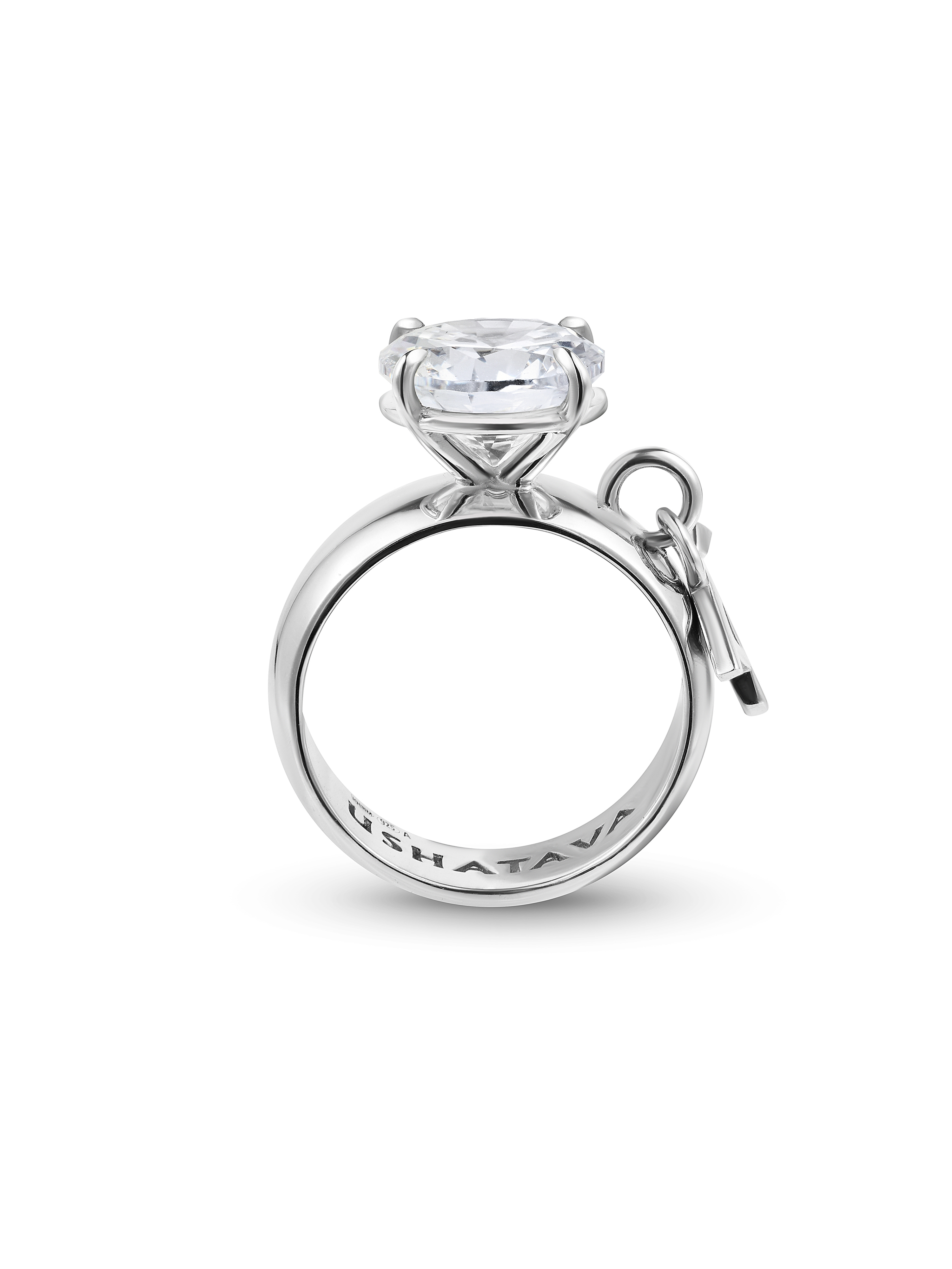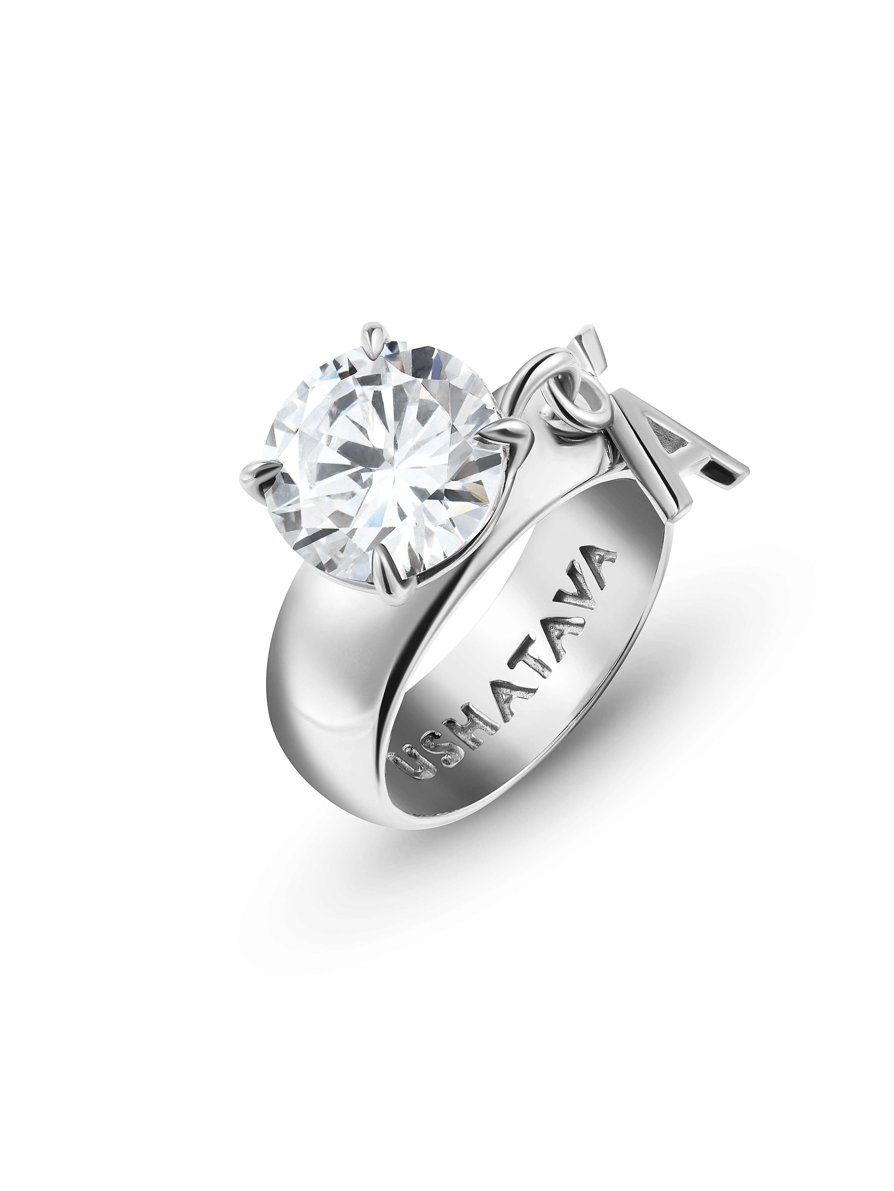 С серебряного кольца Lady Di началась история дизайн-линии украшений в Ushatava. Это изделие полностью повторяет вид знаковой модели с крупным сверкающим фианитом и подвеской в виде буквы Á.