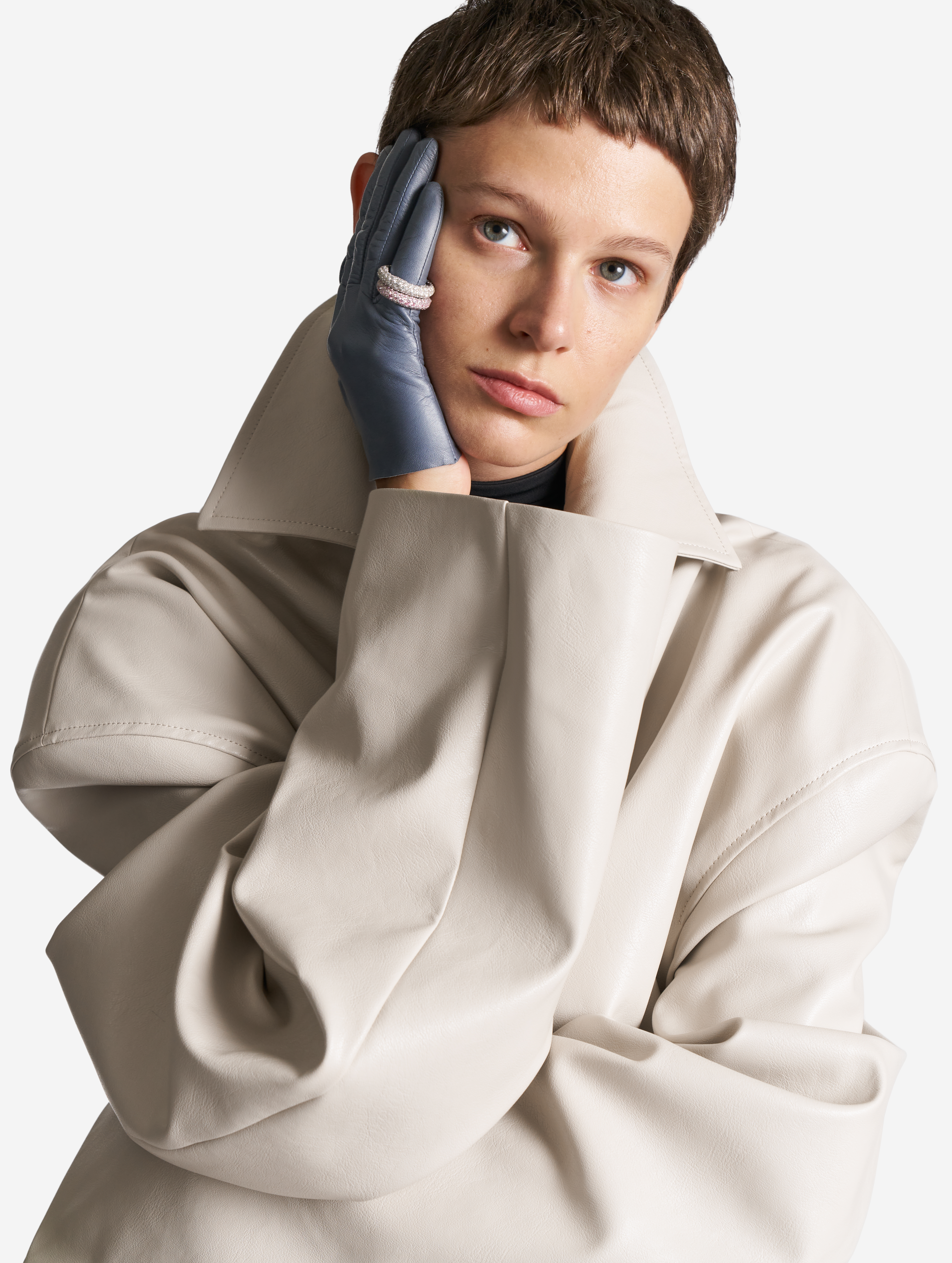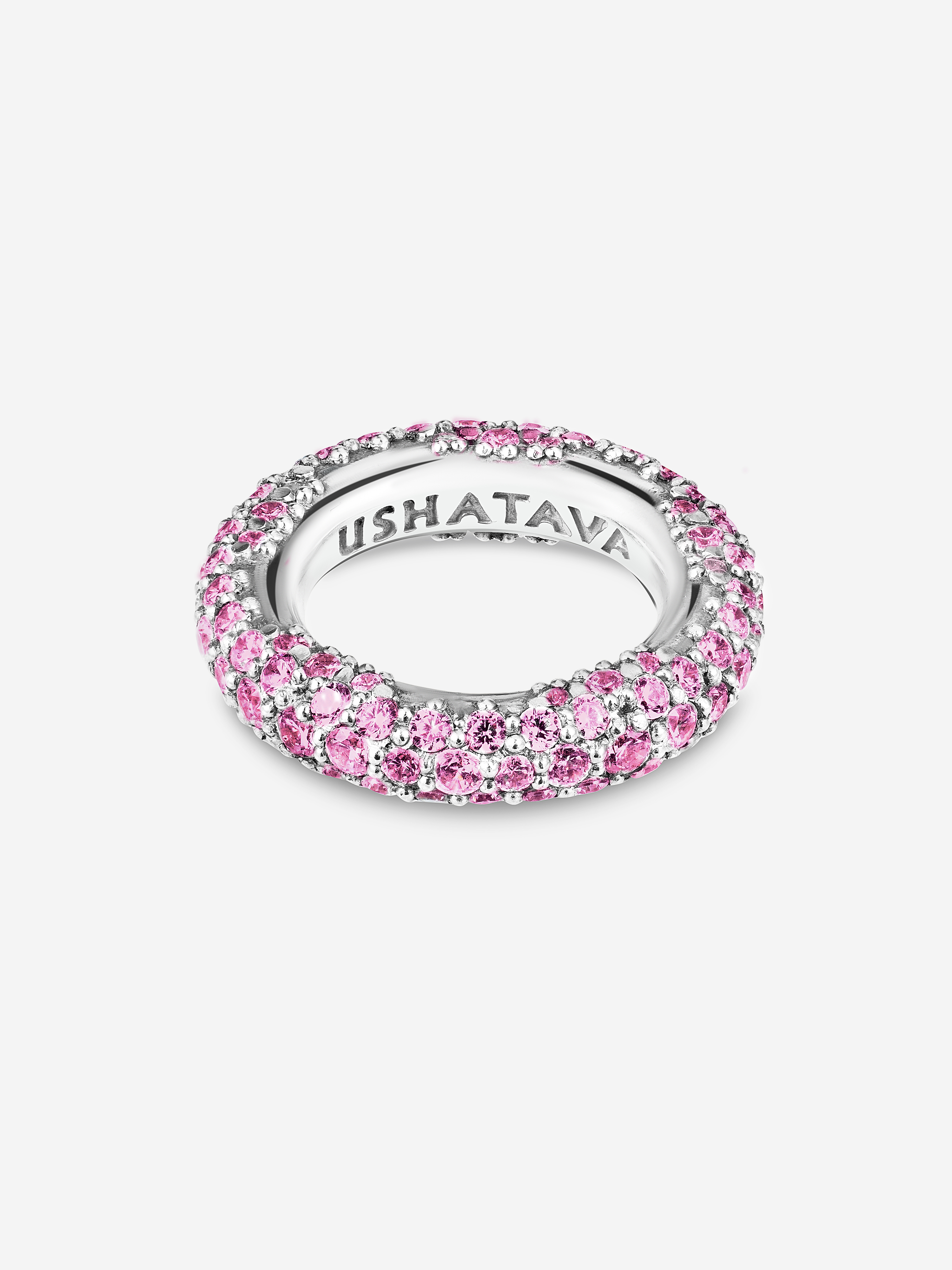 Круглое в сечении серебряное кольцо хаотично покрыто фианитами: камни будто случайно рассыпаны на поверхности изделия. Для усадки такого количества минералов мы использовали крепление паве. Данный тип закрепки предполагает настолько близкую посадку камней, что крошечные зубцы, удерживающие их, практически невидимы. Такой способ обеспечивает эффект непрерывного сверкания украшения. Внутри кольца выгравировано название модного Дома.
