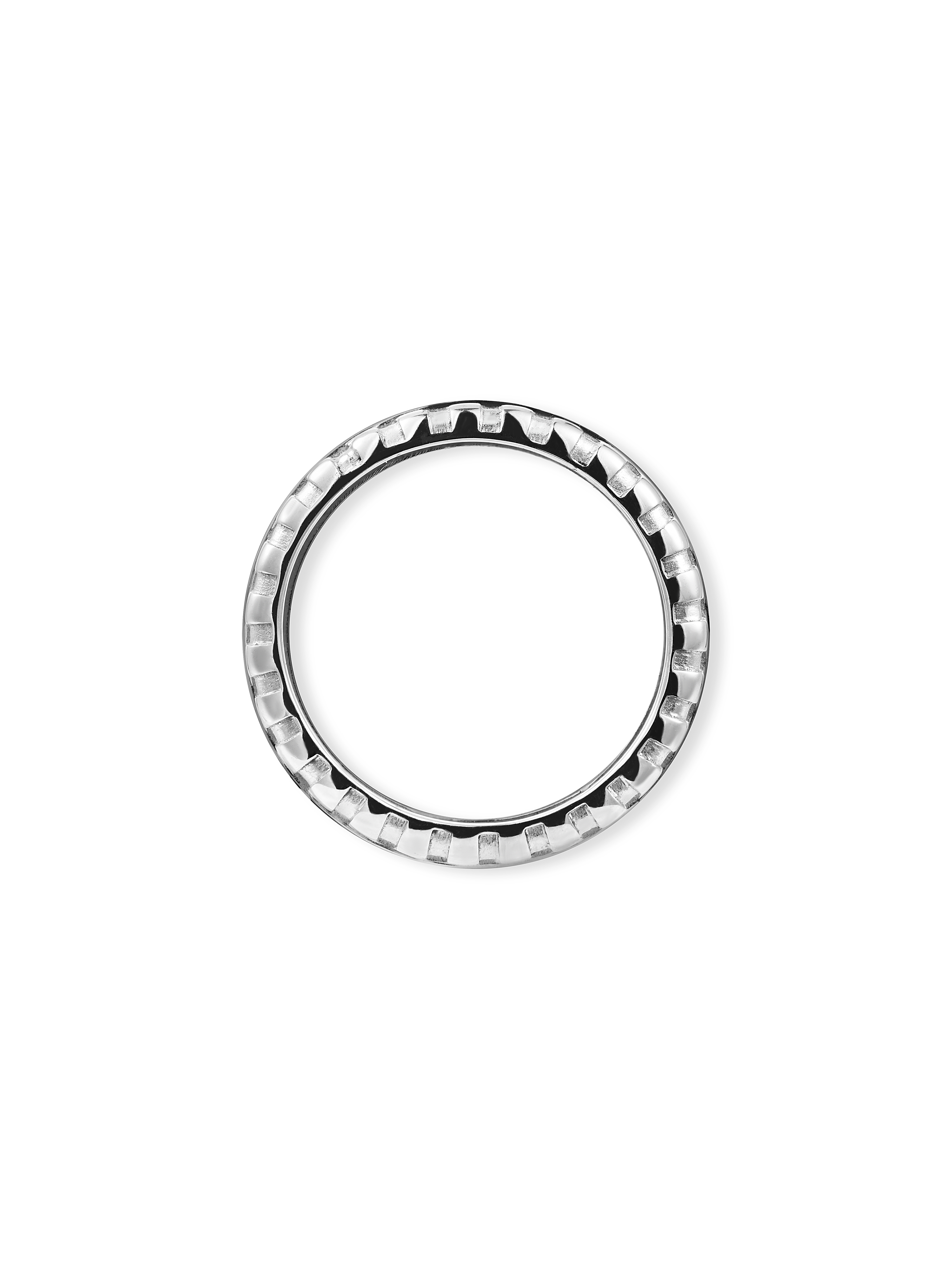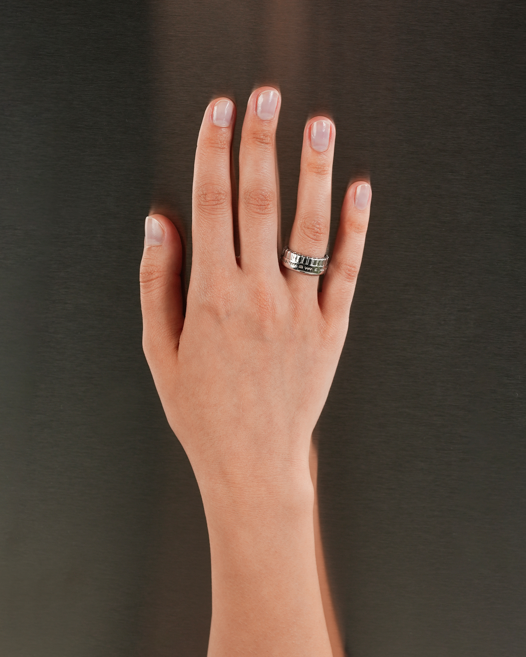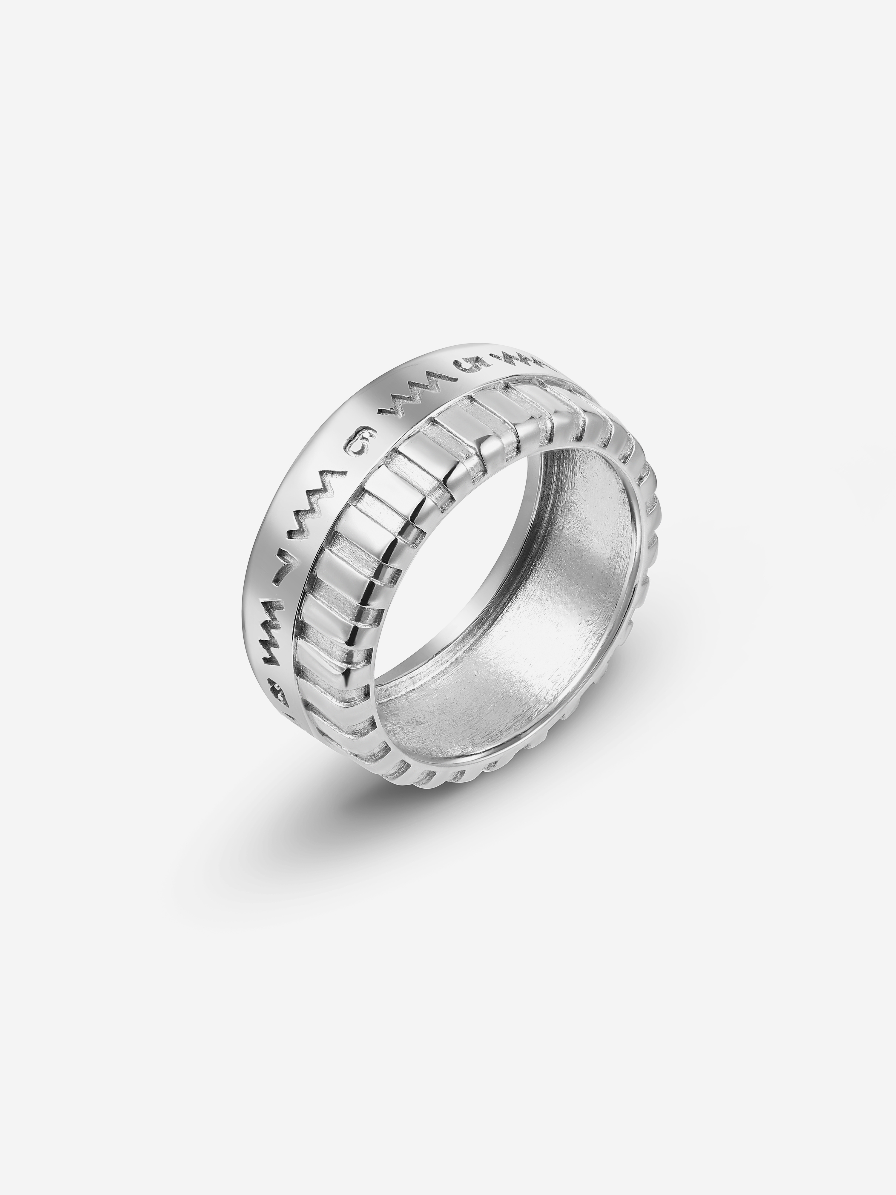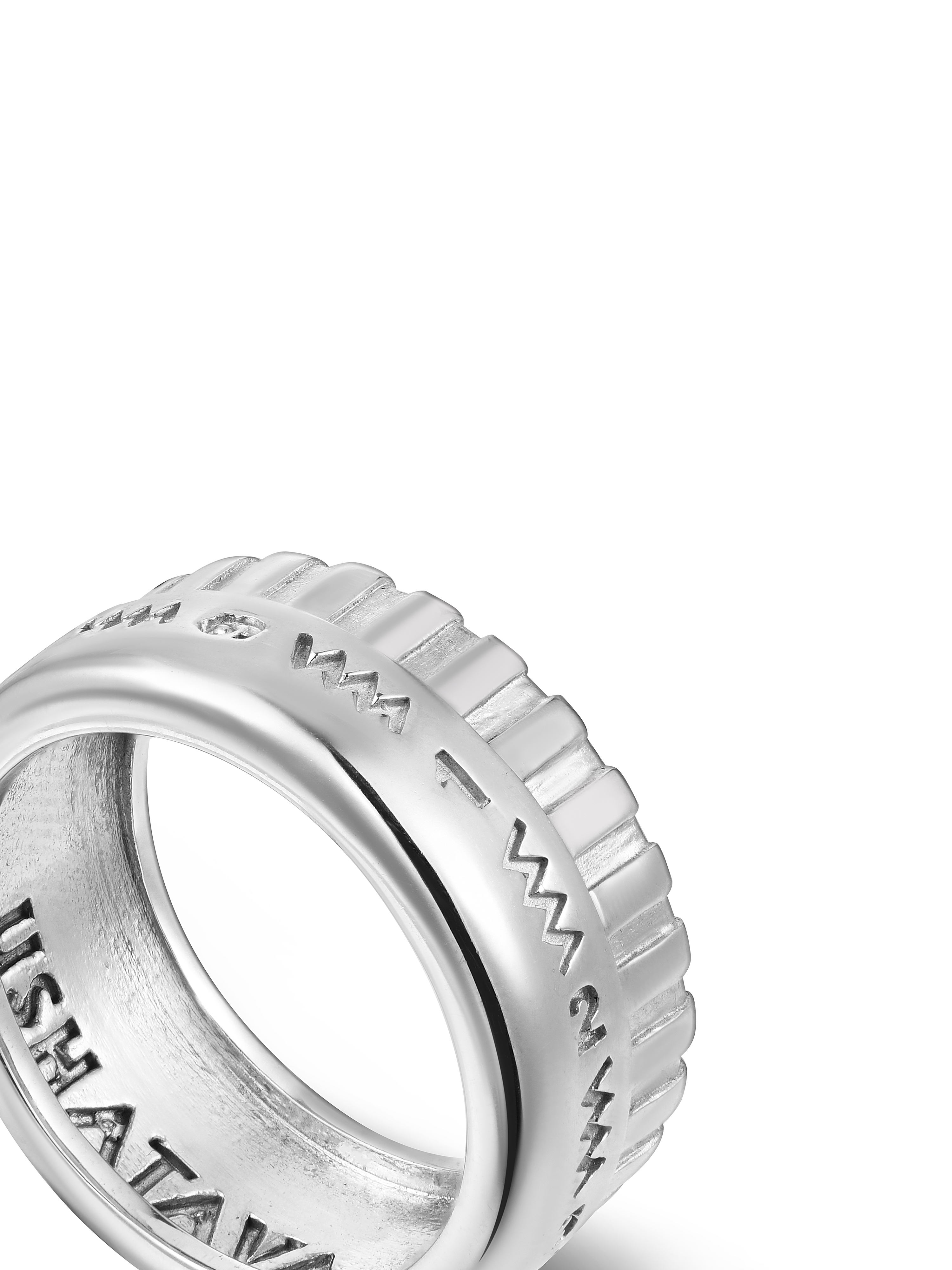 Это серебряное кольцо повторяет вид редуктора швейной машинки — важной детали, регулирующей длину стежка и вид строчки. По диаметру изделия нанесено схематическое изображение шва «зигзаг» и неглубокие насечки. Благодаря им изделие удобно крутить на пальце, в точности как при работе за машинкой. Внутри кольца с покрытием из белого родия выгравировано название модного Дома.