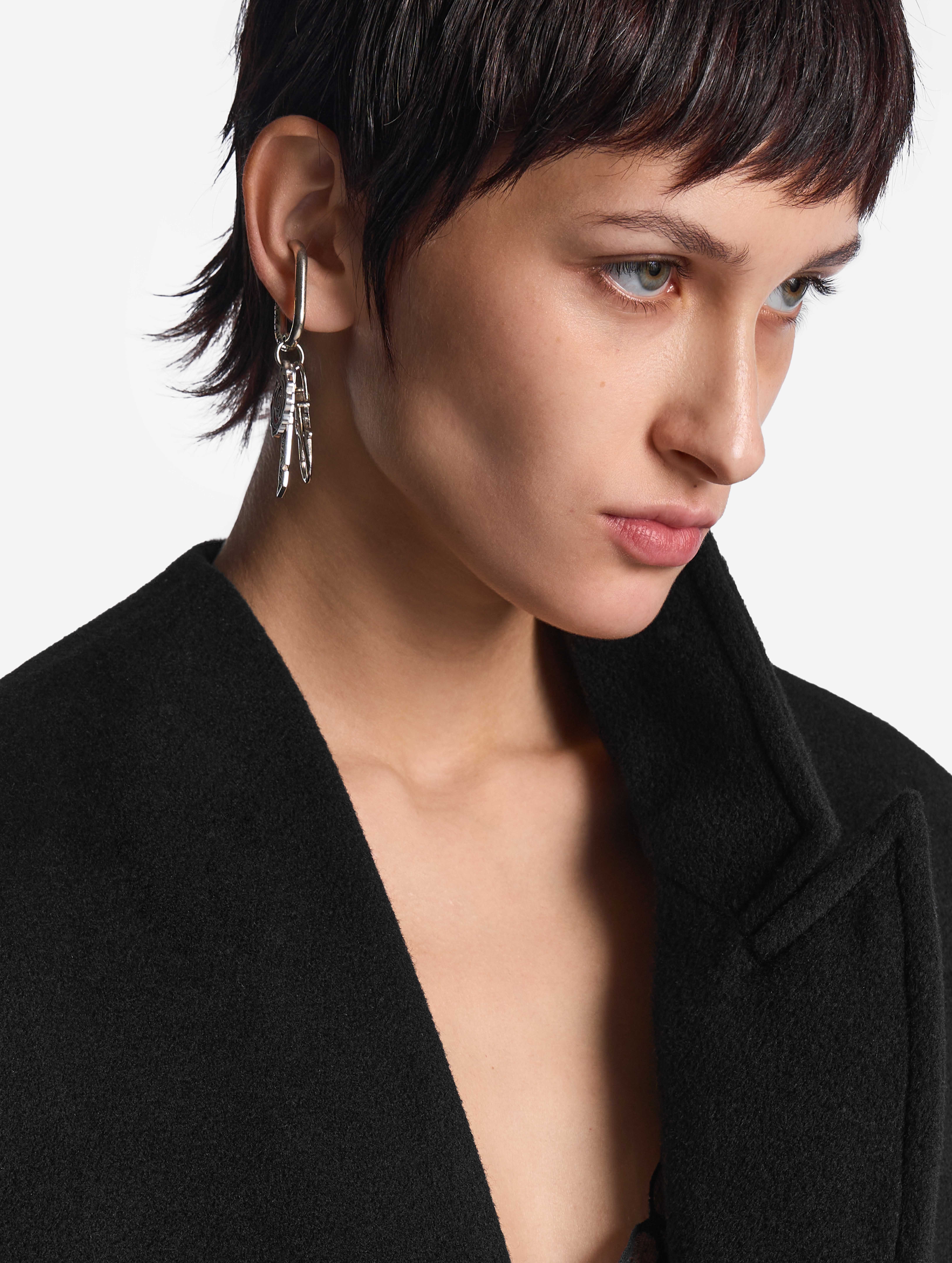 Разрабатывая коллекции внутри подиумной линии Research, мы часто ищем вдохновение в привычных вещах. Например, простой карабин превратился в моносерьгу, но не перестал выполнять свою ключевую функцию. Украшение дополняют пара брелков со вставками из цветной эмали и карабин-капля, который позволяет использовать предмет по прямому назначению — цеплять его на сумку или крепить к шлевке брюк.